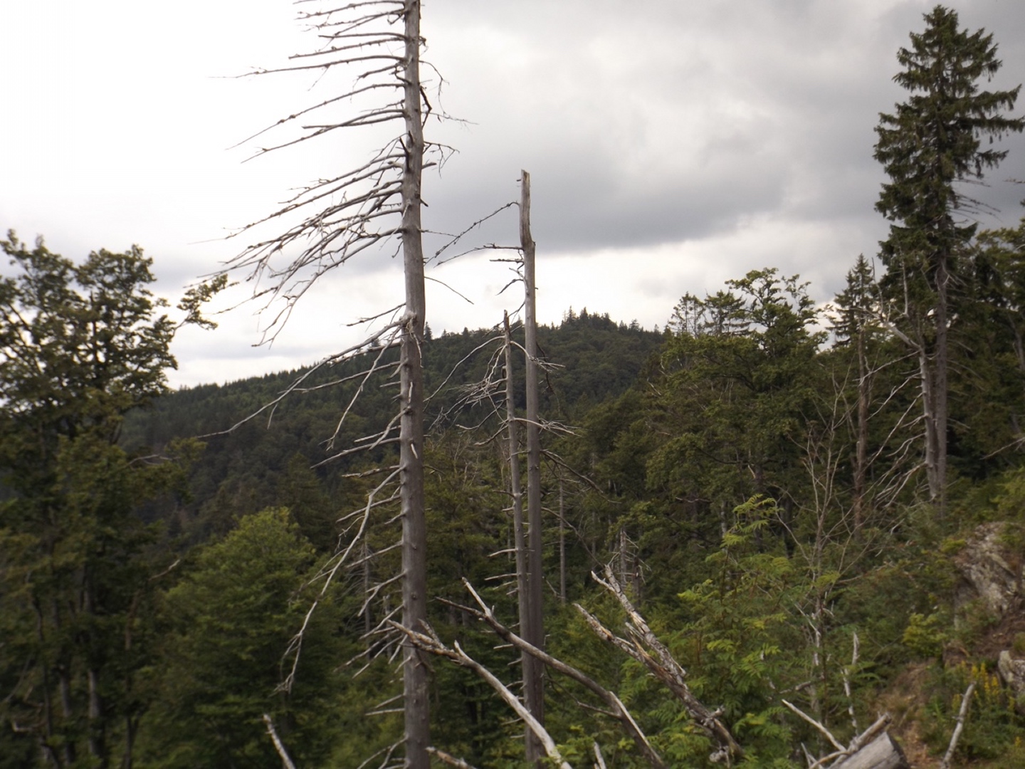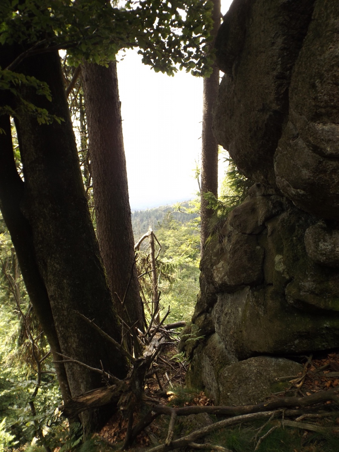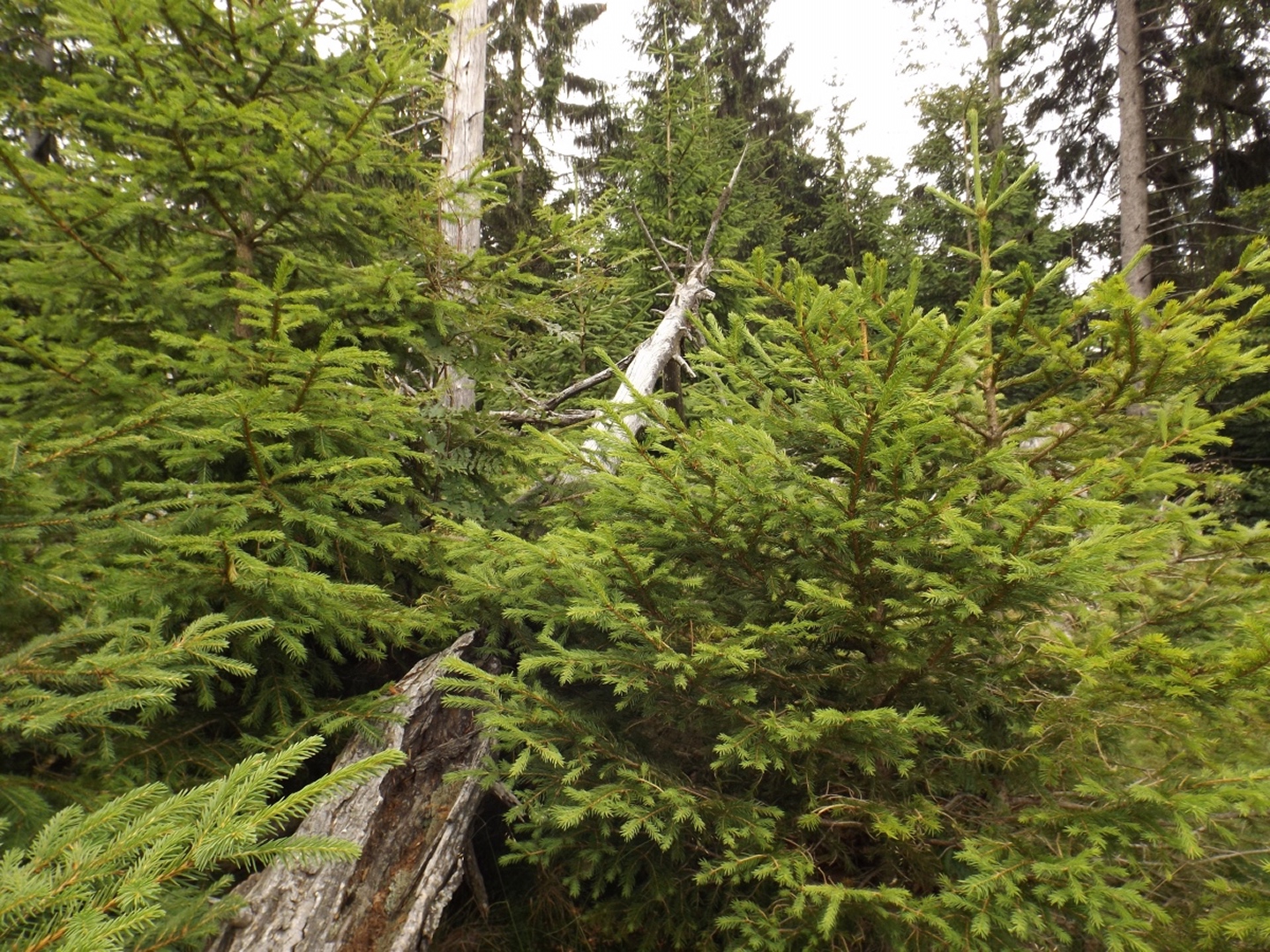 Die Realität sah so aus, dass ich planmäßig kurz nach neun Uhr in Neuschönau bei meiner Unterkunft für die zehn Lehrgangstage ankam, meine Gästekarte, die gleichzeitig als Ticket für den Igelbus gilt, bekam und kurz nach halb zehn an der Sagwassersäge losmarschieren konnte. Kurz vor dem Talschluss hörte ich aus Richtung Lusen Stimmen und traf direkt am Abzweig auf zwei Männer, die ebenfalls Richtung Tummelplatz unterwegs waren. Einer davon war bekannt: Werner war letztes Jahr ebenfalls bei der Präsentation des Lusenkalenders anwesend und erkannt mich gleich wieder. Der vermutete Pfad hinauf Richtung Sulzriegel erwies sich als total verwachsene Schneise und absolut unbegehbar, so dass wir zu dritt zum Tummelplatz weitergingen und dort erst einmal Brotzeit machten. Dabei schlugen mir Werner und Hans vor, mit ihnen mitzugehen, weil sie dachten, dass mein geplanter Weiterweg etwas zu heftig für den Zeitrahmen wäre. Vielleicht haben sie auch einer Frau nicht die Kondition für 22 Kilometer zugetraut, ist aber relativ egal. Jedenfalls bin ich mit ihnen mitgegangen, und zwar nur aufs Kleinalmeyerschloss, weil die beiden nichts von dem Pfad auf der Rückseite des größeren Felsens wussten, der an genau der Stelle, an der er auf meinem Garmin angezeigt wurde, von rechts auf unseren Weg herunterkam. Die Folge der ganzen Aktion war letztendlich, dass wir bereits um halb zwei wieder am Auto waren. Lust auf die Kanzeln hatte ich auch nicht mehr, also fuhren wir gemeinsam zum Nationalparkzentrum und genehmigten uns dort zwei oder drei Bierchen (die Herren mehr als ich, denn sie waren ja mit dem Igelbus unterwegs). Durch die viele Ratscherei habe ich auch die Kamera total vernachlässigt, was sich in einer exorbitant geringen Zahl von Fotos ausdrückt. Ich bin aber nicht traurig über den Verlauf, denn es war richtig nett und lustig, mit den beiden durch den Nationalpark zu geistern. Sie haben mir auch gleich noch eine Anregung für eine kleinen Alternativweg zwischen Sagwassertal und Waldhausreibe gegeben, den ich sicher noch ausprobieren werde, vielleicht sogar noch in diesem Jahr.