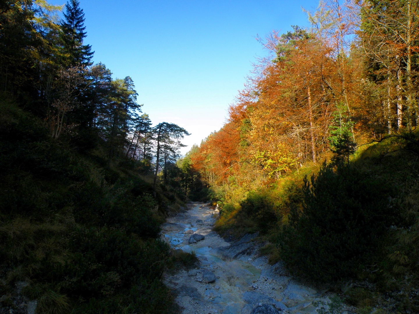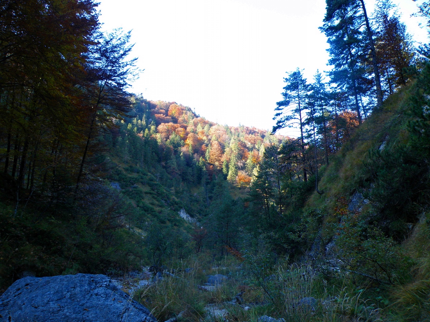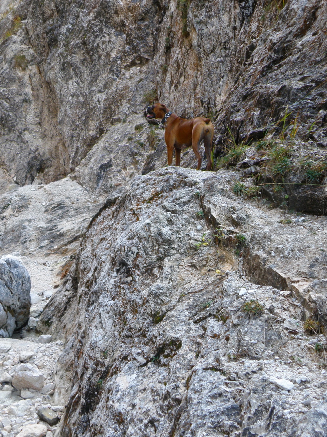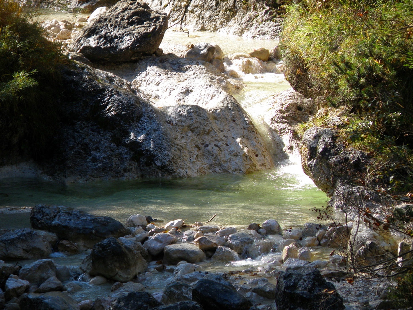 Vom Parkplatz am Friedhof Bayerisch Gmain geht es auf einem Waldweg zur großen Wanderautobahn Richtung Hallthurm. Dieser folgt man bis zu einer Brücke, die man dann allerdings nicht nach links überquert, sondern dem Weißbach geradeaus in die Flanke des Lattengebirges folgt. Der Weg bleibt gut ausgebaut, läßt eine Gitterrostbrücke rechts liegen, die den Zusammenfluss von Weißbach und Speikbach markiert, wird aber etwas schmäler und holpriger bis zu der Stelle, an der man ohne Wasserfallkletterei nicht mehr weiterkommt. Dort habe ich dann eine kleine Rast inclusive Meditation eingelegt, während der ich feststellte, dass Coco kein reiner Hund ist, sondern irgendwie einen Anteil Gams in sich hat. Über halbwegs begehbare Stufen geht es dann rechts einen Pfad hinauf, der zur oberen Weißbachschlucht führen soll. Dieser Pfad war im Oktober 2009 total verfallen und kaum begehbar (fast schon T4, bei etwas Pflege wäre er aber nicht mehr als T2). Nach etwa einer halben Stunde überquert man wieder den Weißbach. Es ist allerdings nicht zu erkennen, wo man zur Quellschlucht kommt, vielleicht war ich auch zu ungeduldig. Jedenfalls drehte ich nach etwa 50 weiteren Höhenmetern auf dem jetzt wieder gut begehbaren Pfad um und stieg zur Mündung des Speikbachs ab. Das Problem lauerte auf den letzten Metern: Eine Leiter aus Gitterrost, die Coco niemals überwinden konnte. Glücklicherweise hatte ich 50 Meter weiter oben einen kleinen Pfad hangabwärts abzweigen gesehen. Diesem folgten wir dann durch teilweise unwegsames Gelände bis zum Bachbett, Coco voraus und ich hinterher. Wir mussten noch einge hundert Meter bachabwärts gehen, bis wir an eine geeignete Stelle kamen, an der wir den Weißbach wieder zum Wanderweg queren konnten.