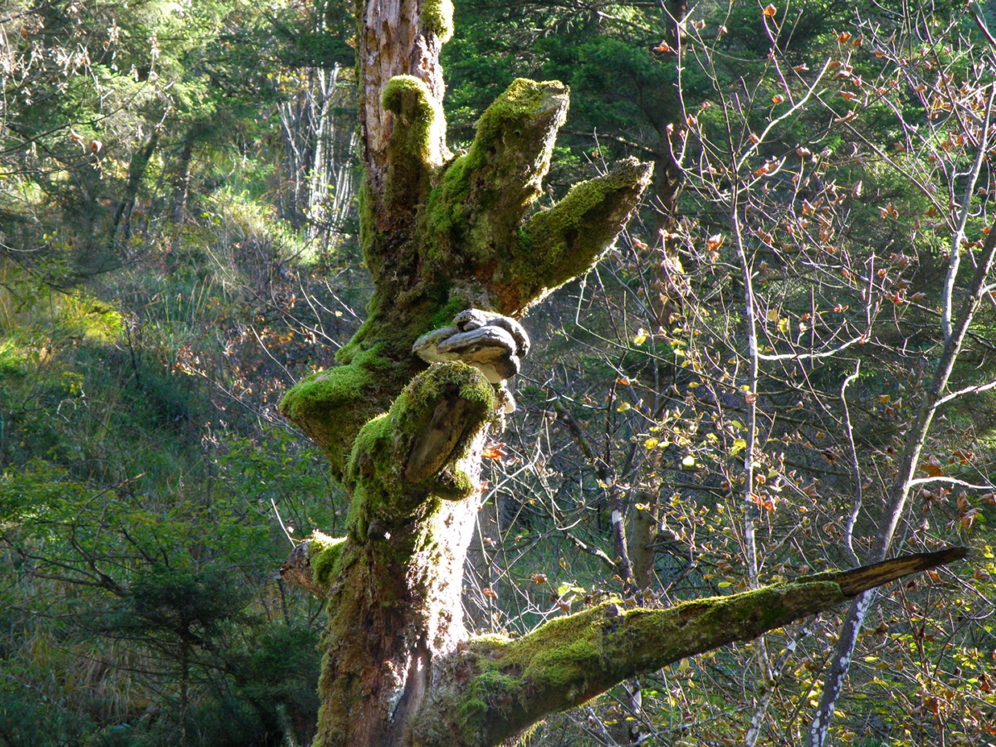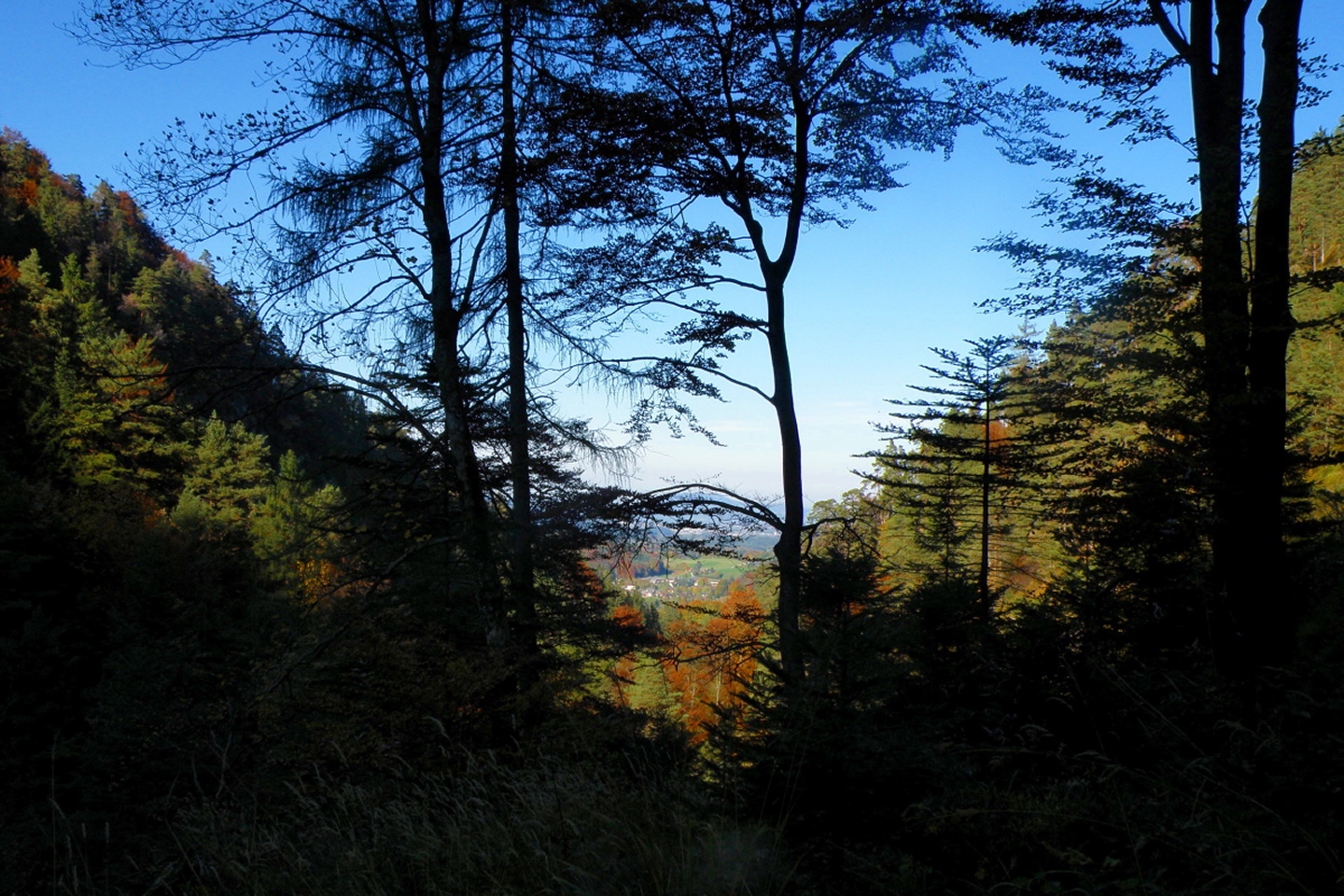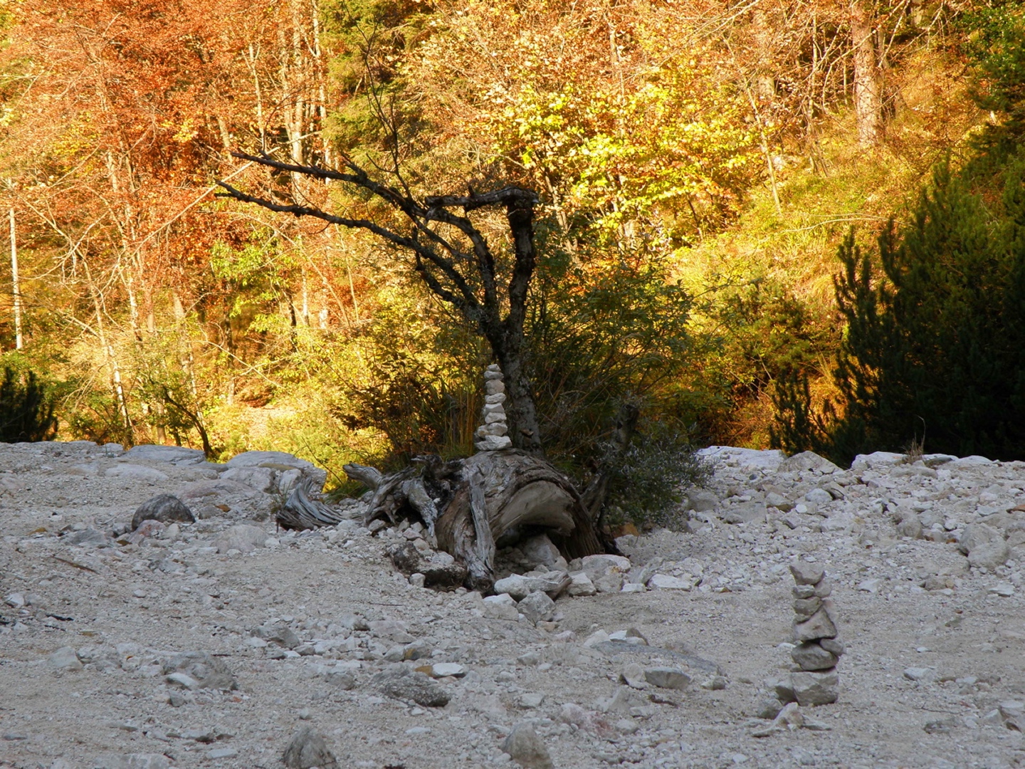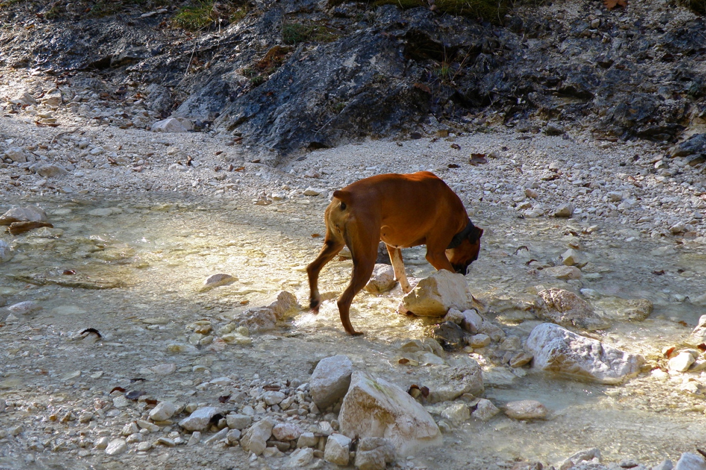 Vom Parkplatz am Friedhof Bayerisch Gmain geht es auf einem Waldweg zur großen Wanderautobahn Richtung Hallthurm. Dieser folgt man bis zu einer Brücke, die man dann allerdings nicht nach links überquert, sondern dem Weißbach geradeaus in die Flanke des Lattengebirges folgt. Der Weg bleibt gut ausgebaut, läßt eine Gitterrostbrücke rechts liegen, die den Zusammenfluss von Weißbach und Speikbach markiert, wird aber etwas schmäler und holpriger bis zu der Stelle, an der man ohne Wasserfallkletterei nicht mehr weiterkommt. Dort habe ich dann eine kleine Rast inclusive Meditation eingelegt, während der ich feststellte, dass Coco kein reiner Hund ist, sondern irgendwie einen Anteil Gams in sich hat. Über halbwegs begehbare Stufen geht es dann rechts einen Pfad hinauf, der zur oberen Weißbachschlucht führen soll. Dieser Pfad war im Oktober 2009 total verfallen und kaum begehbar (fast schon T4, bei etwas Pflege wäre er aber nicht mehr als T2). Nach etwa einer halben Stunde überquert man wieder den Weißbach. Es ist allerdings nicht zu erkennen, wo man zur Quellschlucht kommt, vielleicht war ich auch zu ungeduldig. Jedenfalls drehte ich nach etwa 50 weiteren Höhenmetern auf dem jetzt wieder gut begehbaren Pfad um und stieg zur Mündung des Speikbachs ab. Das Problem lauerte auf den letzten Metern: Eine Leiter aus Gitterrost, die Coco niemals überwinden konnte. Glücklicherweise hatte ich 50 Meter weiter oben einen kleinen Pfad hangabwärts abzweigen gesehen. Diesem folgten wir dann durch teilweise unwegsames Gelände bis zum Bachbett, Coco voraus und ich hinterher. Wir mussten noch einge hundert Meter bachabwärts gehen, bis wir an eine geeignete Stelle kamen, an der wir den Weißbach wieder zum Wanderweg queren konnten.