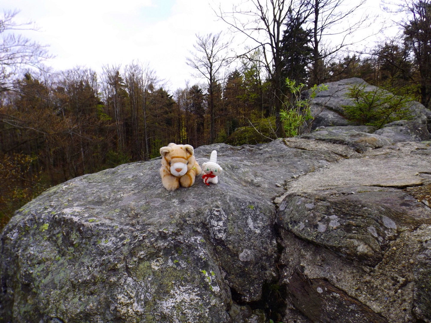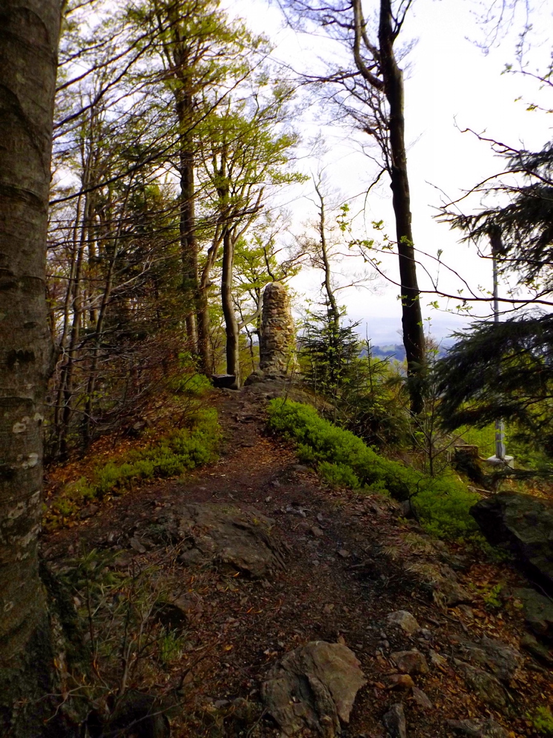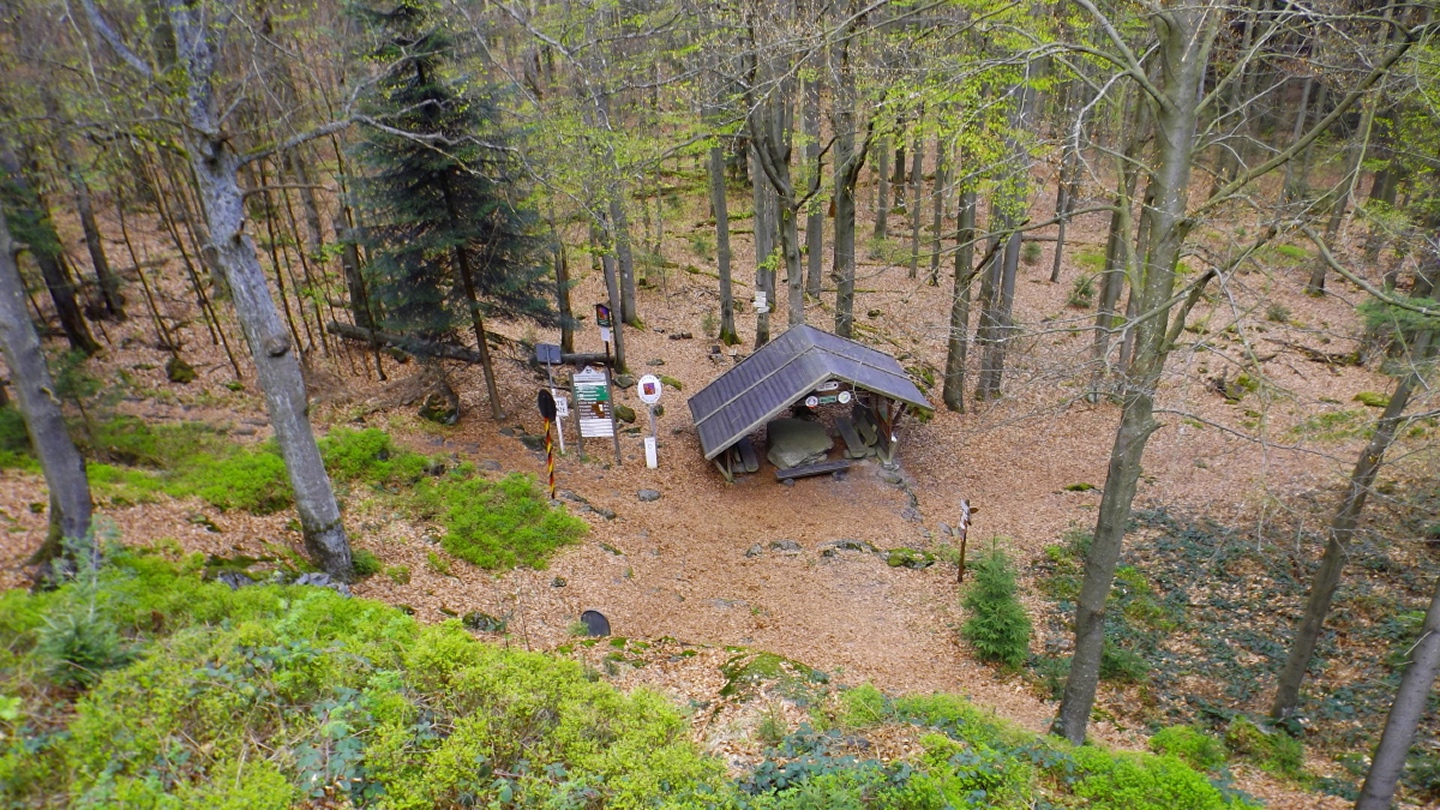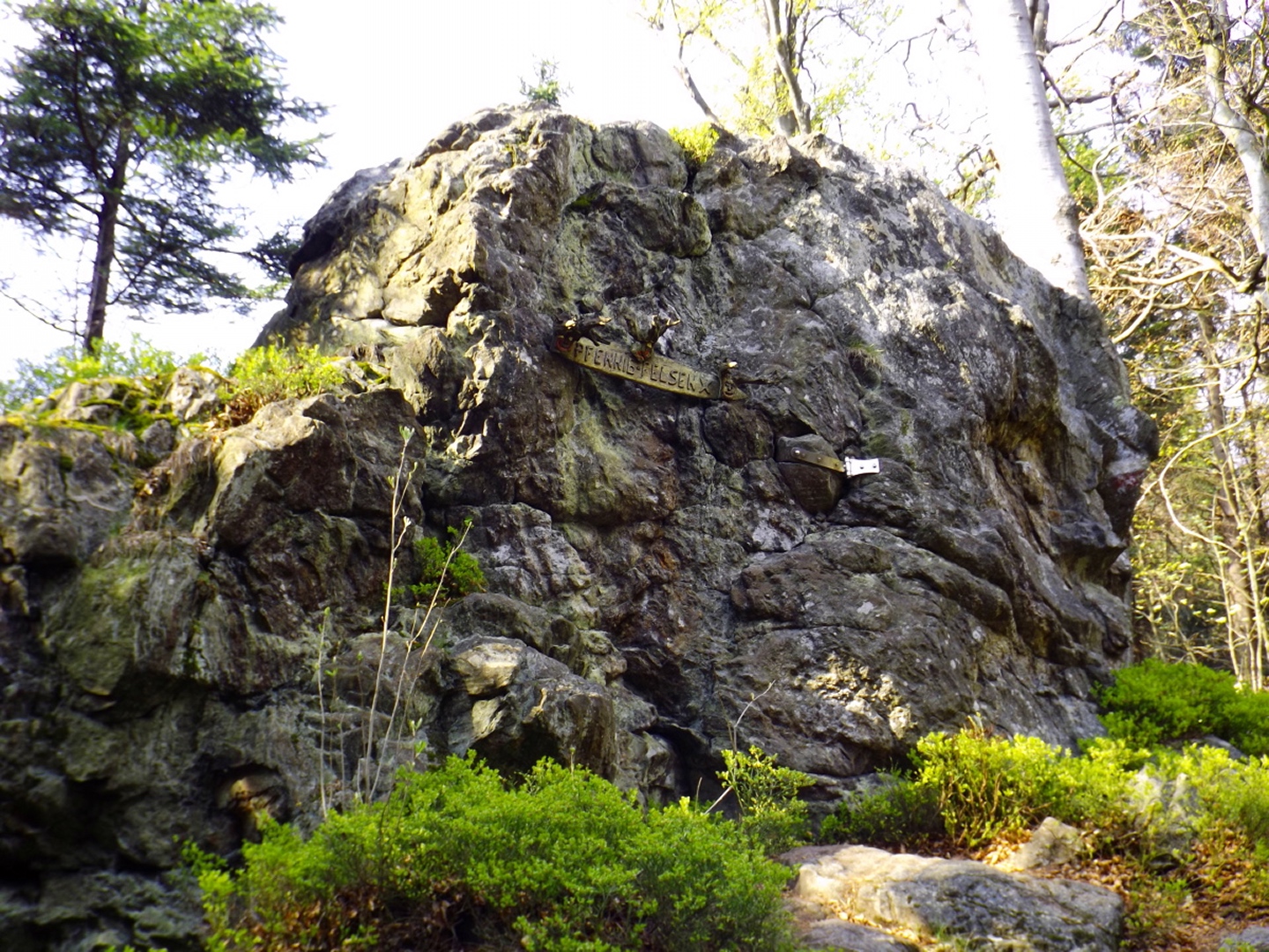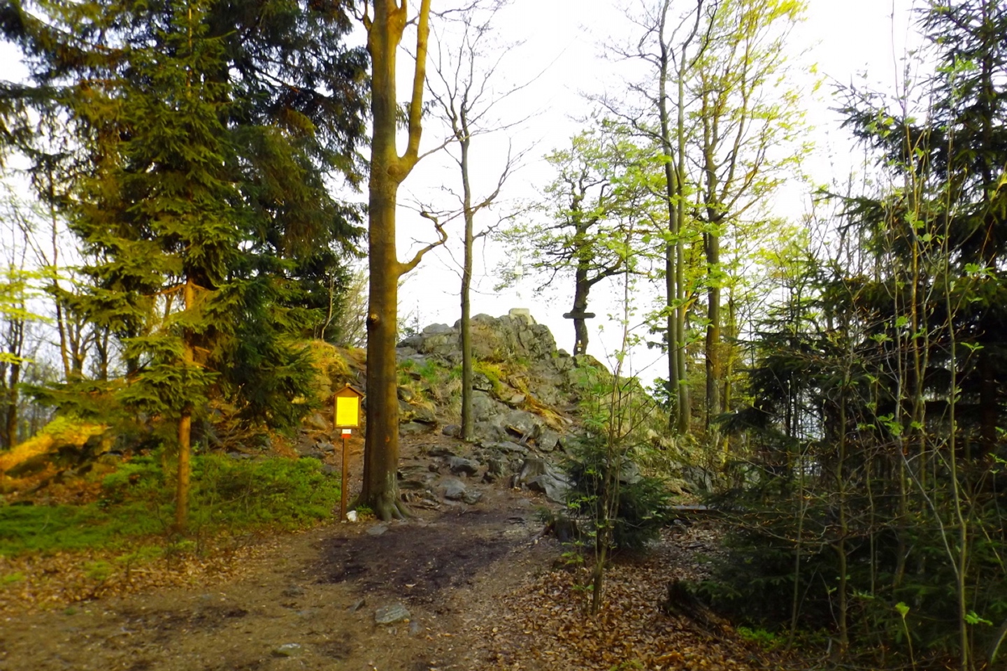 Vom Großparkplatz Golfplatz / Skilift aus geht eine Forststraße direkt in den Wald. Man kann nach wenigen Metern links abbiegen und die kurze Verbindung zum Wanderweg F9 gehen, diese ist aber nicht als solche markiert und ich hatte die Kompasskarte nicht ganz richtig interpretiert, also ging ich geradeaus weiter. Die Wegmarkierung V2 (historisch etwas belastet) ist in der Karte nicht eingezeichnet. Nach einigen Minuten querte ich die beiden Skipisten (hier hätte ich merken können, dass ich zu weit unten bin), etwas später erreichte ich einen kleinen Gedenkstein. Wieder eine Viertelstunde später war ich an einer Abzweigung, wo ich nach links abbog und nach weiteren fünf Minuten endlich meinen Fehler erkannte. War aber nicht wirklich schlimm, denn irgendwann mündet die Forststraße in den richtigen Weg, außerdem kann man an mehreren Stellen durch den Wald abkürzen. Die dritte Alternative wäre gewesen, mich nach rechts Richtung Grenze durchzuschlagen und ihr entlang zum Dreiwappenfels zu wandern. Ich entschied mich für eine Abkürzung durch den Wald, die im Gegensatz zur Hohen-Bogen-Tour auf einem Weg und damit total unproblematisch verlief. Endlich auf dem richtigen Weg angekommen, rutschte mir erst einmal mein Handtuch aus dem Hosenbund, was ich zum Glück bereits 50 Meter später merkte, als ich die nächste Abkürzung durch den Wald dokumentierte. Schnell zurück, das Teil wieder solide verstaut und weiter. Die Abkürzung mündet nach knapp einem Kilometer in einem Querweg, dem ich kurz nach rechts folgte, bis ich über mir die Böschung der Forststraße erkannte und weglos zu ihr aufstieg. Jetzt war links die richtige Richtung, an der nächsten Abzweigung musste ich rechts hinauf, es war nicht mehr weit bis zur ersten Sichtung des Kreuzfelsens in einer scharfen Linkskurve. Ich überlegte kurz, ihn weglos direkt zu erklimmen, entschied mich aber für die einfache Variante, nämlich weiter auf der Forststraße zu bleiben und an der nächsten Kreuzung dem Goldsteig zum Gipfel zu folgen. Jetzt war ich endlich auf normalen Waldpfaden unterwegs und erreichte nach insgesamt 80 Minuten und fünf Kilometern den höchsten Gipfel des Gibachtmassivs und damit des bayerischen Teils des Oberpfälzer Waldes (höher sind nur zwei Berge auf der tschechischen Seite). Ja, ich war ziemlich schnell unterwegs, es war aber auch nicht wirklich steil. Der Kreuzfelsen ist nordseitig ersteigbar, es ist zwar etwas ausgesetzt, aber mit einem ziemlich soliden Seil abgesichert. Nach einer kurzen Pause stieg ich wieder ab zum Bankerl und setzte meinen Weg nach Osten zum Dreiwappenfels fort. Zunächst geht es etwa 400 Meter schnurgerade dahin, dann taucht frontal eine Felsgruppe auf, davor ein Hinweisschild in Sachen Langlaufloipen. Normalerweise geht es hier rechts weiter, dann geschieht der nächste Abschnitt eben umgekehrt. Ich entschied mich für den linken Weg und erreichte gleich den Pfennigfelsen, der mit einer schönen Aussicht Richtung Waldmünchen punkten kann. Danach geht es bis zur Grenze durch den Wald, ein paar Meter der Grenze entlang bis zu einem Unterstandhäuschen und rechter Hand dem Dreiwappenfels. Dieser war einmal der Grenzpunkt zwischen dem Churfürstentum Baiern, dem Königreich Böhmen und dem Herzogtum Pfalz, inzwischen liegt er etwa zehn Meter von der Grenze zwischen Bayern und Tschechien entfernt und vollständig im Landkreis Cham. Kurz hinaufgestiegen, ein Schluck aus der Trinkflasche und weiter ging es zurück Richtung Hinweistaferl, an dem ich den Weg von vorhin kreuzte und mich Richtung Wirtshaus Gibacht machte, welches ich nach einer halben Stunde erreichte. Unterwegs kam mir eine komplette Hundeschule entgegen, da wäre Coco ziemlich frustriert gewesen, weil keiner der Hunde mit ihr spielen dürfen hätte. Nach einem Naabecker Dunkel, dem Umstellen der Kamera von ISO 64 auf 200 und ein paar Fotos im hundefreundlichen Wirthaus (mit vier weiteren Hunden) machte ich mich auf den Rückweg nach Voithenberg, der noch drei weitere Gipfelchen beinhaltete. Zunächst ging es auf einer Forststraße nach Süden weiter, bevor nach etwa 200 Metern ein nicht markierter Weg links in den Wald hinaufzieht. Von diesem biegt sehr schnell ein kleiner Pfad rechts ab, auf dem ich bald einen Sattel erreichte, von dem aus Punkt 934 schell links erreichbar ist. Zurück auf dem Pfad, windet sich der Weiterweg durch den Wald, bis Punkt 930 mit dem Leuchtturm der Menschlichkeit vor mir auftauchte. Dieses Kunstwerk wurde wie auch das nächste vom Wirt des Gibacht-Wirtshauses geschaffen und mir auch von ihm empfohlen. Nachts wird er angestrahlt und ist wohl von Gleißenberg aus zu sehen. Man hat hier bei gutem Wetter feine Sicht nach Südwesten, wo sich allerdings die Stadt Cham hinter Hügeln versteckt. Nachdem ich sie ein paar Minuten genossen hatte, ging ich wieder ein paar Meter zurück und hinter dem Turm vorbei weiter nach Süden. Der Weg ist jetzt wieder markiert und auch einigermaßen deutlich, man kann kurz rechts eine Forststraße erkennen, die man aber nicht anpeilen sollte. 700 Meter weiter ist dann der letzte Gipfel, aber nicht der letzte Höhe- und Aussichtspunkt des Tages, das Reiseck mit seinem Gläsernen Kreuz, das vom Gibachtwirt zum Gedenken an die verstorbenen Glasbläser der Region geschaffen wurde. Hier geht der Ausblick hinunter nach Furth im Wald, von wo aus man es auch sehr schön erkennen kann, und hinüber zum Hohen Bogen. Ab hier war ich auch wieder auf dem Goldsteig unterwegs. Kurz nach dem Reiseck folgt die „Schlüsselstelle“ der Runde, ein kleiner felsiger Abstieg, der zwar nicht versichert, aber gut gestuft und wenig problematisch abzusteigen ist. Vielleicht T3, im Aufstieg definitiv noch leichter. Jetzt muss man ab und zu ein bisserl aufpassen, um den Weg nicht zu verlieren und darf sich vor allem nicht dazu verleiten lassen, zum Reiseck-Wanderparkplatz abzusteigen, wenn das Auto in Voithenberg steht. Teilweise geht es jetzt auch etwas steiler hinunter, es sind immer