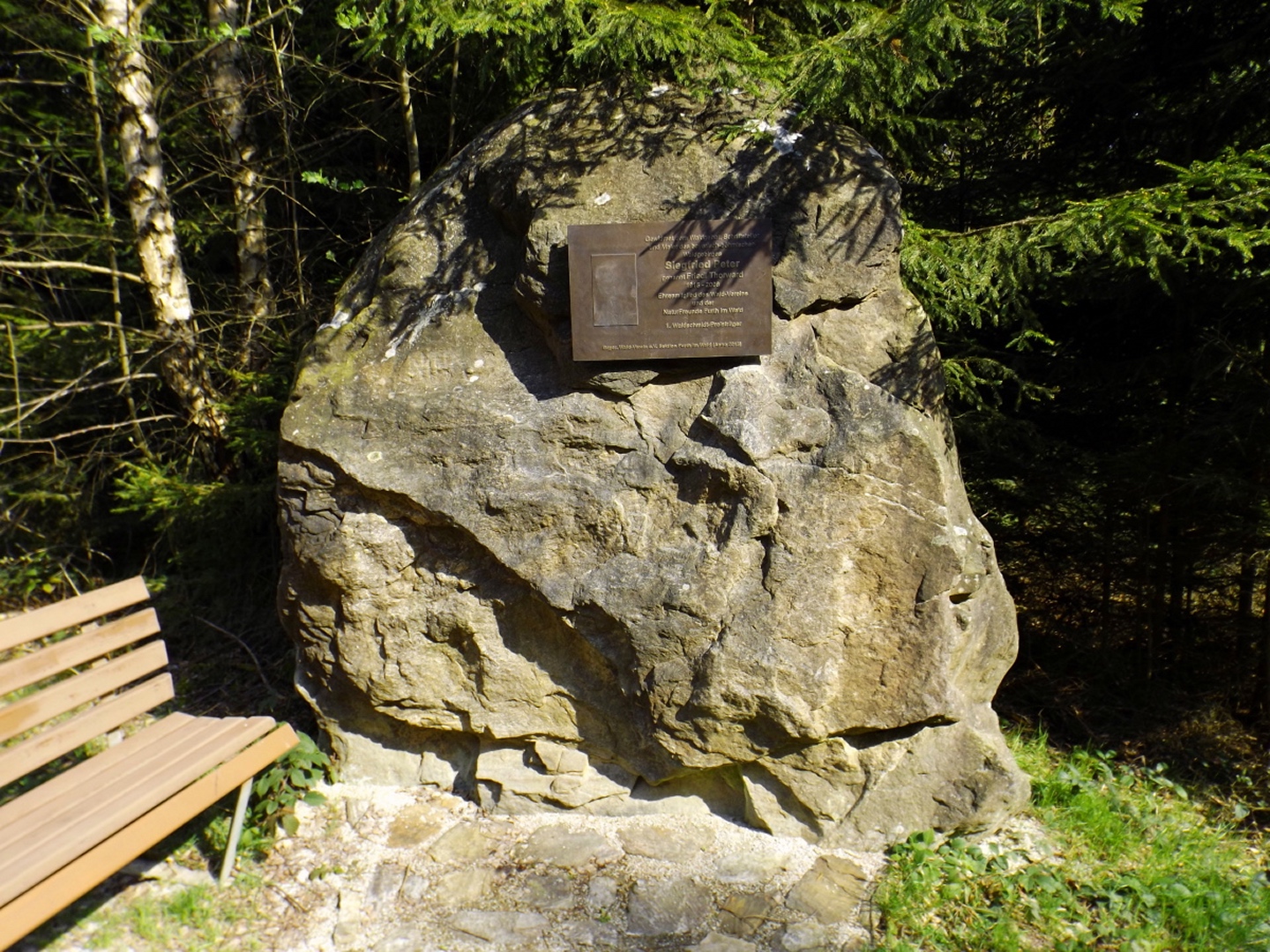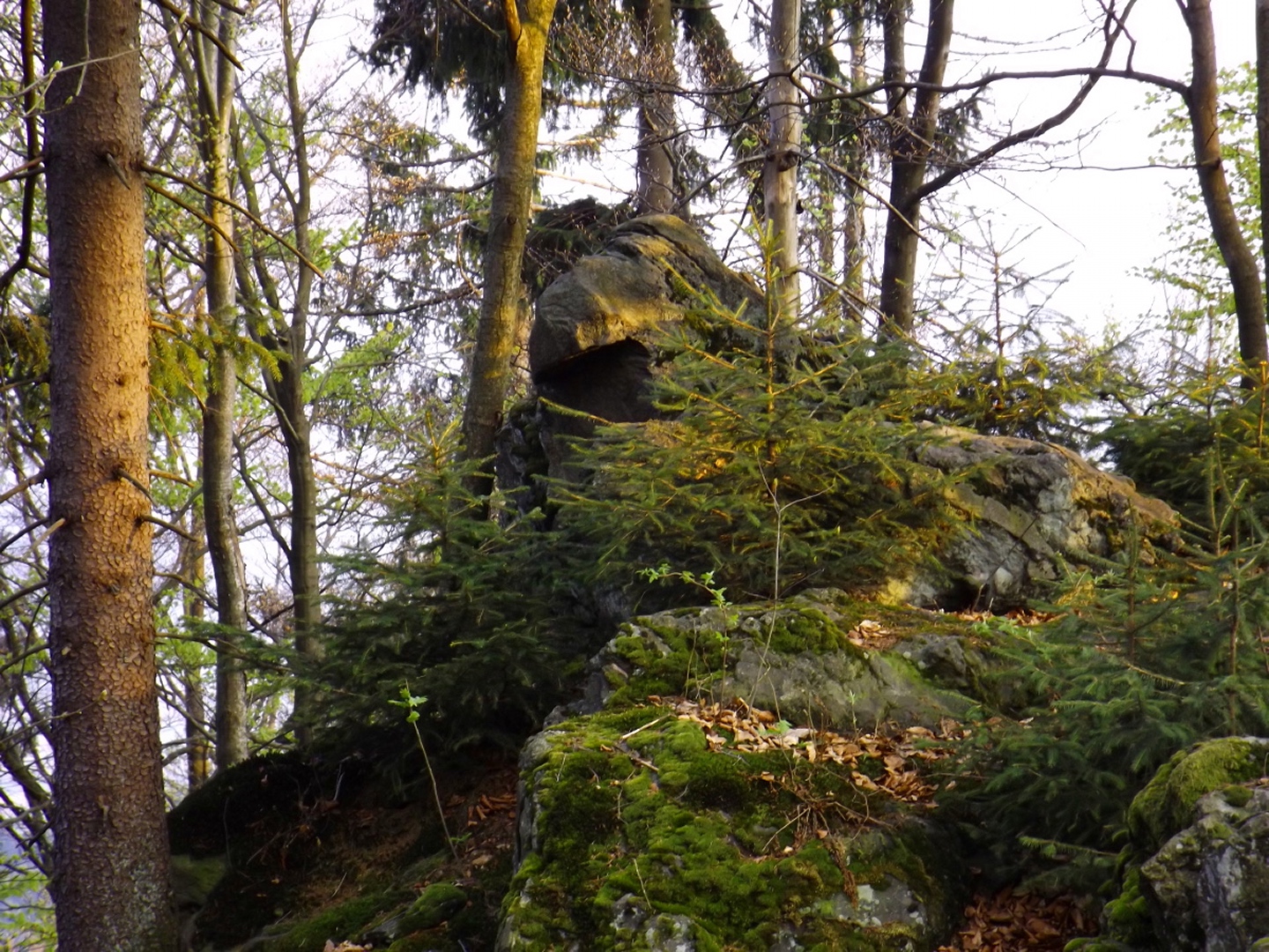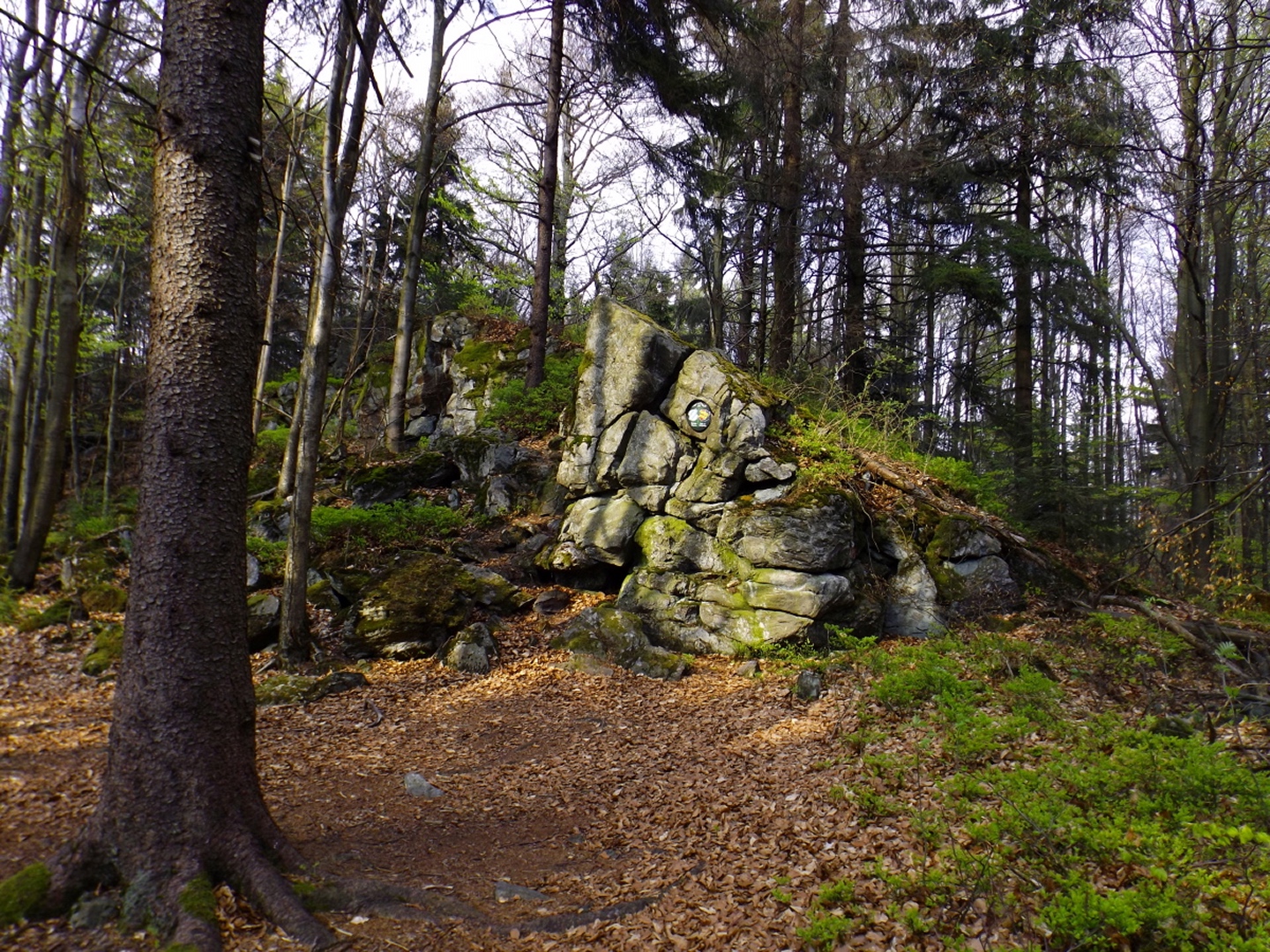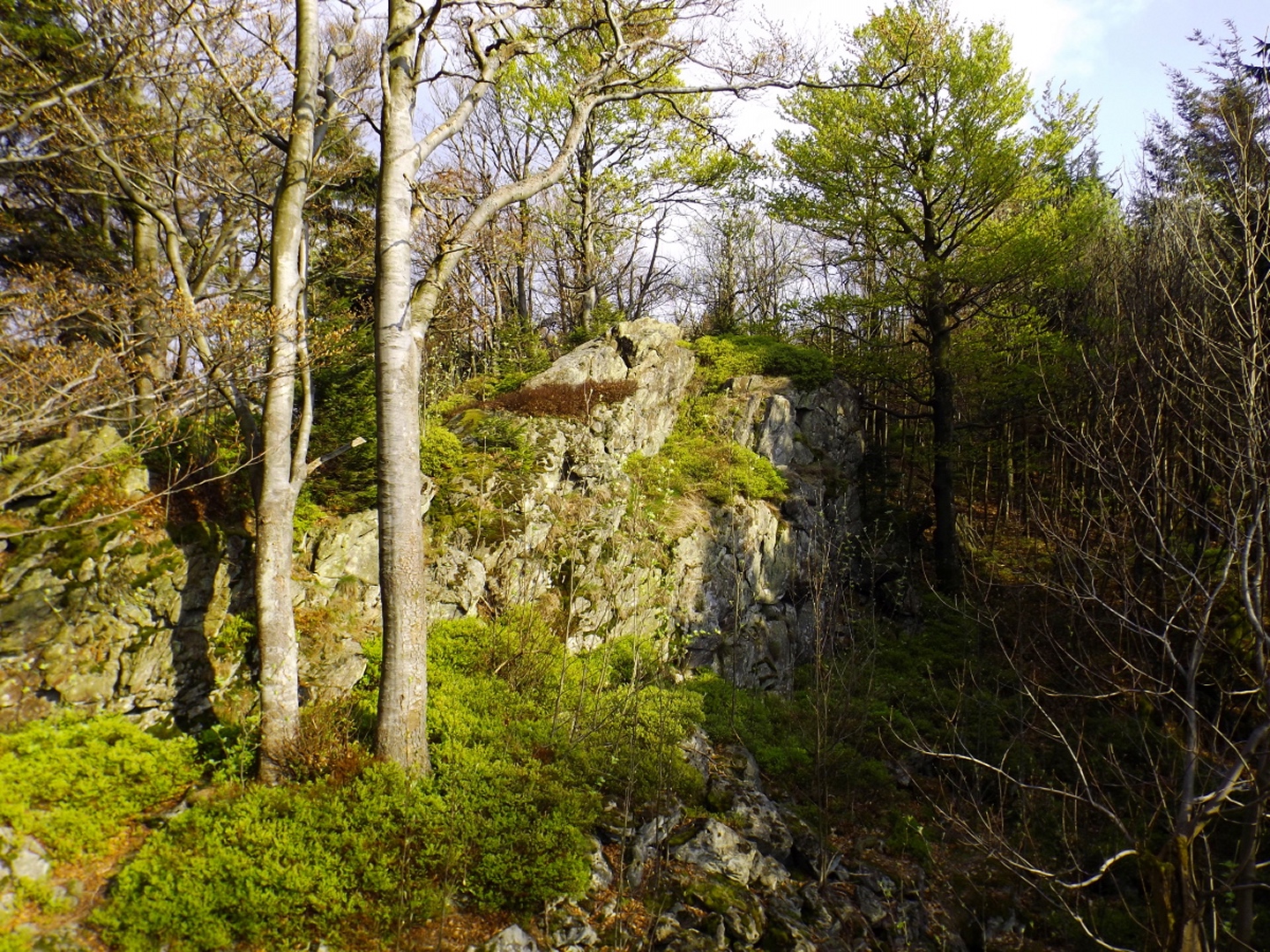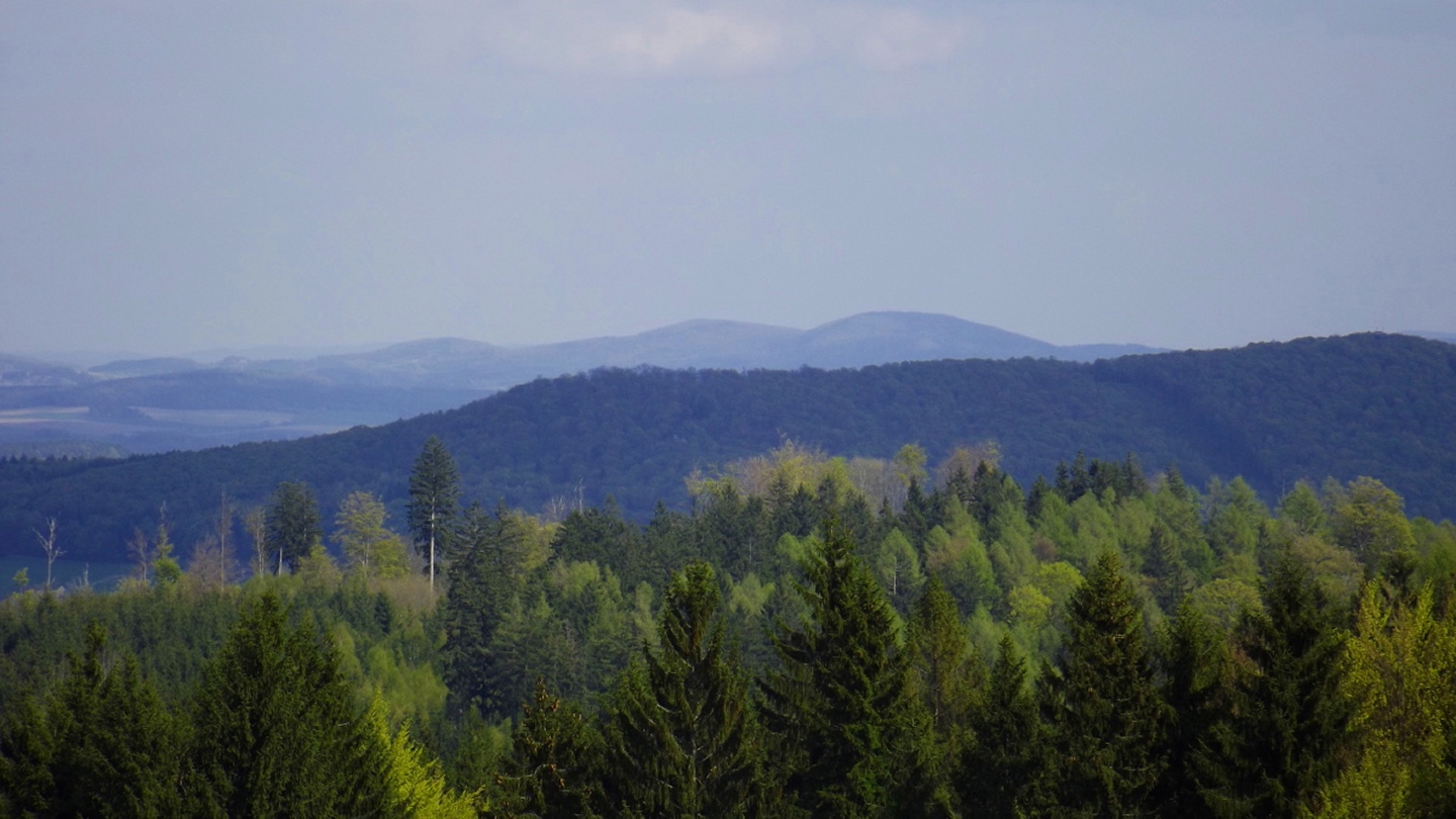 Vom Großparkplatz Golfplatz / Skilift aus geht eine Forststraße direkt in den Wald. Man kann nach wenigen Metern links abbiegen und die kurze Verbindung zum Wanderweg F9 gehen, diese ist aber nicht als solche markiert und ich hatte die Kompasskarte nicht ganz richtig interpretiert, also ging ich geradeaus weiter. Die Wegmarkierung V2 (historisch etwas belastet) ist in der Karte nicht eingezeichnet. Nach einigen Minuten querte ich die beiden Skipisten (hier hätte ich merken können, dass ich zu weit unten bin), etwas später erreichte ich einen kleinen Gedenkstein. Wieder eine Viertelstunde später war ich an einer Abzweigung, wo ich nach links abbog und nach weiteren fünf Minuten endlich meinen Fehler erkannte. War aber nicht wirklich schlimm, denn irgendwann mündet die Forststraße in den richtigen Weg, außerdem kann man an mehreren Stellen durch den Wald abkürzen. Die dritte Alternative wäre gewesen, mich nach rechts Richtung Grenze durchzuschlagen und ihr entlang zum Dreiwappenfels zu wandern. Ich entschied mich für eine Abkürzung durch den Wald, die im Gegensatz zur Hohen-Bogen-Tour auf einem Weg und damit total unproblematisch verlief. Endlich auf dem richtigen Weg angekommen, rutschte mir erst einmal mein Handtuch aus dem Hosenbund, was ich zum Glück bereits 50 Meter später merkte, als ich die nächste Abkürzung durch den Wald dokumentierte. Schnell zurück, das Teil wieder solide verstaut und weiter. Die Abkürzung mündet nach knapp einem Kilometer in einem Querweg, dem ich kurz nach rechts folgte, bis ich über mir die Böschung der Forststraße erkannte und weglos zu ihr aufstieg. Jetzt war links die richtige Richtung, an der nächsten Abzweigung musste ich rechts hinauf, es war nicht mehr weit bis zur ersten Sichtung des Kreuzfelsens in einer scharfen Linkskurve. Ich überlegte kurz, ihn weglos direkt zu erklimmen, entschied mich aber für die einfache Variante, nämlich weiter auf der Forststraße zu bleiben und an der nächsten Kreuzung dem Goldsteig zum Gipfel zu folgen. Jetzt war ich endlich auf normalen Waldpfaden unterwegs und erreichte nach insgesamt 80 Minuten und fünf Kilometern den höchsten Gipfel des Gibachtmassivs und damit des bayerischen Teils des Oberpfälzer Waldes (höher sind nur zwei Berge auf der tschechischen Seite). Ja, ich war ziemlich schnell unterwegs, es war aber auch nicht wirklich steil. Der Kreuzfelsen ist nordseitig ersteigbar, es ist zwar etwas ausgesetzt, aber mit einem ziemlich soliden Seil abgesichert. Nach einer kurzen Pause stieg ich wieder ab zum Bankerl und setzte meinen Weg nach Osten zum Dreiwappenfels fort. Zunächst geht es etwa 400 Meter schnurgerade dahin, dann taucht frontal eine Felsgruppe auf, davor ein Hinweisschild in Sachen Langlaufloipen. Normalerweise geht es hier rechts weiter, dann geschieht der nächste Abschnitt eben umgekehrt. Ich entschied mich für den linken Weg und erreichte gleich den Pfennigfelsen, der mit einer schönen Aussicht Richtung Waldmünchen punkten kann. Danach geht es bis zur Grenze durch den Wald, ein paar Meter der Grenze entlang bis zu einem Unterstandhäuschen und rechter Hand dem Dreiwappenfels. Dieser war einmal der Grenzpunkt zwischen dem Churfürstentum Baiern, dem Königreich Böhmen und dem Herzogtum Pfalz, inzwischen liegt er etwa zehn Meter von der Grenze zwischen Bayern und Tschechien entfernt und vollständig im Landkreis Cham. Kurz hinaufgestiegen, ein Schluck aus der Trinkflasche und weiter ging es zurück Richtung Hinweistaferl, an dem ich den Weg von vorhin kreuzte und mich Richtung Wirtshaus Gibacht machte, welches ich nach einer halben Stunde erreichte. Unterwegs kam mir eine komplette Hundeschule entgegen, da wäre Coco ziemlich frustriert gewesen, weil keiner der Hunde mit ihr spielen dürfen hätte. Nach einem Naabecker Dunkel, dem Umstellen der Kamera von ISO 64 auf 200 und ein paar Fotos im hundefreundlichen Wirthaus (mit vier weiteren Hunden) machte ich mich auf den Rückweg nach Voithenberg, der noch drei weitere Gipfelchen beinhaltete. Zunächst ging es auf einer Forststraße nach Süden weiter, bevor nach etwa 200 Metern ein nicht markierter Weg links in den Wald hinaufzieht. Von diesem biegt sehr schnell ein kleiner Pfad rechts ab, auf dem ich bald einen Sattel erreichte, von dem aus Punkt 934 schell links erreichbar ist. Zurück auf dem Pfad, windet sich der Weiterweg durch den Wald, bis Punkt 930 mit dem Leuchtturm der Menschlichkeit vor mir auftauchte. Dieses Kunstwerk wurde wie auch das nächste vom Wirt des Gibacht-Wirtshauses geschaffen und mir auch von ihm empfohlen. Nachts wird er angestrahlt und ist wohl von Gleißenberg aus zu sehen. Man hat hier bei gutem Wetter feine Sicht nach Südwesten, wo sich allerdings die Stadt Cham hinter Hügeln versteckt. Nachdem ich sie ein paar Minuten genossen hatte, ging ich wieder ein paar Meter zurück und hinter dem Turm vorbei weiter nach Süden. Der Weg ist jetzt wieder markiert und auch einigermaßen deutlich, man kann kurz rechts eine Forststraße erkennen, die man aber nicht anpeilen sollte. 700 Meter weiter ist dann der letzte Gipfel, aber nicht der letzte Höhe- und Aussichtspunkt des Tages, das Reiseck mit seinem Gläsernen Kreuz, das vom Gibachtwirt zum Gedenken an die verstorbenen Glasbläser der Region geschaffen wurde. Hier geht der Ausblick hinunter nach Furth im Wald, von wo aus man es auch sehr schön erkennen kann, und hinüber zum Hohen Bogen. Ab hier war ich auch wieder auf dem Goldsteig unterwegs. Kurz nach dem Reiseck folgt die „Schlüsselstelle“ der Runde, ein kleiner felsiger Abstieg, der zwar nicht versichert, aber gut gestuft und wenig problematisch abzusteigen ist. Vielleicht T3, im Aufstieg definitiv noch leichter. Jetzt muss man ab und zu ein bisserl aufpassen, um den Weg nicht zu verlieren und darf sich vor allem nicht dazu verleiten lassen, zum Reiseck-Wanderparkplatz abzusteigen, wenn das Auto in Voithenberg steht. Teilweise geht es jetzt auch etwas steiler hinunter, es sind immer