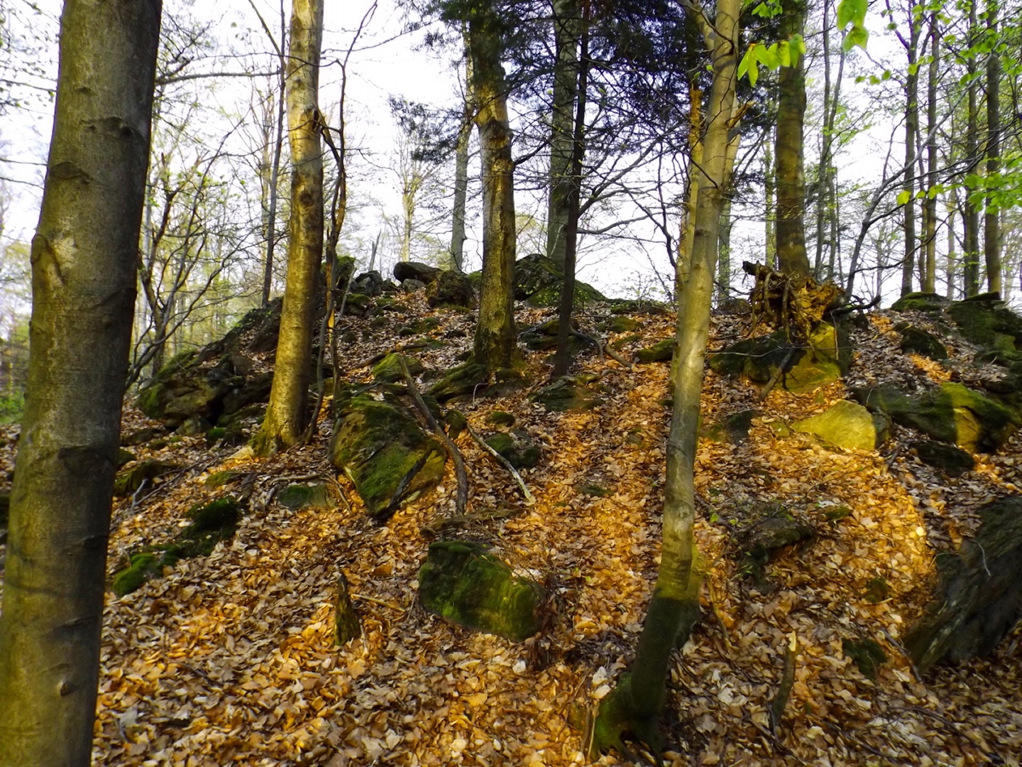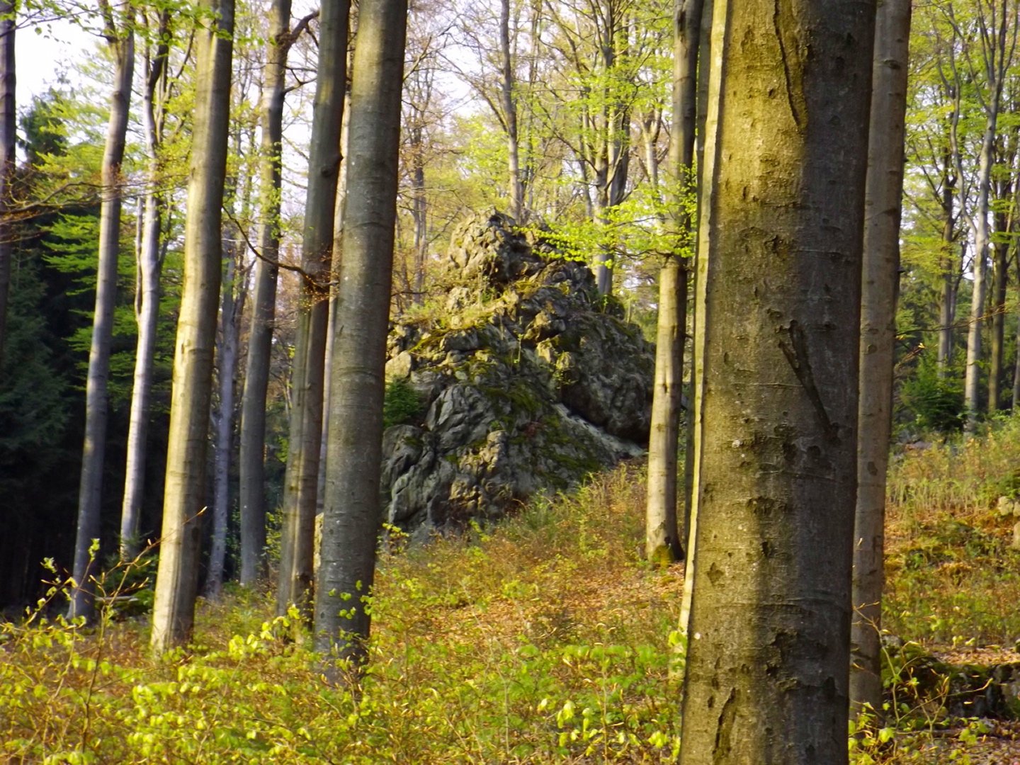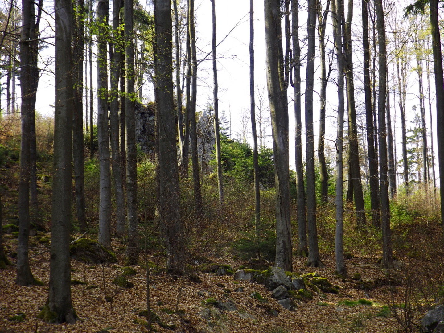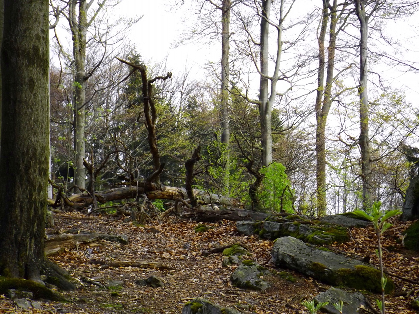 Vom Großparkplatz Golfplatz / Skilift aus geht eine Forststraße direkt in den Wald. Man kann nach wenigen Metern links abbiegen und die kurze Verbindung zum Wanderweg F9 gehen, diese ist aber nicht als solche markiert und ich hatte die Kompasskarte nicht ganz richtig interpretiert, also ging ich geradeaus weiter. Die Wegmarkierung V2 (historisch etwas belastet) ist in der Karte nicht eingezeichnet. Nach einigen Minuten querte ich die beiden Skipisten (hier hätte ich merken können, dass ich zu weit unten bin), etwas später erreichte ich einen kleinen Gedenkstein. Wieder eine Viertelstunde später war ich an einer Abzweigung, wo ich nach links abbog und nach weiteren fünf Minuten endlich meinen Fehler erkannte. War aber nicht wirklich schlimm, denn irgendwann mündet die Forststraße in den richtigen Weg, außerdem kann man an mehreren Stellen durch den Wald abkürzen. Die dritte Alternative wäre gewesen, mich nach rechts Richtung Grenze durchzuschlagen und ihr entlang zum Dreiwappenfels zu wandern. Ich entschied mich für eine Abkürzung durch den Wald, die im Gegensatz zur Hohen-Bogen-Tour auf einem Weg und damit total unproblematisch verlief. Endlich auf dem richtigen Weg angekommen, rutschte mir erst einmal mein Handtuch aus dem Hosenbund, was ich zum Glück bereits 50 Meter später merkte, als ich die nächste Abkürzung durch den Wald dokumentierte. Schnell zurück, das Teil wieder solide verstaut und weiter. Die Abkürzung mündet nach knapp einem Kilometer in einem Querweg, dem ich kurz nach rechts folgte, bis ich über mir die Böschung der Forststraße erkannte und weglos zu ihr aufstieg. Jetzt war links die richtige Richtung, an der nächsten Abzweigung musste ich rechts hinauf, es war nicht mehr weit bis zur ersten Sichtung des Kreuzfelsens in einer scharfen Linkskurve. Ich überlegte kurz, ihn weglos direkt zu erklimmen, entschied mich aber für die einfache Variante, nämlich weiter auf der Forststraße zu bleiben und an der nächsten Kreuzung dem Goldsteig zum Gipfel zu folgen. Jetzt war ich endlich auf normalen Waldpfaden unterwegs und erreichte nach insgesamt 80 Minuten und fünf Kilometern den höchsten Gipfel des Gibachtmassivs und damit des bayerischen Teils des Oberpfälzer Waldes (höher sind nur zwei Berge auf der tschechischen Seite). Ja, ich war ziemlich schnell unterwegs, es war aber auch nicht wirklich steil. Der Kreuzfelsen ist nordseitig ersteigbar, es ist zwar etwas ausgesetzt, aber mit einem ziemlich soliden Seil abgesichert. Nach einer kurzen Pause stieg ich wieder ab zum Bankerl und setzte meinen Weg nach Osten zum Dreiwappenfels fort. Zunächst geht es etwa 400 Meter schnurgerade dahin, dann taucht frontal eine Felsgruppe auf, davor ein Hinweisschild in Sachen Langlaufloipen. Normalerweise geht es hier rechts weiter, dann geschieht der nächste Abschnitt eben umgekehrt. Ich entschied mich für den linken Weg und erreichte gleich den Pfennigfelsen, der mit einer schönen Aussicht Richtung Waldmünchen punkten kann. Danach geht es bis zur Grenze durch den Wald, ein paar Meter der Grenze entlang bis zu einem Unterstandhäuschen und rechter Hand dem Dreiwappenfels. Dieser war einmal der Grenzpunkt zwischen dem Churfürstentum Baiern, dem Königreich Böhmen und dem Herzogtum Pfalz, inzwischen liegt er etwa zehn Meter von der Grenze zwischen Bayern und Tschechien entfernt und vollständig im Landkreis Cham. Kurz hinaufgestiegen, ein Schluck aus der Trinkflasche und weiter ging es zurück Richtung Hinweistaferl, an dem ich den Weg von vorhin kreuzte und mich Richtung Wirtshaus Gibacht machte, welches ich nach einer halben Stunde erreichte. Unterwegs kam mir eine komplette Hundeschule entgegen, da wäre Coco ziemlich frustriert gewesen, weil keiner der Hunde mit ihr spielen dürfen hätte. Nach einem Naabecker Dunkel, dem Umstellen der Kamera von ISO 64 auf 200 und ein paar Fotos im hundefreundlichen Wirthaus (mit vier weiteren Hunden) machte ich mich auf den Rückweg nach Voithenberg, der noch drei weitere Gipfelchen beinhaltete. Zunächst ging es auf einer Forststraße nach Süden weiter, bevor nach etwa 200 Metern ein nicht markierter Weg links in den Wald hinaufzieht. Von diesem biegt sehr schnell ein kleiner Pfad rechts ab, auf dem ich bald einen Sattel erreichte, von dem aus Punkt 934 schell links erreichbar ist. Zurück auf dem Pfad, windet sich der Weiterweg durch den Wald, bis Punkt 930 mit dem Leuchtturm der Menschlichkeit vor mir auftauchte. Dieses Kunstwerk wurde wie auch das nächste vom Wirt des Gibacht-Wirtshauses geschaffen und mir auch von ihm empfohlen. Nachts wird er angestrahlt und ist wohl von Gleißenberg aus zu sehen. Man hat hier bei gutem Wetter feine Sicht nach Südwesten, wo sich allerdings die Stadt Cham hinter Hügeln versteckt. Nachdem ich sie ein paar Minuten genossen hatte, ging ich wieder ein paar Meter zurück und hinter dem Turm vorbei weiter nach Süden. Der Weg ist jetzt wieder markiert und auch einigermaßen deutlich, man kann kurz rechts eine Forststraße erkennen, die man aber nicht anpeilen sollte. 700 Meter weiter ist dann der letzte Gipfel, aber nicht der letzte Höhe- und Aussichtspunkt des Tages, das Reiseck mit seinem Gläsernen Kreuz, das vom Gibachtwirt zum Gedenken an die verstorbenen Glasbläser der Region geschaffen wurde. Hier geht der Ausblick hinunter nach Furth im Wald, von wo aus man es auch sehr schön erkennen kann, und hinüber zum Hohen Bogen. Ab hier war ich auch wieder auf dem Goldsteig unterwegs. Kurz nach dem Reiseck folgt die „Schlüsselstelle“ der Runde, ein kleiner felsiger Abstieg, der zwar nicht versichert, aber gut gestuft und wenig problematisch abzusteigen ist. Vielleicht T3, im Aufstieg definitiv noch leichter. Jetzt muss man ab und zu ein bisserl aufpassen, um den Weg nicht zu verlieren und darf sich vor allem nicht dazu verleiten lassen, zum Reiseck-Wanderparkplatz abzusteigen, wenn das Auto in Voithenberg steht. Teilweise geht es jetzt auch etwas steiler hinunter, es sind immer