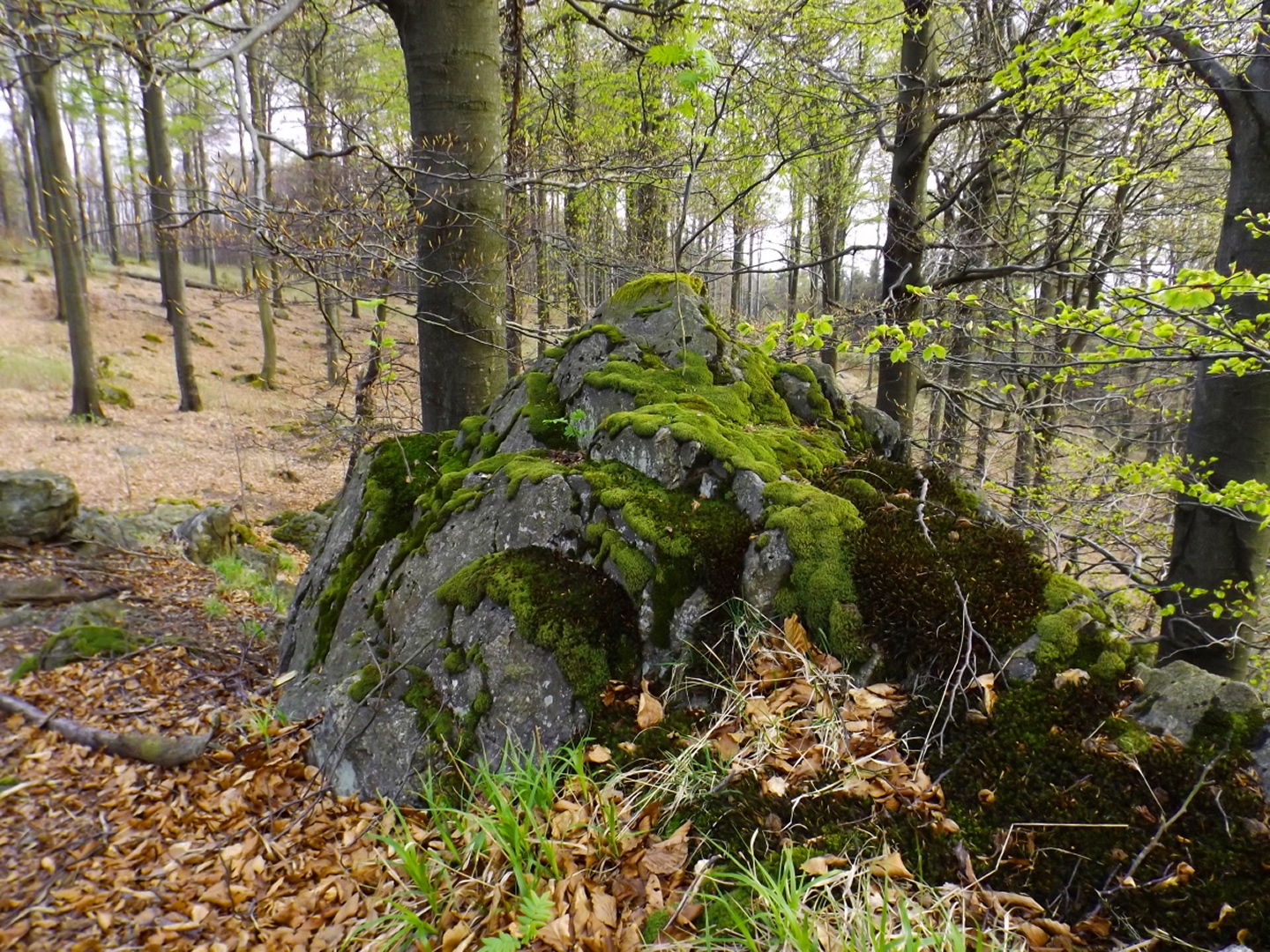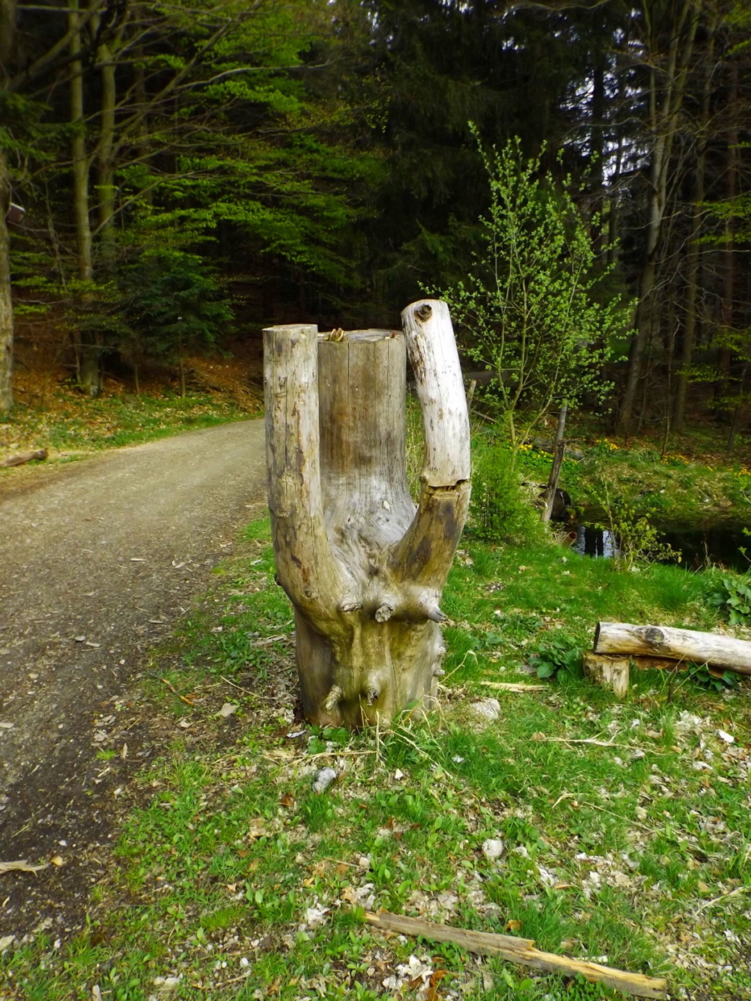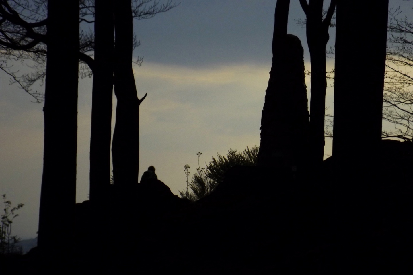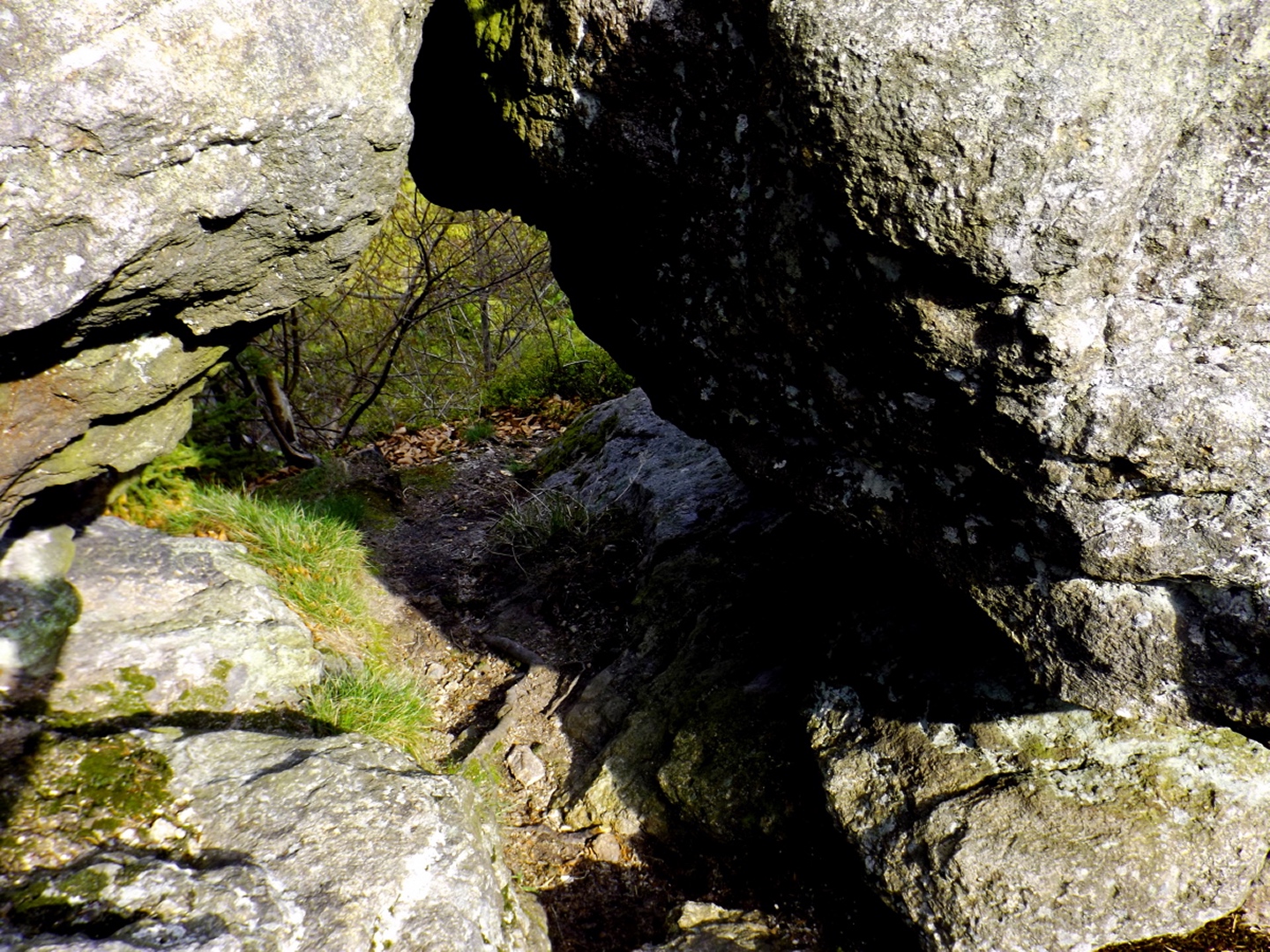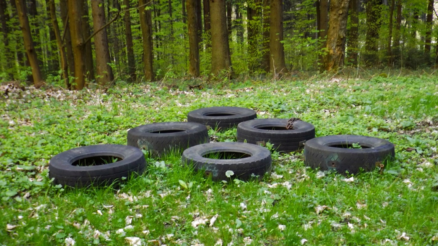 Vom Großparkplatz Golfplatz / Skilift aus geht eine Forststraße direkt in den Wald. Man kann nach wenigen Metern links abbiegen und die kurze Verbindung zum Wanderweg F9 gehen, diese ist aber nicht als solche markiert und ich hatte die Kompasskarte nicht ganz richtig interpretiert, also ging ich geradeaus weiter. Die Wegmarkierung V2 (historisch etwas belastet) ist in der Karte nicht eingezeichnet. Nach einigen Minuten querte ich die beiden Skipisten (hier hätte ich merken können, dass ich zu weit unten bin), etwas später erreichte ich einen kleinen Gedenkstein. Wieder eine Viertelstunde später war ich an einer Abzweigung, wo ich nach links abbog und nach weiteren fünf Minuten endlich meinen Fehler erkannte. War aber nicht wirklich schlimm, denn irgendwann mündet die Forststraße in den richtigen Weg, außerdem kann man an mehreren Stellen durch den Wald abkürzen. Die dritte Alternative wäre gewesen, mich nach rechts Richtung Grenze durchzuschlagen und ihr entlang zum Dreiwappenfels zu wandern. Ich entschied mich für eine Abkürzung durch den Wald, die im Gegensatz zur Hohen-Bogen-Tour auf einem Weg und damit total unproblematisch verlief. Endlich auf dem richtigen Weg angekommen, rutschte mir erst einmal mein Handtuch aus dem Hosenbund, was ich zum Glück bereits 50 Meter später merkte, als ich die nächste Abkürzung durch den Wald dokumentierte. Schnell zurück, das Teil wieder solide verstaut und weiter. Die Abkürzung mündet nach knapp einem Kilometer in einem Querweg, dem ich kurz nach rechts folgte, bis ich über mir die Böschung der Forststraße erkannte und weglos zu ihr aufstieg. Jetzt war links die richtige Richtung, an der nächsten Abzweigung musste ich rechts hinauf, es war nicht mehr weit bis zur ersten Sichtung des Kreuzfelsens in einer scharfen Linkskurve. Ich überlegte kurz, ihn weglos direkt zu erklimmen, entschied mich aber für die einfache Variante, nämlich weiter auf der Forststraße zu bleiben und an der nächsten Kreuzung dem Goldsteig zum Gipfel zu folgen. Jetzt war ich endlich auf normalen Waldpfaden unterwegs und erreichte nach insgesamt 80 Minuten und fünf Kilometern den höchsten Gipfel des Gibachtmassivs und damit des bayerischen Teils des Oberpfälzer Waldes (höher sind nur zwei Berge auf der tschechischen Seite). Ja, ich war ziemlich schnell unterwegs, es war aber auch nicht wirklich steil. Der Kreuzfelsen ist nordseitig ersteigbar, es ist zwar etwas ausgesetzt, aber mit einem ziemlich soliden Seil abgesichert. Nach einer kurzen Pause stieg ich wieder ab zum Bankerl und setzte meinen Weg nach Osten zum Dreiwappenfels fort. Zunächst geht es etwa 400 Meter schnurgerade dahin, dann taucht frontal eine Felsgruppe auf, davor ein Hinweisschild in Sachen Langlaufloipen. Normalerweise geht es hier rechts weiter, dann geschieht der nächste Abschnitt eben umgekehrt. Ich entschied mich für den linken Weg und erreichte gleich den Pfennigfelsen, der mit einer schönen Aussicht Richtung Waldmünchen punkten kann. Danach geht es bis zur Grenze durch den Wald, ein paar Meter der Grenze entlang bis zu einem Unterstandhäuschen und rechter Hand dem Dreiwappenfels. Dieser war einmal der Grenzpunkt zwischen dem Churfürstentum Baiern, dem Königreich Böhmen und dem Herzogtum Pfalz, inzwischen liegt er etwa zehn Meter von der Grenze zwischen Bayern und Tschechien entfernt und vollständig im Landkreis Cham. Kurz hinaufgestiegen, ein Schluck aus der Trinkflasche und weiter ging es zurück Richtung Hinweistaferl, an dem ich den Weg von vorhin kreuzte und mich Richtung Wirtshaus Gibacht machte, welches ich nach einer halben Stunde erreichte. Unterwegs kam mir eine komplette Hundeschule entgegen, da wäre Coco ziemlich frustriert gewesen, weil keiner der Hunde mit ihr spielen dürfen hätte. Nach einem Naabecker Dunkel, dem Umstellen der Kamera von ISO 64 auf 200 und ein paar Fotos im hundefreundlichen Wirthaus (mit vier weiteren Hunden) machte ich mich auf den Rückweg nach Voithenberg, der noch drei weitere Gipfelchen beinhaltete. Zunächst ging es auf einer Forststraße nach Süden weiter, bevor nach etwa 200 Metern ein nicht markierter Weg links in den Wald hinaufzieht. Von diesem biegt sehr schnell ein kleiner Pfad rechts ab, auf dem ich bald einen Sattel erreichte, von dem aus Punkt 934 schell links erreichbar ist. Zurück auf dem Pfad, windet sich der Weiterweg durch den Wald, bis Punkt 930 mit dem Leuchtturm der Menschlichkeit vor mir auftauchte. Dieses Kunstwerk wurde wie auch das nächste vom Wirt des Gibacht-Wirtshauses geschaffen und mir auch von ihm empfohlen. Nachts wird er angestrahlt und ist wohl von Gleißenberg aus zu sehen. Man hat hier bei gutem Wetter feine Sicht nach Südwesten, wo sich allerdings die Stadt Cham hinter Hügeln versteckt. Nachdem ich sie ein paar Minuten genossen hatte, ging ich wieder ein paar Meter zurück und hinter dem Turm vorbei weiter nach Süden. Der Weg ist jetzt wieder markiert und auch einigermaßen deutlich, man kann kurz rechts eine Forststraße erkennen, die man aber nicht anpeilen sollte. 700 Meter weiter ist dann der letzte Gipfel, aber nicht der letzte Höhe- und Aussichtspunkt des Tages, das Reiseck mit seinem Gläsernen Kreuz, das vom Gibachtwirt zum Gedenken an die verstorbenen Glasbläser der Region geschaffen wurde. Hier geht der Ausblick hinunter nach Furth im Wald, von wo aus man es auch sehr schön erkennen kann, und hinüber zum Hohen Bogen. Ab hier war ich auch wieder auf dem Goldsteig unterwegs. Kurz nach dem Reiseck folgt die „Schlüsselstelle“ der Runde, ein kleiner felsiger Abstieg, der zwar nicht versichert, aber gut gestuft und wenig problematisch abzusteigen ist. Vielleicht T3, im Aufstieg definitiv noch leichter. Jetzt muss man ab und zu ein bisserl aufpassen, um den Weg nicht zu verlieren und darf sich vor allem nicht dazu verleiten lassen, zum Reiseck-Wanderparkplatz abzusteigen, wenn das Auto in Voithenberg steht. Teilweise geht es jetzt auch etwas steiler hinunter, es sind immer