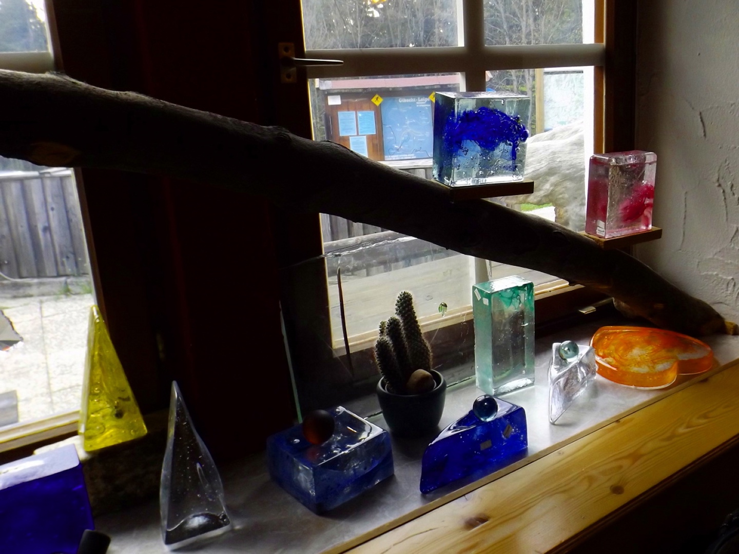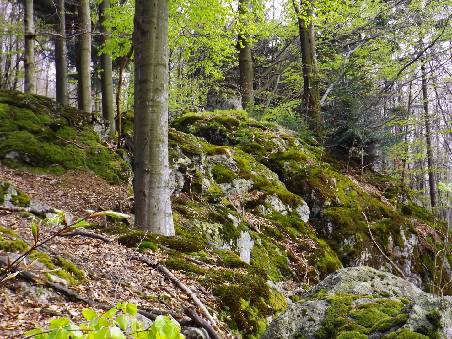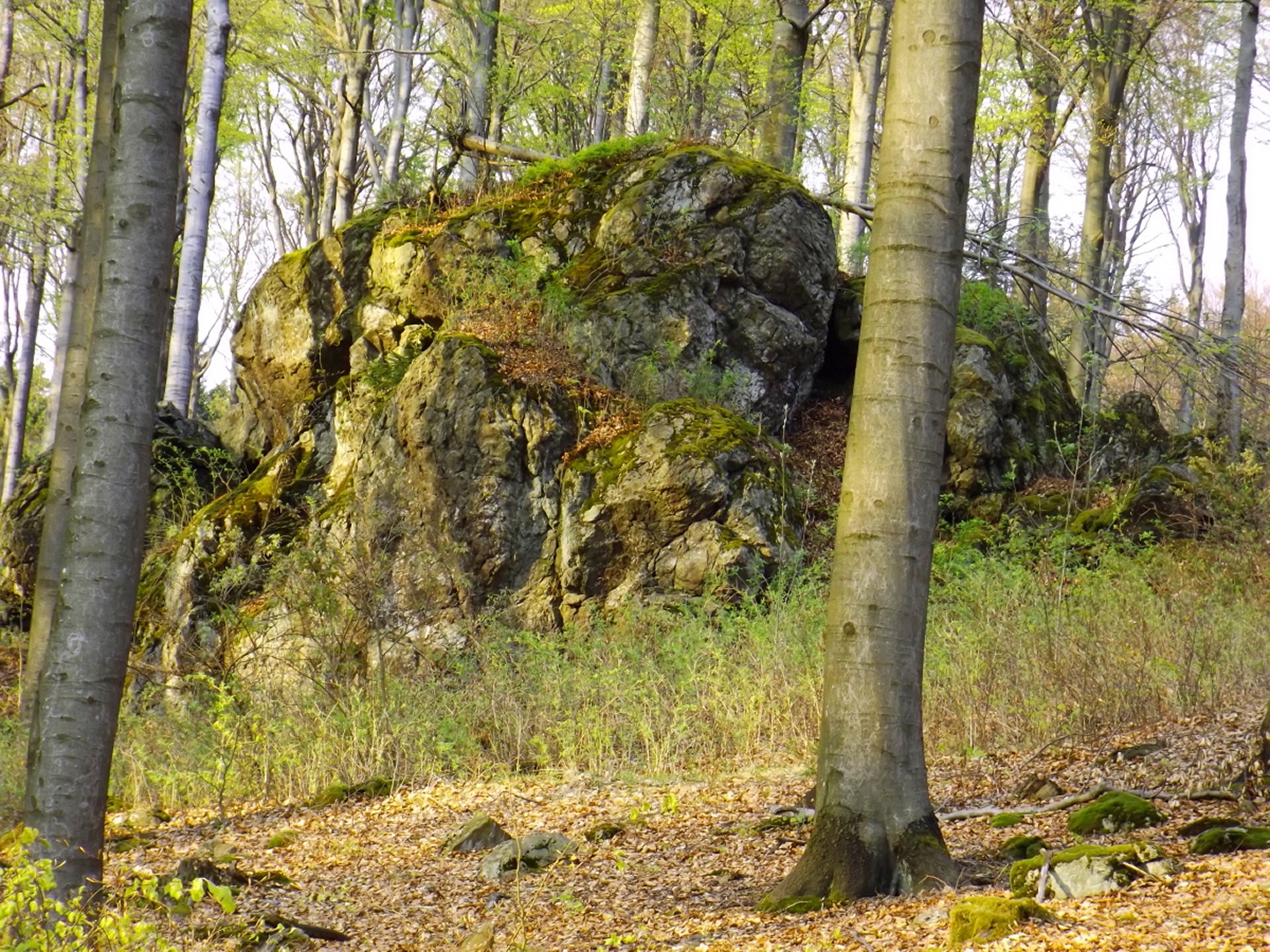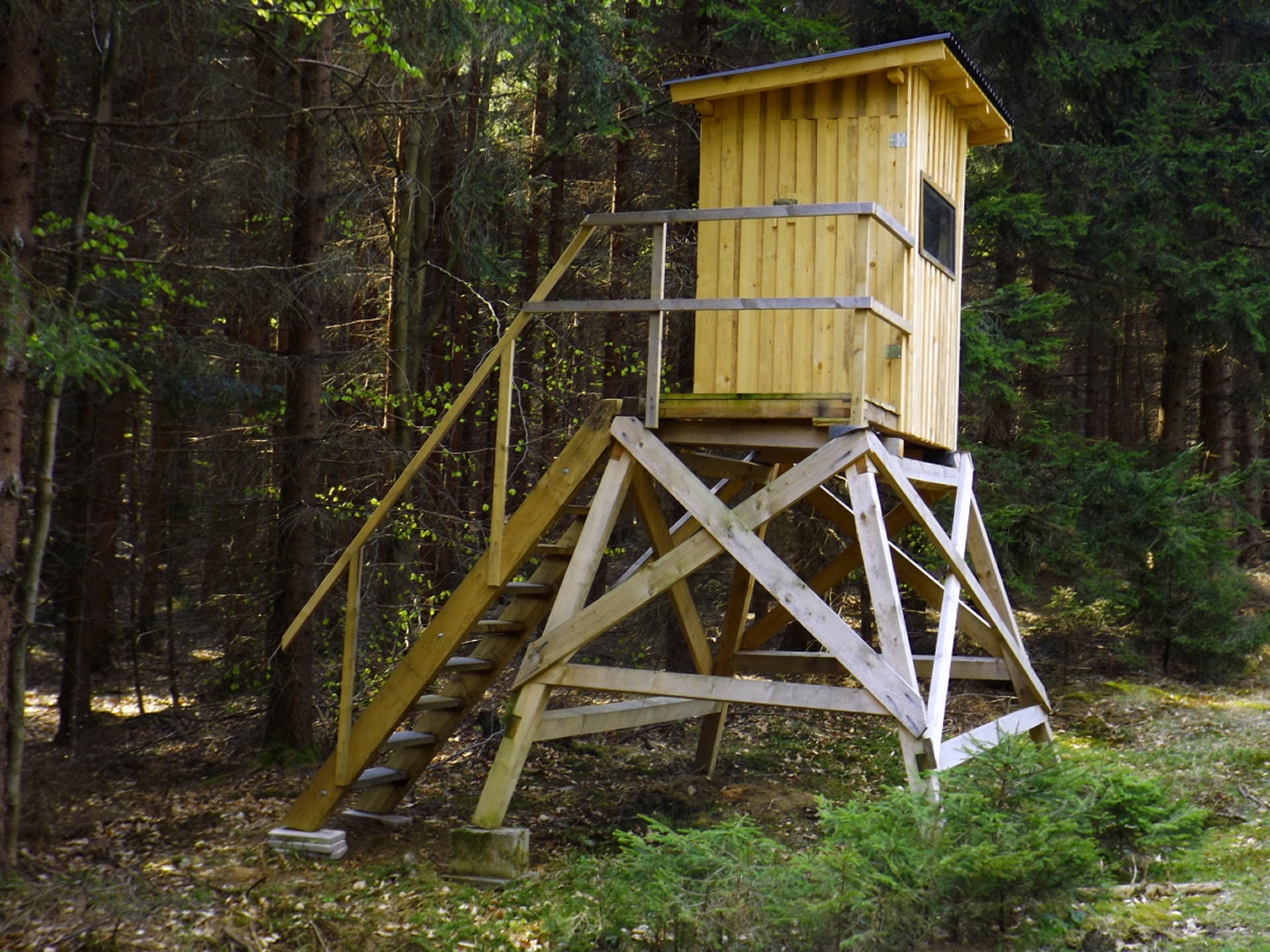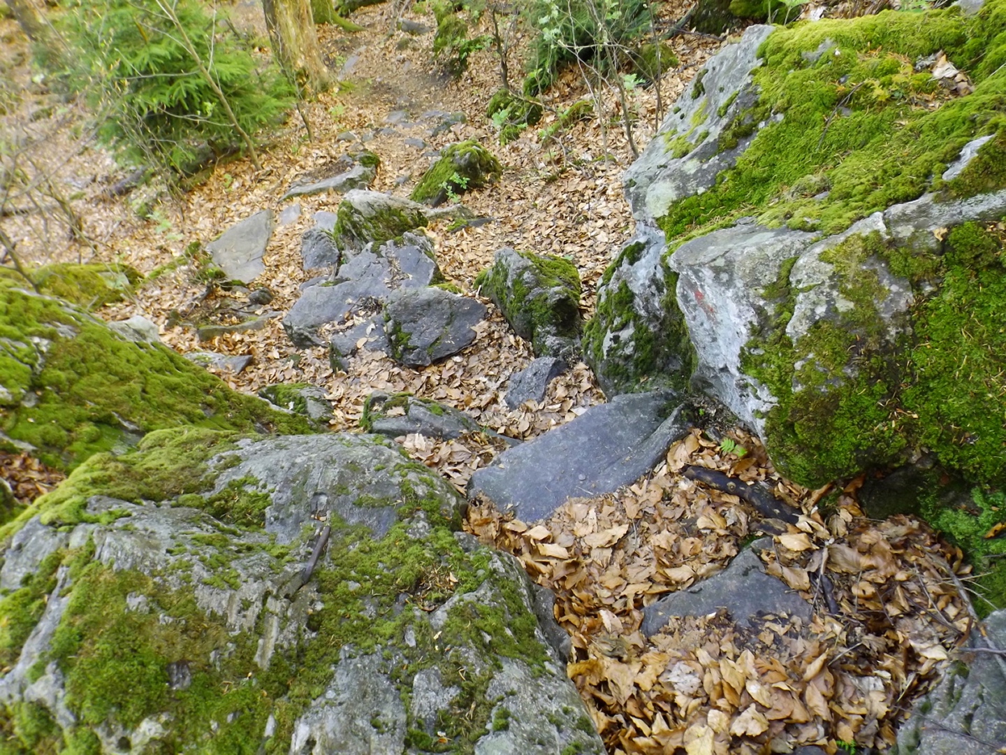 Vom Großparkplatz Golfplatz / Skilift aus geht eine Forststraße direkt in den Wald. Man kann nach wenigen Metern links abbiegen und die kurze Verbindung zum Wanderweg F9 gehen, diese ist aber nicht als solche markiert und ich hatte die Kompasskarte nicht ganz richtig interpretiert, also ging ich geradeaus weiter. Die Wegmarkierung V2 (historisch etwas belastet) ist in der Karte nicht eingezeichnet. Nach einigen Minuten querte ich die beiden Skipisten (hier hätte ich merken können, dass ich zu weit unten bin), etwas später erreichte ich einen kleinen Gedenkstein. Wieder eine Viertelstunde später war ich an einer Abzweigung, wo ich nach links abbog und nach weiteren fünf Minuten endlich meinen Fehler erkannte. War aber nicht wirklich schlimm, denn irgendwann mündet die Forststraße in den richtigen Weg, außerdem kann man an mehreren Stellen durch den Wald abkürzen. Die dritte Alternative wäre gewesen, mich nach rechts Richtung Grenze durchzuschlagen und ihr entlang zum Dreiwappenfels zu wandern. Ich entschied mich für eine Abkürzung durch den Wald, die im Gegensatz zur Hohen-Bogen-Tour auf einem Weg und damit total unproblematisch verlief. Endlich auf dem richtigen Weg angekommen, rutschte mir erst einmal mein Handtuch aus dem Hosenbund, was ich zum Glück bereits 50 Meter später merkte, als ich die nächste Abkürzung durch den Wald dokumentierte. Schnell zurück, das Teil wieder solide verstaut und weiter. Die Abkürzung mündet nach knapp einem Kilometer in einem Querweg, dem ich kurz nach rechts folgte, bis ich über mir die Böschung der Forststraße erkannte und weglos zu ihr aufstieg. Jetzt war links die richtige Richtung, an der nächsten Abzweigung musste ich rechts hinauf, es war nicht mehr weit bis zur ersten Sichtung des Kreuzfelsens in einer scharfen Linkskurve. Ich überlegte kurz, ihn weglos direkt zu erklimmen, entschied mich aber für die einfache Variante, nämlich weiter auf der Forststraße zu bleiben und an der nächsten Kreuzung dem Goldsteig zum Gipfel zu folgen. Jetzt war ich endlich auf normalen Waldpfaden unterwegs und erreichte nach insgesamt 80 Minuten und fünf Kilometern den höchsten Gipfel des Gibachtmassivs und damit des bayerischen Teils des Oberpfälzer Waldes (höher sind nur zwei Berge auf der tschechischen Seite). Ja, ich war ziemlich schnell unterwegs, es war aber auch nicht wirklich steil. Der Kreuzfelsen ist nordseitig ersteigbar, es ist zwar etwas ausgesetzt, aber mit einem ziemlich soliden Seil abgesichert. Nach einer kurzen Pause stieg ich wieder ab zum Bankerl und setzte meinen Weg nach Osten zum Dreiwappenfels fort. Zunächst geht es etwa 400 Meter schnurgerade dahin, dann taucht frontal eine Felsgruppe auf, davor ein Hinweisschild in Sachen Langlaufloipen. Normalerweise geht es hier rechts weiter, dann geschieht der nächste Abschnitt eben umgekehrt. Ich entschied mich für den linken Weg und erreichte gleich den Pfennigfelsen, der mit einer schönen Aussicht Richtung Waldmünchen punkten kann. Danach geht es bis zur Grenze durch den Wald, ein paar Meter der Grenze entlang bis zu einem Unterstandhäuschen und rechter Hand dem Dreiwappenfels. Dieser war einmal der Grenzpunkt zwischen dem Churfürstentum Baiern, dem Königreich Böhmen und dem Herzogtum Pfalz, inzwischen liegt er etwa zehn Meter von der Grenze zwischen Bayern und Tschechien entfernt und vollständig im Landkreis Cham. Kurz hinaufgestiegen, ein Schluck aus der Trinkflasche und weiter ging es zurück Richtung Hinweistaferl, an dem ich den Weg von vorhin kreuzte und mich Richtung Wirtshaus Gibacht machte, welches ich nach einer halben Stunde erreichte. Unterwegs kam mir eine komplette Hundeschule entgegen, da wäre Coco ziemlich frustriert gewesen, weil keiner der Hunde mit ihr spielen dürfen hätte. Nach einem Naabecker Dunkel, dem Umstellen der Kamera von ISO 64 auf 200 und ein paar Fotos im hundefreundlichen Wirthaus (mit vier weiteren Hunden) machte ich mich auf den Rückweg nach Voithenberg, der noch drei weitere Gipfelchen beinhaltete. Zunächst ging es auf einer Forststraße nach Süden weiter, bevor nach etwa 200 Metern ein nicht markierter Weg links in den Wald hinaufzieht. Von diesem biegt sehr schnell ein kleiner Pfad rechts ab, auf dem ich bald einen Sattel erreichte, von dem aus Punkt 934 schell links erreichbar ist. Zurück auf dem Pfad, windet sich der Weiterweg durch den Wald, bis Punkt 930 mit dem Leuchtturm der Menschlichkeit vor mir auftauchte. Dieses Kunstwerk wurde wie auch das nächste vom Wirt des Gibacht-Wirtshauses geschaffen und mir auch von ihm empfohlen. Nachts wird er angestrahlt und ist wohl von Gleißenberg aus zu sehen. Man hat hier bei gutem Wetter feine Sicht nach Südwesten, wo sich allerdings die Stadt Cham hinter Hügeln versteckt. Nachdem ich sie ein paar Minuten genossen hatte, ging ich wieder ein paar Meter zurück und hinter dem Turm vorbei weiter nach Süden. Der Weg ist jetzt wieder markiert und auch einigermaßen deutlich, man kann kurz rechts eine Forststraße erkennen, die man aber nicht anpeilen sollte. 700 Meter weiter ist dann der letzte Gipfel, aber nicht der letzte Höhe- und Aussichtspunkt des Tages, das Reiseck mit seinem Gläsernen Kreuz, das vom Gibachtwirt zum Gedenken an die verstorbenen Glasbläser der Region geschaffen wurde. Hier geht der Ausblick hinunter nach Furth im Wald, von wo aus man es auch sehr schön erkennen kann, und hinüber zum Hohen Bogen. Ab hier war ich auch wieder auf dem Goldsteig unterwegs. Kurz nach dem Reiseck folgt die „Schlüsselstelle“ der Runde, ein kleiner felsiger Abstieg, der zwar nicht versichert, aber gut gestuft und wenig problematisch abzusteigen ist. Vielleicht T3, im Aufstieg definitiv noch leichter. Jetzt muss man ab und zu ein bisserl aufpassen, um den Weg nicht zu verlieren und darf sich vor allem nicht dazu verleiten lassen, zum Reiseck-Wanderparkplatz abzusteigen, wenn das Auto in Voithenberg steht. Teilweise geht es jetzt auch etwas steiler hinunter, es sind immer