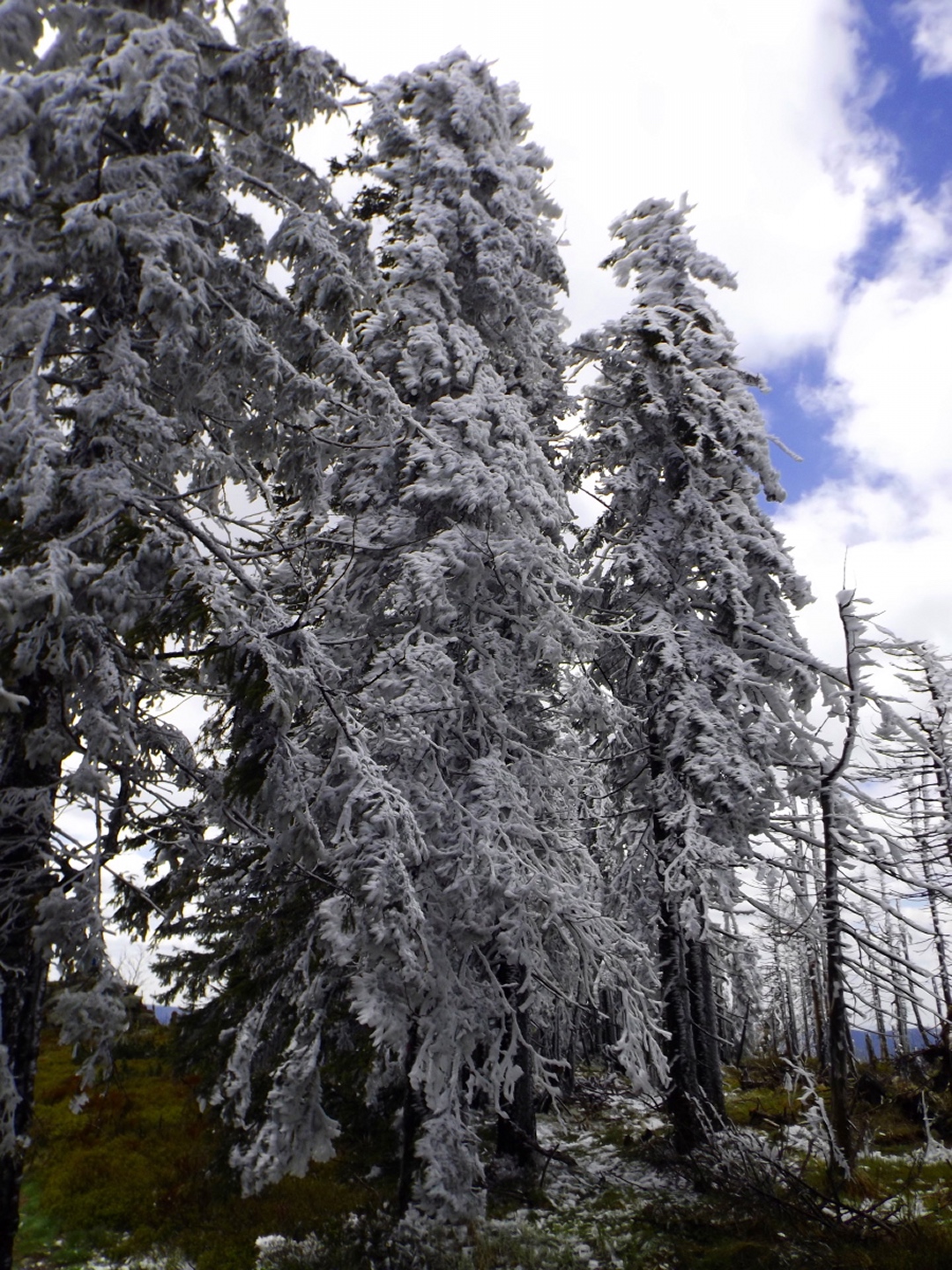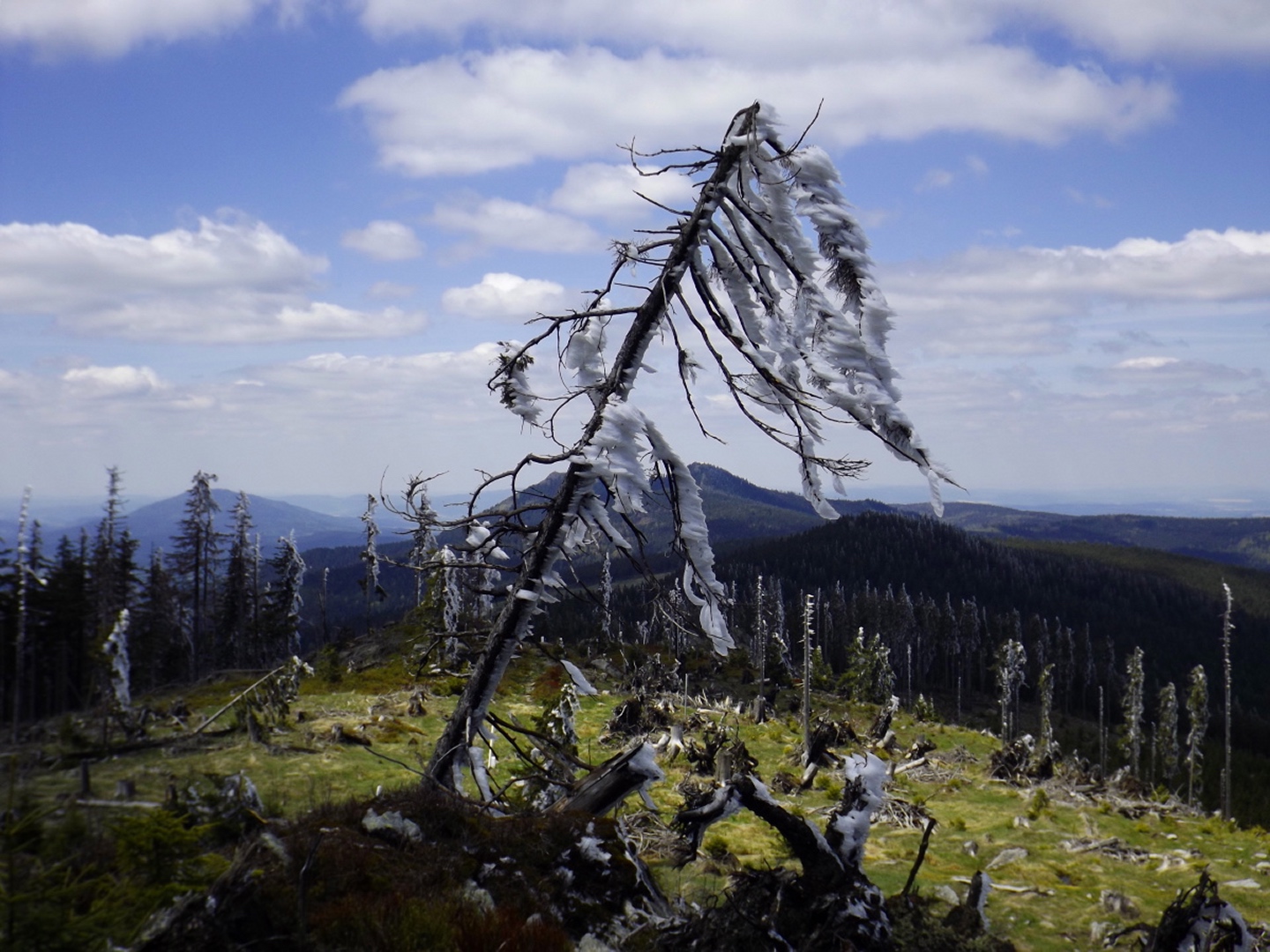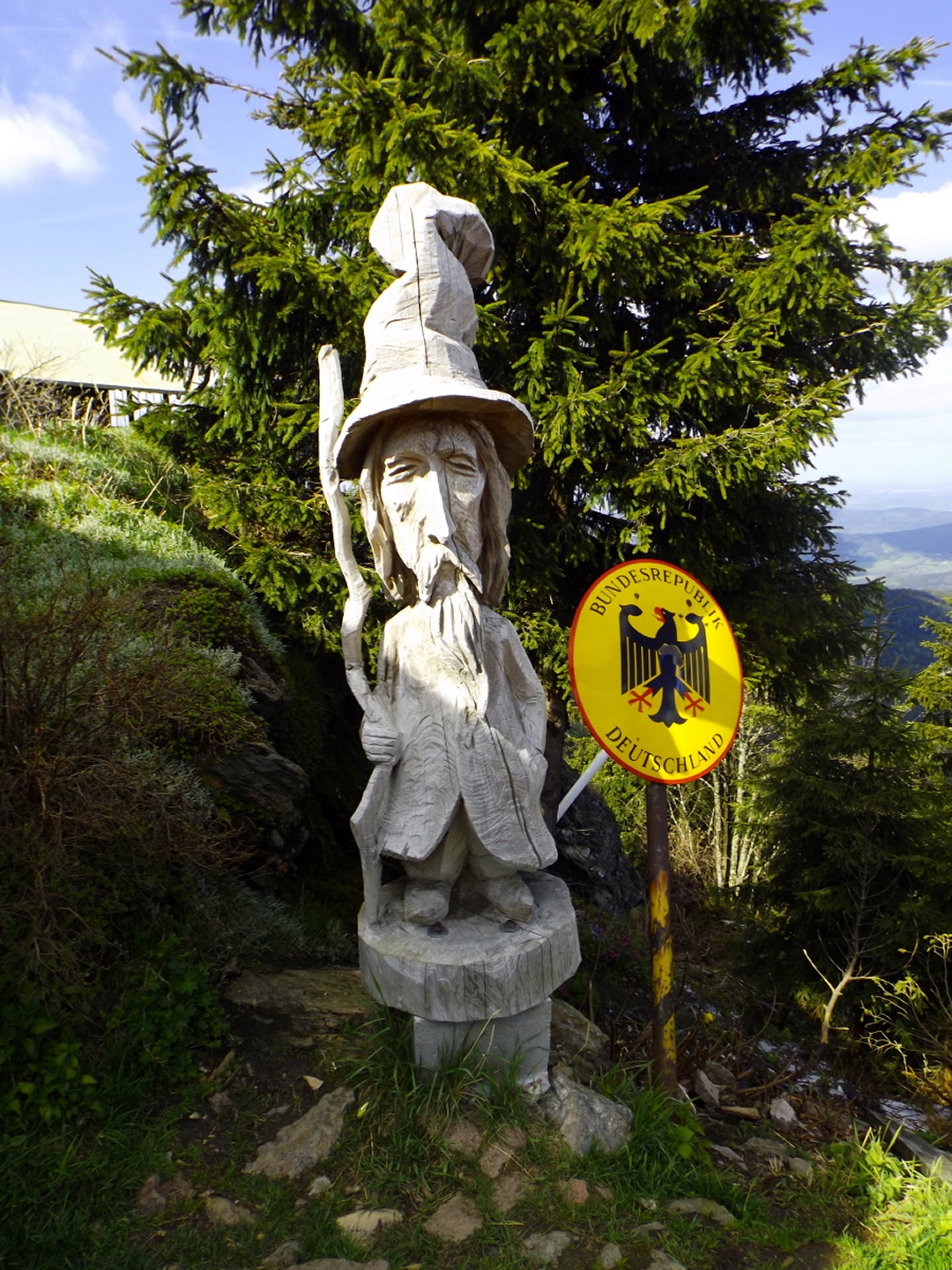 Ja, es war eine GRENZtour. Und das in mehrfacher Hinsicht. Die erste GRENZE, nämlich die zwischen AKW und doch spürbarer Quellbewölkung, lag auf der Anfahrt etwa bei Miltach. Die zweite lag auf etwa 1100 m, nämlich die FrostGRENZE der vergangenen Tage und Nächte. Deren Folgen sind auf vielen Bildern zu sehen, sie waren beeindruckend, führten aber an einigen Stellen zu kleineren Komplikationen beim Transport der Kamera. Drittens ging die Runde auch leicht in die Nähe meiner persönlichen LeistungsGRENZE, was die Länge betrifft. Ich bin aber im Gegensatz zur einen oder anderen früheren Tour ohne fremde Hilfe zum Auto zurückgekommen. Bleibt noch der Vermerk, dass mehr als ein Drittel der Strecke entlang der LandesGRENZE zwischen Bayern und Böhmen respektive Deutschland und der Tschechischen Republik verlief. Um diesen Umstand zu würdigen, habe ich meine Brotzeit im Albert-Willmann-Haus im böhmischen Teil der Terrasse zu mir genommen. Ja, diese Terrasse hat etwas mit dem Purtschellerhaus am Hohen Göll gemeinsam…