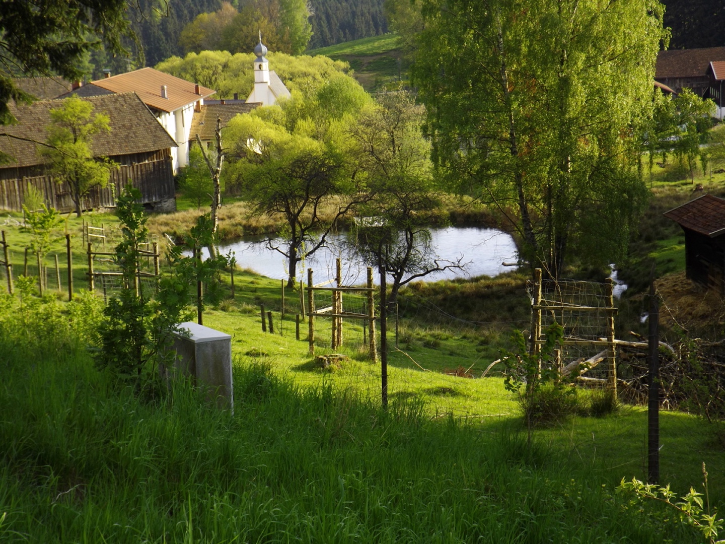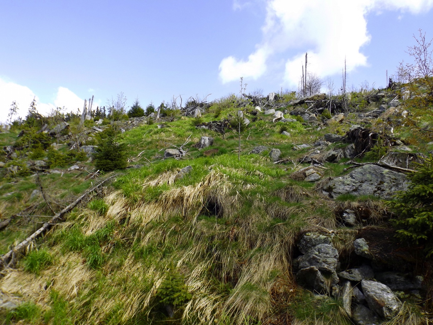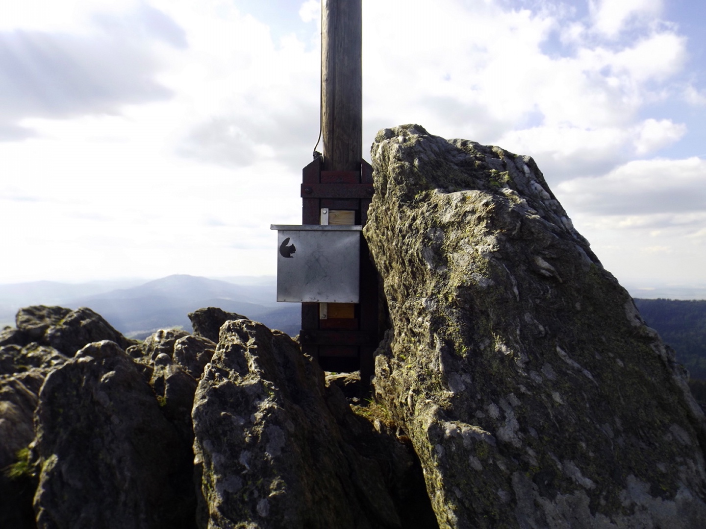 Ja, es war eine GRENZtour. Und das in mehrfacher Hinsicht. Die erste GRENZE, nämlich die zwischen AKW und doch spürbarer Quellbewölkung, lag auf der Anfahrt etwa bei Miltach. Die zweite lag auf etwa 1100 m, nämlich die FrostGRENZE der vergangenen Tage und Nächte. Deren Folgen sind auf vielen Bildern zu sehen, sie waren beeindruckend, führten aber an einigen Stellen zu kleineren Komplikationen beim Transport der Kamera. Drittens ging die Runde auch leicht in die Nähe meiner persönlichen LeistungsGRENZE, was die Länge betrifft. Ich bin aber im Gegensatz zur einen oder anderen früheren Tour ohne fremde Hilfe zum Auto zurückgekommen. Bleibt noch der Vermerk, dass mehr als ein Drittel der Strecke entlang der LandesGRENZE zwischen Bayern und Böhmen respektive Deutschland und der Tschechischen Republik verlief. Um diesen Umstand zu würdigen, habe ich meine Brotzeit im Albert-Willmann-Haus im böhmischen Teil der Terrasse zu mir genommen. Ja, diese Terrasse hat etwas mit dem Purtschellerhaus am Hohen Göll gemeinsam…