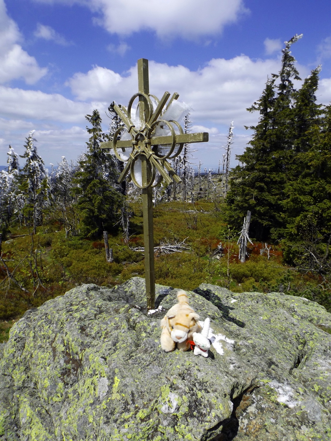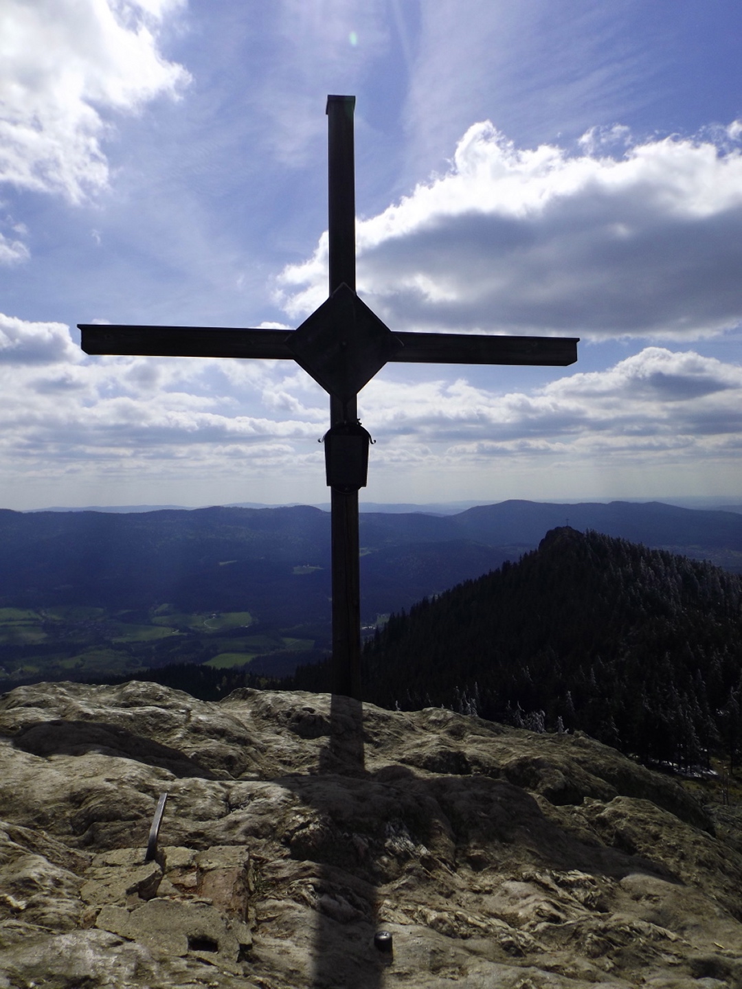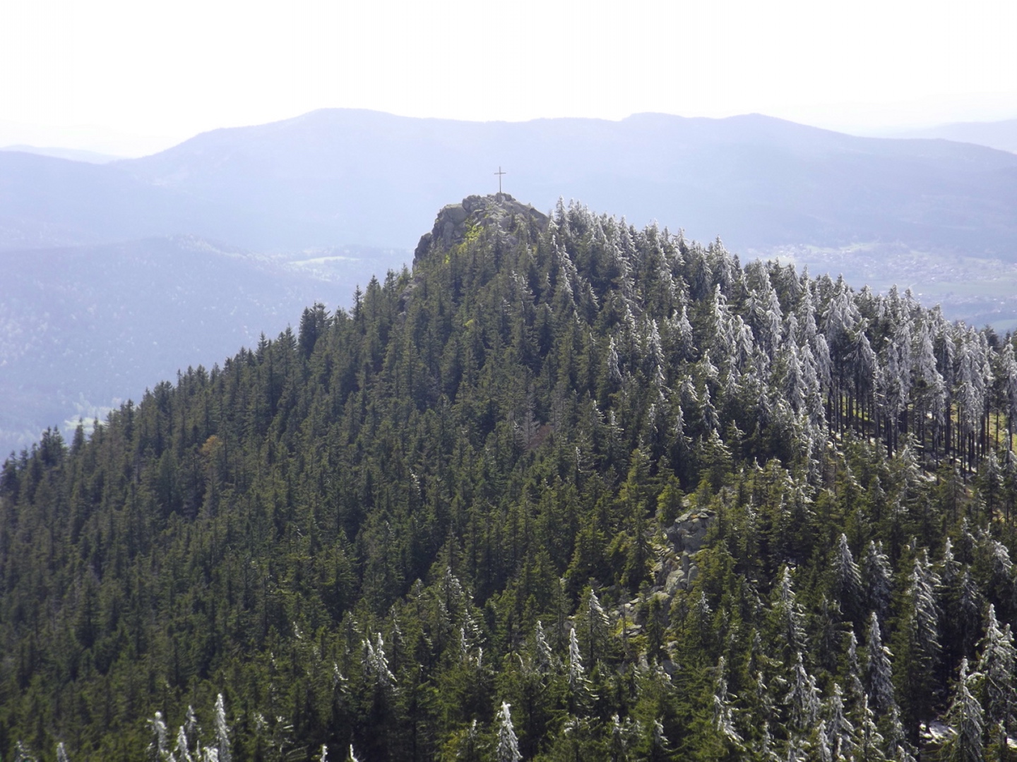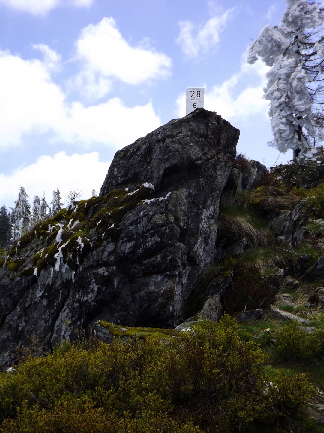 Als ich um dreiviertel zehn in Lohberg ankam, war der Parkplatz unterhalb der Brauerei ziemlich voll. Die Einheimischen waren wohl brav in der Kirche und vielleicht anschließend noch beim Frühschoppen. Ich habe aber noch einen Platz für mein Auto gefunden und war nach dem üblichen Umzieh- und Schuhwechsel-Prozedere wieder einmal ein paar Minuten vor der anvisierten Zeit auf der Strecke. Diese führte gleich einmal über die Staatsstraße, die hier dank Tempolimit 60 ziemlich ungefährlich ist, zum Rathaus und hinter diesem links eine Straße hinauf zu einem Fußballplatz. Hier ist auch bereits der Wanderweg Lo5 markiert, dem ich bis zum ersten Gipfel folgen durfte. Nach dem Fußballplatz geht es erst einmal wieder etwa 40 Höhenmeter hinunter, in einer Kurve geradeaus auf einen schottrigen Pfad, zum Perlesbach, der auf einer pompösen Brücke überquert wird. Ab dann steigt der Weg bis auf zwei kleine Flachstücke eigentlich stetig, wenn auch nicht gleichmäßig, bis zum Gipfel an. Er ist meistens gut erkennbar, aber nicht immer gut markiert. Mit ein bisserl Intuition und Mitdenken findet man sich aber immer zurecht, an den wichtigen Punkten gibt es dann schon Wegweiser. Nach einer halben Stunde kam ich an ein Kriegerdenkmal, vor dem der Weg scharf links abbiegt und an einer Löwenzahnwiese vorbei führt. Hier sind die Ausblicke zu den acht Tausendern und speziell den beiden Arbern ziemlich gut. Nach der Wiese geht es wieder in den Wald, wo man einmal etwas aufpassen muss, um bei einer Gabelung die Markierung richtig zu verstehen, es geht rechts hinauf. Nach weiteren 20 Minuten war ich bei einer Lichtung, wo der Weg kaum erkennbar am Waldrand weiterführt. An deren Ende ist das erste Zwischenziel Oberhaiderberg, ein Weiler mit ein paar Bauernhäusern und einer Schafherde. Hier ist nichts markiert, man muss aber am Fahrweg nach rechts wieder in den Wald hinauf, wo sich nach etwa fünf Minuten Lo4 und Lo5 trennen. Während der erste geradeaus weitergeht, bog ich nach links ab und kam nach einer Viertelstunde zur Schlüsselstelle der Tour: Die Staatsstraße muss erneut überquert werden, allerdings an einer nicht ganz übersichtlichen Stelle, an der die Autos und vor allem Motorräder meistens ziemlich flott unterwegs sind, vor allem bergab. Ich habe es geschafft und durfte mich über einen etwas steileren Weiterweg freuen, der dann hübsch undeutlich, aber dafür besser markiert wurde. Eine halbe Stunde nach Oberhaiderberg durfte ich noch die Forststraße überqueren, auf der man nach Scheiben zurückgeht, wenn man die Runde von dort aus startet. Diese Variante findet man auf einem offiziell aussehenden Wanderportal für den Bayerischen Wald, ich frage mich jedoch, in welcher Geisteshaltung die Autoren die Runde gegangen sind. Mit Genuss habe jedenfalls weder die Zeitangaben noch der Rückweg vom Osser zu tun, vor allem: die letzten vier Kilometer sind ein stetiger Gegenanstieg von über 120 Höhenmetern! Aber ich hatte ja einen anderen Ausgangspunkt gewählt. Kurz oberhalb dieser Forststraße begann dann das Naturschauspiel, das mich den Rest des Tages begleiten würde: Die Luftfeuchtigkeit hatte während der letzten Tage und Nächte nicht nur Rauhreif, sondern richtige Eisformationen an die Bäume (und Gipfelkreuze) gezaubert, die dank der Sonne und Wärme am Schmelzen und Herunterfallen waren. Auf etwa 1250 Metern mündet der Steig in einen Weg, der von Scheiben heraufkommt, nach einem kurzen Steilstück knickt dieser nach rechts ab und führt knapp unter dem Kamm zum Gipfel. Es gibt ein paar Querverbindungen direkt zum Grenzsteig, ich nahm in der Annahme, dass der Gipfel direkt auf der Grenze sein würde, eine davon und machte dadurch 100 Meter Umweg. Was solls. Am Gipfel war ich zunächst alleine, als ich mit dem Marmeladenbrot fertig war, kam eine Gruppe, die in Scheiben losmarschiert war. Kaum waren sie da, purzelte auch schon das Eis vom Gipfelkreuz. Gut, dass ich es schon vorher fotografiert hatte. Punkt 13 Uhr marschierte ich weiter. Zunächst inspizierte ich die Möglichkeit, dem Kamm nach Süden zum Jezerní hora zu folgen. Das Ergebnis war das gleiche wie letztes Jahr unten im Tal: Naturschutzgebiet, Betretungsverbot. War eigentlich zu erwarten, also ab Richtung Osser. Der Grenzsteig windet sich während der gesamten Strecke, über deren Länge es widersprüchliche Angaben gibt, links und rechts an den Grenzsteinen und -pfosten vorbei. Der Zeitbedarf lässt aber die knapp sechs Kilometer vermuten, die auch die Kompass-Karte zeigt. Seltsamerweise ist der Steig dort übrigens nicht eingezeichnet, dafür aber vor Ort beschildert. Witzigerweise stehen auf der tschechischen Seite auch im Naturschutzgebiet immer wieder Hinweisschilder auf die Staatsgrenze, während ich bis zum Beginn des Osseranstiegs auf der deutschen Seite genau eines entdeckt habe, nämlich an der tiefsten Stelle des Kammes, der auch Sesselplatz genannt wird. Zwischendurch gibt es auch noch einen Kammhöcker mit etwa 50 Metern Gegenanstieg und dem netten Namen Velký Kokrháč sowie ein paar Felsriegel, die man auch beklettern könnte. Und natürlich immer wieder Eisregen aus den Baumwipfeln und daraus resultierende Schneefelder. Nach knapp zwei Stunden kam von links ein Fahrweg herauf und beschrieb eine Linkskurve, dies ist wohl der von der vorgenannten Seite empfohlene Abstiegsweg. Denn die Grenze macht an dieser Stelle einen Knick nach Osten, und es lohnt sich, weiter ihr zu folgen. Weitere 25 Minuten, die jetzt stetig bergauf gehen, später türmt sich vor mir der Gipfelaufbau in den Himmel. Von rechts kommt ein Pfad aus Böhmen herauf, der jedoch per Schild ausdrücklich gesperrt wird. Aber der Weiterweg führt sowieso ein paar Meter nach Bayern hinein, denn die Grenze verläuft in diesem Bereich meistens oben auf dem Felsriff. Einige ausgesetzte Abschnitte sind angenehmerweise seilversichert, so dass auch Gegenverkehr kein Problem war. Somit dauerte es nicht mehr lange bis zum Großen Osser und dem verd