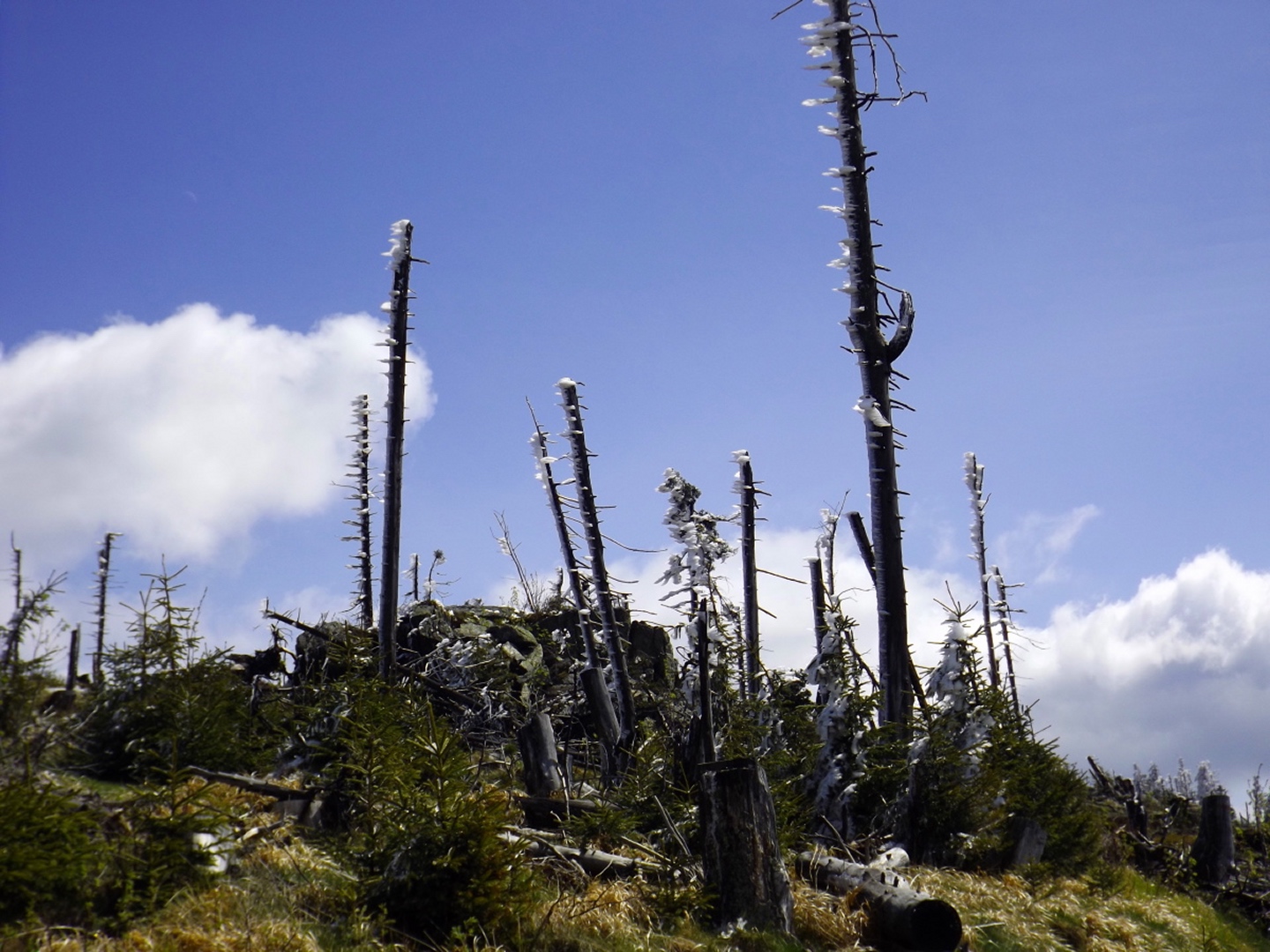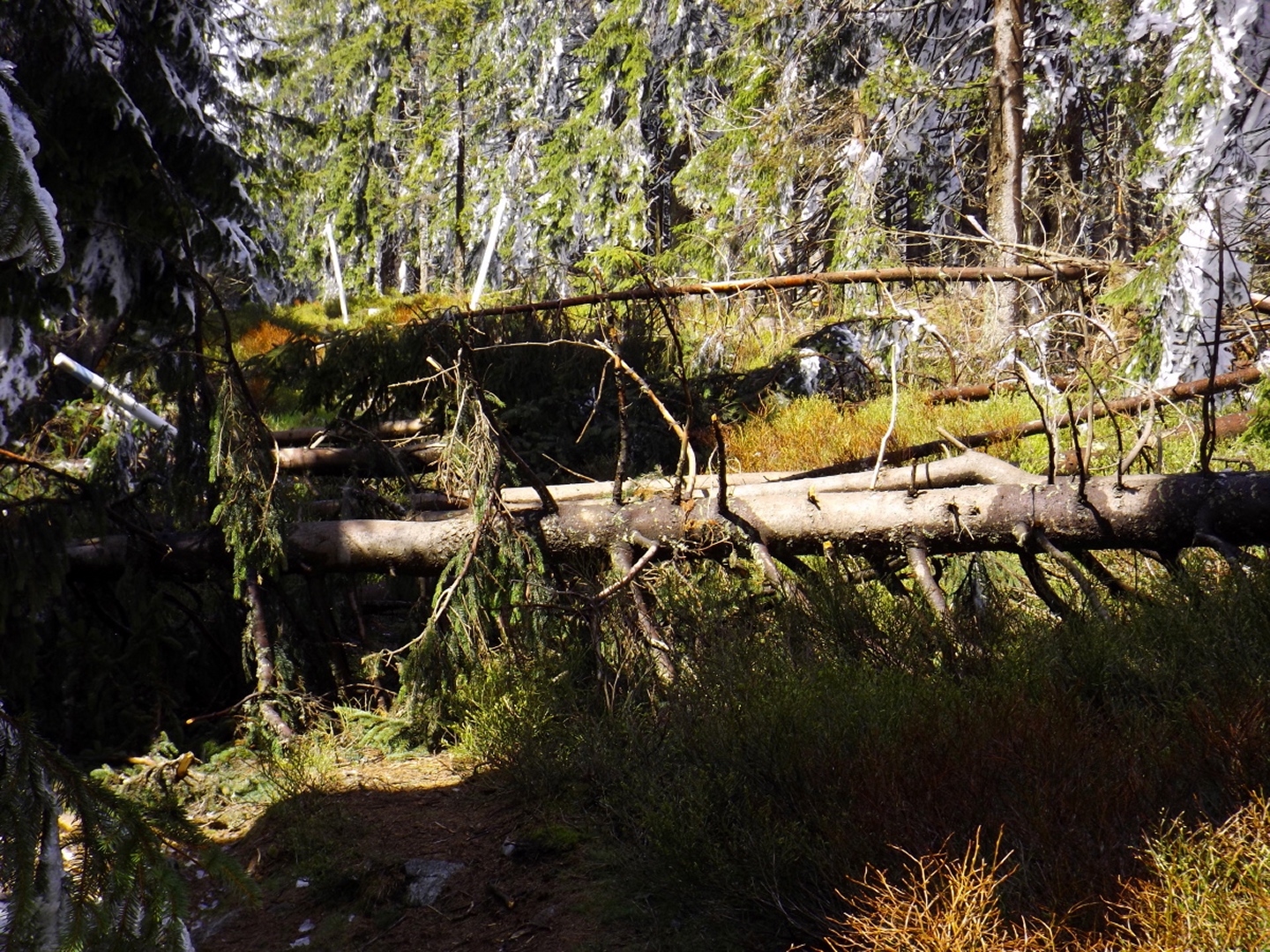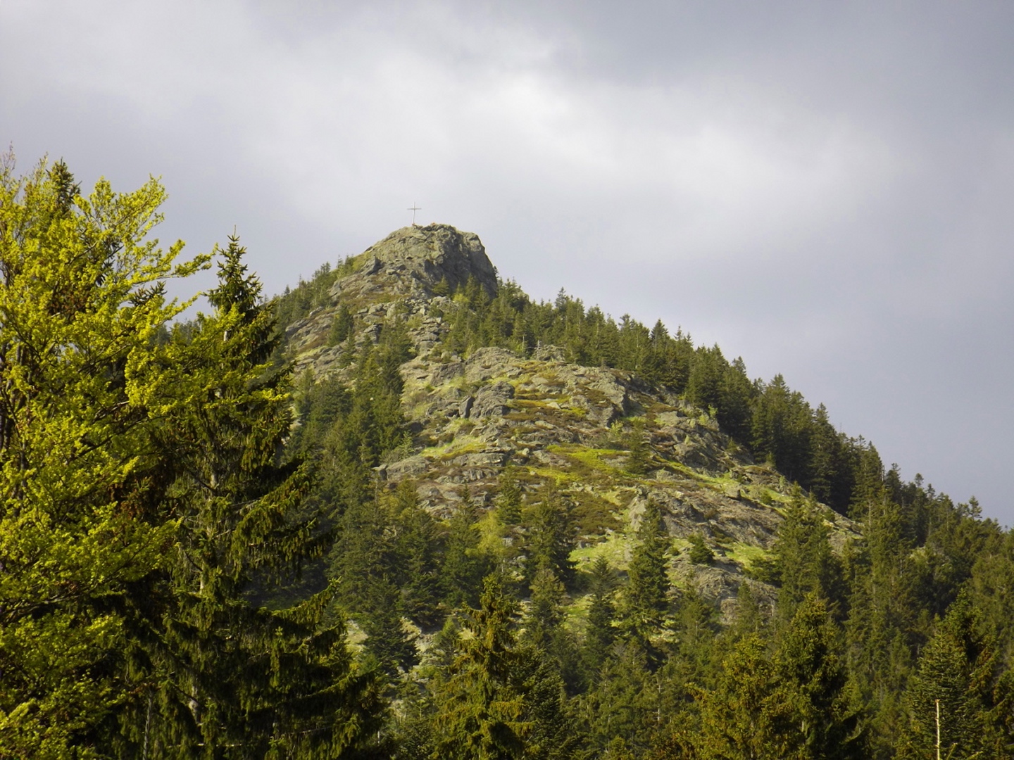 Als ich um dreiviertel zehn in Lohberg ankam, war der Parkplatz unterhalb der Brauerei ziemlich voll. Die Einheimischen waren wohl brav in der Kirche und vielleicht anschließend noch beim Frühschoppen. Ich habe aber noch einen Platz für mein Auto gefunden und war nach dem üblichen Umzieh- und Schuhwechsel-Prozedere wieder einmal ein paar Minuten vor der anvisierten Zeit auf der Strecke. Diese führte gleich einmal über die Staatsstraße, die hier dank Tempolimit 60 ziemlich ungefährlich ist, zum Rathaus und hinter diesem links eine Straße hinauf zu einem Fußballplatz. Hier ist auch bereits der Wanderweg Lo5 markiert, dem ich bis zum ersten Gipfel folgen durfte. Nach dem Fußballplatz geht es erst einmal wieder etwa 40 Höhenmeter hinunter, in einer Kurve geradeaus auf einen schottrigen Pfad, zum Perlesbach, der auf einer pompösen Brücke überquert wird. Ab dann steigt der Weg bis auf zwei kleine Flachstücke eigentlich stetig, wenn auch nicht gleichmäßig, bis zum Gipfel an. Er ist meistens gut erkennbar, aber nicht immer gut markiert. Mit ein bisserl Intuition und Mitdenken findet man sich aber immer zurecht, an den wichtigen Punkten gibt es dann schon Wegweiser. Nach einer halben Stunde kam ich an ein Kriegerdenkmal, vor dem der Weg scharf links abbiegt und an einer Löwenzahnwiese vorbei führt. Hier sind die Ausblicke zu den acht Tausendern und speziell den beiden Arbern ziemlich gut. Nach der Wiese geht es wieder in den Wald, wo man einmal etwas aufpassen muss, um bei einer Gabelung die Markierung richtig zu verstehen, es geht rechts hinauf. Nach weiteren 20 Minuten war ich bei einer Lichtung, wo der Weg kaum erkennbar am Waldrand weiterführt. An deren Ende ist das erste Zwischenziel Oberhaiderberg, ein Weiler mit ein paar Bauernhäusern und einer Schafherde. Hier ist nichts markiert, man muss aber am Fahrweg nach rechts wieder in den Wald hinauf, wo sich nach etwa fünf Minuten Lo4 und Lo5 trennen. Während der erste geradeaus weitergeht, bog ich nach links ab und kam nach einer Viertelstunde zur Schlüsselstelle der Tour: Die Staatsstraße muss erneut überquert werden, allerdings an einer nicht ganz übersichtlichen Stelle, an der die Autos und vor allem Motorräder meistens ziemlich flott unterwegs sind, vor allem bergab. Ich habe es geschafft und durfte mich über einen etwas steileren Weiterweg freuen, der dann hübsch undeutlich, aber dafür besser markiert wurde. Eine halbe Stunde nach Oberhaiderberg durfte ich noch die Forststraße überqueren, auf der man nach Scheiben zurückgeht, wenn man die Runde von dort aus startet. Diese Variante findet man auf einem offiziell aussehenden Wanderportal für den Bayerischen Wald, ich frage mich jedoch, in welcher Geisteshaltung die Autoren die Runde gegangen sind. Mit Genuss habe jedenfalls weder die Zeitangaben noch der Rückweg vom Osser zu tun, vor allem: die letzten vier Kilometer sind ein stetiger Gegenanstieg von über 120 Höhenmetern! Aber ich hatte ja einen anderen Ausgangspunkt gewählt. Kurz oberhalb dieser Forststraße begann dann das Naturschauspiel, das mich den Rest des Tages begleiten würde: Die Luftfeuchtigkeit hatte während der letzten Tage und Nächte nicht nur Rauhreif, sondern richtige Eisformationen an die Bäume (und Gipfelkreuze) gezaubert, die dank der Sonne und Wärme am Schmelzen und Herunterfallen waren. Auf etwa 1250 Metern mündet der Steig in einen Weg, der von Scheiben heraufkommt, nach einem kurzen Steilstück knickt dieser nach rechts ab und führt knapp unter dem Kamm zum Gipfel. Es gibt ein paar Querverbindungen direkt zum Grenzsteig, ich nahm in der Annahme, dass der Gipfel direkt auf der Grenze sein würde, eine davon und machte dadurch 100 Meter Umweg. Was solls. Am Gipfel war ich zunächst alleine, als ich mit dem Marmeladenbrot fertig war, kam eine Gruppe, die in Scheiben losmarschiert war. Kaum waren sie da, purzelte auch schon das Eis vom Gipfelkreuz. Gut, dass ich es schon vorher fotografiert hatte. Punkt 13 Uhr marschierte ich weiter. Zunächst inspizierte ich die Möglichkeit, dem Kamm nach Süden zum Jezerní hora zu folgen. Das Ergebnis war das gleiche wie letztes Jahr unten im Tal: Naturschutzgebiet, Betretungsverbot. War eigentlich zu erwarten, also ab Richtung Osser. Der Grenzsteig windet sich während der gesamten Strecke, über deren Länge es widersprüchliche Angaben gibt, links und rechts an den Grenzsteinen und -pfosten vorbei. Der Zeitbedarf lässt aber die knapp sechs Kilometer vermuten, die auch die Kompass-Karte zeigt. Seltsamerweise ist der Steig dort übrigens nicht eingezeichnet, dafür aber vor Ort beschildert. Witzigerweise stehen auf der tschechischen Seite auch im Naturschutzgebiet immer wieder Hinweisschilder auf die Staatsgrenze, während ich bis zum Beginn des Osseranstiegs auf der deutschen Seite genau eines entdeckt habe, nämlich an der tiefsten Stelle des Kammes, der auch Sesselplatz genannt wird. Zwischendurch gibt es auch noch einen Kammhöcker mit etwa 50 Metern Gegenanstieg und dem netten Namen Velký Kokrháč sowie ein paar Felsriegel, die man auch beklettern könnte. Und natürlich immer wieder Eisregen aus den Baumwipfeln und daraus resultierende Schneefelder. Nach knapp zwei Stunden kam von links ein Fahrweg herauf und beschrieb eine Linkskurve, dies ist wohl der von der vorgenannten Seite empfohlene Abstiegsweg. Denn die Grenze macht an dieser Stelle einen Knick nach Osten, und es lohnt sich, weiter ihr zu folgen. Weitere 25 Minuten, die jetzt stetig bergauf gehen, später türmt sich vor mir der Gipfelaufbau in den Himmel. Von rechts kommt ein Pfad aus Böhmen herauf, der jedoch per Schild ausdrücklich gesperrt wird. Aber der Weiterweg führt sowieso ein paar Meter nach Bayern hinein, denn die Grenze verläuft in diesem Bereich meistens oben auf dem Felsriff. Einige ausgesetzte Abschnitte sind angenehmerweise seilversichert, so dass auch Gegenverkehr kein Problem war. Somit dauerte es nicht mehr lange bis zum Großen Osser und dem verd