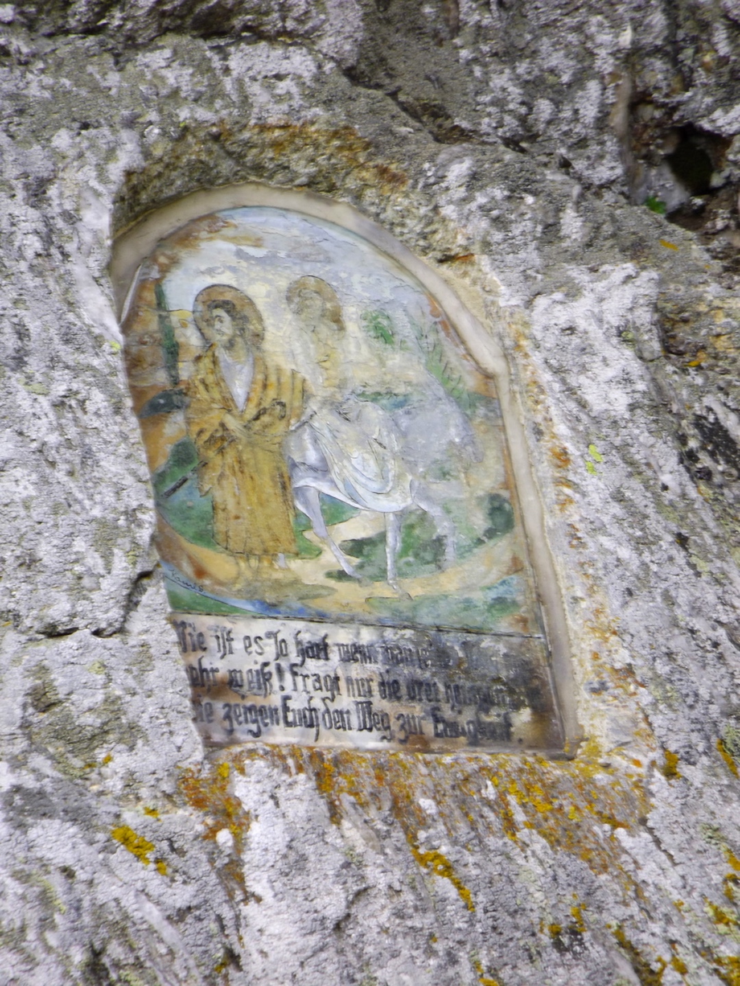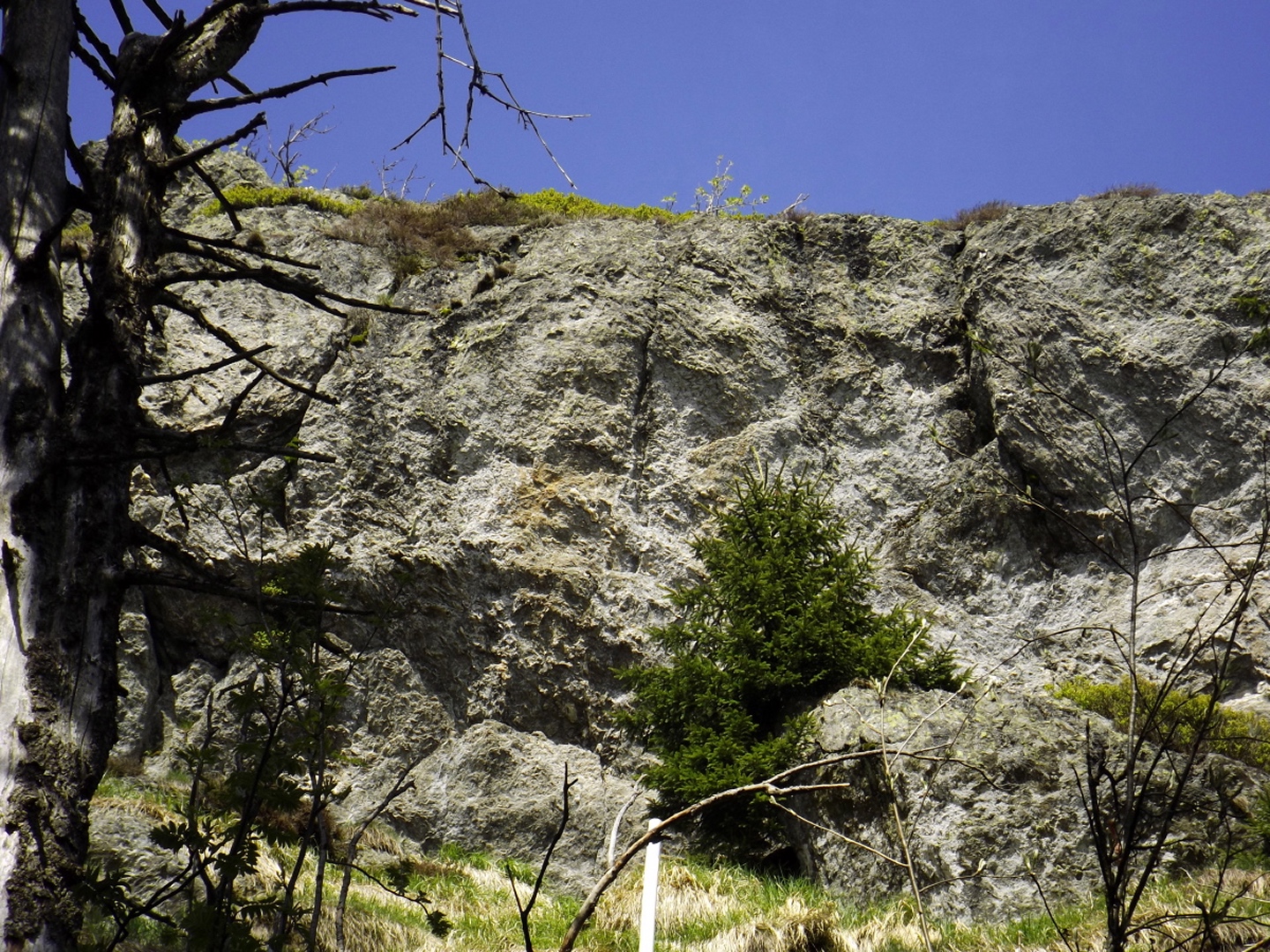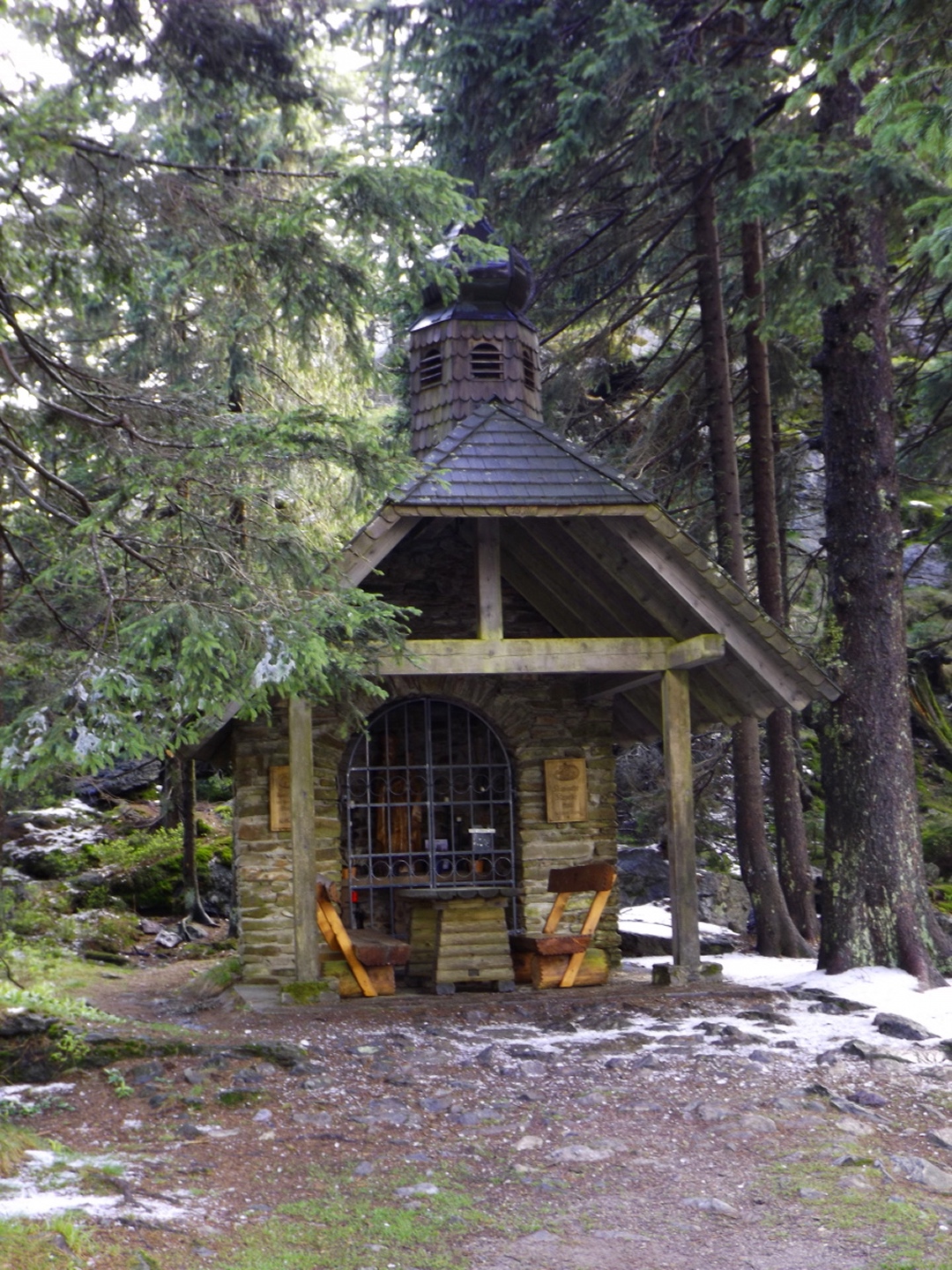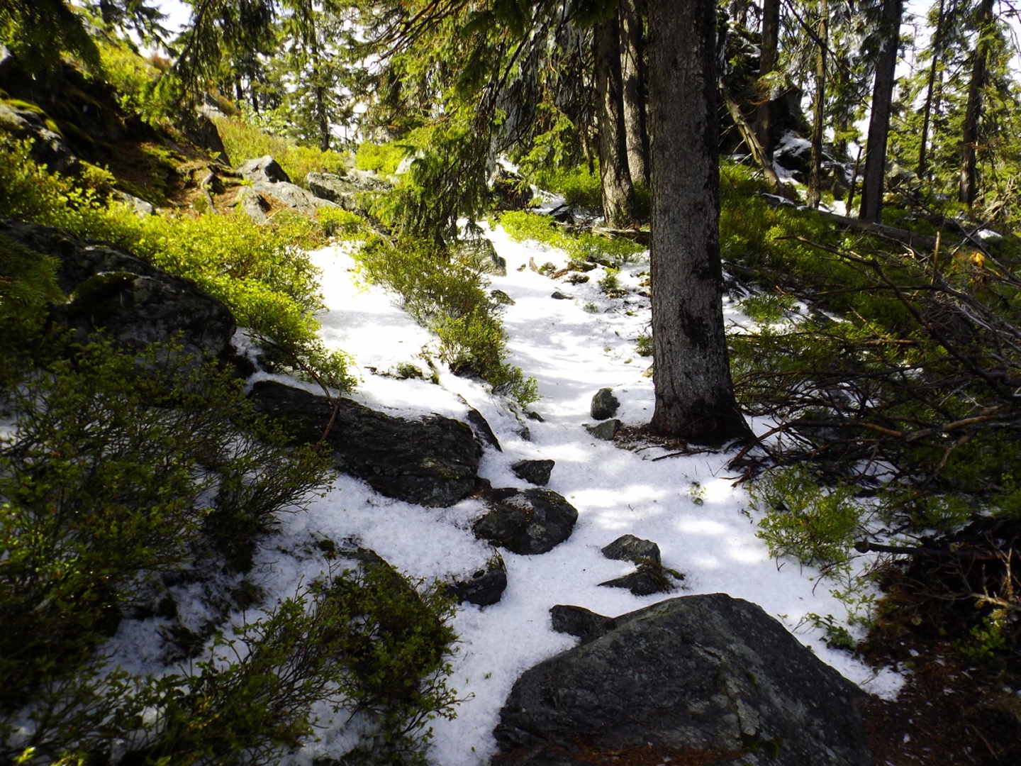 Als ich um dreiviertel zehn in Lohberg ankam, war der Parkplatz unterhalb der Brauerei ziemlich voll. Die Einheimischen waren wohl brav in der Kirche und vielleicht anschließend noch beim Frühschoppen. Ich habe aber noch einen Platz für mein Auto gefunden und war nach dem üblichen Umzieh- und Schuhwechsel-Prozedere wieder einmal ein paar Minuten vor der anvisierten Zeit auf der Strecke. Diese führte gleich einmal über die Staatsstraße, die hier dank Tempolimit 60 ziemlich ungefährlich ist, zum Rathaus und hinter diesem links eine Straße hinauf zu einem Fußballplatz. Hier ist auch bereits der Wanderweg Lo5 markiert, dem ich bis zum ersten Gipfel folgen durfte. Nach dem Fußballplatz geht es erst einmal wieder etwa 40 Höhenmeter hinunter, in einer Kurve geradeaus auf einen schottrigen Pfad, zum Perlesbach, der auf einer pompösen Brücke überquert wird. Ab dann steigt der Weg bis auf zwei kleine Flachstücke eigentlich stetig, wenn auch nicht gleichmäßig, bis zum Gipfel an. Er ist meistens gut erkennbar, aber nicht immer gut markiert. Mit ein bisserl Intuition und Mitdenken findet man sich aber immer zurecht, an den wichtigen Punkten gibt es dann schon Wegweiser. Nach einer halben Stunde kam ich an ein Kriegerdenkmal, vor dem der Weg scharf links abbiegt und an einer Löwenzahnwiese vorbei führt. Hier sind die Ausblicke zu den acht Tausendern und speziell den beiden Arbern ziemlich gut. Nach der Wiese geht es wieder in den Wald, wo man einmal etwas aufpassen muss, um bei einer Gabelung die Markierung richtig zu verstehen, es geht rechts hinauf. Nach weiteren 20 Minuten war ich bei einer Lichtung, wo der Weg kaum erkennbar am Waldrand weiterführt. An deren Ende ist das erste Zwischenziel Oberhaiderberg, ein Weiler mit ein paar Bauernhäusern und einer Schafherde. Hier ist nichts markiert, man muss aber am Fahrweg nach rechts wieder in den Wald hinauf, wo sich nach etwa fünf Minuten Lo4 und Lo5 trennen. Während der erste geradeaus weitergeht, bog ich nach links ab und kam nach einer Viertelstunde zur Schlüsselstelle der Tour: Die Staatsstraße muss erneut überquert werden, allerdings an einer nicht ganz übersichtlichen Stelle, an der die Autos und vor allem Motorräder meistens ziemlich flott unterwegs sind, vor allem bergab. Ich habe es geschafft und durfte mich über einen etwas steileren Weiterweg freuen, der dann hübsch undeutlich, aber dafür besser markiert wurde. Eine halbe Stunde nach Oberhaiderberg durfte ich noch die Forststraße überqueren, auf der man nach Scheiben zurückgeht, wenn man die Runde von dort aus startet. Diese Variante findet man auf einem offiziell aussehenden Wanderportal für den Bayerischen Wald, ich frage mich jedoch, in welcher Geisteshaltung die Autoren die Runde gegangen sind. Mit Genuss habe jedenfalls weder die Zeitangaben noch der Rückweg vom Osser zu tun, vor allem: die letzten vier Kilometer sind ein stetiger Gegenanstieg von über 120 Höhenmetern! Aber ich hatte ja einen anderen Ausgangspunkt gewählt. Kurz oberhalb dieser Forststraße begann dann das Naturschauspiel, das mich den Rest des Tages begleiten würde: Die Luftfeuchtigkeit hatte während der letzten Tage und Nächte nicht nur Rauhreif, sondern richtige Eisformationen an die Bäume (und Gipfelkreuze) gezaubert, die dank der Sonne und Wärme am Schmelzen und Herunterfallen waren. Auf etwa 1250 Metern mündet der Steig in einen Weg, der von Scheiben heraufkommt, nach einem kurzen Steilstück knickt dieser nach rechts ab und führt knapp unter dem Kamm zum Gipfel. Es gibt ein paar Querverbindungen direkt zum Grenzsteig, ich nahm in der Annahme, dass der Gipfel direkt auf der Grenze sein würde, eine davon und machte dadurch 100 Meter Umweg. Was solls. Am Gipfel war ich zunächst alleine, als ich mit dem Marmeladenbrot fertig war, kam eine Gruppe, die in Scheiben losmarschiert war. Kaum waren sie da, purzelte auch schon das Eis vom Gipfelkreuz. Gut, dass ich es schon vorher fotografiert hatte. Punkt 13 Uhr marschierte ich weiter. Zunächst inspizierte ich die Möglichkeit, dem Kamm nach Süden zum Jezerní hora zu folgen. Das Ergebnis war das gleiche wie letztes Jahr unten im Tal: Naturschutzgebiet, Betretungsverbot. War eigentlich zu erwarten, also ab Richtung Osser. Der Grenzsteig windet sich während der gesamten Strecke, über deren Länge es widersprüchliche Angaben gibt, links und rechts an den Grenzsteinen und -pfosten vorbei. Der Zeitbedarf lässt aber die knapp sechs Kilometer vermuten, die auch die Kompass-Karte zeigt. Seltsamerweise ist der Steig dort übrigens nicht eingezeichnet, dafür aber vor Ort beschildert. Witzigerweise stehen auf der tschechischen Seite auch im Naturschutzgebiet immer wieder Hinweisschilder auf die Staatsgrenze, während ich bis zum Beginn des Osseranstiegs auf der deutschen Seite genau eines entdeckt habe, nämlich an der tiefsten Stelle des Kammes, der auch Sesselplatz genannt wird. Zwischendurch gibt es auch noch einen Kammhöcker mit etwa 50 Metern Gegenanstieg und dem netten Namen Velký Kokrháč sowie ein paar Felsriegel, die man auch beklettern könnte. Und natürlich immer wieder Eisregen aus den Baumwipfeln und daraus resultierende Schneefelder. Nach knapp zwei Stunden kam von links ein Fahrweg herauf und beschrieb eine Linkskurve, dies ist wohl der von der vorgenannten Seite empfohlene Abstiegsweg. Denn die Grenze macht an dieser Stelle einen Knick nach Osten, und es lohnt sich, weiter ihr zu folgen. Weitere 25 Minuten, die jetzt stetig bergauf gehen, später türmt sich vor mir der Gipfelaufbau in den Himmel. Von rechts kommt ein Pfad aus Böhmen herauf, der jedoch per Schild ausdrücklich gesperrt wird. Aber der Weiterweg führt sowieso ein paar Meter nach Bayern hinein, denn die Grenze verläuft in diesem Bereich meistens oben auf dem Felsriff. Einige ausgesetzte Abschnitte sind angenehmerweise seilversichert, so dass auch Gegenverkehr kein Problem war. Somit dauerte es nicht mehr lange bis zum Großen Osser und dem verd