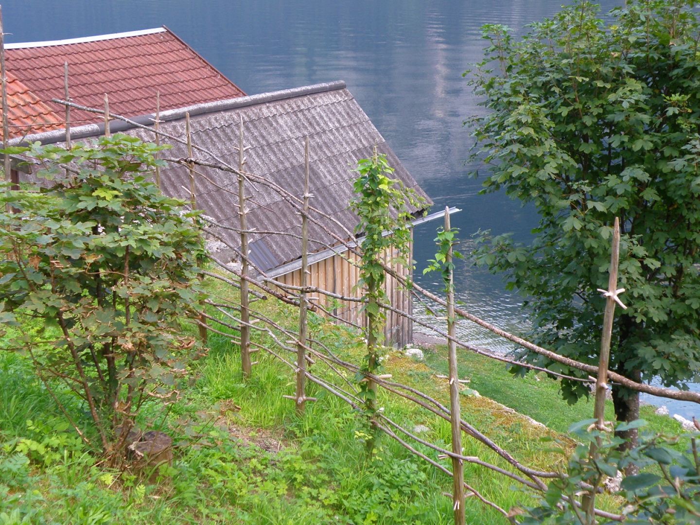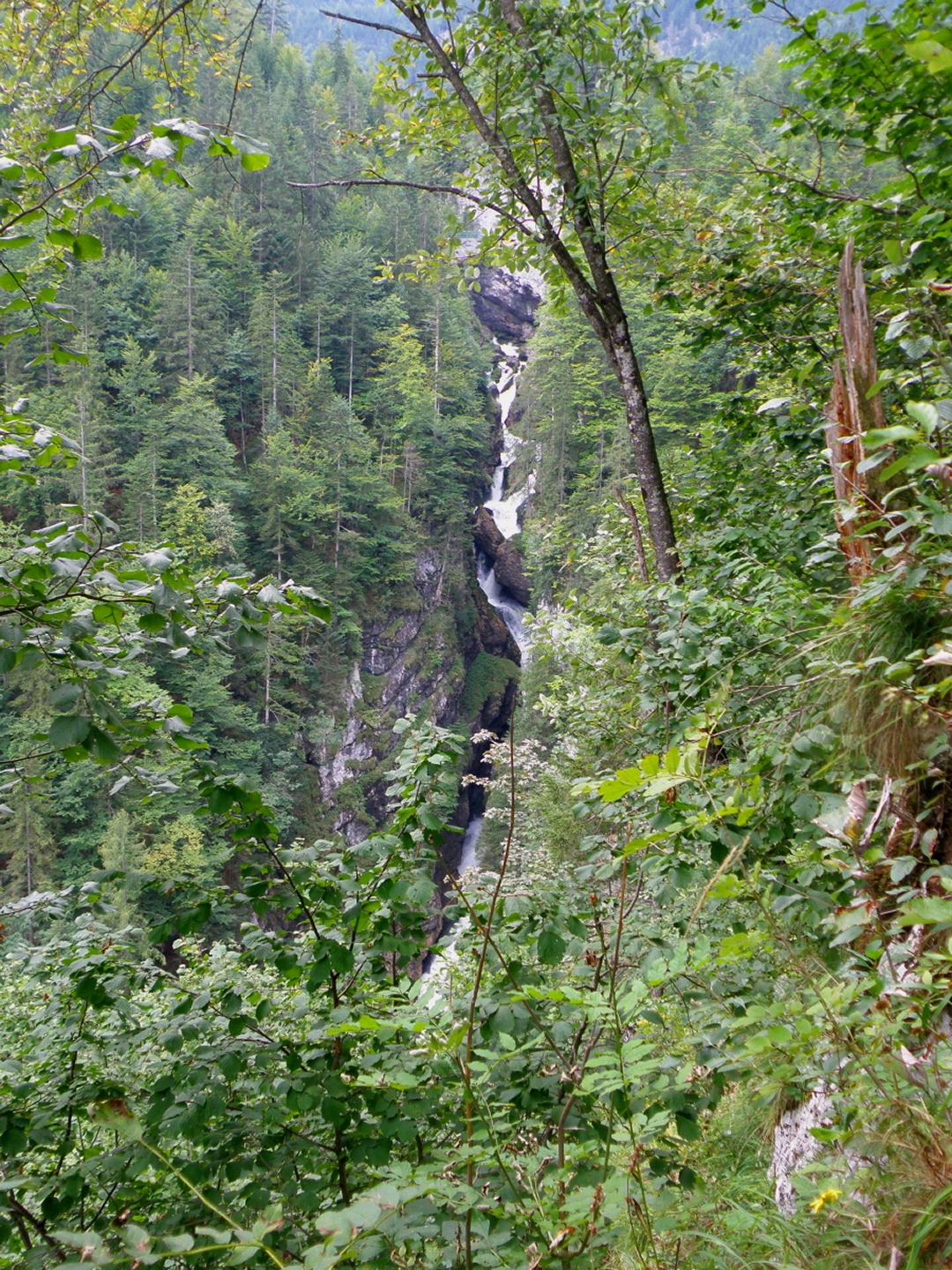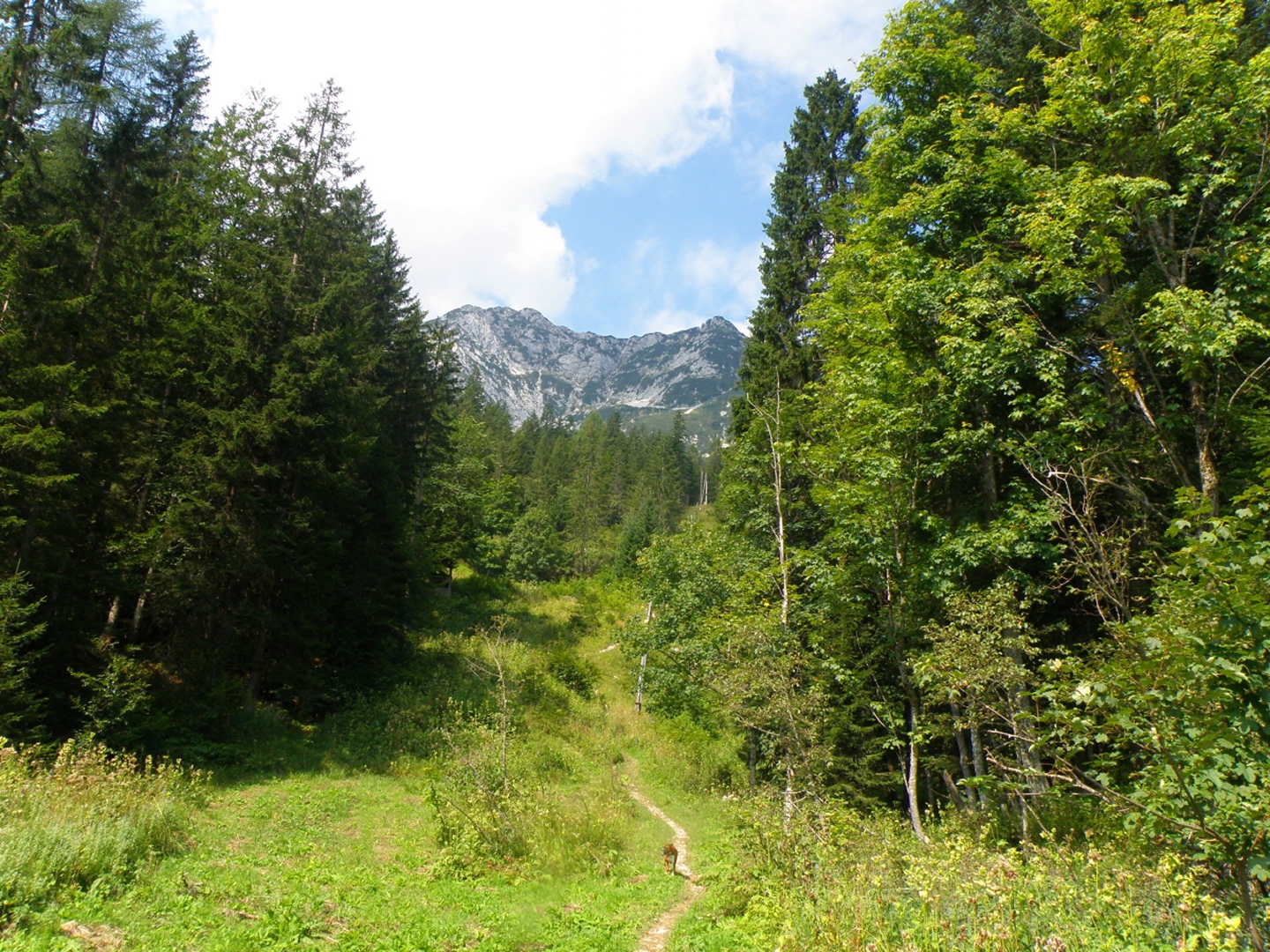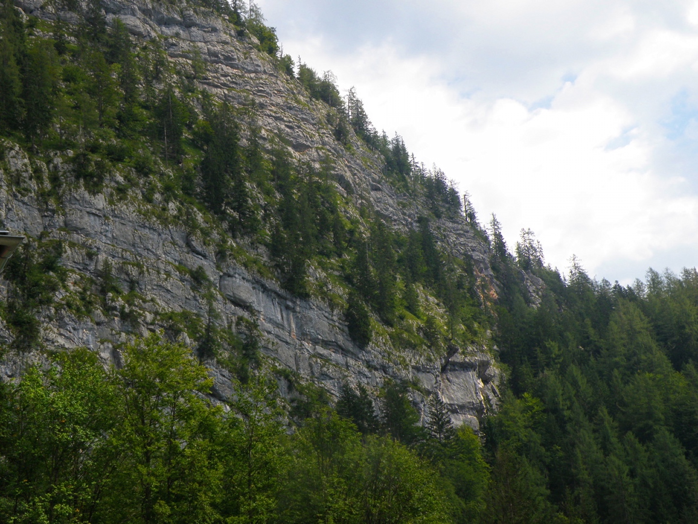 Los ging es am Parkplatz im Hallstätter Umgehungstunnel. Von dort aus stiegen wir zunächst über eine Treppe und einen geschotterten Weg hinauf Richtung Salzbergwerk, bis das erste größere Hindernis für Coco kam: eine Brücke aus Gitterrost. Gut, über die Brücke konnte ich sie noch hinübertragen, aber auch die folgenden Treppen waren aus diesem hundefeindlichen Material. Hans sah mich schon ganz verlegen an, weil er bei der Planung dieses Detail nicht beachtet hatte, aber Coco fand schnell einen Ausweg, indem sie einfach neben der Treppe durch das Gebüsch nach oben lief. Am Bergwerk vorbei folgten wir der Forststraße Richtung Oslhütte, nicht ohne an zwei Stellen über kleinere Pfade abzukürzen. Bei einer Pause auf etwa 1300 Metern zog es sich über dem Dachstein gefährlich zu, so dass wir uns zur Umkehr entschlossen, es war auch schon relativ spät und sehr heiß. Da sich die Wolken bald wieder verzogen, gingen wir nicht auf dem Aufstiegsweg zurück, der ja für Coco wieder etwas problematisch geworden wäre, sondern nahmen den Gangsteig. Dieser ist gut versichert, erfordert aber auf jeden Fall Trittsicherheit und schwindelfrei sollte man auch sein. An einer Stelle streikte Coco dann doch, denn sie hätte einen Meter abspringen müssen und genau zwei Meter Bremsweg bis zur Kante gehabt, an der es 100 Meter senkrecht in die Tiefe gegangen wäre. Über diese Stelle wurde sie von Beate getragen, die von uns allen das größte alpinistische Können aufweist. Am unteren Ende ging es schließlich über eine Fahrstraße zurück nach Hallstatt, wo wir uns nach einem Zwischenstopp mit Kaffee und Kuchen noch eine Stunde lang am Badeplatz von Hans erfrischten.