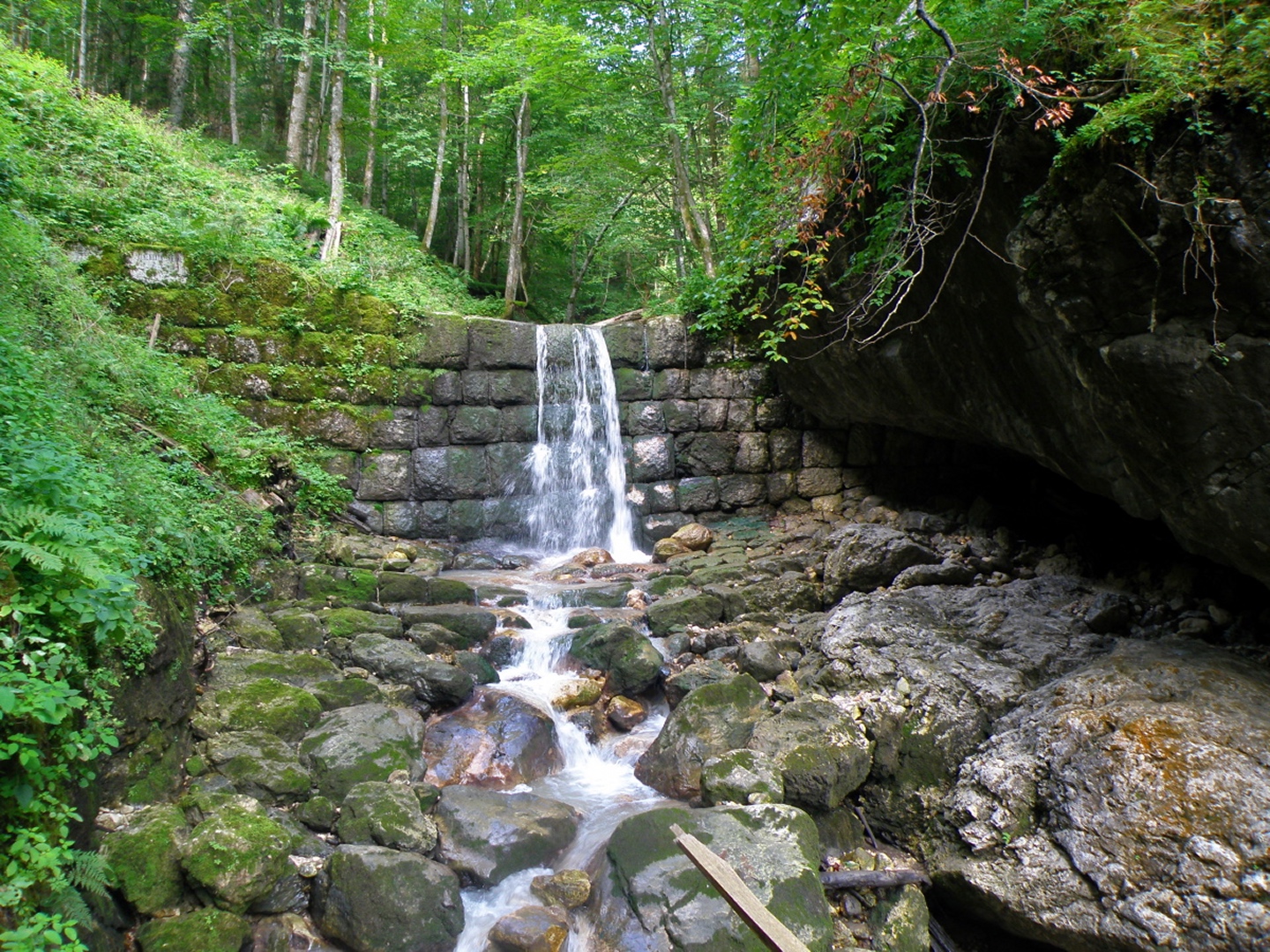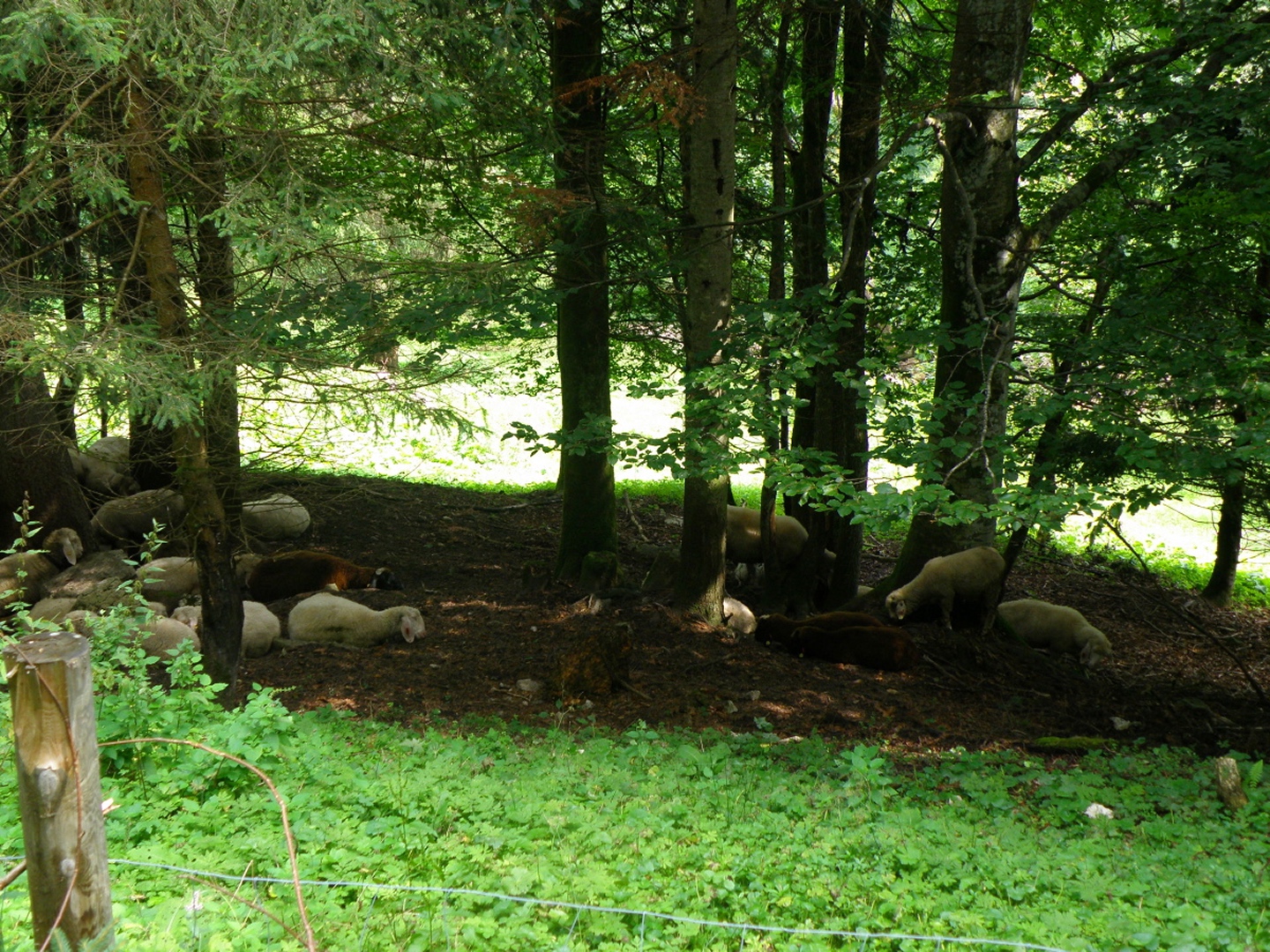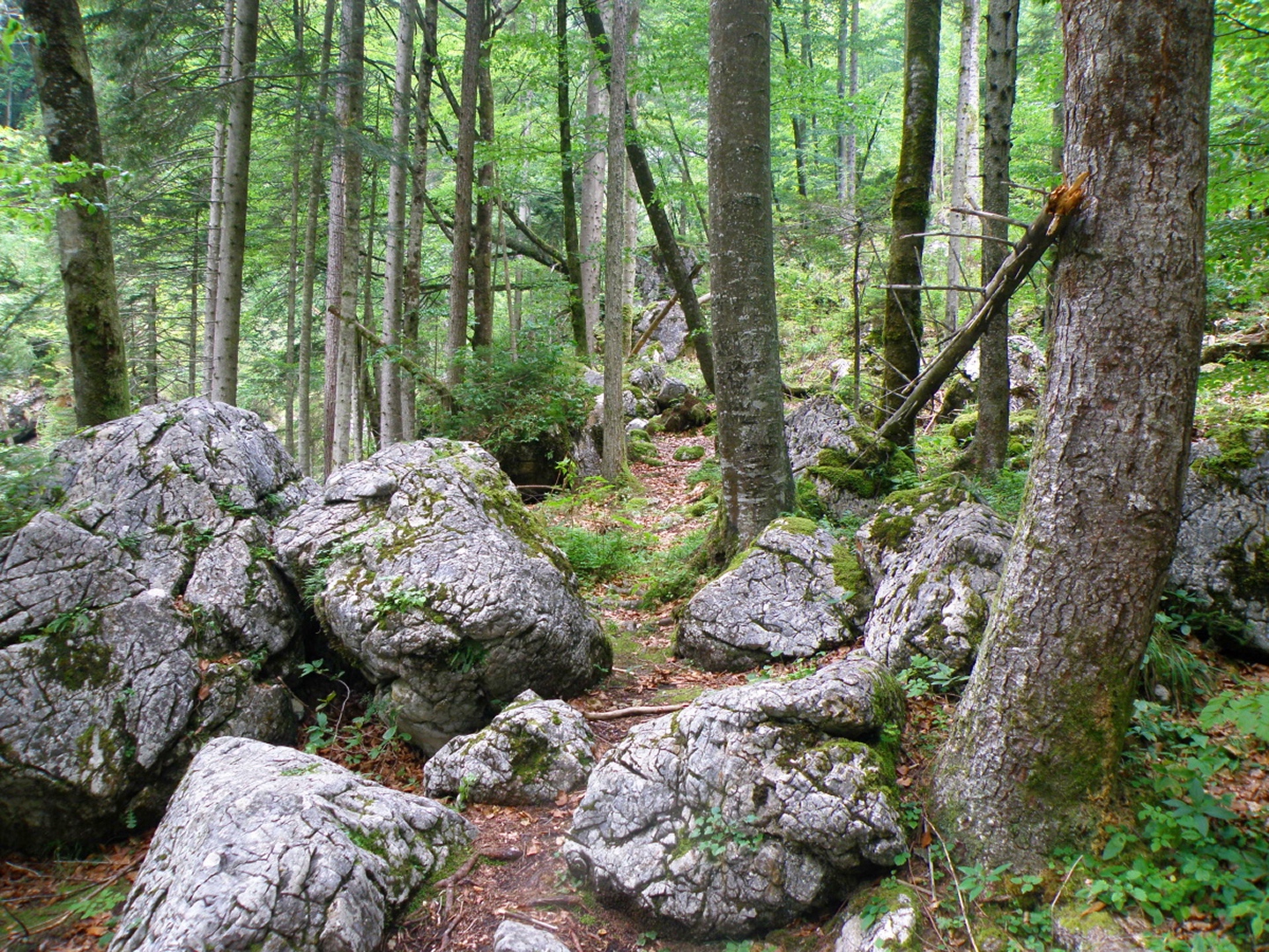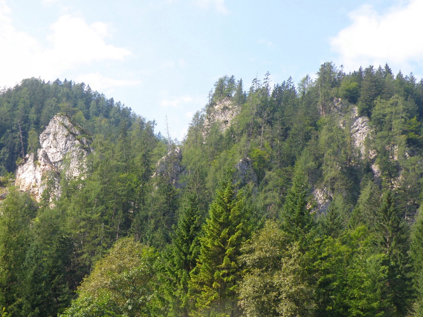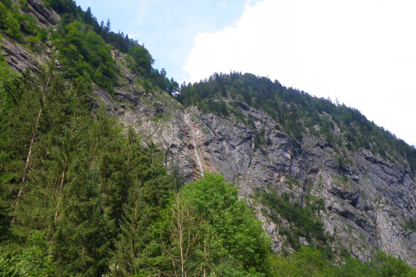 Los ging es am Parkplatz im Hallstätter Umgehungstunnel. Von dort aus stiegen wir zunächst über eine Treppe und einen geschotterten Weg hinauf Richtung Salzbergwerk, bis das erste größere Hindernis für Coco kam: eine Brücke aus Gitterrost. Gut, über die Brücke konnte ich sie noch hinübertragen, aber auch die folgenden Treppen waren aus diesem hundefeindlichen Material. Hans sah mich schon ganz verlegen an, weil er bei der Planung dieses Detail nicht beachtet hatte, aber Coco fand schnell einen Ausweg, indem sie einfach neben der Treppe durch das Gebüsch nach oben lief. Am Bergwerk vorbei folgten wir der Forststraße Richtung Oslhütte, nicht ohne an zwei Stellen über kleinere Pfade abzukürzen. Bei einer Pause auf etwa 1300 Metern zog es sich über dem Dachstein gefährlich zu, so dass wir uns zur Umkehr entschlossen, es war auch schon relativ spät und sehr heiß. Da sich die Wolken bald wieder verzogen, gingen wir nicht auf dem Aufstiegsweg zurück, der ja für Coco wieder etwas problematisch geworden wäre, sondern nahmen den Gangsteig. Dieser ist gut versichert, erfordert aber auf jeden Fall Trittsicherheit und schwindelfrei sollte man auch sein. An einer Stelle streikte Coco dann doch, denn sie hätte einen Meter abspringen müssen und genau zwei Meter Bremsweg bis zur Kante gehabt, an der es 100 Meter senkrecht in die Tiefe gegangen wäre. Über diese Stelle wurde sie von Beate getragen, die von uns allen das größte alpinistische Können aufweist. Am unteren Ende ging es schließlich über eine Fahrstraße zurück nach Hallstatt, wo wir uns nach einem Zwischenstopp mit Kaffee und Kuchen noch eine Stunde lang am Badeplatz von Hans erfrischten.
