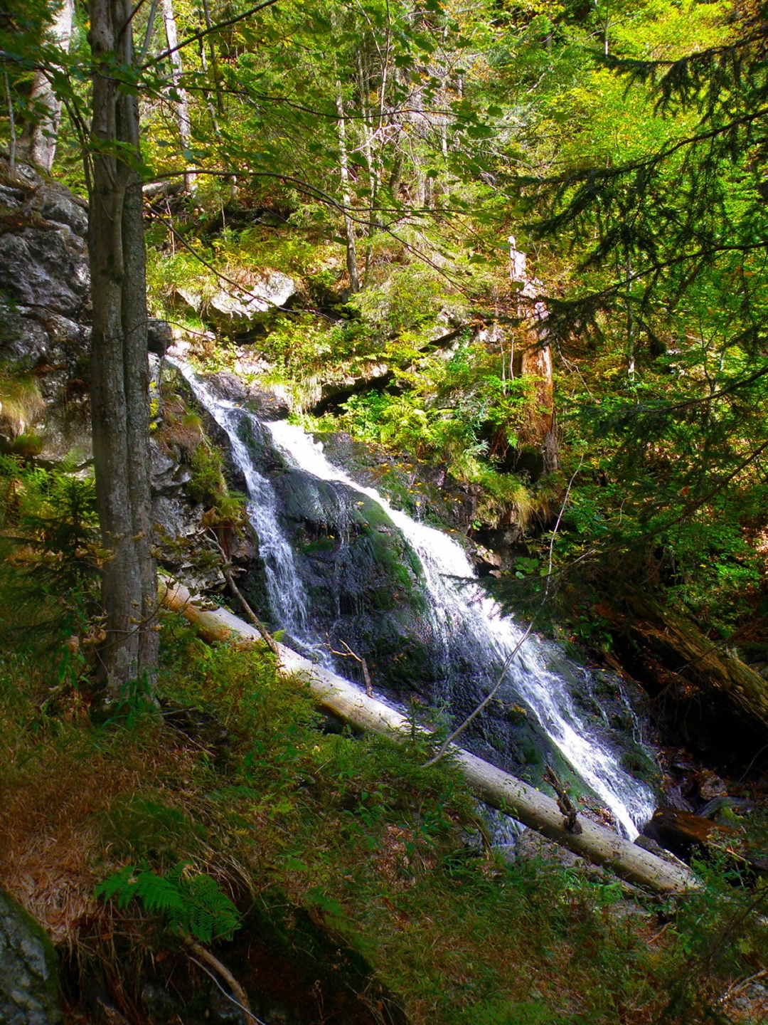 Noch weniger erfreulich war die Erkenntnis, dass die für den Tag vorgesehenen Akkus meiner Kamera das Ende ihrer Lebensdauer erreicht haben und trotz 37 Stunden im Ladegerät kaum Saft hatten. Na gut, dann wird eben etwas sparsamer fotografiert und der Fototeil des Berichts wird übersichtlicher. Nach einer guten Stunde im Wald tauchte auf einmal rechter Hand eine Hütte und wenige Meter später eine Geländekante auf. Ich trat auf eine wilde Wiese, die von einem großen Infoschild als Ruckowitzschachten definiert wurde. Der Name ist auf die Dummheit eines preußischen Landvermessers zurückzuführen, der aus dem Namen Rucka Wies = Rauhe Wiese den Ruckowitz machte. Schachten ist so ganz nebenbei der waldlerische Begriff für eine Alm, die Rucka Wies war früher der mit über 30 Hektar größte seiner Art im Zwieseler Winkel. Nach ein paar Zwetschgen und Weintrauben aus dem heute komplett vegetarischen und selbsterzeugten Proviantpack ging es weiter Richtung Süden, wo ich nach einer kurzen Waldpassage das Plateau des Ruckwiesbergs erreichte. Dieses sieht zwar genauso aus wie der Ruckowitzschachten, allerdings ist dieser Zustand eher auf Kyrill und andere Stürme zurückzuführen. Der Windwurfpfad, eine kleine Schleife von gerade mal 400 Metern, erklärt da vieles. Der Abstecher ist auch deshalb lohnend, weil man von der Nordkante einen guten Blick auf die Arberregion und das Künische Gebirge hat. 100 Meter nach dem Ende des Windwurfpfades stößt man auf den Weg vom oberen Ende des Höllbachgsprengs zum Gipfel. Hier bog ich links ab und stieg zum Höllbachgspreng hinab, was mir insgesamt etwa 200 Meter Höhenverlust einbrachte. Allerdings sind diese 200 Höhenmeter sehr lohnend, selbst wenn man sich nicht von der Kompasskarte verwirren lässt und auf dem markierten Steig bleibt. Man muss, wenn man von oben kommt, lediglich aufpassen, dass man nach der ersten Bachquerung bei der nächsten Gelegenheit wieder auf die rechte Bachseite zurückquert und nicht zur Höllbachschwelle absteigt. Hier gibt es keinen Schilderbaum und die Markierungen sind auch nicht immer klar erkennbar. Kurz nach der erneuten Querung kommt die Schlüsselstelle, ein etwa zehn Meter hoher, geschätzte 50 Grad steiler Abschwung, der aber ordentlich gestuft ist und nicht über T3 hinausgeht. Danach quert man ohne nennenswerten Höhenunterschied den Hang nach rechts, bis der markierte Pfad um einen Felsvorsprung biegt. Hier folgte ich einem rechts abbiegenden unmarkierten Pfad steil nach oben, weil ich laut Karte vor einem Sturzbach steil hinaufmusste. Was ich nicht wusste, war, dass der markierte Weg doch der Hüttensteig war und der in der Karte verzeichnete Sturzbach etwa 300 Meter weiter südwestlich herunterkam. Egal, ich war zwar die nächsten 20 Minuten illegal unterwegs und musste mich auch mit Matsch und ähnlichem herumschlagen, aber die kleine T4-Einlage mit erneut bis zu 50 Grad Hangneigung war richtig aufbauend, weil ich im Gegensatz zur Hochblassentour oder auch der gescheiterten Baumgartgeier-Überschreitung keinerlei mentalen Probleme hatte und die Kraxelei als Genuss empfand. Zurück auf dem Weg ging ich in gemütlichen 20 Minuten zum Gipfel, verlor aber unterwegs mein kleines Handtuch. Was solls, ich hab ja noch ein paar von der Sorte. Nach der Gipfelaussicht und ein paar Fotos genehmigte ich mir ein Weltenburger Barock-Dunkel und ein Wiener Schnitzel, ich bin ja schließlich keine Vegetarierin. Allerdings war das Schnitzel höchst durchschnittlich und der Kartoffelsalat noch durchschnittlicher, sollte ich wiederkommen, wird es wohl ein adeliger Unsinn. Der sah deutlich besser aus. Den Abstieg ging ich auf dem Weg an, den die meisten Besteiger des Falkensteins im Aufstieg nehmen, nämlich über den Kleinen Falkenstein und die Steinbachfälle. Vor diesem Abstieg wird bei Nässe und Schnee auf großen Schildern gewarnt, und diese Warnungen sind absolut gerechtfertigt. Die ersten 120 Höhenmeter sind zwar nur holprig, aber ab dem Kleinen Falkenstein, übrigens ein weiterer hübscher Aussichtsfelsen, aber total ungesichert (!!), wird es noch einmal richtig spannend. Bei guten Verhältnissen wie auf meiner Tour lasse ich den Abstieg als T2 mit T3-Stellen durchgehen, aber bei Nässe besteht auf den nassen Wurzeln und Felsen massive Rutschgefahr. Man stürzt zwar nirgends tief ab, aber ein gebrochener Fuß oder ein zerfetztes Kreuzband ist allemal drin. Und das muss ja wirklich nicht sein. Nach knapp einer Stunde kam ich dann zur Abzweigung, an der ich sechs Stunden zuvor geradeaus weitergegangen war und kehrte auf dem Anstiegsweg zum Auto zurück, das ich um 17.22 Uhr erreichte.