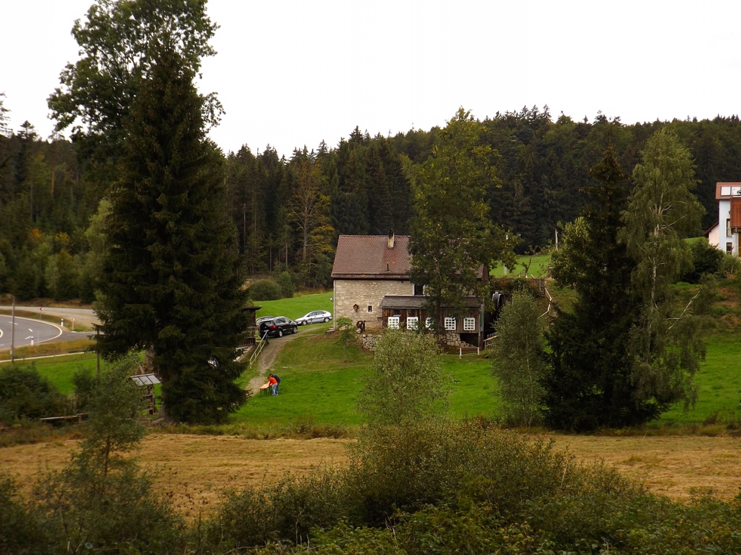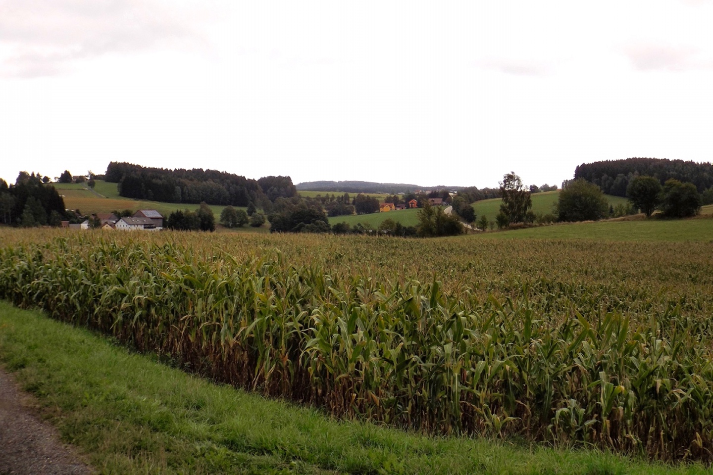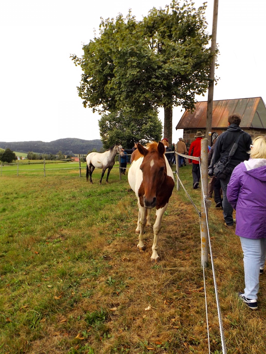 Also hatten wir in Schwandorf die Qual der Wahl und entschieden uns, beides zu verbinden. Immerhin liegt Pfreimd auf dem Weg nach Georgenberg und der Zweigverein Schwandorf war noch nie bei der Festmesse dabei, sondern bisher immer mit dem Zug nach Nabburg gefahren, von dort aus zum Berg gewandert und am frühen Nachmittag angekommen. Dieses Mal fuhren wir eben rechtzeitig zur Messe mit dem Auto hinauf, setzten uns nach der Messe zum Frühschoppen und Mittagessen in einen der Festpavillions und fuhren kurz nach 13 Uhr weiter nach Georgenberg. Dort war ebenfalls schon ein Festzelt vor dem Vereinslokal aufgebaut, in dem es nach der Wanderung, die ich eher als Spaziergang bezeichnen würde, noch ein gemütliches Beisammensein mit Musik geben sollte. Die Route war so gewählt, dass sie einerseits nicht langweilig, aber eben auch von den älteren Teilnehmern zu schaffen war und führte vorbei an Neukirchen zu St. Christoph nach Neudorf zum Grenzsteig. Leider blieben wir nur etwa 150 Meter auf diesem und bogen dann ab zur Kapelle am Wasserbehälter, wo Manfred Janker den sicher 150 Teilnehmern das Panorama erklärte. Weiter ging es über den Troidelberg zur Mühle Gehenhammer, die dem OWV Georgenberg gehört und es Schnaps gab. Nach einem Viertelstünderl ging es dann auf einer anderen Route zurück zum Festzelt. Unterwegs entdeckte Waltraud noch ein paar Schwammerln und nahm auch einen Teil davon mit. Im Festzelt gab es noch eine Brotzeit und das eine oder andere Bier, bevor wir kurz nach 18 Uhr wieder zurückfuhren.