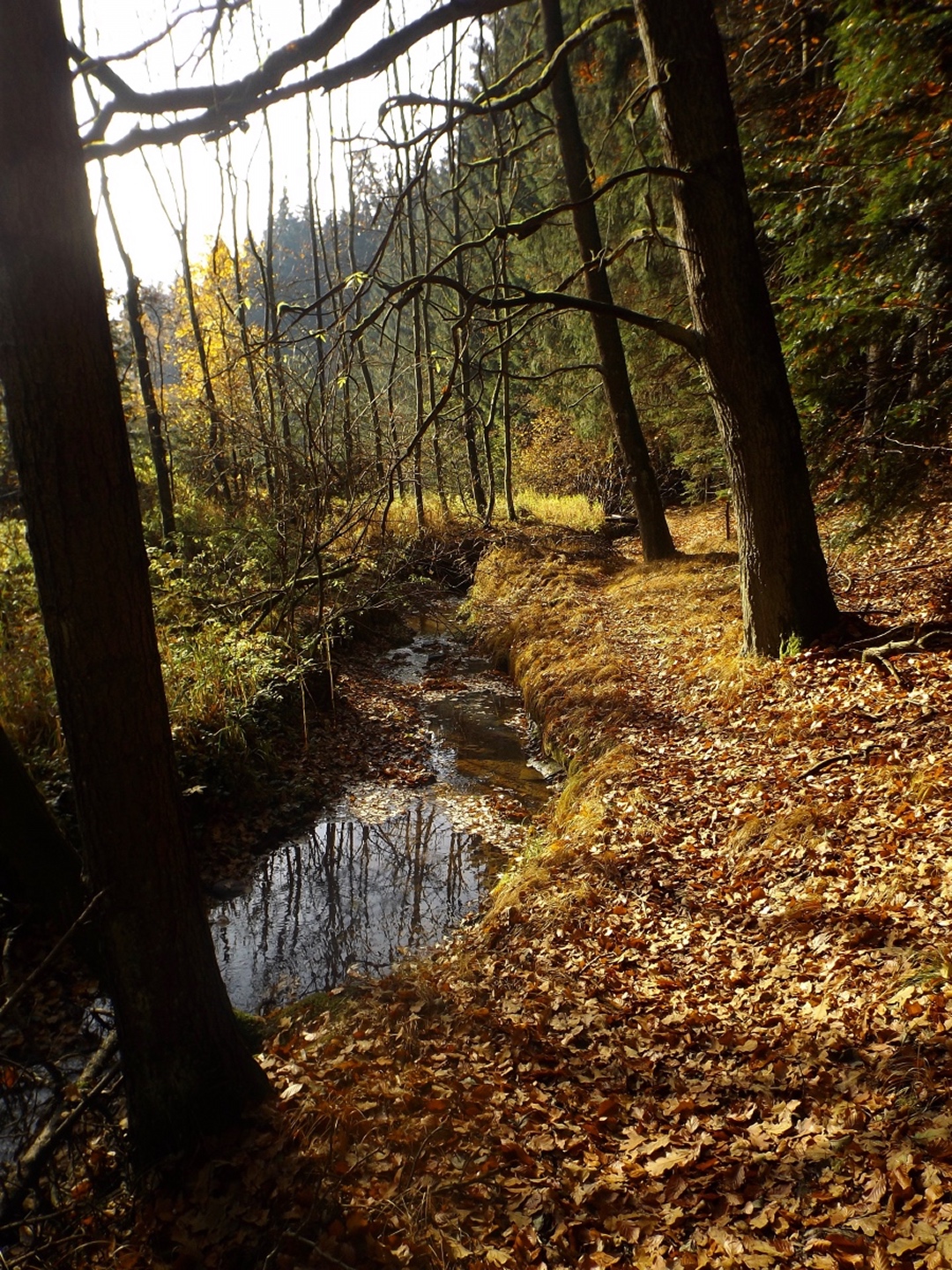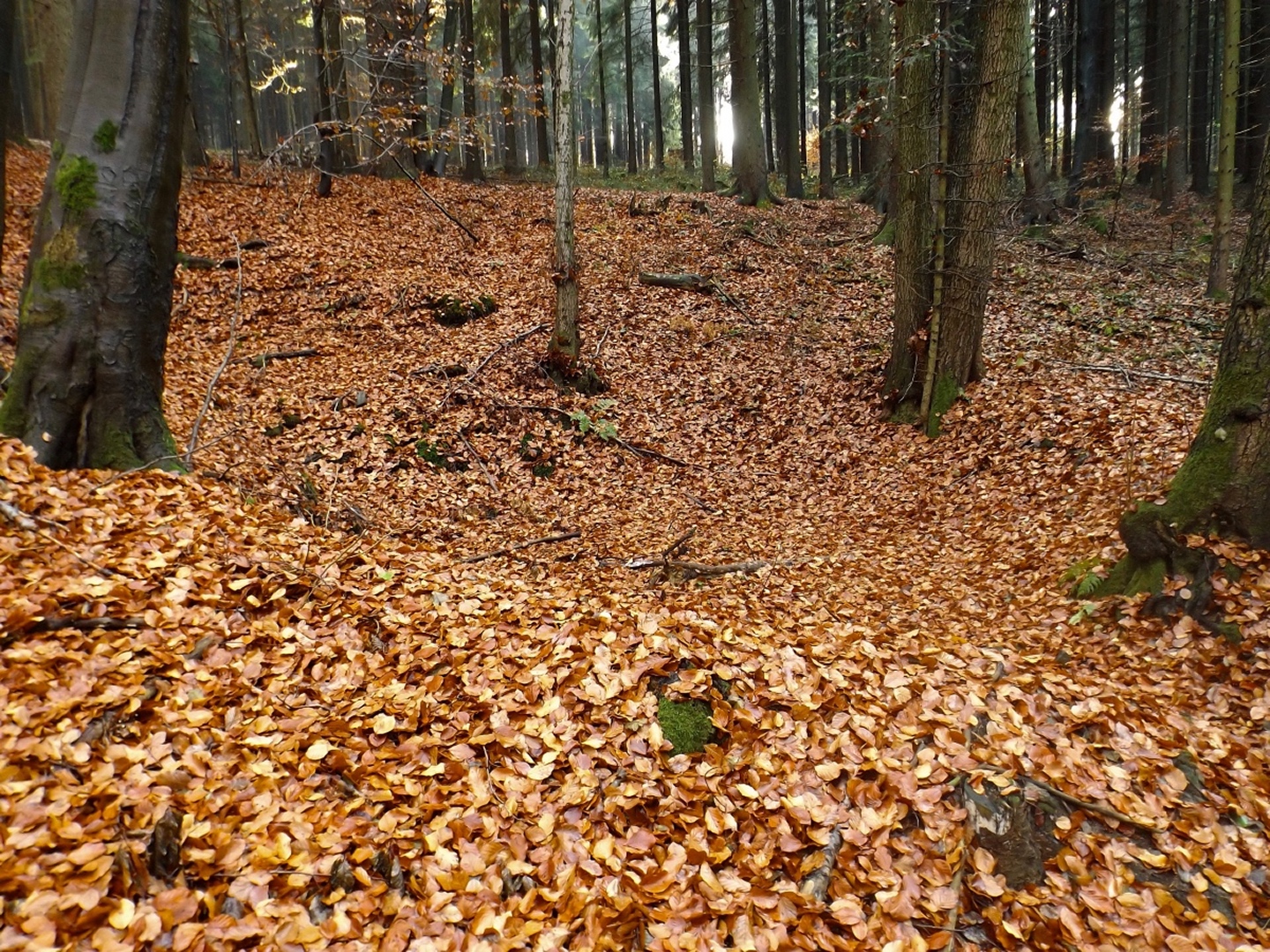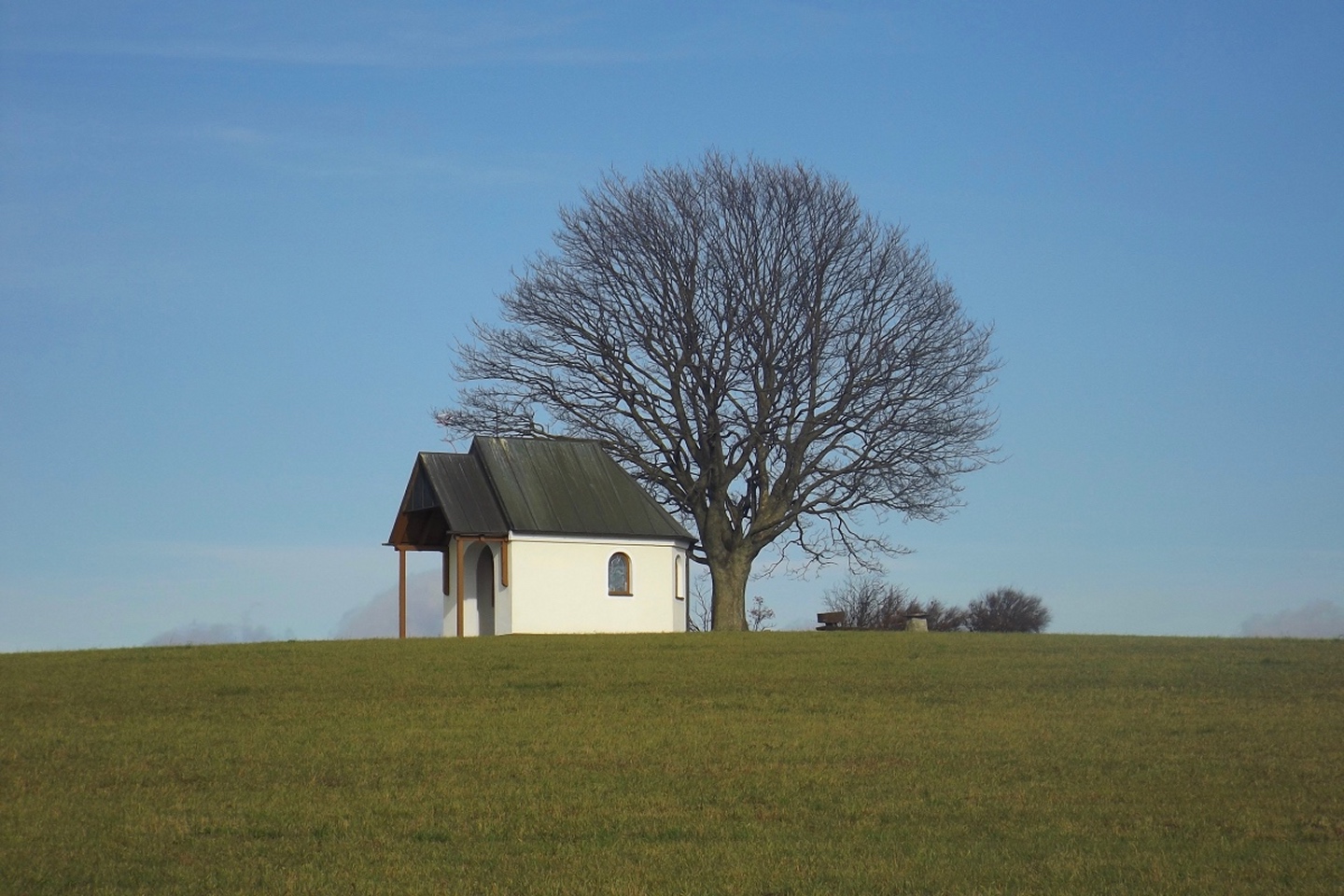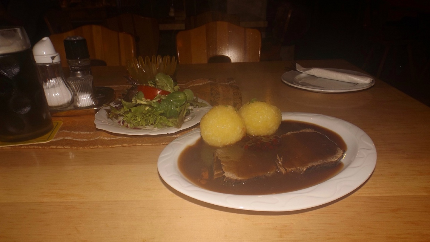 Ich startete in die im Vergleich zu Februar 2014 entgegengesetzte Richtung und ging auch an der Abzweigung, an der ich vom Zollhaus heruntergekommen war, geradeaus weiter auf dem roten W. Bald ging es durch den Wald mit herrlichen Sonnenstrahleneffekten, nach etwa einer Dreiviertelstunde erreichte ich zum ersten Mal das Hölltal. Ich überquerte zunächst die Kreisstraße, dann den Gleitenbach, und erreichte eine Kleingartenanlage, wo sich der Wanderweg mit dem Goldsteigzubringer vereinigte. Am oberen Ende der Kleingartenanlage biegen zunächst beide Wege nach links ab, 50 Meter weiter trennen sie sich und ich blieb auf dem Goldsteigzubringer. Dieser führt jetzt etwas steiler durch den Wald, später etwas undeutlicher über eine wildschweinbeackerte Wiese, und kommt am südlichen Ortsende von Muglhof heraus. Nach ein paar Metern ortseinwärts zweigt er wieder nach rechts ab und steigt hinauf Richtung Heiligdreifaltigkeitsberg, wo er etwas unterhalb des Gipfels in einen Feldweg mündet. Hier geht es rechts weiter zum Goldsteig und links zur Wallfahrtskapelle auf dem höchsten Punkt, bei der ich meine erste Pause einlegte und die mitgebrachte Wurst-Käse-Semmel sowie das erste Birnenvierterl vertilgte. Die Kapelle ist recht hübsch und die Aussicht noch hübscher. Man kann an dieser Stelle auf einer undeutlichen Spur direkt nach Osten zum Goldsteig absteigen, wie es der Rother-Wanderführer empfiehlt, ich hatte aber Zeit und ging zurück zum Abzweig und weiter bis zur offiziellen Vereinigung des Zubringers mit dem Goldsteig. Dieser ist Richtung Norden auch nicht viel deutlicher, aber zumindest ein ofizieller Wanderweg. Hier ist zwar kein Naturschutzgebiet, aber warum soll ich den Bauern ärgern, wenn es nur 400 Meter mehr sind und die Runde sowieso eher zu kurz für meinen Geschmack ist? Es geht hinüber nach Matzlesrieth, an dessen Ortsrand wieder einmal eine Kreisstraße überquert wird und hinauf zu einem Wasserbehälter. Gleich hinter diesem biegt der Goldsteig nach rechts ab und folgt dem Waldrand bis zu einer Kreuzung mit dem Wanderweg, der mit der finnischen Fahne markiert ist (also blaues Kreuz auf weißem Grund). Ich wollte ein paar Höhenmeter mehr und außerdem die Hollerquelle begutachten, also bog ich hier links ab und schritt auf einem ziemlich steilen Waldweg hinab ins Hölltal. Hier sind Stöcke definitiv von großem Vorteil, aber so fit ist mein Arm doch noch nicht. Die Quelle war nicht sonderlich erkennbar, aber ein paar Meter weiter unten plätscherte ein Bacherl. Diesem folgte ich bis zum Talgrund, wo ich erst die Kreisstraße und dann wieder den Gleitenbach überquerte, noch ein paar Meter dem blauen Kreuz folgte und dann auf den Wanderweg mit dem blauen Kreis wechselte. Dieser führt halbwegs steil bergauf Richtung Strobelhütte, kreuzt erst einen anderen Wanderweg und vereinigt sich bald wieder mit dem Goldsteig. Gleich danach findet man, wenn man sich am Waldrand umdreht, einen Wappenstein, der die früheren Grenzen der Herrschaften Parkstein und Waldthurn definiert. Von hier aus geht es zunächst mit Blick auf Letzau und später den Fahrenberg am Waldrand weiter und an einer Abzweigung hinauf zum Gipfel des Fischerbergs. Ich stieg nach der Ankunft sofort auf den Vierlingsturm, nur um außer Baumwipfeln nichts zu sehen, und deshalb auch gleich wieder hinunter und kehrte in der Strobelhütte ein. Dort war das Gambrinus Dunkel ganz ordentlich und der Sauerbraten excellent. Er war sogar so frisch aus der Küche, dass vom Dampf die Linse drei Mal beschlug, bevor ich endlich das Foto schaffte. Nach dem Essen ergab sich noch ein nettes Gespräch mit dem Ehepaar am Nachbartisch, so dass ich etwas länger als die übliche Stunde in der Hütte verweilte (üblich natürlich nur, wenn es sich nicht um das Lusenschutzhaus handelt oder der Wirt Thomas Seidl jun. heißt). Nach dieser Rast ging ich den eigentlich falschen Weg und bekam dadurch noch einmal etwa 500 Meter mehr unter die Füße, fand aber letztendlich den bereits bekannten Weg hinunter nach Tröglersricht. Dort schaffte ich es dieses Mal, die Dorfkapelle mit natürlich aussehendem Hintergrundblau von vorne zu fotografieren und hatte auf dem letzten Kilometer hinüber zum Parkplatz mehr Begegnungen mit Spaziergängern als bei den letzten vier Wanderungen (außer Lusen am Mittwoch) zusammen.