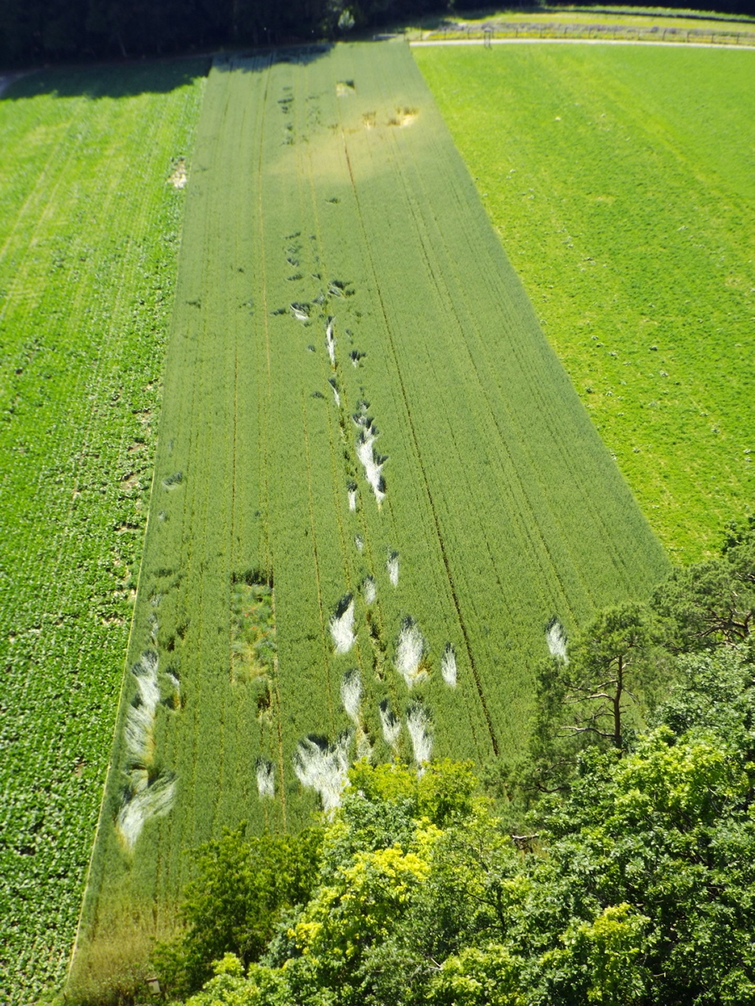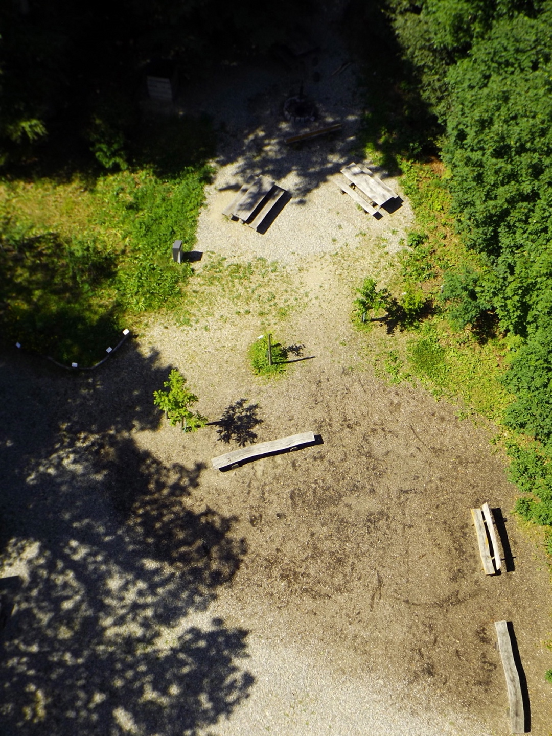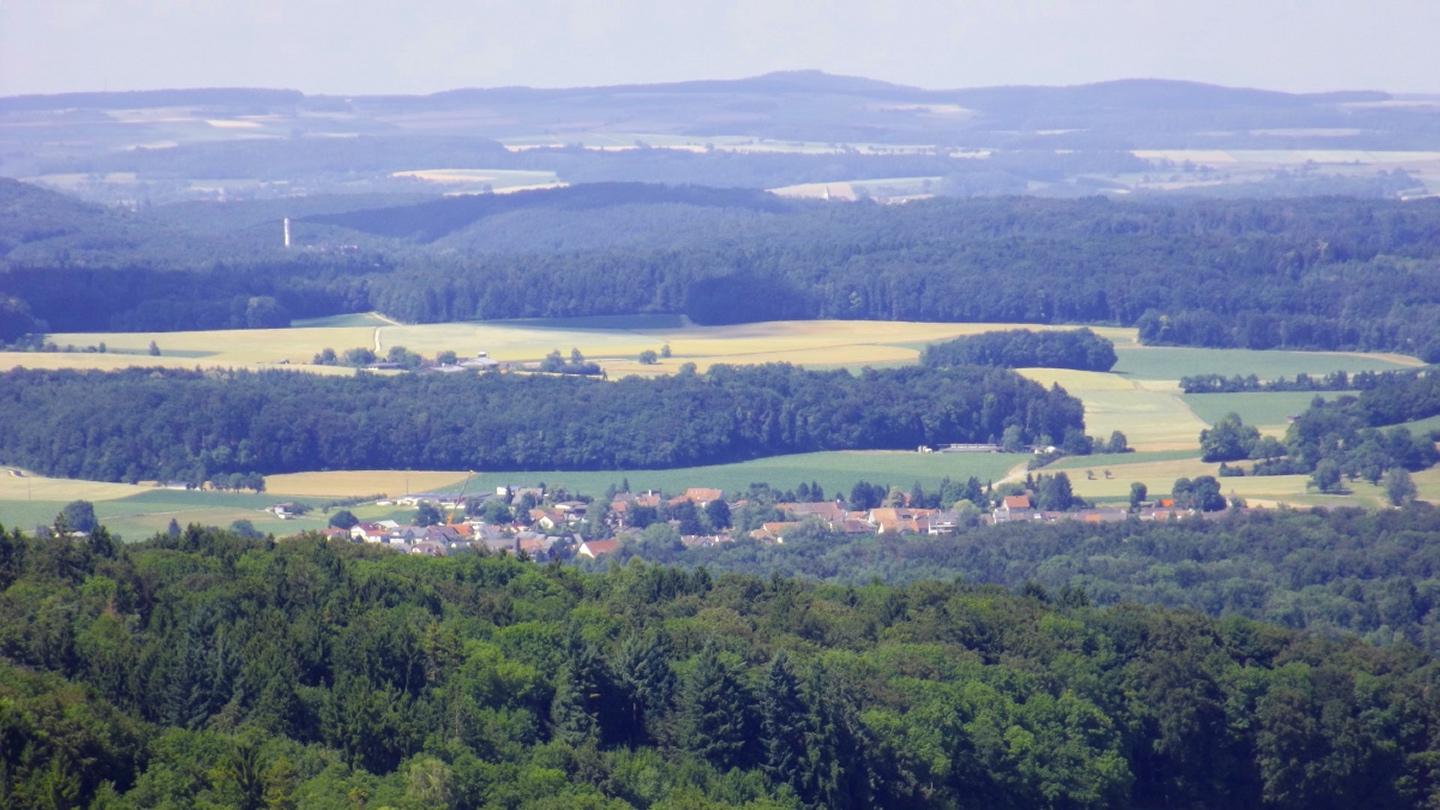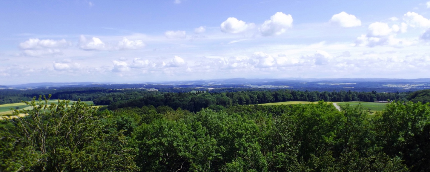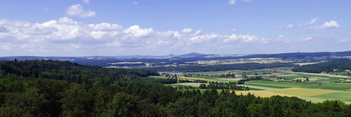 Es gibt vom Dorf aus mehrere Möglichkeiten, zum Turm hinaufzukommen. Ich ging quer durch den Ort bis zum Ortsende an der Straße nach Benken und bog dort auf einen Feldweg ab, dem ich vorbei an der Besenbeiz bis zum Waldrand folgte. Dort ging ich dem Waldrand entlang links weiter bis zu einer Kreuzung, an der der Turm bereits angeschildert ist. Dieser Beschilderung folgte ich bis zum Ziel, bei dem ich feststellte, dass einer der Hunde aus einem anderen Grund ein Problem gewesen wäre: Hunde dürfen nicht auf den Turm mitgenommen werden. Oben gibt es schöne Panoramabilder, die allerdings etwas verwirrend sind, weil Vegetation nicht dargestellt wird. Aber für einen Überblick sind sie ganz gut geeignet. So stellte ich fest, dass neben Frauenfeld und St. Gallen auch der Glärnisch und sogar der Tödi halbwegs deutlich erkennbar waren. Für den Rückweg wählte ich das kleine Wegli, das am Ende des Grillplatzes nach unten führt. Dieses wartet noch mit einer kleinen steinzeitlichen Höhle auf, von der das Foto leider total unscharf wurde. Der letzte Kilometer führte dann über eine Flurbereinigungsstraße direkt zurück zum Ortszentrum von Schlatt.