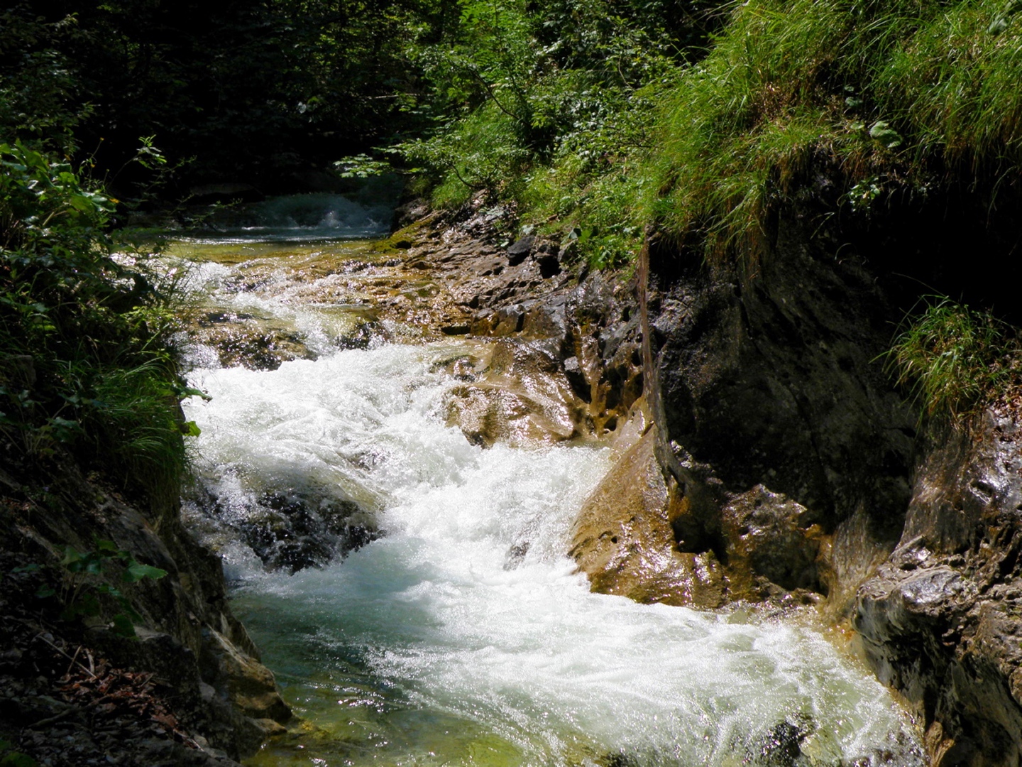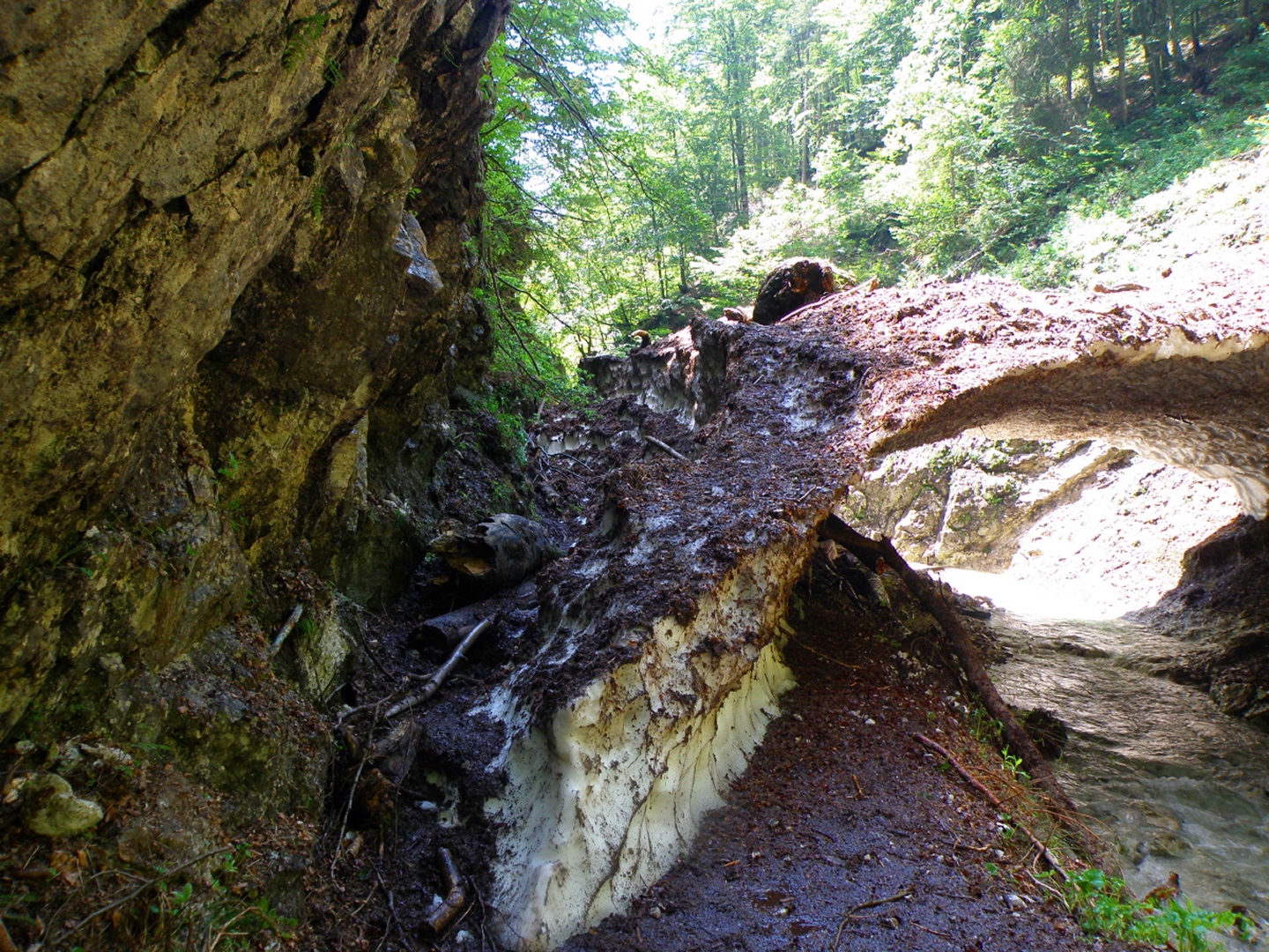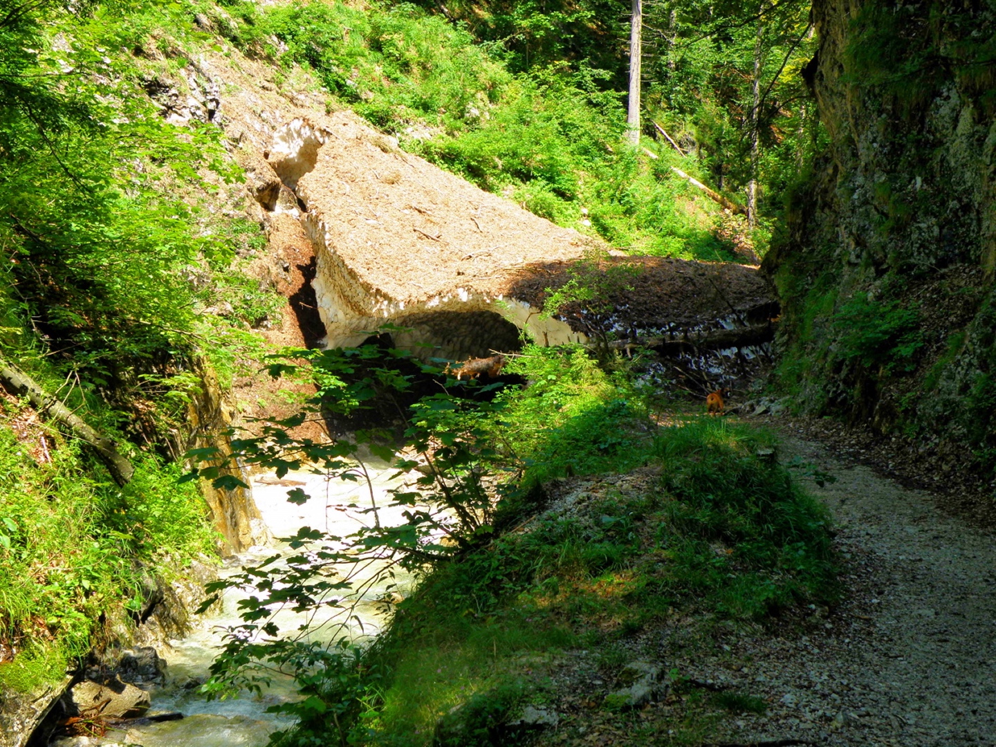 Der Aufstieg über die gut ausgeschilderte Forststraße vom Weißbacher Ortsteil Reit war ein purer Langweiler, das einzig Erfreuliche war der Spielkamerad für Coco etwa 500 m vor der Alm. Deshalb gingen wir zurück den eigentlich gesperrten Schluchtweg, da ich mir keinen triftigen Grund für eine Sperrung im August vorstellen konnte. Es war dann ein Lawinenkegel, der von der gegenüberliegenden Seite aus immer noch den Weg verlegte, jedoch direkt am Fels gefahrlos überklettert werden konnte. Ich bleibe trotzdem bei der T1, weil der Schluchtweg ansonsten keinerlei Probleme oder nennenswerte Steigungen aufweist.