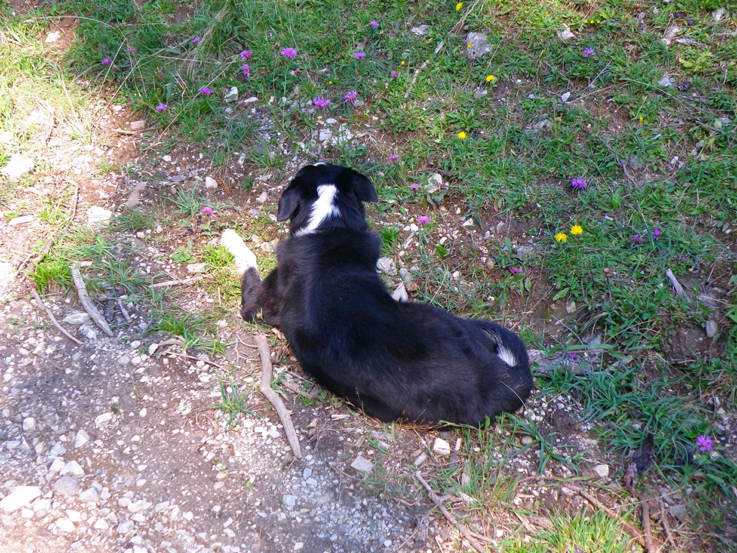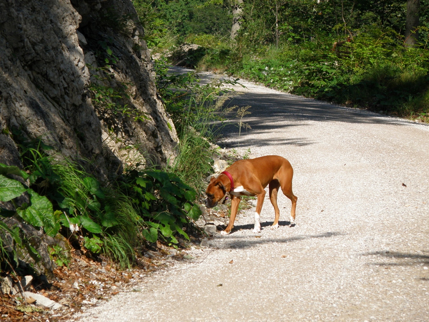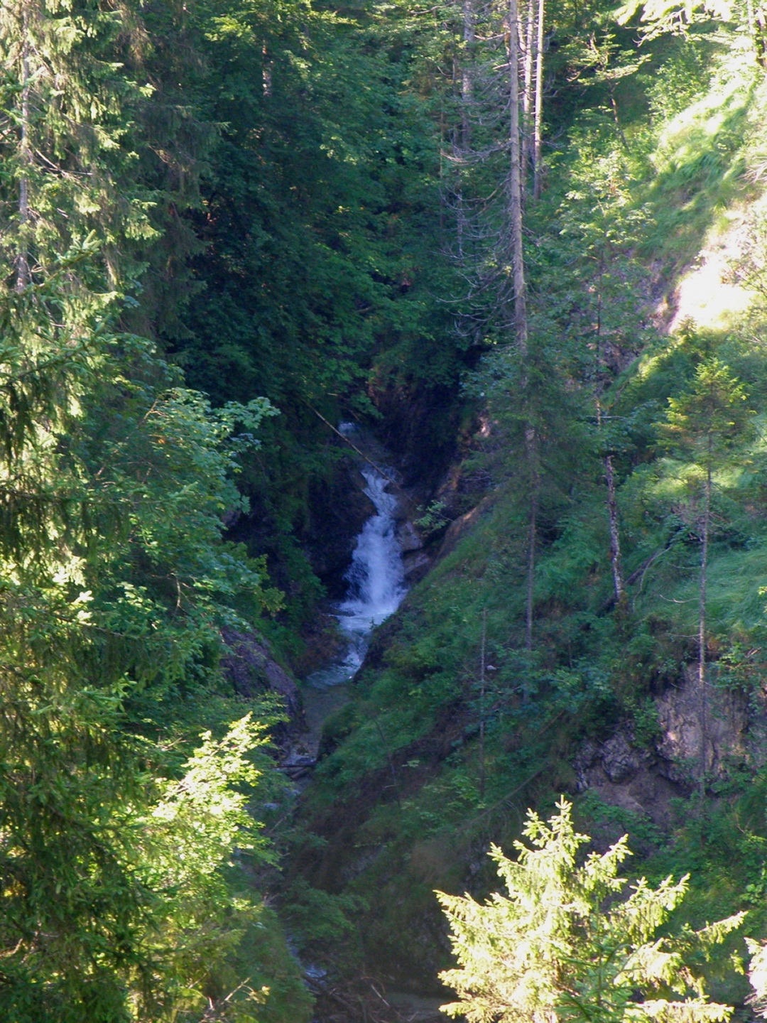Der Aufstieg über die gut ausgeschilderte Forststraße vom Weißbacher Ortsteil Reit war ein purer Langweiler, das einzig Erfreuliche war der Spielkamerad für Coco etwa 500 m vor der Alm. Deshalb gingen wir zurück den eigentlich gesperrten Schluchtweg, da ich mir keinen triftigen Grund für eine Sperrung im August vorstellen konnte. Es war dann ein Lawinenkegel, der von der gegenüberliegenden Seite aus immer noch den Weg verlegte, jedoch direkt am Fels gefahrlos überklettert werden konnte. Ich bleibe trotzdem bei der T1, weil der Schluchtweg ansonsten keinerlei Probleme oder nennenswerte Steigungen aufweist.