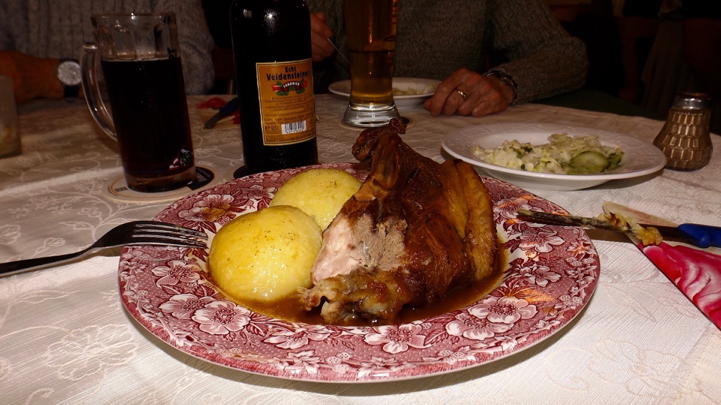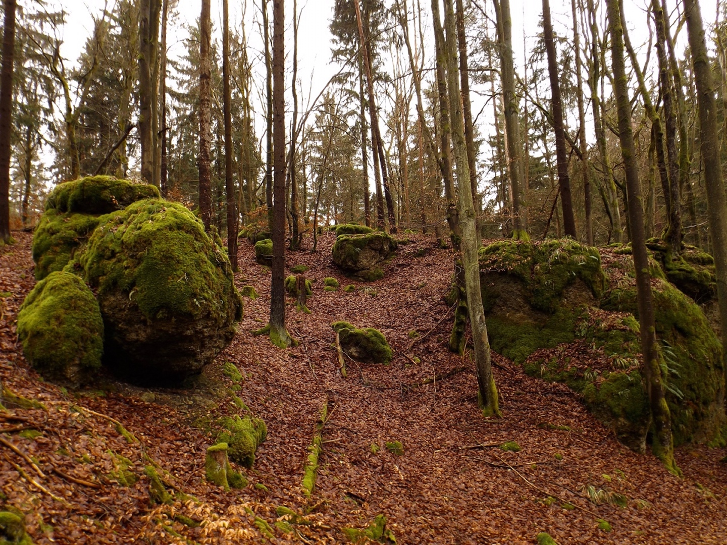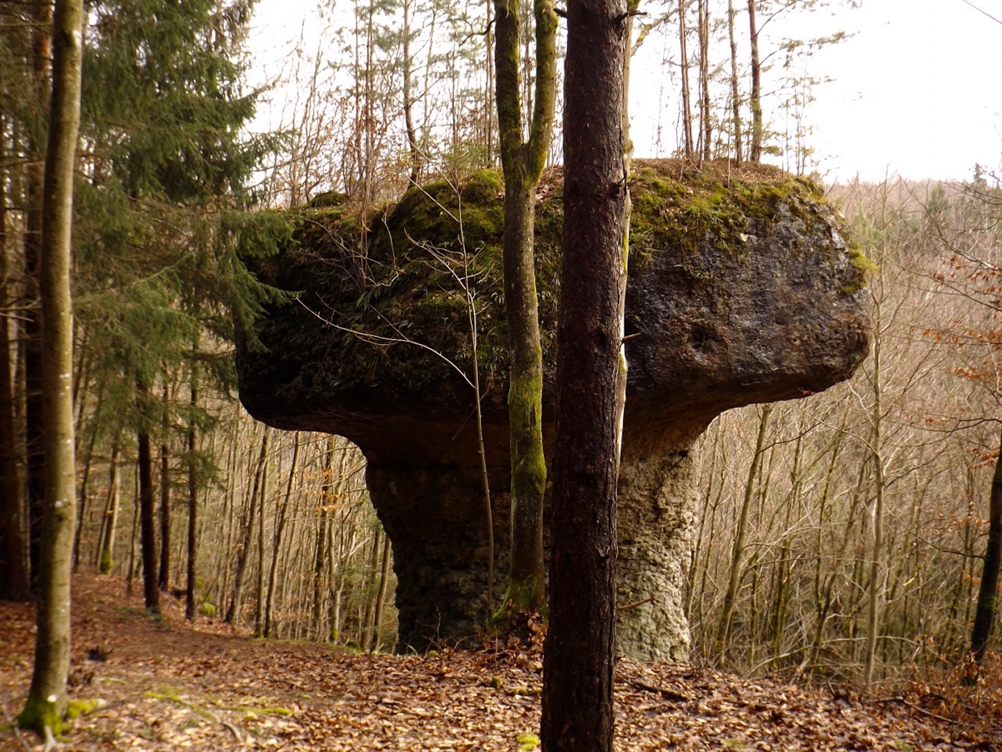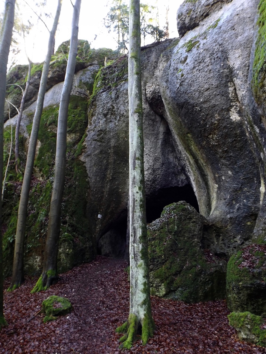 Folglich machte ich mich gegen neun Uhr auf den Weg nach Amberg, um rechtzeitig am Treffpunkt zu sein, und wurde gleich recht herzlich aufgenommen. Insgesamt waren zwölf Personen erschienen, die sich auf drei Autos verteilten und ohne Hektik zum Ausgangspunkt mitten im Wald südlich von Auerbach transportiert wurden. Von dort gingen wir auf mir völlig unbekannten und nicht immer auf dem Garmin ganz nachvollziehbaren, aber klar markierten Wegen und Pfaden, vorbei an verschiedenen Felsformationen und Höhlen, zum Rabenfels, einer besonders markanten Formation am Südwesthang des namenlosen Berges nördlich des Nestelgrunds. Nach einer kurzen Rast dort gingen wir weiter über den Brunnstein und Parasolfelsen (wobei wir eigentlich keines der beiden Naturdenkmäler erklommen, sondern nur vorbeigingen bzw. für Gruppenfotos davor posierten) zum Eichenkreuz und weiter auf der Forststraße zur Hohen Tanne. Diese ist kein Baum, sondern ein Landgasthof im gleichnamigen Weiler. Hier kehrten wir ein, und ich durfte mit hinein, obwohl Hunde eigentlich nicht erwünscht sind und ich ja nach chinesischem Sternzeichen einer bin. Karlie hätte Pech gehabt, war aber sowieso nicht dabei. Laut Info aus dem Internet gibt es dort gutes Wild, was sich aber heute auf Wildschweinbraten beschränkte. Da beim OWV Schwandorf Anfang März ein Wildschweinessen angesagt ist, verzichtete ich darauf und entschied mich stattdessen für ein Schäuferl, eine Wahl, die ich nicht bereute. Ein zweites Knödel und von Haus aus etwas mehr Soße hätten nicht geschadet, aber der Geschmack war exzellent, was auch auf das Veldensteiner Landbier zutraf. Gut gestärkt schlängelten wir uns auf anderen Abschnitten des Eichkatzlsteigs wieder zurück zum Eichenkreuz und weiter zu einer Abzweigung, die wir am Vormittag heruntergekommen waren. Nach einem am Gestrüpp gescheiterten Versuch, eine Abkürzung zur Steinernen Stadt zu finden, sparten wir uns einen zweiten steilen Aufstieg zur Vogelherdgrotte und verzichteten aus Zeitgründen auch ganz auf die Steinerne Stadt, sondern kehrten direkt zu den Autos zurück. Diese Entscheidung erwies sich als extrem richtig, denn wir waren kaum zurück auf der B 85, als es richtig zu regnen begann. So kamen wir ziemlich trocken zurück nach Amberg und ich weiter nach Schwandorf.