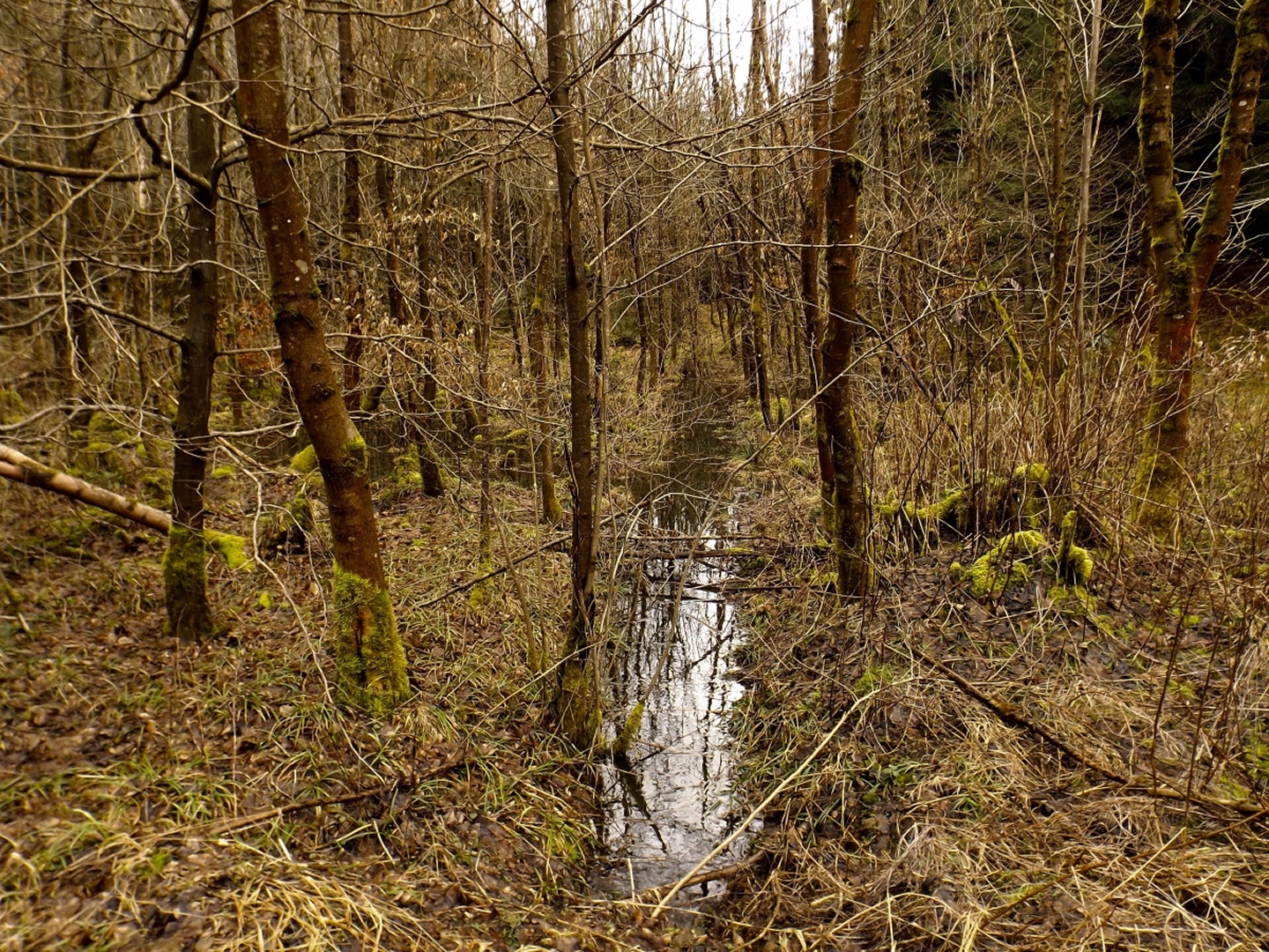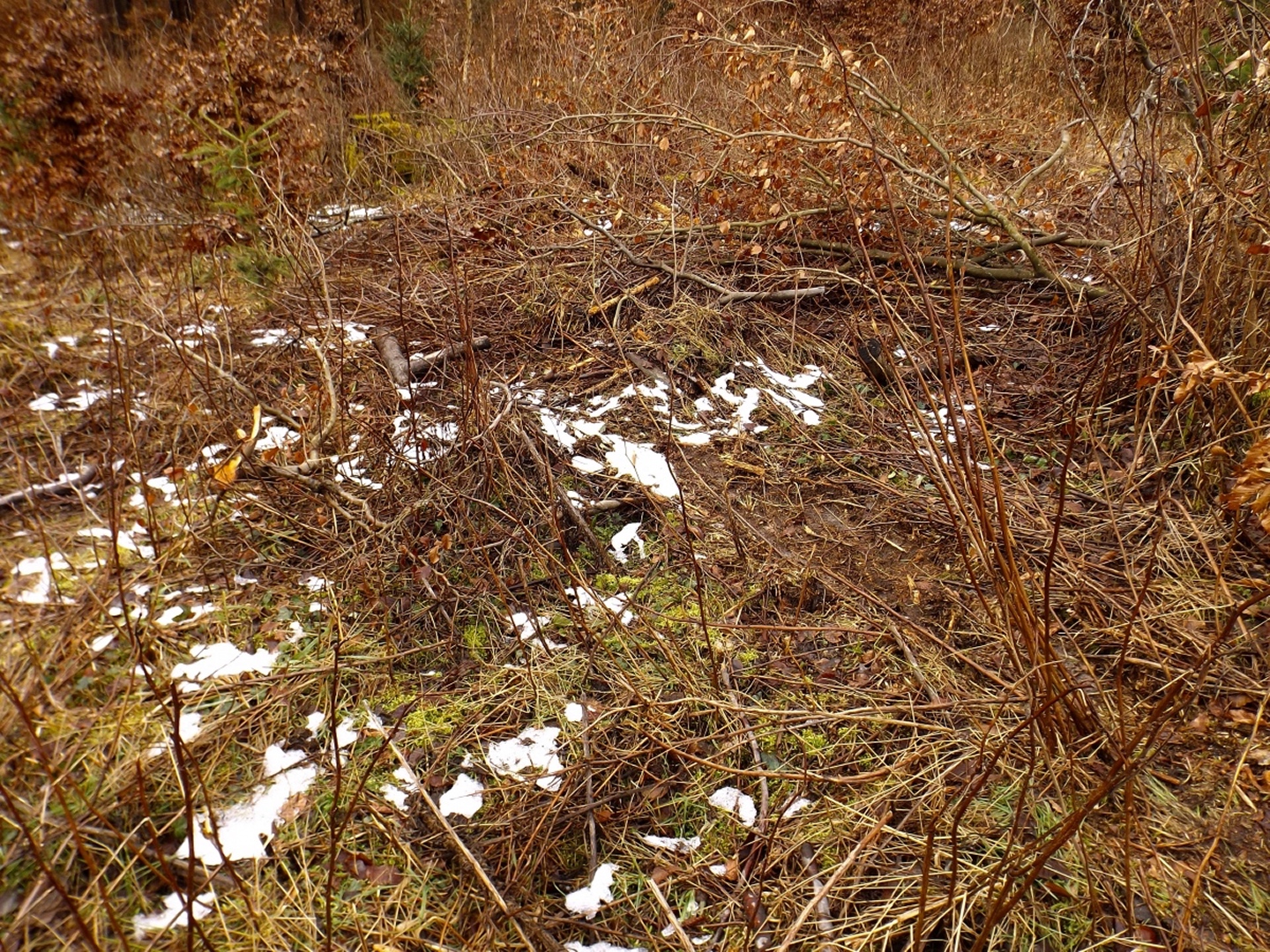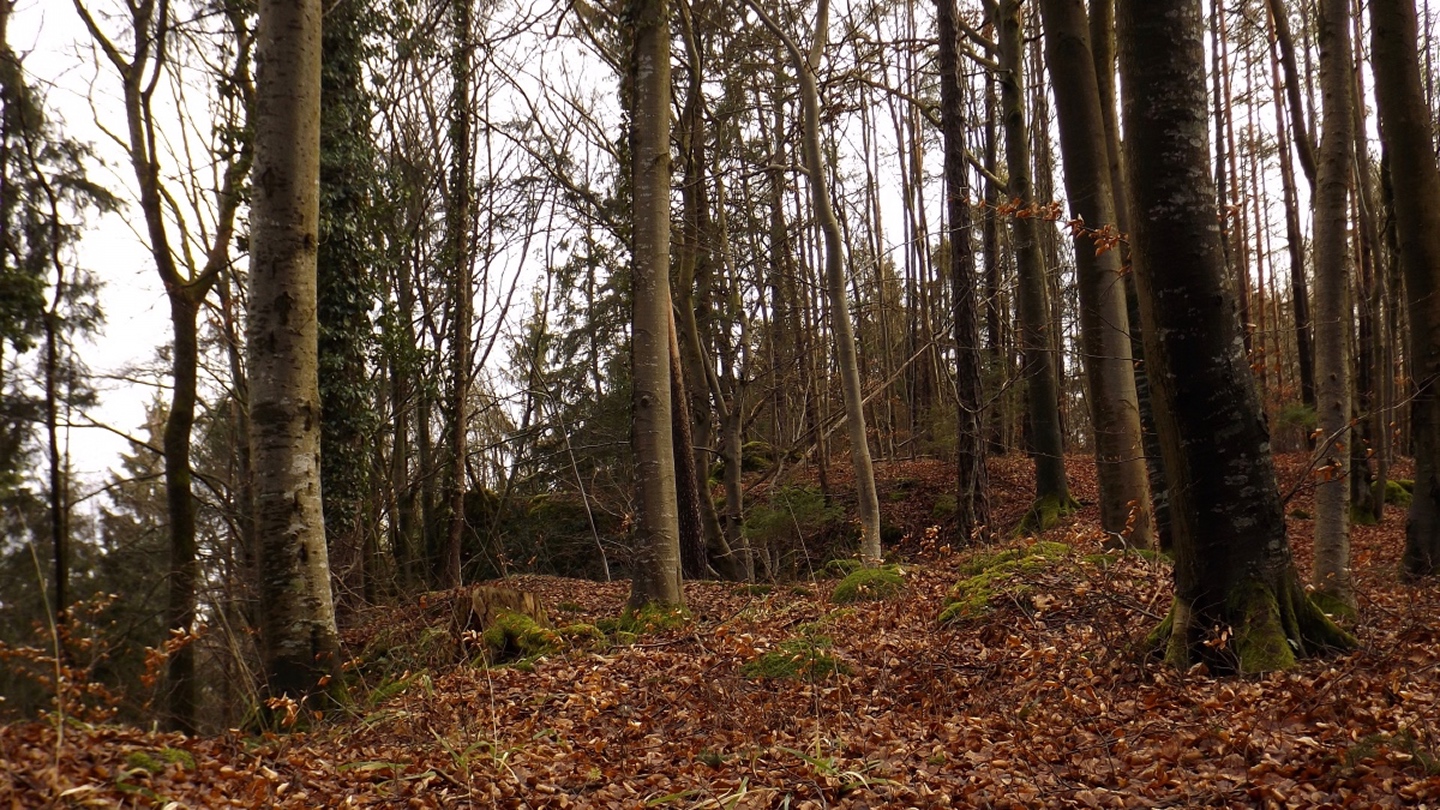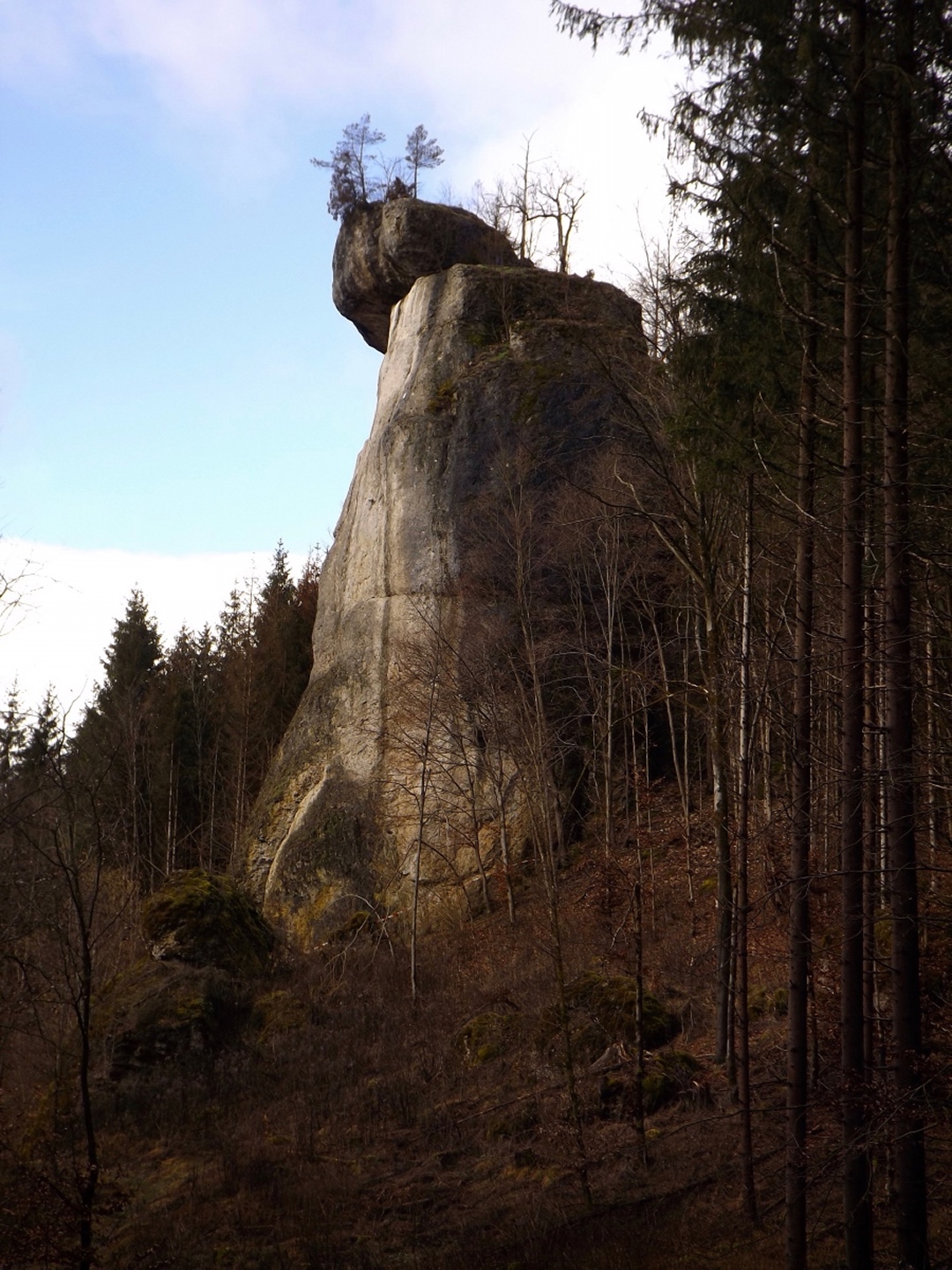 Folglich machte ich mich gegen neun Uhr auf den Weg nach Amberg, um rechtzeitig am Treffpunkt zu sein, und wurde gleich recht herzlich aufgenommen. Insgesamt waren zwölf Personen erschienen, die sich auf drei Autos verteilten und ohne Hektik zum Ausgangspunkt mitten im Wald südlich von Auerbach transportiert wurden. Von dort gingen wir auf mir völlig unbekannten und nicht immer auf dem Garmin ganz nachvollziehbaren, aber klar markierten Wegen und Pfaden, vorbei an verschiedenen Felsformationen und Höhlen, zum Rabenfels, einer besonders markanten Formation am Südwesthang des namenlosen Berges nördlich des Nestelgrunds. Nach einer kurzen Rast dort gingen wir weiter über den Brunnstein und Parasolfelsen (wobei wir eigentlich keines der beiden Naturdenkmäler erklommen, sondern nur vorbeigingen bzw. für Gruppenfotos davor posierten) zum Eichenkreuz und weiter auf der Forststraße zur Hohen Tanne. Diese ist kein Baum, sondern ein Landgasthof im gleichnamigen Weiler. Hier kehrten wir ein, und ich durfte mit hinein, obwohl Hunde eigentlich nicht erwünscht sind und ich ja nach chinesischem Sternzeichen einer bin. Karlie hätte Pech gehabt, war aber sowieso nicht dabei. Laut Info aus dem Internet gibt es dort gutes Wild, was sich aber heute auf Wildschweinbraten beschränkte. Da beim OWV Schwandorf Anfang März ein Wildschweinessen angesagt ist, verzichtete ich darauf und entschied mich stattdessen für ein Schäuferl, eine Wahl, die ich nicht bereute. Ein zweites Knödel und von Haus aus etwas mehr Soße hätten nicht geschadet, aber der Geschmack war exzellent, was auch auf das Veldensteiner Landbier zutraf. Gut gestärkt schlängelten wir uns auf anderen Abschnitten des Eichkatzlsteigs wieder zurück zum Eichenkreuz und weiter zu einer Abzweigung, die wir am Vormittag heruntergekommen waren. Nach einem am Gestrüpp gescheiterten Versuch, eine Abkürzung zur Steinernen Stadt zu finden, sparten wir uns einen zweiten steilen Aufstieg zur Vogelherdgrotte und verzichteten aus Zeitgründen auch ganz auf die Steinerne Stadt, sondern kehrten direkt zu den Autos zurück. Diese Entscheidung erwies sich als extrem richtig, denn wir waren kaum zurück auf der B 85, als es richtig zu regnen begann. So kamen wir ziemlich trocken zurück nach Amberg und ich weiter nach Schwandorf.