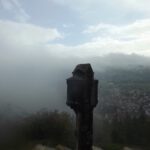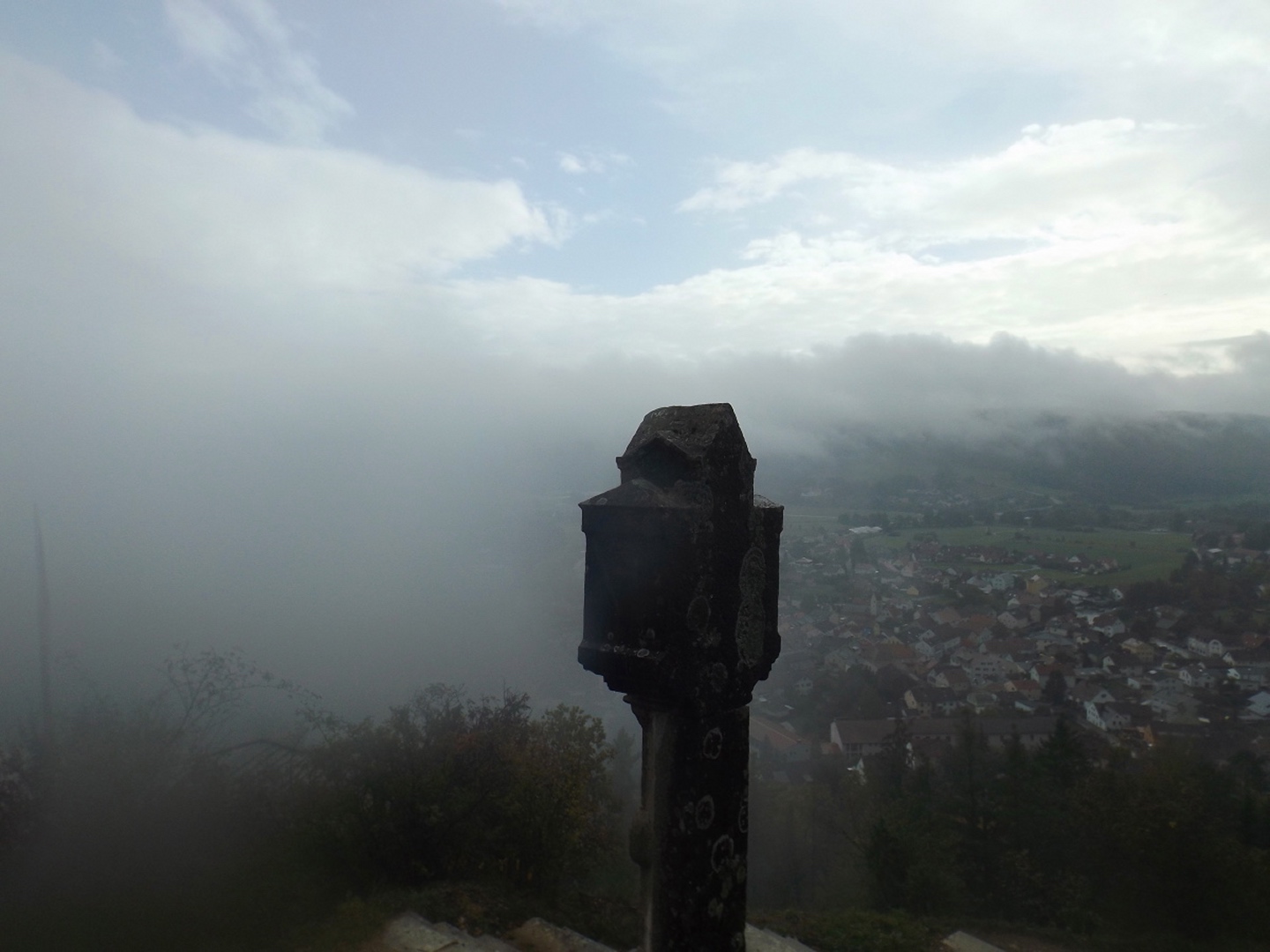 Das störte am Vormittag noch relativ wenig, wir waren alle hochgradig begeistert von dem, was uns der Innungsobermeister (ich hoffe, dass das der richtige Titel ist) Peter Wilhelm über das Zentrum und den Beruf des Kaminkehrers überhaupt erzählen konnte. Auch die Ente zum Mittagessen war exzellent und vor allem richtig preiswert. Lediglich die Sitzordnung hätte man etwas auflockern können, einige hatten leichte Probleme, ihre Arme zu bewegen. Das war aber verkraftbar, vor allem im Vergleich zum Wetter am Nachmittag. Ich konnte ausnahmsweise sogar halbwegs nachvollziehen, dass die Rennsemmeltruppe drauflosmarschierte, ohne auch nur in den Rückspiegel zu schauen und prompt an einer Abzweigung zurückgepfiffen werden musste. An der Stelle, wo wir uns eigentlich auf die kurze und lange Strecke aufteilen sollten, unterließen wir dies und gingen alle die kurze Strecke, neben dem Unangenehmen wäre es auch beim Abstieg etwas gefährlich geworden, denn die eine Stelle ist doch hübsch glitschig. Am Kreuz hörte es kurz auf zu regnen und wir konnten ein Gruppenfoto machen, welches auf der OWV-Seite zu sehen sein wird, danach ging es die Stufen hinunter nach Dietfurt und zur Abendeinkehr in den Traditionsgasthof Stirzer. Dieser ist zwar gut, aber auch unverschämt teuer, so dass ich mich neben den Getränken mit einer Kartoffelsuppe und einem Stück Schokokuchen begnügte. Ich hatte zwar einen Platz direkt am Ofen ergattert, aber trocken wurde vor allem mein Pullover nicht wirklich. So machten wir uns bald auf den Rückweg und waren kurz vor acht wieder in Schwandorf.