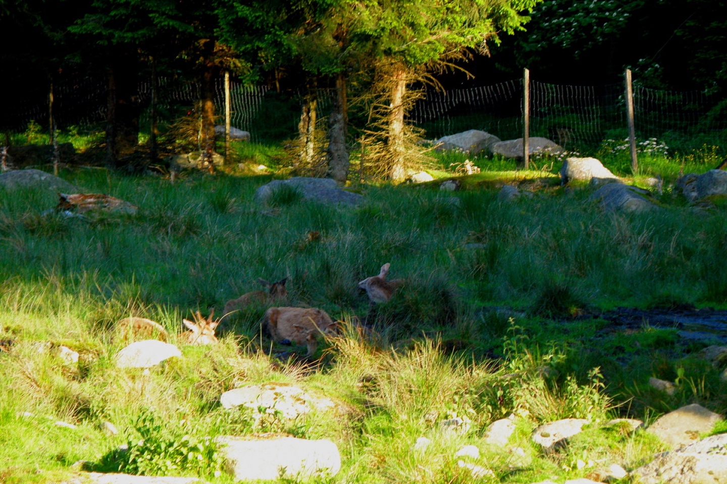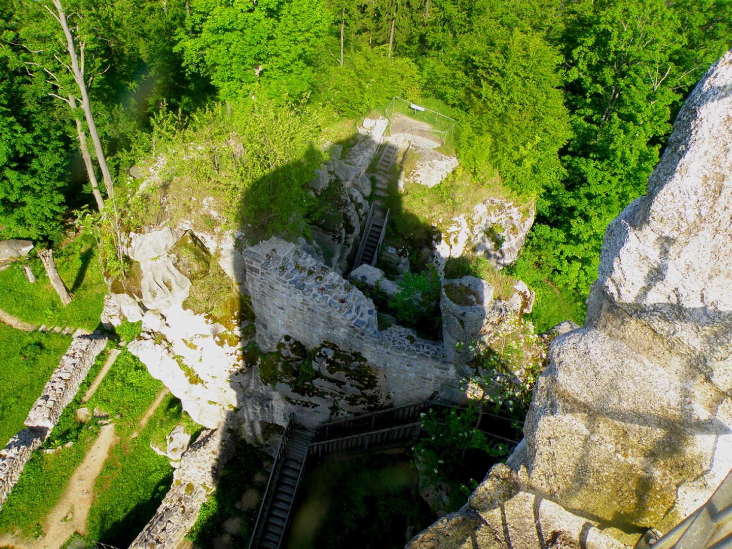 Vom Parkplatz geht es zunächst noch die Straße entlang zur goßen Infotafel, von der aus ich dem Waldlehrpfad bis Waldhaus folgte. Dieser macht zunächst einen kleinen Schlenker zum Zipfeltannenfels, der laut dortiger Infotafel die Sphinx des Steinwaldes ist. Ich habe eher ein Kamel gesehen, und das bei einer benachbarten Felsgruppe. Der Zipfeltannenfels selbst ist wohl irgendwo im V. Grad anzusiedeln, die kleine Hochfläche auf seiner Rückseite kann entweder über eine kleine Kletterstelle im I. Grad oder aber über einen bequemen T2-Weg erreicht werden. Nach diesem ersten kleinen Höhepunkt überquert der Waldlehrpfad die Forststraße, die ebenfalls nach Waldhaus führt, zwei mal, beinhaltet dabei Infotafeln zum Thema Quellen und Köhlerei, bevor man nach links zum Saubadfelsen abbiegen kann. Dieser kann über eine Gitterrostleiter erstiegen werden und bietet bei guten Sichtverhältnissen ein feines Panorama von Weiden über den Rauhen Kulm bis hinüber zu Ochsenkopf und Schneeberg im Fichtelgebirge. Im Hintergrund ist sogar die Fränkische Schweiz erkennbar. Leider war es für gute Fotos zu diesig. Nach diesem Abstecher kommt man ziemlich bald am Waldhaus heraus, wo der Weg zur Platte vom Waldlehrpfad abzweigt. Es geht über eine kleine Kuppe mit etwa 20 Metern Höhenverlust schnurgerade in einen Sattel, in dem erneut eine Forststraße gekreuzt wird. Nach dieser bleibt die Steigung immer noch überschaubar und der Weg lange Zeit schnurgerade, bis er etwa zwei Kilometer nach Waldhaus links abbiegt und etwas den Hang hinaufgeht. Hier traf ich erstmals auf andere Wanderer (mit Golden Retriever-Dame). Nach zehn Minuten stand ich plötzlich auf einer Lichtung, rechts von mir der Oberpfalzturm. Dieser wurde natürlich bestiegen, bevor ich auf einem der beiden Bankerln neben dem Gipfelschild meine Brotzeit einnahm. Kaum war das Brot vertilgt, traf von der Burgruine her kommend eine größere Gruppe Senioren aus Berlin ein, die in Fuchsmühl gestartet war. Ich war etwas hinter meinem Zeitplan, also machte ich mich schleunigst auf den Weiterweg und kam nach ein paar Fotostopps kurz vor halb sechs bei der Ruine Weißenstein an. Auch hier ließ ich es mir nicht nehmen, den Bergfried zu besteigen und die Aussicht vor allem nach Osten zu genießen. Allerdings war ich zuvor versehentlich auf dem Rundweg gelandet und hatte meine Stöcke am Burgtor stehengelassen. Das war zwar technisch kein Problem, allerdings verlor ich dadurch zehn Minuten und musste die acht Kilometer des Rückwegs im verschärften Tempo absolvieren. Dazu folgte ich zunächst dem Pfad, der sich nach Friedenfels hinunterschlängelt (auf diesen Abschnitt bezieht sich die T2-Wertung) und nach 300 Metern in eine Forststraße mündet. Dieser folgte ich bis zur zweiten Verzweigung, von wo aus es direkt am Südhang entlang nach Waldhaus zurückgeht. Dabei hat man über die etwa vier Kilometer Strecke 125 Höhenmeter Wiederanstieg zu bewältigen und auch das eine oder andere Fotomotiv. Unterhalb des Waldhauses ist ein Rotwildgehege und ein Rastplatz, an dem ich schon etwas unter Zeitdruck mein Abendbrot einnahm, bevor ich über die Forststraße zurück nach Pfaben ging. Der zweite Teil des Waldlehrpfades wäre möglicherweise 200 Meter kürzer gewesen, aber fünf Stationen wären zu schade gewesen, um einfach daran vorbeizurennen. Am Ende kam ich mit vier Minuten Verspätung am Auto an, was nicht weiter schlimm gewesen wäre, wenn ich mich nicht noch in Friedenfels verfahren hätte. So kam ich zu spät zum Stammtisch, der Vortrag zu einer durchaus interessanten Methode hatte bereits begonnen. Glücklicherweise kamen nach mir noch zwei Leute, so dass mir niemand böse sein konnte.