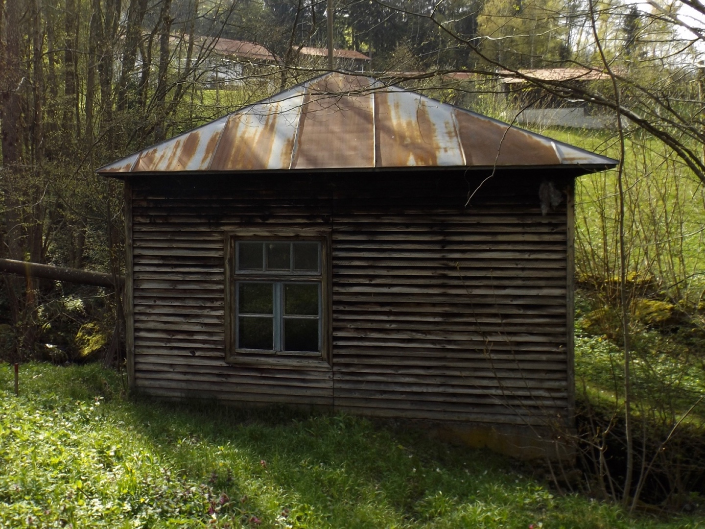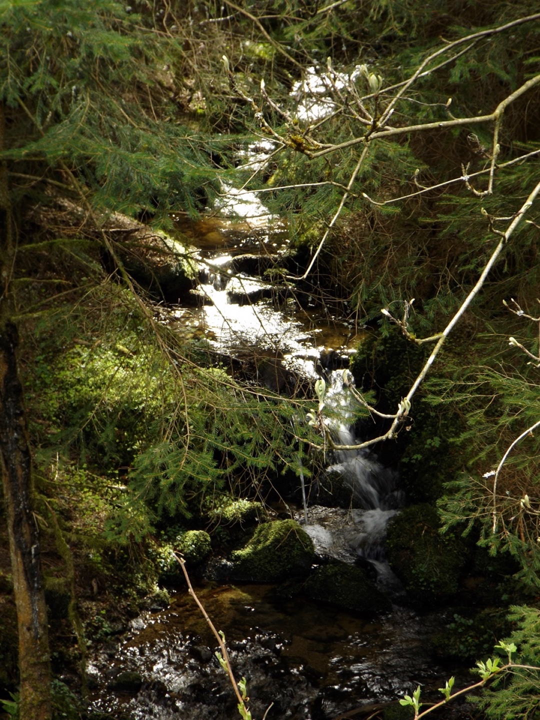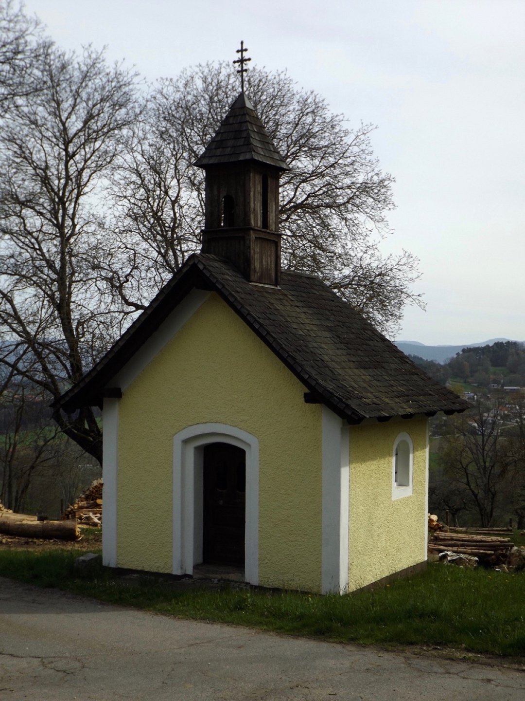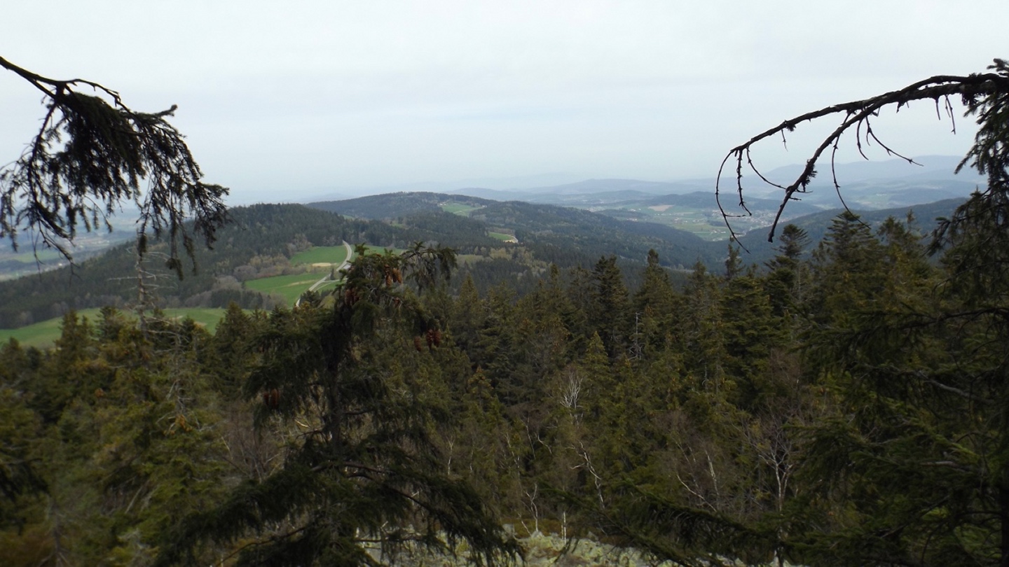 Wir vereinbarten als Treffpunkt zehn Uhr bei der Kirche in Kollnburg, als ich jedoch viel zu früh dort ankam, war Jess auch schon da, so dass wir früher als geplant lostigern konnten. Bereits auf dem Weg durch das Dorf fielen uns jede Menge Motive ins Auge, so dass wir sicher nicht zu schnell unterwegs waren. In Sedlhof fragte sie mich, warum wir nicht geradeaus auf der Fahrstraße weitergingen, sondern nach rechts ins Holz abbogen. Warum wohl? Erstens führte die Wanderwegmarkierung dort entlang, zweitens hatte ich im Gespür, dass wir bei der anderen Strecke ein paar hundert Meter auf einer Hauptstraße vor uns gehabt hätten. Außerdem führte uns der markierte Weg an der ersten Sehenswürdigkeit, dem Teufelsstein, vorbei, während wir den vielleicht 400 Meter langen Abstecher zum Kastenstein rechts liegen ließen. Dafür verließen wir oberhalb von Münchshöfen den markierten Weg, weil ich in einem Tourenbericht von der schönen Aussicht von der Käsplatte aus gelesen hatte und die mitnehmen wollte. Knapp zwei Kilometer weiter westlich stießen wir dann zuerst auf den Main-Donau-Weg und nach einer kleinen Abkürzung auf den Goldsteig. Auf diesem sollten wir eigentlich zu einem Abzweig kommen, an dem es nach rechts zur Käsplatte gehen sollte, allerdings übersahen wir beide die Stelle, an der der Goldsteig nach links von der Forststraße ins Holz verschwand und standen auf einmal am unteren Ende des Blockmeers, das sich über dem Nordhang der Käsplatte ausbreitet. Wir fanden nichts von Naturschutzgebiet und versuchten erfolgreich, über das Blockmeer zum Gipfel zu kommen. Nur mein Handtuch habe ich irgendwo dort verloren, was aber verschmerzbar ist. Am Gipfel mit Kreuz und bei guter Sicht tatsächlich feiner Aussicht Richtung Straubing gönnten wir uns eine halbe Stunde Rast, bevor wir auf dem Goldsteig nach Ahornwies und von dort über den Nordhang zum Pröller aufstiegen. Oben am Gipfel bereiteten sich gerade zwei Gleitschirmpiloten auf den Start vor, was Jess beobachten wollte, also verweilten wir auch hier fast eine halbe Stunde. Wir waren ja nicht auf der Flucht und ich konnte mich auf diese Weise ganz ohne Hektik im Gipfelbuch verewigen. Außerdem war noch ein Paar aus dem Fränkischen am Gipfel, ansonsten haben wir den ganzen Tag mit einer Ausnahme (dazu später mehr) auf dem Weg niemand angetroffen. Vom Gipfel stiegen wir auf dem Nordosthang, welcher unter Skifahrern fälschlicherweise als Pröller-Nordhang berühmt ist, hinunter zum Berggasthof Hochpröller, wo wir einkehrten, uns vom Wirt unterhalten ließen und einen kleinen Wuffi ein bisserl verwöhnten. Das Dunkle war vom Augustiner und das Schaschlik schön scharf, aber das Beste war die Reisbeilage. Definitv eine Einkehrgelegenheit, die nach Wiederholung schreit. Gut gestärkt machten wir uns auf den Rückweg nach Kollnburg, dessen wirkliche Länge am Ende ziemlich mittig zwischen meiner Schätzung von sechs und den acht Kilometern von Jess lag. An der Kreuzung des Kollnburger Pröllersteigs mit dem Baierweg und anderen Wanderwegen trafen wir die letzte Person der Tour, eine etwa 70 Jahre alte Frau mit ostdeutschem Dialekt, die von uns wissen wollte, wie sie zurück nach Sankt Englmar käme. Sie war ohne Karte und wohl auch Trinkflasche am Morgen losgezogen, auf den Pröller hinaufgestiegen und hatte dann die Orientierung verloren. Wir hoffen, dass sie trotzdem gut in ihrem Hotel angekommen ist. Wir folgten dem Baierweg und Wanderweg 21 nach Norden, zunächst ging es noch in für mich angenehmem, für Jess dank geschädigten Knien schon etwas problematischerem Gefälle hinunter nach Wieshof. Unterwegs gab es immer wieder mal kleine Highlights wie plätschernde Bäche und ein kleines Wasserkraftwerk. Nach einer letzten Rast oberhalb von Wieshof passierten wir Windsprach und die Gemeindeverbindungsstraße nach Hinterviechtach, bevor wir entgegen der Info aus dem Bayernatlas am Ortseingang von Kollnburg nicht über eine Wiese, sondern durch das Wohngebiet zurück zur Kirche geführt wurden. Dort verabschiedete sich Jess und fuhr nach Hause, während ich noch einen kurzen Abstecher auf die Burg und den Bergfried machte.