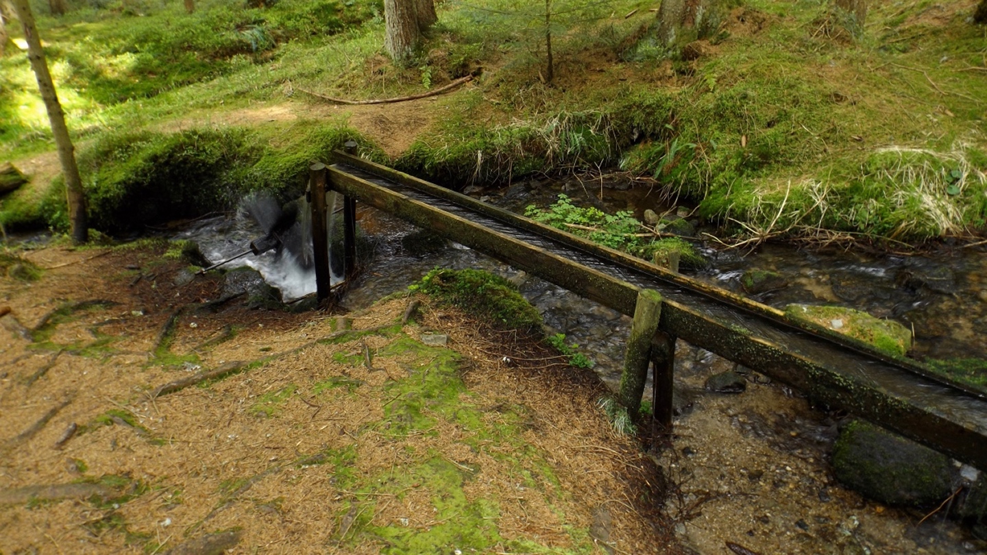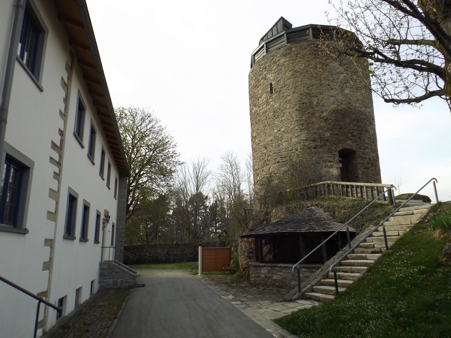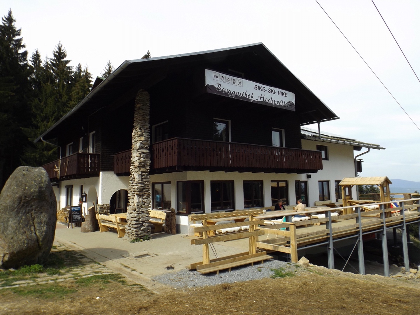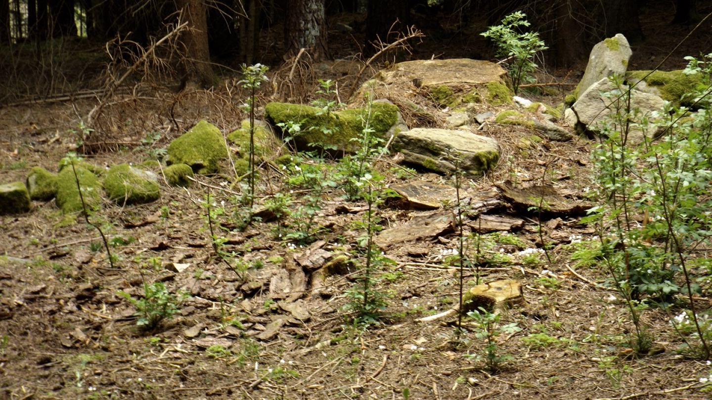 Wir vereinbarten als Treffpunkt zehn Uhr bei der Kirche in Kollnburg, als ich jedoch viel zu früh dort ankam, war Jess auch schon da, so dass wir früher als geplant lostigern konnten. Bereits auf dem Weg durch das Dorf fielen uns jede Menge Motive ins Auge, so dass wir sicher nicht zu schnell unterwegs waren. In Sedlhof fragte sie mich, warum wir nicht geradeaus auf der Fahrstraße weitergingen, sondern nach rechts ins Holz abbogen. Warum wohl? Erstens führte die Wanderwegmarkierung dort entlang, zweitens hatte ich im Gespür, dass wir bei der anderen Strecke ein paar hundert Meter auf einer Hauptstraße vor uns gehabt hätten. Außerdem führte uns der markierte Weg an der ersten Sehenswürdigkeit, dem Teufelsstein, vorbei, während wir den vielleicht 400 Meter langen Abstecher zum Kastenstein rechts liegen ließen. Dafür verließen wir oberhalb von Münchshöfen den markierten Weg, weil ich in einem Tourenbericht von der schönen Aussicht von der Käsplatte aus gelesen hatte und die mitnehmen wollte. Knapp zwei Kilometer weiter westlich stießen wir dann zuerst auf den Main-Donau-Weg und nach einer kleinen Abkürzung auf den Goldsteig. Auf diesem sollten wir eigentlich zu einem Abzweig kommen, an dem es nach rechts zur Käsplatte gehen sollte, allerdings übersahen wir beide die Stelle, an der der Goldsteig nach links von der Forststraße ins Holz verschwand und standen auf einmal am unteren Ende des Blockmeers, das sich über dem Nordhang der Käsplatte ausbreitet. Wir fanden nichts von Naturschutzgebiet und versuchten erfolgreich, über das Blockmeer zum Gipfel zu kommen. Nur mein Handtuch habe ich irgendwo dort verloren, was aber verschmerzbar ist. Am Gipfel mit Kreuz und bei guter Sicht tatsächlich feiner Aussicht Richtung Straubing gönnten wir uns eine halbe Stunde Rast, bevor wir auf dem Goldsteig nach Ahornwies und von dort über den Nordhang zum Pröller aufstiegen. Oben am Gipfel bereiteten sich gerade zwei Gleitschirmpiloten auf den Start vor, was Jess beobachten wollte, also verweilten wir auch hier fast eine halbe Stunde. Wir waren ja nicht auf der Flucht und ich konnte mich auf diese Weise ganz ohne Hektik im Gipfelbuch verewigen. Außerdem war noch ein Paar aus dem Fränkischen am Gipfel, ansonsten haben wir den ganzen Tag mit einer Ausnahme (dazu später mehr) auf dem Weg niemand angetroffen. Vom Gipfel stiegen wir auf dem Nordosthang, welcher unter Skifahrern fälschlicherweise als Pröller-Nordhang berühmt ist, hinunter zum Berggasthof Hochpröller, wo wir einkehrten, uns vom Wirt unterhalten ließen und einen kleinen Wuffi ein bisserl verwöhnten. Das Dunkle war vom Augustiner und das Schaschlik schön scharf, aber das Beste war die Reisbeilage. Definitv eine Einkehrgelegenheit, die nach Wiederholung schreit. Gut gestärkt machten wir uns auf den Rückweg nach Kollnburg, dessen wirkliche Länge am Ende ziemlich mittig zwischen meiner Schätzung von sechs und den acht Kilometern von Jess lag. An der Kreuzung des Kollnburger Pröllersteigs mit dem Baierweg und anderen Wanderwegen trafen wir die letzte Person der Tour, eine etwa 70 Jahre alte Frau mit ostdeutschem Dialekt, die von uns wissen wollte, wie sie zurück nach Sankt Englmar käme. Sie war ohne Karte und wohl auch Trinkflasche am Morgen losgezogen, auf den Pröller hinaufgestiegen und hatte dann die Orientierung verloren. Wir hoffen, dass sie trotzdem gut in ihrem Hotel angekommen ist. Wir folgten dem Baierweg und Wanderweg 21 nach Norden, zunächst ging es noch in für mich angenehmem, für Jess dank geschädigten Knien schon etwas problematischerem Gefälle hinunter nach Wieshof. Unterwegs gab es immer wieder mal kleine Highlights wie plätschernde Bäche und ein kleines Wasserkraftwerk. Nach einer letzten Rast oberhalb von Wieshof passierten wir Windsprach und die Gemeindeverbindungsstraße nach Hinterviechtach, bevor wir entgegen der Info aus dem Bayernatlas am Ortseingang von Kollnburg nicht über eine Wiese, sondern durch das Wohngebiet zurück zur Kirche geführt wurden. Dort verabschiedete sich Jess und fuhr nach Hause, während ich noch einen kurzen Abstecher auf die Burg und den Bergfried machte.
