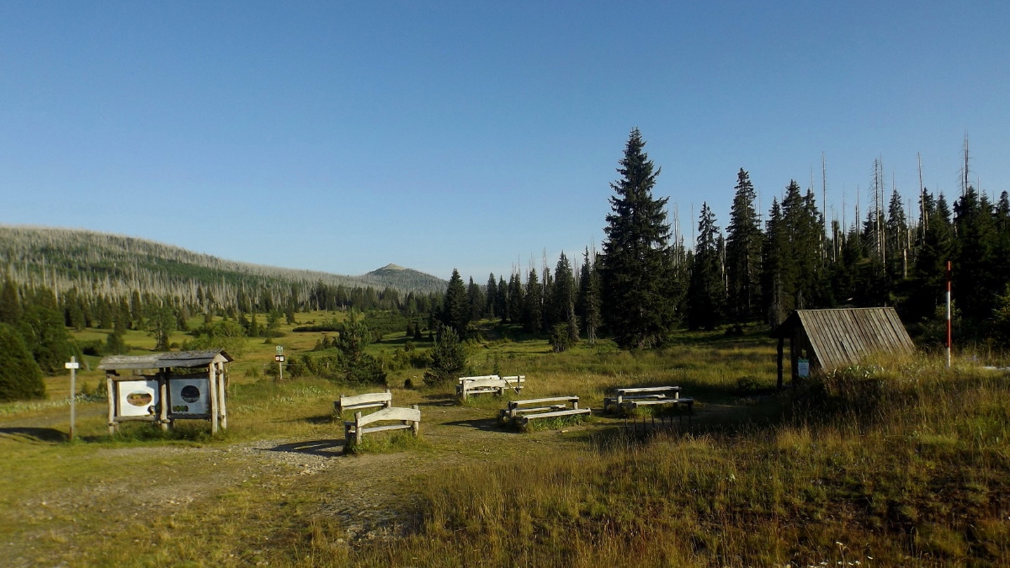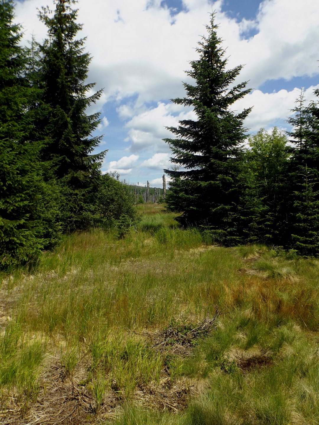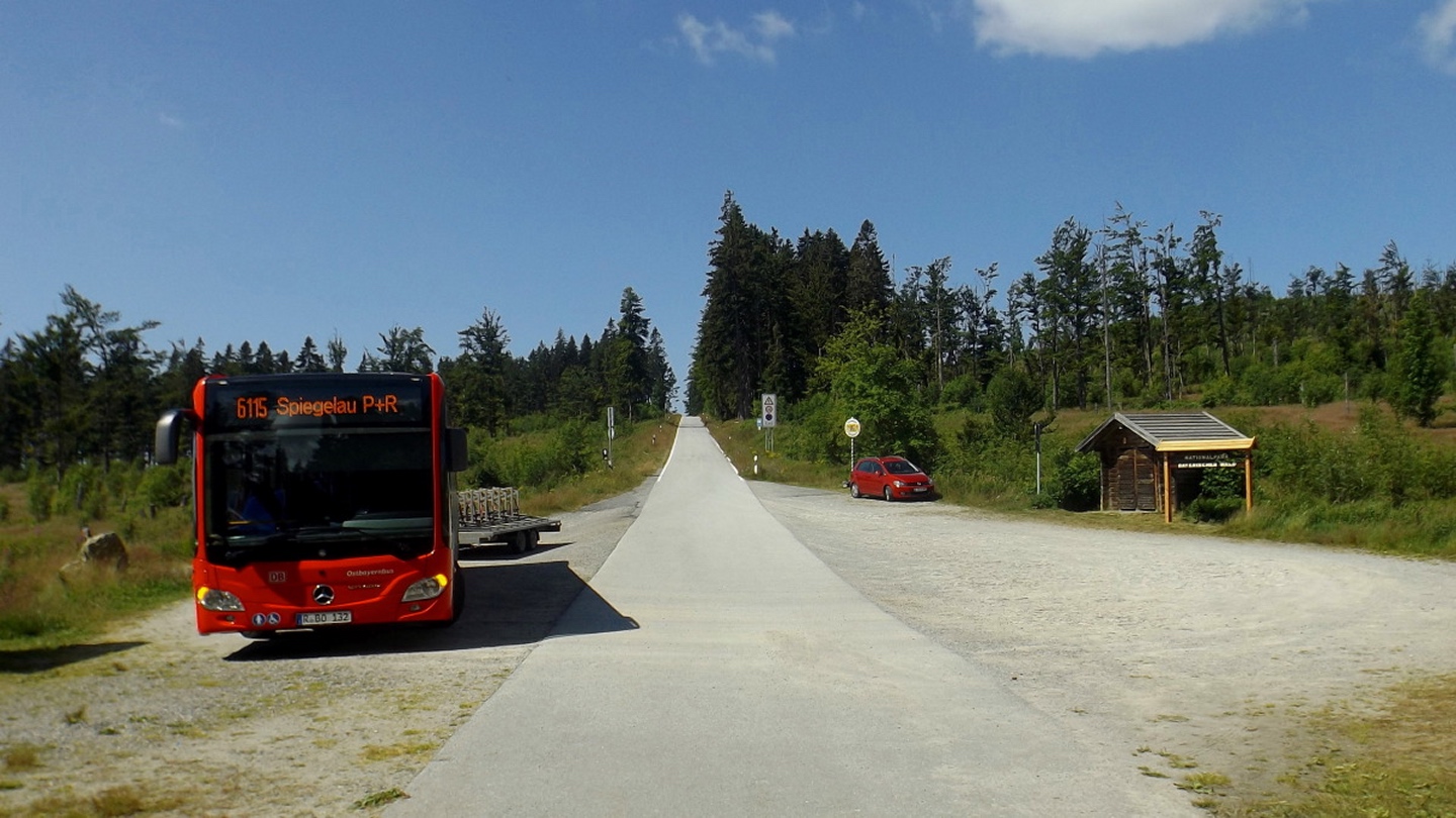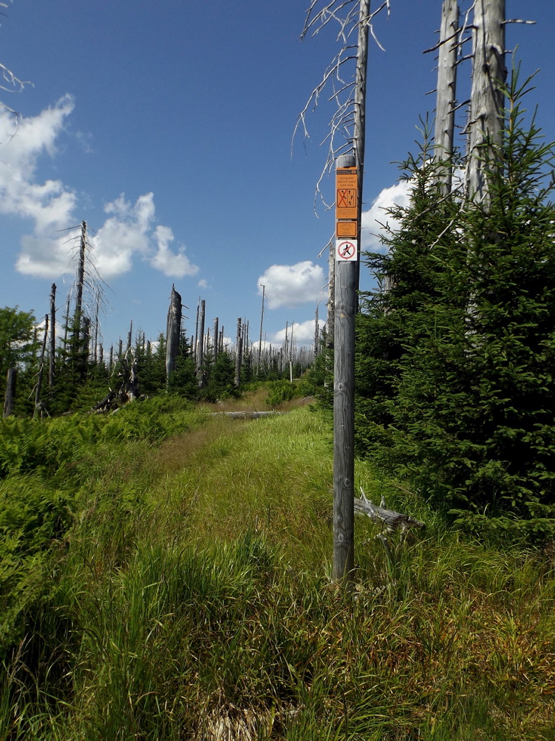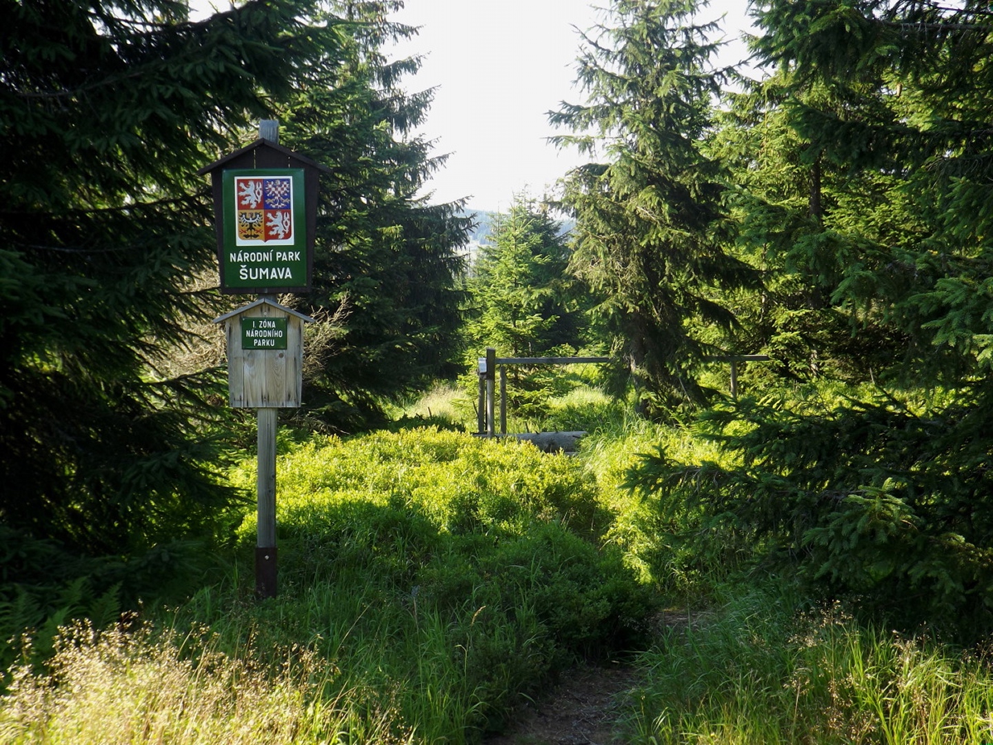 In früheren Tourenberichten dieses Jahres gab es ja öfter mal Andeutungen bezüglich einer Lusenüberschreitung. Diese war und ist nur zwischen 15. Juli und 15. November möglich, wenn (fast) alle Wege und Pfade in der Kernzone des Nationalparks sowie verschiedene besonders geschützte Wege in der I. Zoná Narodního Parku, wo es ja irgendwie noch strenger zugeht, für Wanderer geöffnet sind. Geistig und auch in meinen Äußerungen war dies meine Königstour für das Jahr 2015, noch höher eingestuft als alles, was ich in den Alpen geplant habe. Dementsprechend legte ich mich auf den ersten Schönwettertag nach dem 15. Juli als Termin fest, wobei die Temperaturen auch nicht zu hoch sein durften. Netterweise musste ich auf diesen Schönwettertag nicht lange warten, sondern konnte gleich am Tag darauf um sieben Uhr Schwandorf verlassen und nach Modrava fahren. Nach ein paar kleineren Komplikationen in Sachen Geldwechsel und Tanken in Železná Ruda wähnte ich mich trotzdem noch gut in der Zeit, bis ich kurz nach Prášily plötzlich hinter dem Bus herfuhr, in den ich in Modrava einsteigen musste. Das war zunächst unproblematisch, weil er noch mindestens zweimal vorher anhielt und ich somit vorbeikam, aber dann war noch die Baustelle zwischen Antýgl und Modrava… Auch die verleitete mich nicht zur Panik, denn der Bus war ja hinter mir, und außerdem war ich doch zehn Minuten vor der fahrplanmäßigen Abfahrt auf dem gebührenpflichtigen Parkplatz in Modrava. In Ruhe 70 Kronen in den Ticketautomaten geworfen (gut, dass ich zumindest auf zehn Euro Kronen herausbekam), die Schuhe gewechselt, Stöcke am Rucksack befestigt und Richtung Bushaltestelle losmarschiert, sah ich gerade den Bus losfahren. Netterweise reagierte der Fahrer auf mein Winken und ließ mich einsteigen, sonst wäre der gesamte Plan für heute erledigt gewesen. In Kvilda dauerte das Umsteigen wesentlich länger als geplant, weil etwa 100 Leute nach Bučina mitfahren wollten, aber das spielte keine Rolle mehr, weil das Lusenschutzhaus bis 18 Uhr geöffnet hat und dass Auto in Modrava auch nicht ohne mich wegfährt. Blöd war nur, dass ich da merkte, dass die in Železná Ruda gekaufte zweite Wasserflasche in eben diesem Auto liegengeblieben war. Aber auch das ließ mich relativ kalt, ich verließ um 10.45 Uhr an der Endhaltestelle 100 Meter vor der Grenze den Bus und machte mich erst einmal auf den Weg hinüber nach Bayern.