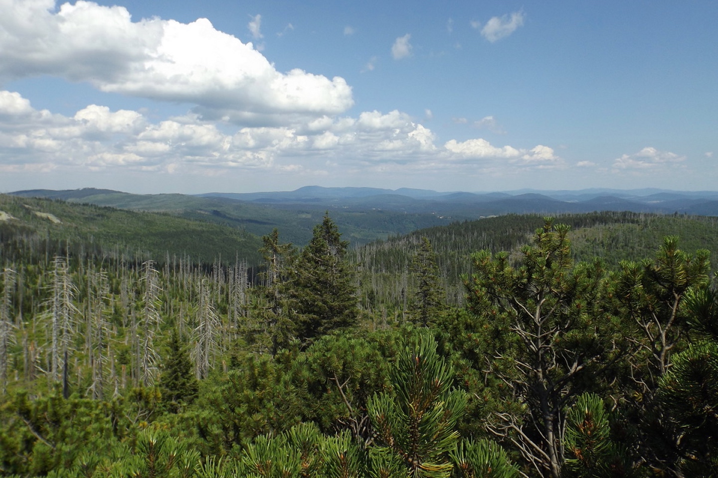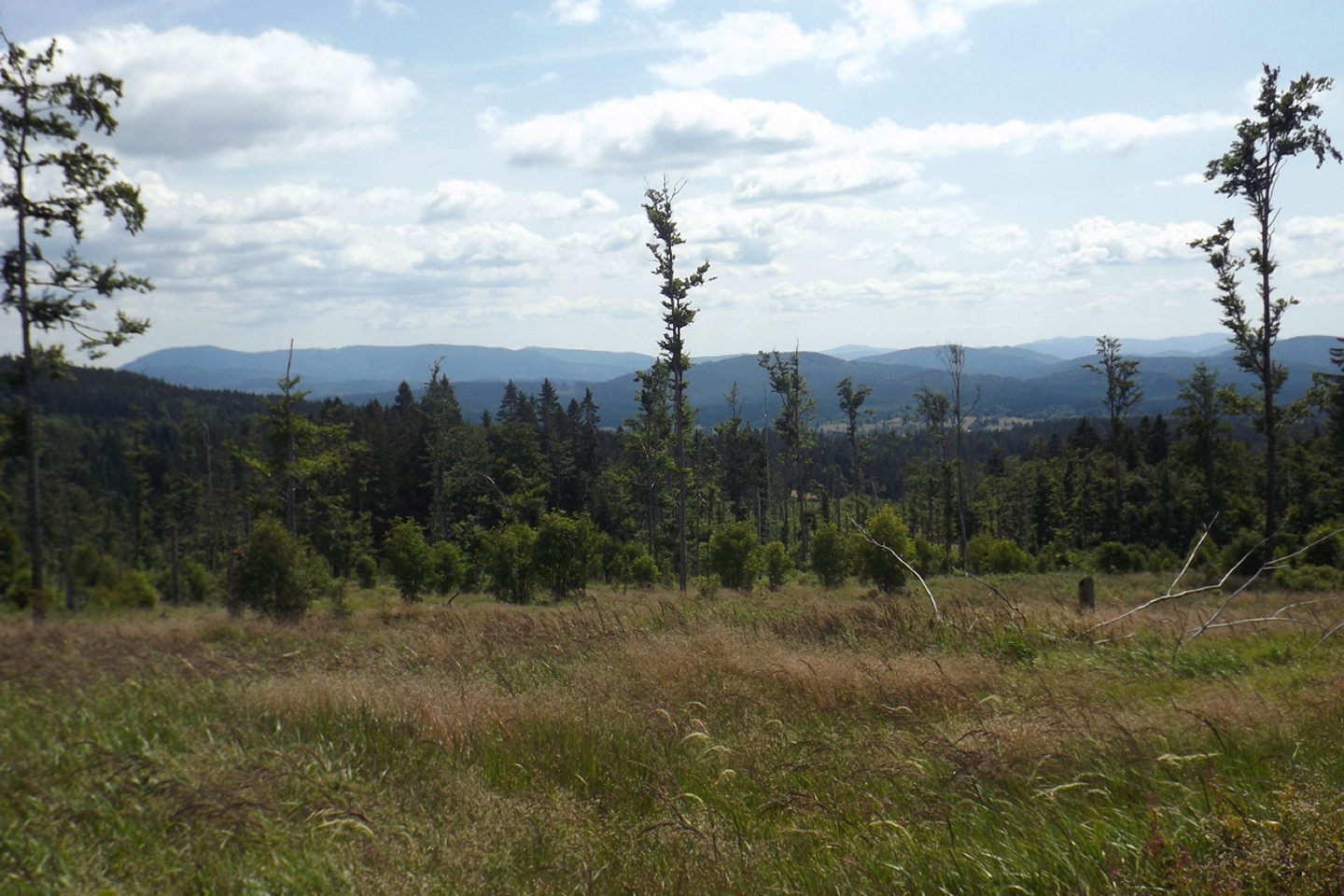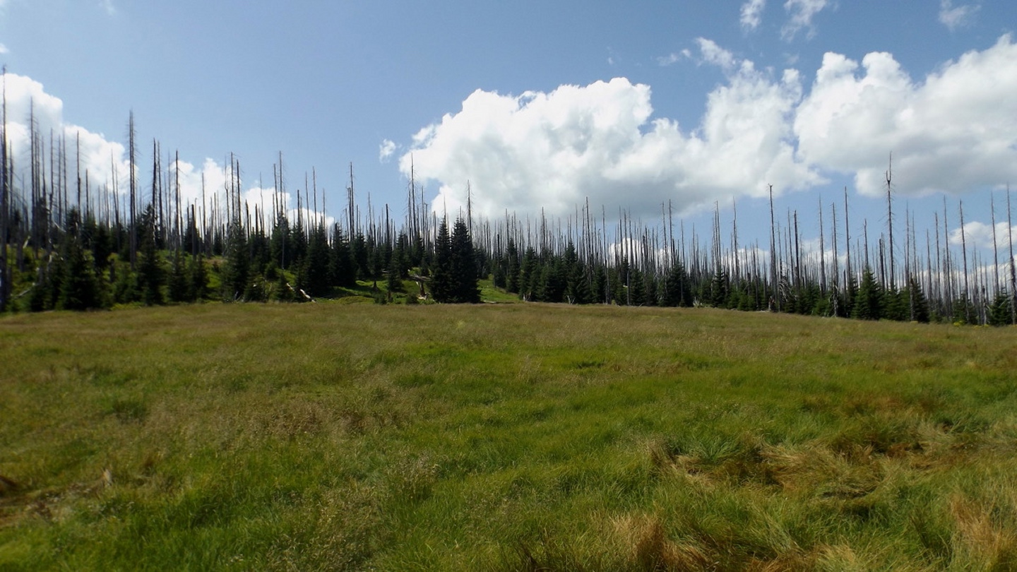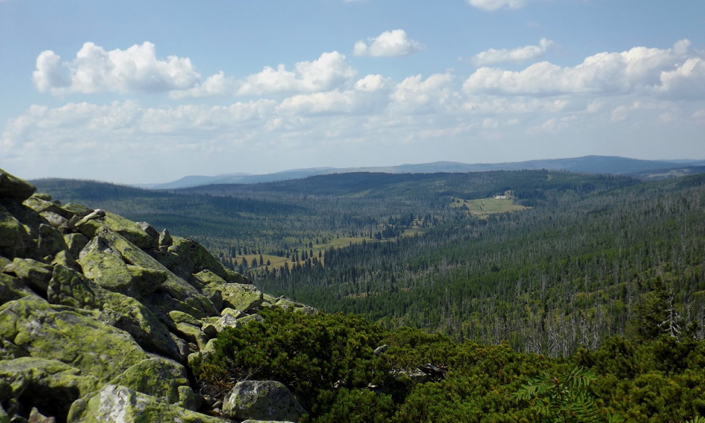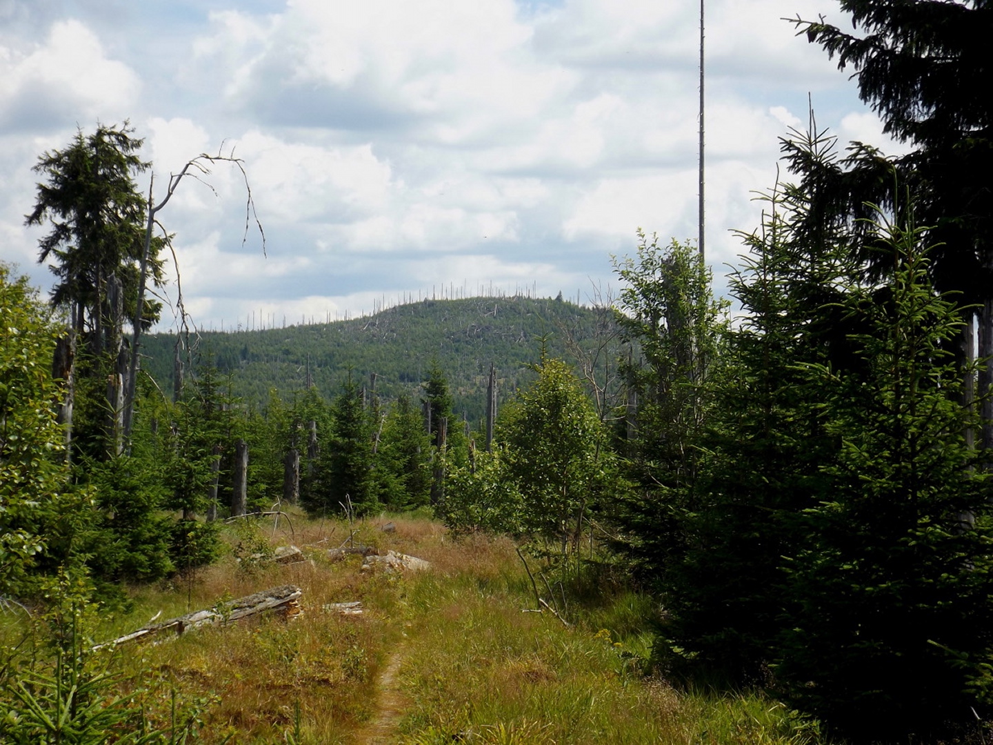In früheren Tourenberichten dieses Jahres gab es ja öfter mal Andeutungen bezüglich einer Lusenüberschreitung. Diese war und ist nur zwischen 15. Juli und 15. November möglich, wenn (fast) alle Wege und Pfade in der Kernzone des Nationalparks sowie verschiedene besonders geschützte Wege in der I. Zoná Narodního Parku, wo es ja irgendwie noch strenger zugeht, für Wanderer geöffnet sind. Geistig und auch in meinen Äußerungen war dies meine Königstour für das Jahr 2015, noch höher eingestuft als alles, was ich in den Alpen geplant habe. Dementsprechend legte ich mich auf den ersten Schönwettertag nach dem 15. Juli als Termin fest, wobei die Temperaturen auch nicht zu hoch sein durften. Netterweise musste ich auf diesen Schönwettertag nicht lange warten, sondern konnte gleich am Tag darauf um sieben Uhr Schwandorf verlassen und nach Modrava fahren. Nach ein paar kleineren Komplikationen in Sachen Geldwechsel und Tanken in Železná Ruda wähnte ich mich trotzdem noch gut in der Zeit, bis ich kurz nach Prášily plötzlich hinter dem Bus herfuhr, in den ich in Modrava einsteigen musste. Das war zunächst unproblematisch, weil er noch mindestens zweimal vorher anhielt und ich somit vorbeikam, aber dann war noch die Baustelle zwischen Antýgl und Modrava… Auch die verleitete mich nicht zur Panik, denn der Bus war ja hinter mir, und außerdem war ich doch zehn Minuten vor der fahrplanmäßigen Abfahrt auf dem gebührenpflichtigen Parkplatz in Modrava. In Ruhe 70 Kronen in den Ticketautomaten geworfen (gut, dass ich zumindest auf zehn Euro Kronen herausbekam), die Schuhe gewechselt, Stöcke am Rucksack befestigt und Richtung Bushaltestelle losmarschiert, sah ich gerade den Bus losfahren. Netterweise reagierte der Fahrer auf mein Winken und ließ mich einsteigen, sonst wäre der gesamte Plan für heute erledigt gewesen. In Kvilda dauerte das Umsteigen wesentlich länger als geplant, weil etwa 100 Leute nach Bučina mitfahren wollten, aber das spielte keine Rolle mehr, weil das Lusenschutzhaus bis 18 Uhr geöffnet hat und dass Auto in Modrava auch nicht ohne mich wegfährt. Blöd war nur, dass ich da merkte, dass die in Železná Ruda gekaufte zweite Wasserflasche in eben diesem Auto liegengeblieben war. Aber auch das ließ mich relativ kalt, ich verließ um 10.45 Uhr an der Endhaltestelle 100 Meter vor der Grenze den Bus und machte mich erst einmal auf den Weg hinüber nach Bayern.