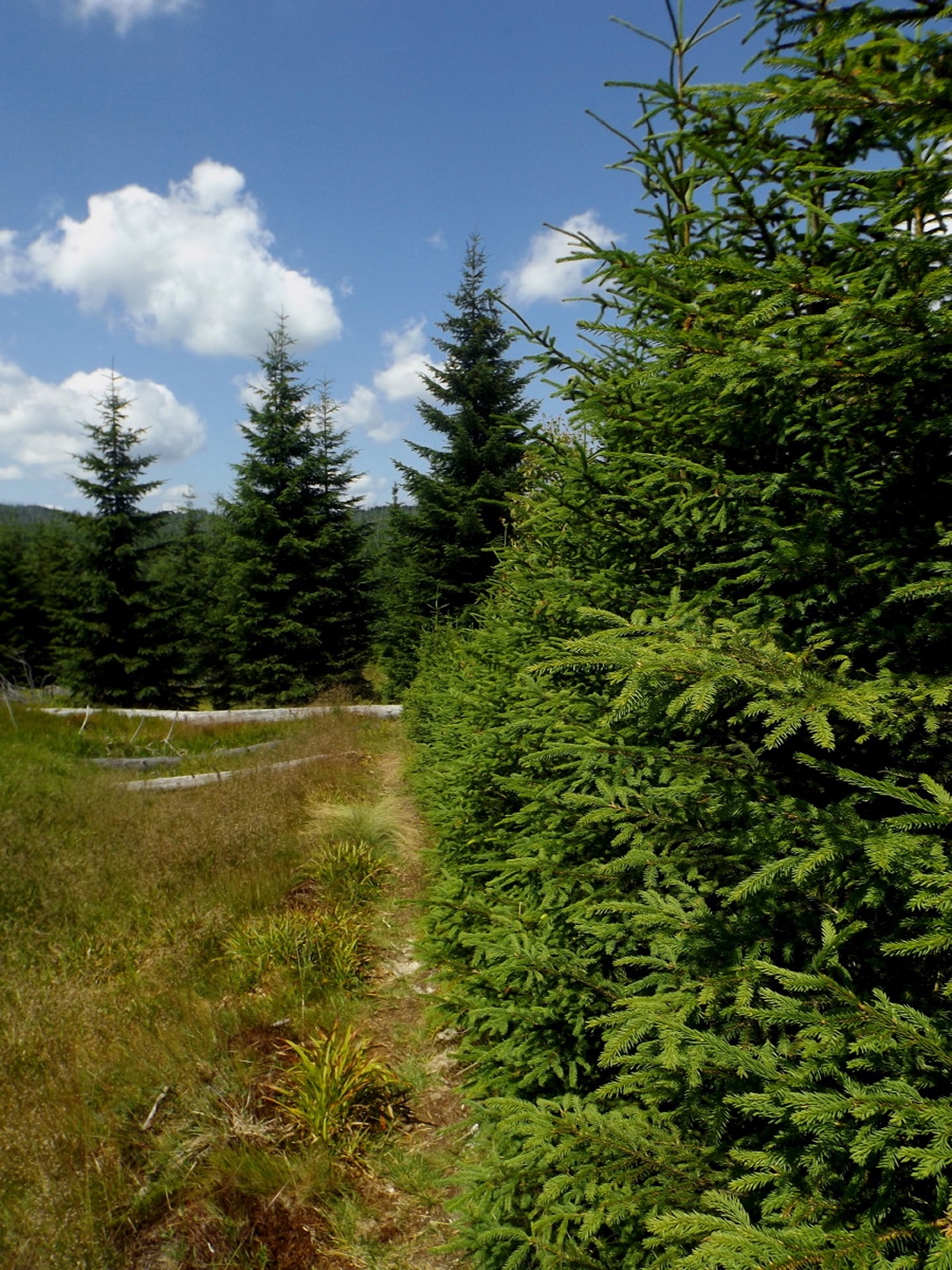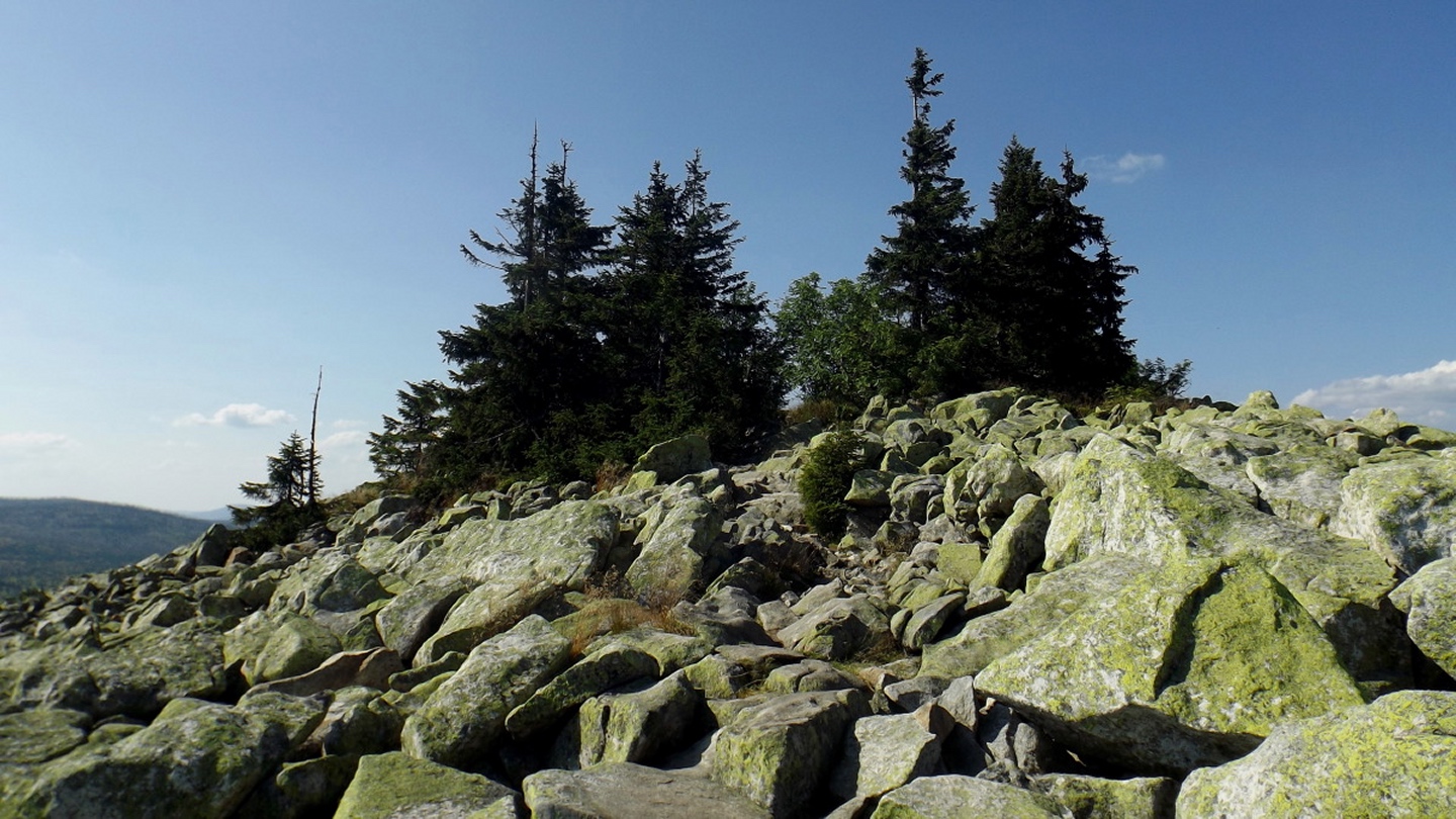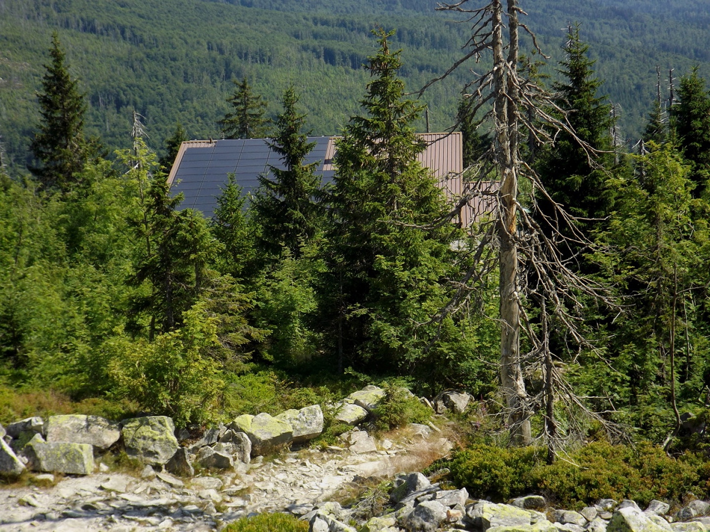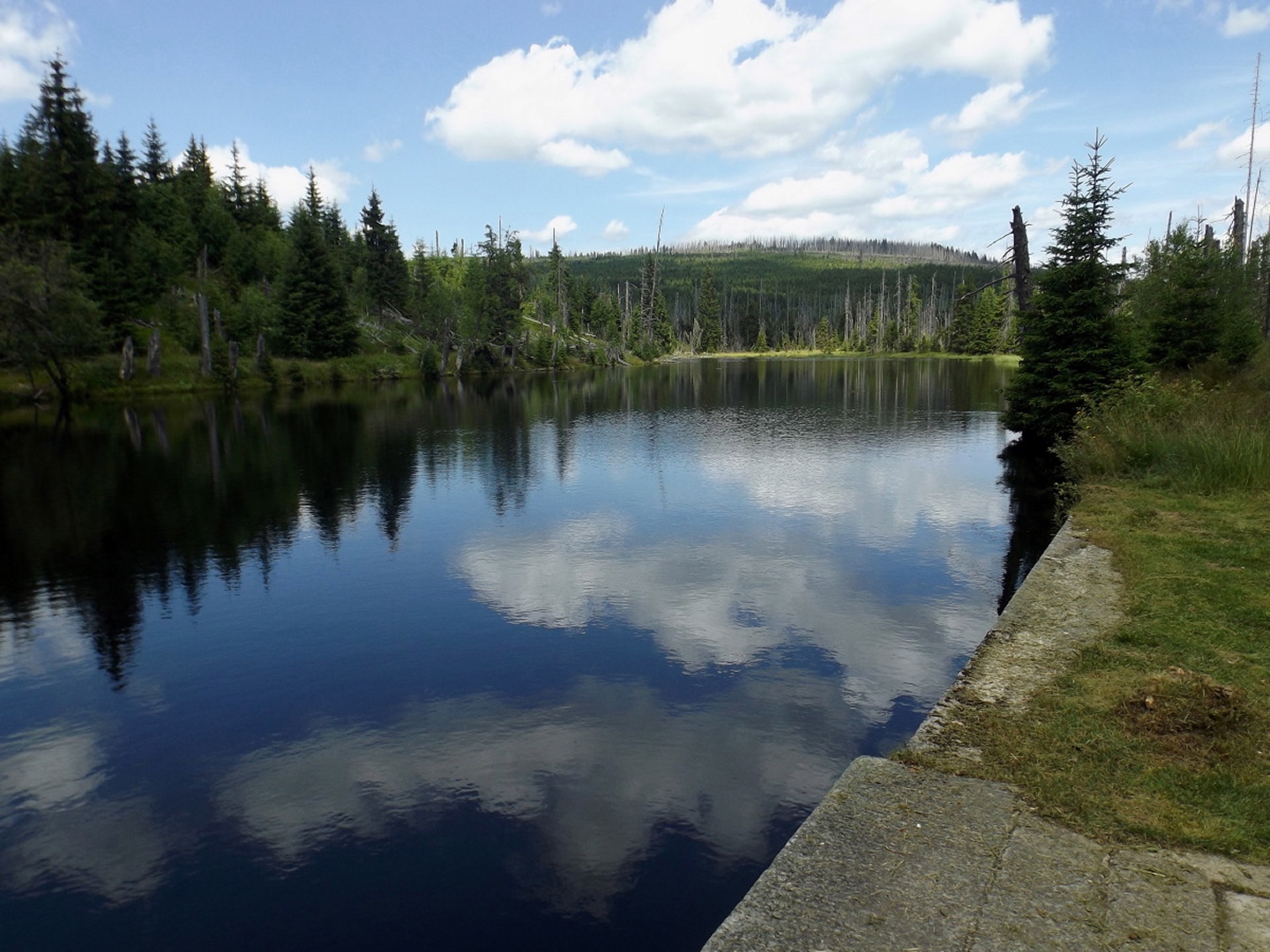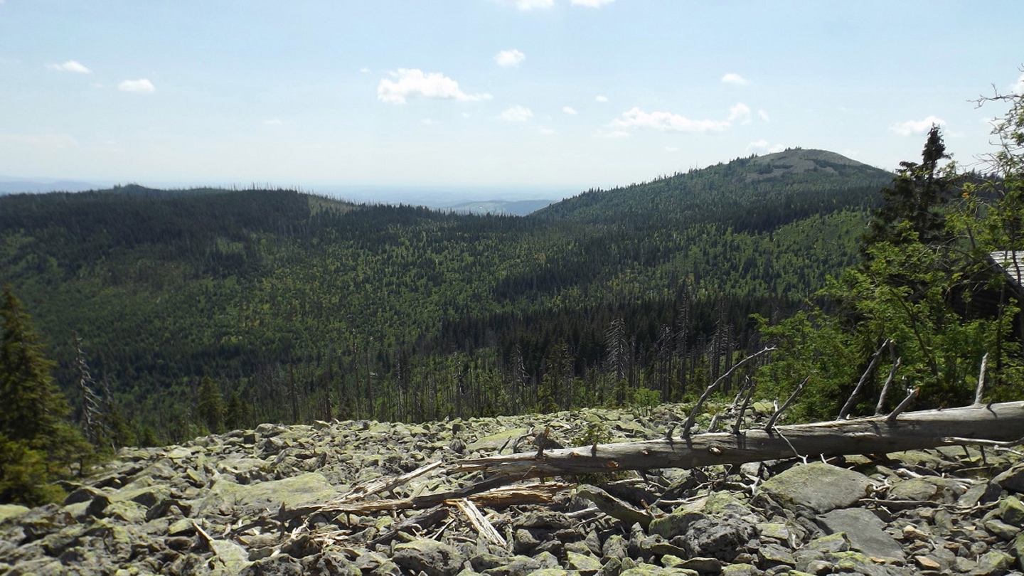 In früheren Tourenberichten dieses Jahres gab es ja öfter mal Andeutungen bezüglich einer Lusenüberschreitung. Diese war und ist nur zwischen 15. Juli und 15. November möglich, wenn (fast) alle Wege und Pfade in der Kernzone des Nationalparks sowie verschiedene besonders geschützte Wege in der I. Zoná Narodního Parku, wo es ja irgendwie noch strenger zugeht, für Wanderer geöffnet sind. Geistig und auch in meinen Äußerungen war dies meine Königstour für das Jahr 2015, noch höher eingestuft als alles, was ich in den Alpen geplant habe. Dementsprechend legte ich mich auf den ersten Schönwettertag nach dem 15. Juli als Termin fest, wobei die Temperaturen auch nicht zu hoch sein durften. Netterweise musste ich auf diesen Schönwettertag nicht lange warten, sondern konnte gleich am Tag darauf um sieben Uhr Schwandorf verlassen und nach Modrava fahren. Nach ein paar kleineren Komplikationen in Sachen Geldwechsel und Tanken in Železná Ruda wähnte ich mich trotzdem noch gut in der Zeit, bis ich kurz nach Prášily plötzlich hinter dem Bus herfuhr, in den ich in Modrava einsteigen musste. Das war zunächst unproblematisch, weil er noch mindestens zweimal vorher anhielt und ich somit vorbeikam, aber dann war noch die Baustelle zwischen Antýgl und Modrava… Auch die verleitete mich nicht zur Panik, denn der Bus war ja hinter mir, und außerdem war ich doch zehn Minuten vor der fahrplanmäßigen Abfahrt auf dem gebührenpflichtigen Parkplatz in Modrava. In Ruhe 70 Kronen in den Ticketautomaten geworfen (gut, dass ich zumindest auf zehn Euro Kronen herausbekam), die Schuhe gewechselt, Stöcke am Rucksack befestigt und Richtung Bushaltestelle losmarschiert, sah ich gerade den Bus losfahren. Netterweise reagierte der Fahrer auf mein Winken und ließ mich einsteigen, sonst wäre der gesamte Plan für heute erledigt gewesen. In Kvilda dauerte das Umsteigen wesentlich länger als geplant, weil etwa 100 Leute nach Bučina mitfahren wollten, aber das spielte keine Rolle mehr, weil das Lusenschutzhaus bis 18 Uhr geöffnet hat und dass Auto in Modrava auch nicht ohne mich wegfährt. Blöd war nur, dass ich da merkte, dass die in Železná Ruda gekaufte zweite Wasserflasche in eben diesem Auto liegengeblieben war. Aber auch das ließ mich relativ kalt, ich verließ um 10.45 Uhr an der Endhaltestelle 100 Meter vor der Grenze den Bus und machte mich erst einmal auf den Weg hinüber nach Bayern.