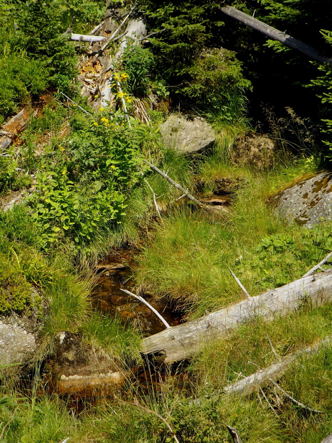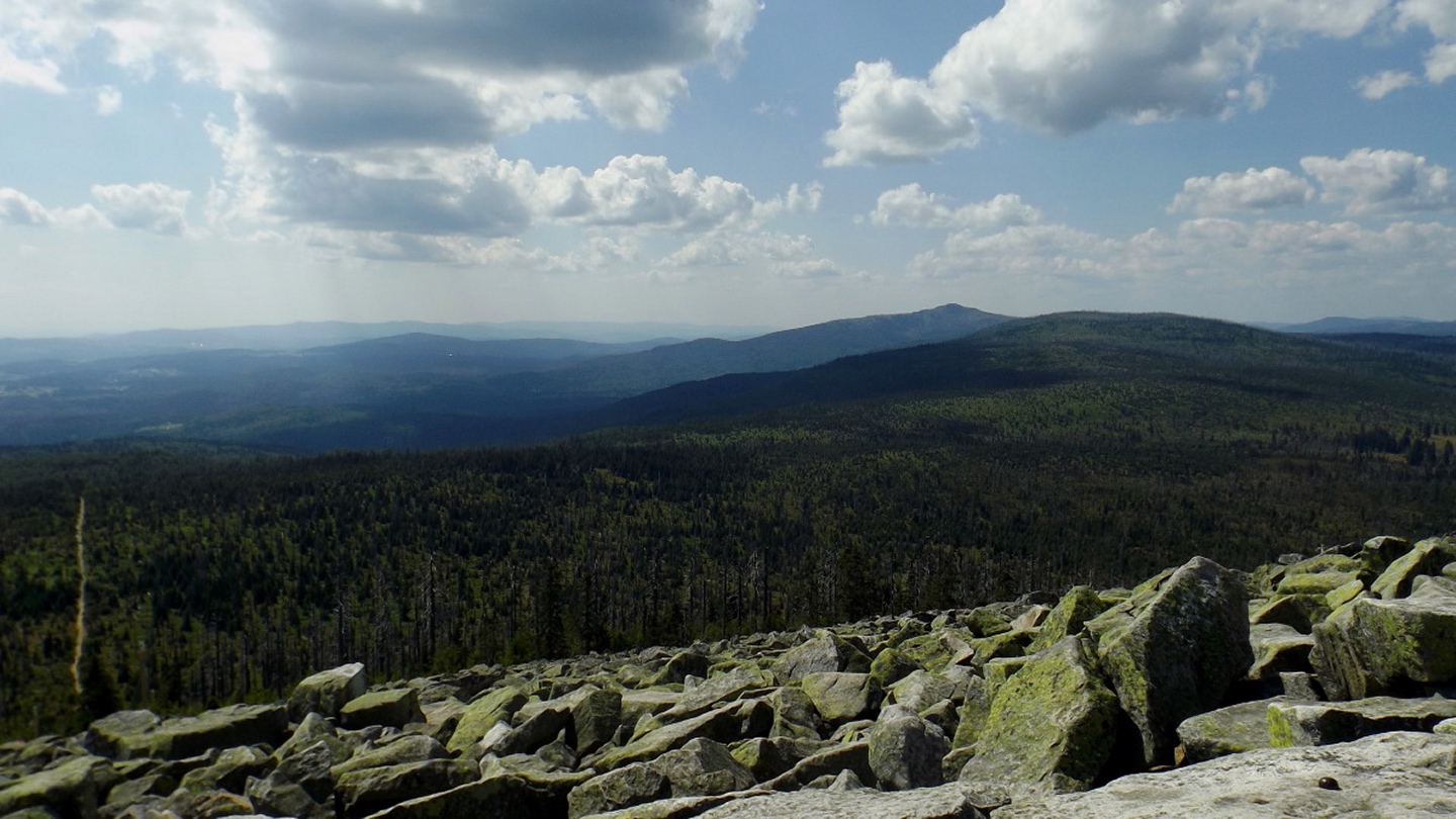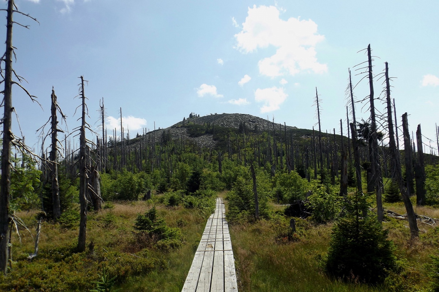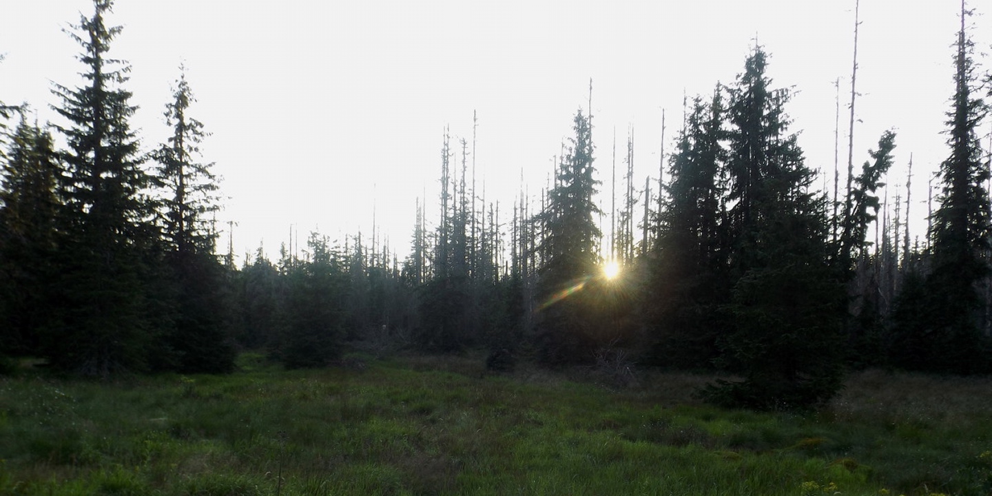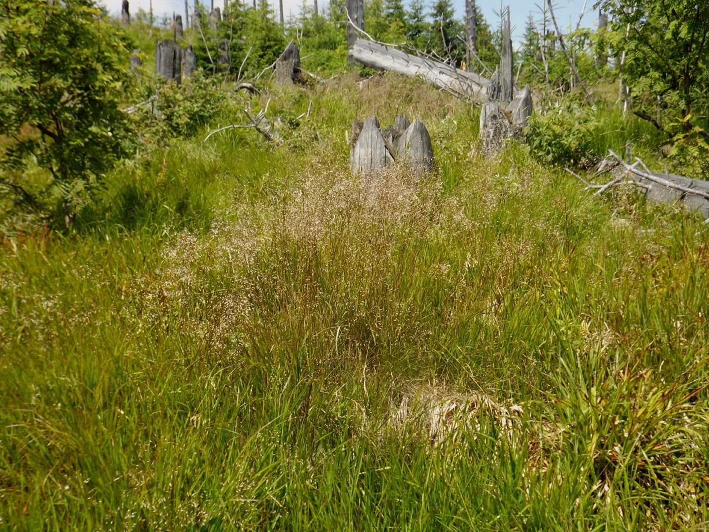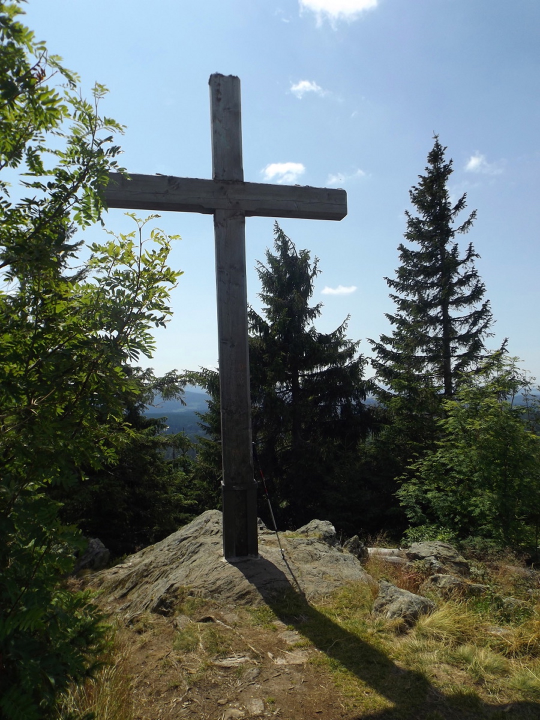 In früheren Tourenberichten dieses Jahres gab es ja öfter mal Andeutungen bezüglich einer Lusenüberschreitung. Diese war und ist nur zwischen 15. Juli und 15. November möglich, wenn (fast) alle Wege und Pfade in der Kernzone des Nationalparks sowie verschiedene besonders geschützte Wege in der I. Zoná Narodního Parku, wo es ja irgendwie noch strenger zugeht, für Wanderer geöffnet sind. Geistig und auch in meinen Äußerungen war dies meine Königstour für das Jahr 2015, noch höher eingestuft als alles, was ich in den Alpen geplant habe. Dementsprechend legte ich mich auf den ersten Schönwettertag nach dem 15. Juli als Termin fest, wobei die Temperaturen auch nicht zu hoch sein durften. Netterweise musste ich auf diesen Schönwettertag nicht lange warten, sondern konnte gleich am Tag darauf um sieben Uhr Schwandorf verlassen und nach Modrava fahren. Nach ein paar kleineren Komplikationen in Sachen Geldwechsel und Tanken in Železná Ruda wähnte ich mich trotzdem noch gut in der Zeit, bis ich kurz nach Prášily plötzlich hinter dem Bus herfuhr, in den ich in Modrava einsteigen musste. Das war zunächst unproblematisch, weil er noch mindestens zweimal vorher anhielt und ich somit vorbeikam, aber dann war noch die Baustelle zwischen Antýgl und Modrava… Auch die verleitete mich nicht zur Panik, denn der Bus war ja hinter mir, und außerdem war ich doch zehn Minuten vor der fahrplanmäßigen Abfahrt auf dem gebührenpflichtigen Parkplatz in Modrava. In Ruhe 70 Kronen in den Ticketautomaten geworfen (gut, dass ich zumindest auf zehn Euro Kronen herausbekam), die Schuhe gewechselt, Stöcke am Rucksack befestigt und Richtung Bushaltestelle losmarschiert, sah ich gerade den Bus losfahren. Netterweise reagierte der Fahrer auf mein Winken und ließ mich einsteigen, sonst wäre der gesamte Plan für heute erledigt gewesen. In Kvilda dauerte das Umsteigen wesentlich länger als geplant, weil etwa 100 Leute nach Bučina mitfahren wollten, aber das spielte keine Rolle mehr, weil das Lusenschutzhaus bis 18 Uhr geöffnet hat und dass Auto in Modrava auch nicht ohne mich wegfährt. Blöd war nur, dass ich da merkte, dass die in Železná Ruda gekaufte zweite Wasserflasche in eben diesem Auto liegengeblieben war. Aber auch das ließ mich relativ kalt, ich verließ um 10.45 Uhr an der Endhaltestelle 100 Meter vor der Grenze den Bus und machte mich erst einmal auf den Weg hinüber nach Bayern.