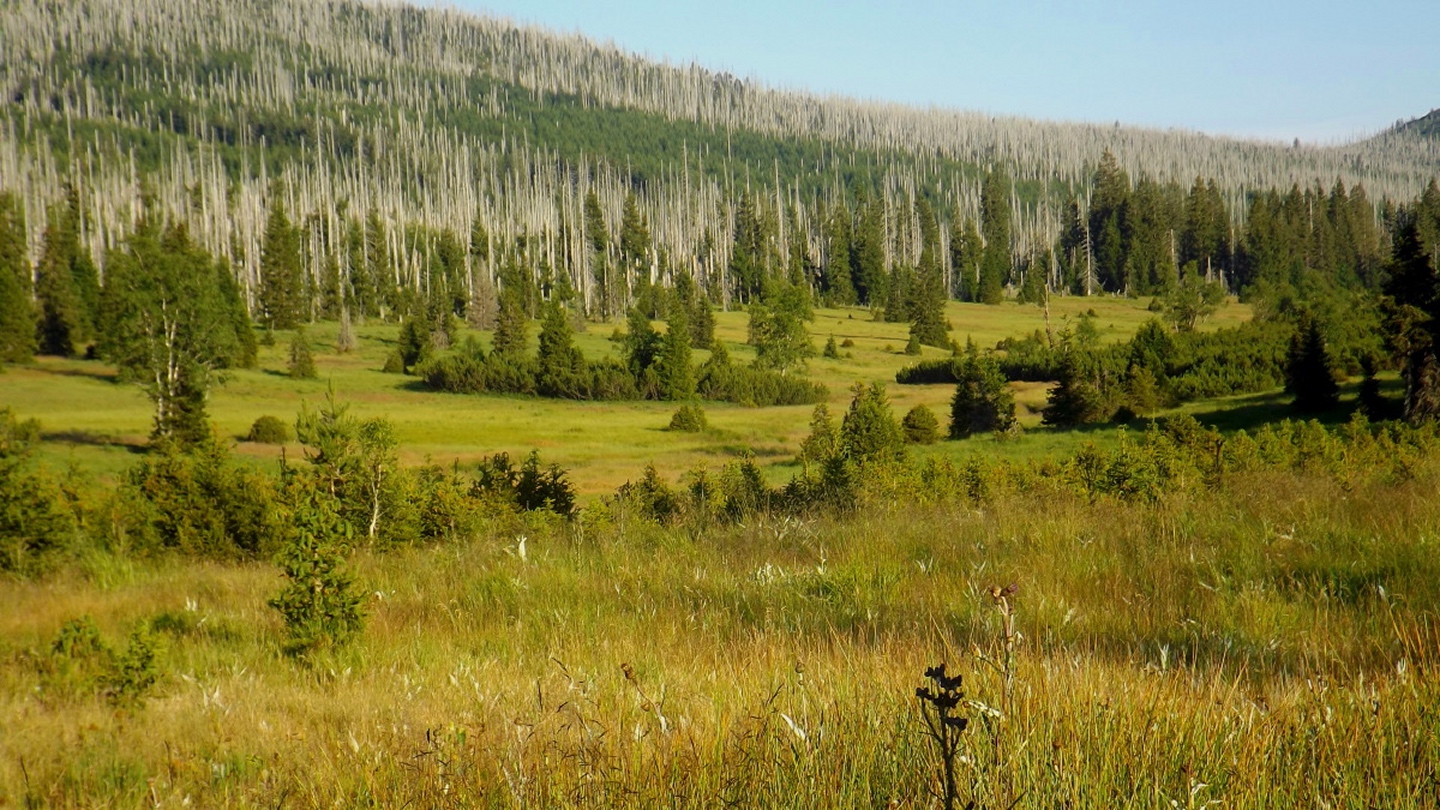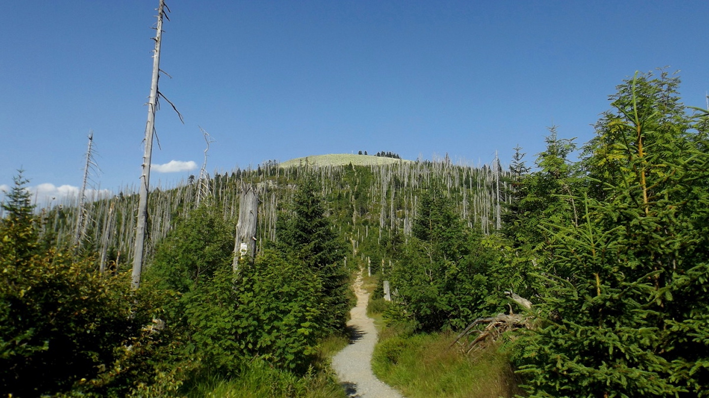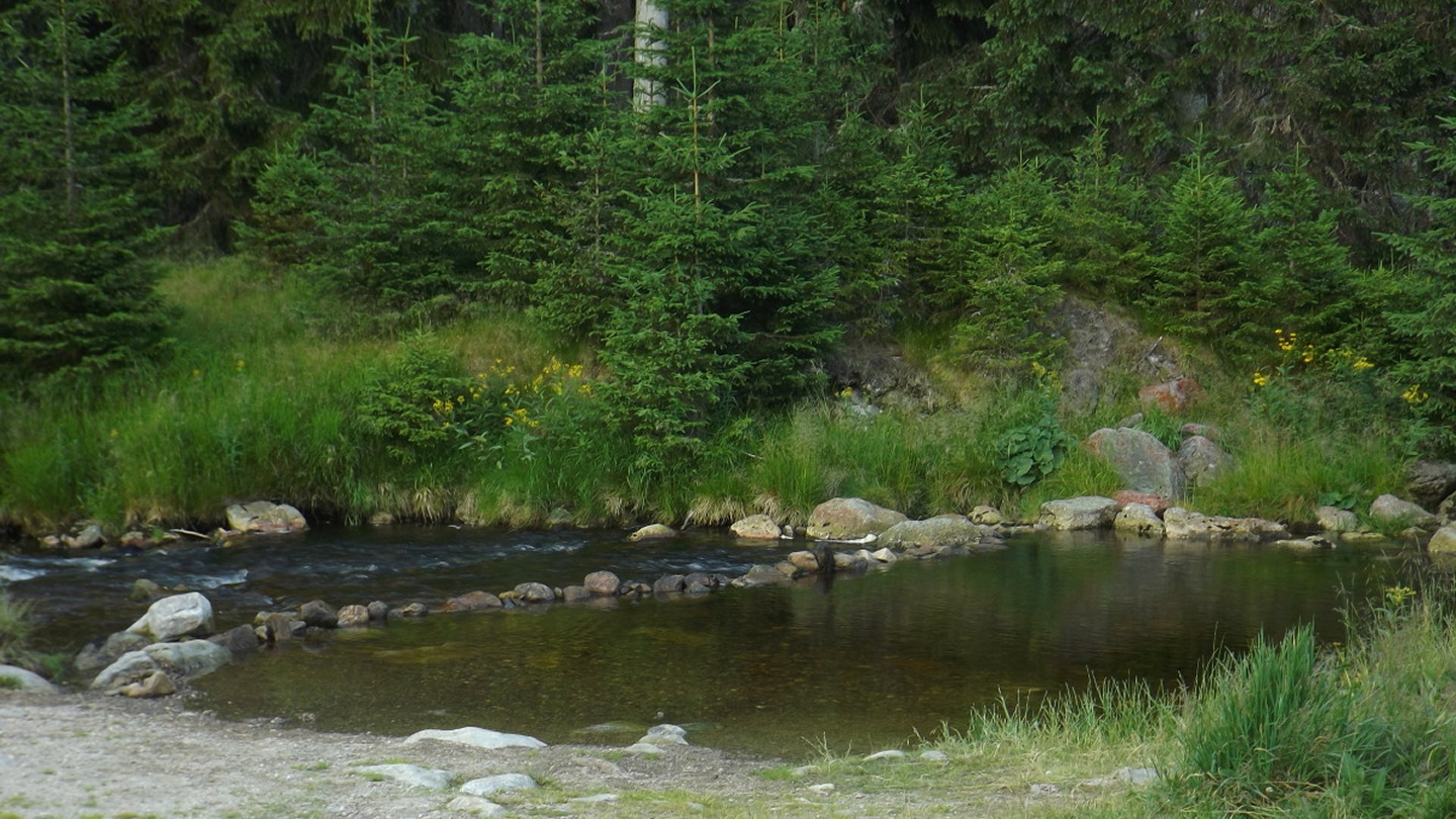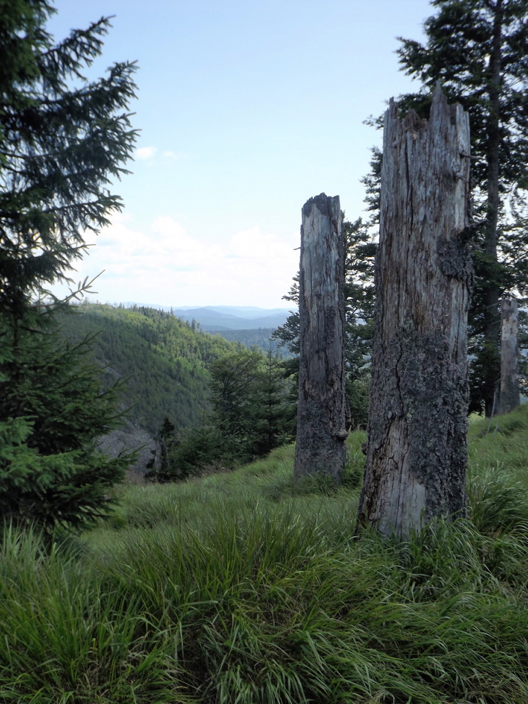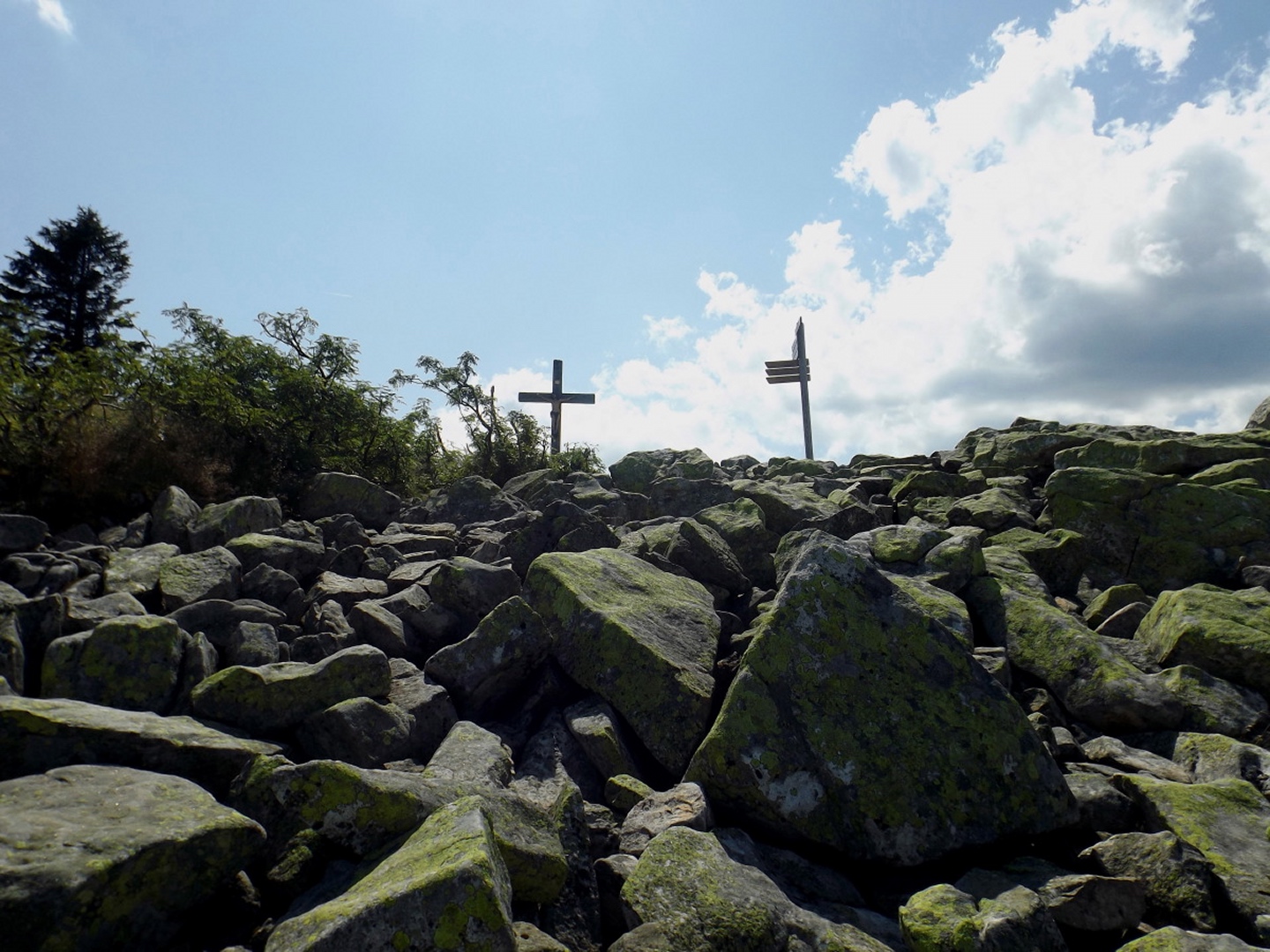 In früheren Tourenberichten dieses Jahres gab es ja öfter mal Andeutungen bezüglich einer Lusenüberschreitung. Diese war und ist nur zwischen 15. Juli und 15. November möglich, wenn (fast) alle Wege und Pfade in der Kernzone des Nationalparks sowie verschiedene besonders geschützte Wege in der I. Zoná Narodního Parku, wo es ja irgendwie noch strenger zugeht, für Wanderer geöffnet sind. Geistig und auch in meinen Äußerungen war dies meine Königstour für das Jahr 2015, noch höher eingestuft als alles, was ich in den Alpen geplant habe. Dementsprechend legte ich mich auf den ersten Schönwettertag nach dem 15. Juli als Termin fest, wobei die Temperaturen auch nicht zu hoch sein durften. Netterweise musste ich auf diesen Schönwettertag nicht lange warten, sondern konnte gleich am Tag darauf um sieben Uhr Schwandorf verlassen und nach Modrava fahren. Nach ein paar kleineren Komplikationen in Sachen Geldwechsel und Tanken in Železná Ruda wähnte ich mich trotzdem noch gut in der Zeit, bis ich kurz nach Prášily plötzlich hinter dem Bus herfuhr, in den ich in Modrava einsteigen musste. Das war zunächst unproblematisch, weil er noch mindestens zweimal vorher anhielt und ich somit vorbeikam, aber dann war noch die Baustelle zwischen Antýgl und Modrava… Auch die verleitete mich nicht zur Panik, denn der Bus war ja hinter mir, und außerdem war ich doch zehn Minuten vor der fahrplanmäßigen Abfahrt auf dem gebührenpflichtigen Parkplatz in Modrava. In Ruhe 70 Kronen in den Ticketautomaten geworfen (gut, dass ich zumindest auf zehn Euro Kronen herausbekam), die Schuhe gewechselt, Stöcke am Rucksack befestigt und Richtung Bushaltestelle losmarschiert, sah ich gerade den Bus losfahren. Netterweise reagierte der Fahrer auf mein Winken und ließ mich einsteigen, sonst wäre der gesamte Plan für heute erledigt gewesen. In Kvilda dauerte das Umsteigen wesentlich länger als geplant, weil etwa 100 Leute nach Bučina mitfahren wollten, aber das spielte keine Rolle mehr, weil das Lusenschutzhaus bis 18 Uhr geöffnet hat und dass Auto in Modrava auch nicht ohne mich wegfährt. Blöd war nur, dass ich da merkte, dass die in Železná Ruda gekaufte zweite Wasserflasche in eben diesem Auto liegengeblieben war. Aber auch das ließ mich relativ kalt, ich verließ um 10.45 Uhr an der Endhaltestelle 100 Meter vor der Grenze den Bus und machte mich erst einmal auf den Weg hinüber nach Bayern.