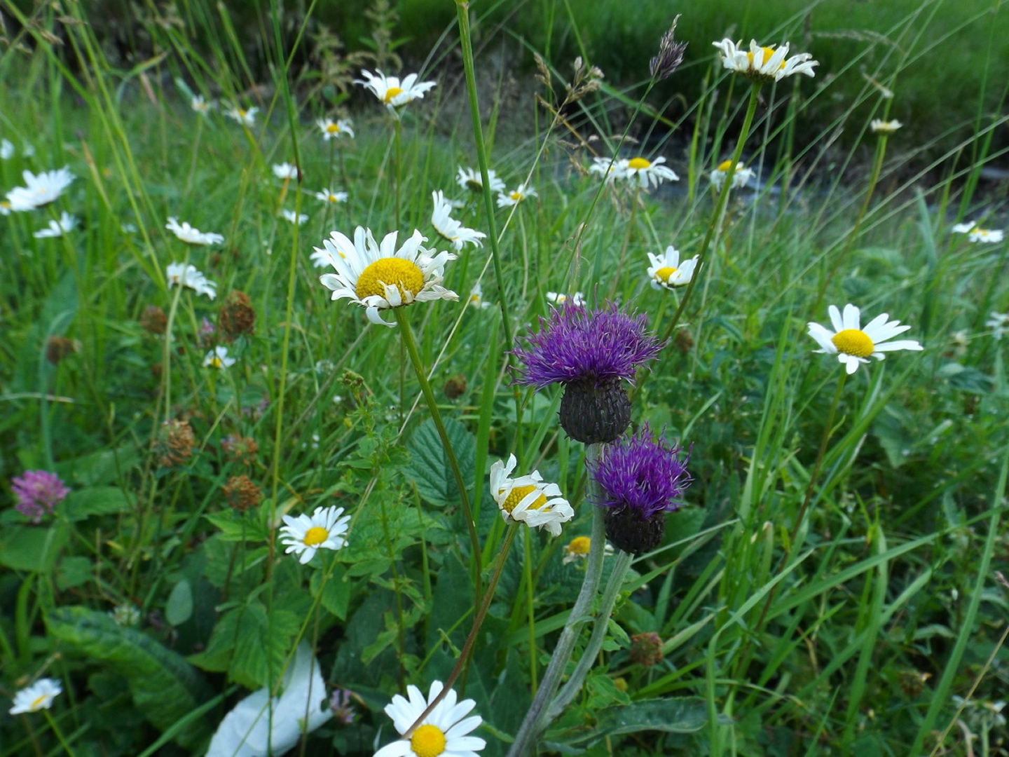 Dort empfing mich gleich einmal der Igelbus, der auf Wanderer wartete, die nach Mauth oder Finsterau zurückwollten. Da ich keines dieser beiden Ziele hatte, ließ ich ihn links stehen und bog nach knapp 100 Metern auf der Staatsstraße nach rechts ab zum Siebensteinkopf. Dieser Weg ist markiert, also wetterabhängig ganzjährig begehbar, und sehr gut gepflegt. Oben auf dem ersten Gipfel des Tages, den ich nach gerade mal 40 Minuten erreichte, traf ich auf eine Seniorengruppe aus Deggendorf, die schon etwas früher losgegangen war und ihre Runde in eine Richtung fortsetzen wollte, die ich auch noch im Kopf habe, aber sicher erst nächstes Jahr. Seit dem Frühstück waren schon ein paar Minuten vergangen, also gab es nicht nur ein Apfelvierteli, sondern die erste Hälfte meines Wurstbrotes. Der Weiterweg zur Reschbachklause ist genauso gut gepflegt wie der Aufstieg zum Siebensteinkopf und führt kurz mal am Grenzsteig entlang. An der Stelle, an der dieser verlassen wird, steht bereits das Hinweisschild, dass der Grenzsteig zwei Kilometer weiter ganzjährig gesperrt ist, ich vermute mal, dass das die Stelle ist, an der der Steig von der Reschbachklause heraufkommt und zur Moldauquelle hinunterführt oder umgekehrt. An der noch intakten und gut mit Wasser gefüllten Reschbachklause verließ ich den markierten Wanderweg und ging auf einem überraschend gut gepflegten Steig, der im Bayernatlas als Lusenweg verzeichnet ist, über die Bärenebene und den Dreckigen Filz hinüber zur Schwarzbachklause. Diese ist im Gegensatz zur Reschbachklause total verlandet, weshalb auch keine Staubauwerke mehr erkennbar sind. Dafür gibt es hier eine Schutzhütte, die zwar geschlossen war, aber auf der vorgelagerten Terrasse eine Sitz- und Rastgelegenheit bietet. Eigentlich wollte ich hier auch ein Apfelvierterl zu mir nehmen, aber im Eifer des Fotografierens vergaß ich das und holte es nach dem Überqueren des Großen Schwarzbaches nach. Ab hier war es für die nächsten Stunden vorbei mit gepflegten Pfaden. Der Lusenweg ging anfangs noch, aber ich wollte ja auf dem Kapellenweg den Steinfleckberg überschreiten und musste dazu erst einmal den entsprechenden Abzweig finden. Dieser ist zwar ziemlich unscheinbar, aber doch kaum zu verfehlen, weil der Kapellenweg an dieser Stelle der deutlichere Pfad ist. Das sollte sich auch bald ändern, denn hier wird wirklich überhaupt nichts mehr gemacht. Glücklicherweise scheint der Weg recht beliebt zu sein, zumindest ist er tief genug ins Gelände eingegraben, um zumindest als Strich im teilweise kniehohen Gras erkennbar zu sein. An anderen Stellen war er wieder eine deutliche Schneise durch den Urwald. Ich folgte ihm genussvoll, immer mit einem Auge auf dem Garmin, weil ich laut Karte irgendwann einmal nach rechts hangaufwärts abzweigen musste. In der Realität biegt der Steig deutlich vor der Kartenzeichnung bergauf, ohne dass man im Hang weiterqueren kann, so dass mir diese Sorge genommen war. Ich hätte wohl an einem unscheinbaren Abzweig rechts zum höchsten Punkt abbiegen können, hielt mich aber lieber an die grobe Richtung des Garmin und begegnete auf diese Weise einer netten älteren Dame aus Passau, die den Kapellenweg andersrum beging. Nach einem zehnminütigen Ratsch war ich gleich beim Blockfeld, das dem Berg möglicherweise seinen Namen gibt, mit einem ebenfalls geschlossenen Hütterl angekommen und machte die nächste Brotzeit, die durch eine wunderbare Aussicht Richtung Hochwald garniert wurde. Mittlerweile war es doch etwas wärmer als angekündigt, aber das eine oder andere Lüfterl und gelegentliche Wolken ließen es nicht unangenehm werden. Das Hütterl kann man oben oder unten umgehen, unten ist vier Meter weiter, dafür wohl auch angenehmer. Ab jetzt ging der Steig sanft bergab bis zur Wiese am Kirchlinger Stand, über die er wirklich nur noch zu erahnen ist. Hier soll auch irgendwo von rechts der Lusenweg wieder einmünden, ich konnte aber nichts davon erkennen. Das ist aber egal, ich habe die Fortsetzung des Pfades gefunden und näherte mich sanft ansteigenderweise wieder dem Grenzsteig an. Dieser ist ab genau dieser Stelle wieder freigegeben und führt in sanften Schlangenlinien zum Markfleckl mit seinem historischen Dreiecksgrenzstein. Auf diesem Abschnitt hat man den Lusen bereits ständig vor Augen und kann sich auf die letzten Aufstiegsmeter vorbereiten. Diese sind dann sogar wieder markiert, weil am Markfleckl der Finsterauer Lusensteig von rechts herauskommt und ein paar Meter auf Holzbohlen beschert. Danach kommt Alpenfeeling auf, denn der Lusen macht seinem Ruf als Blockschinderei alle Ehre, und zwar von allen Seiten. Von Norden her geht es sogar kurz durch einen kleinen Latschengürtel, möglicherweise dem einzigen im gesamten Böhmerwald. Ich lasse mich diesbezüglich gerne korrigieren, aber am Arber sind es defintiv Preiselbeersträucher und keine Latschen. Auf dem Gipfel grüßte ich die einzige Anwesende, aber die junge Frau war irgendwie so in eine Meditation vertieft, dass sie keine Reaktion zeigte. Mittlerweile war die von daheim mitgebrachte zweite Wasserflasche leer, so dass ich nur die nötigsten Fotos schoss und schleunigst zum Schutzhaus abstieg, welches ich in vier Minuten erreichte. Sind ja auch nur 28 Höhenmeter. Dort gab es ein Lusengröstl auf Kraut, das gar nicht mal so schlecht war, auch wenn ich beim nächsten Mal wohl etwas anderes essen werde. Immer das Gleiche ist auch außer langweilig nur fad. Dazu erlaubte ich mir ausnahmsweise zwei Halbe Bier und durfte feststellen, dass man auch in Grafenau die Kunst beherrscht, Dunkles zu brauen. Außerdem war die Wirtin ganz lieb und füllte mir die Wasserflasche wieder aus der Leitung auf, so dass ich auch für den Abstieg genug zu trinken hatte. Nach etwa 75 Minuten Pause stieg ich wieder auf zum Gipfel, schoss noch ein paar zusätzliche Fotos, wurde von einem über die Himmelsleiter heraufkommenden Pärchen gegrüßt und verschwand eben diese Himmelsleiter hinab. Die