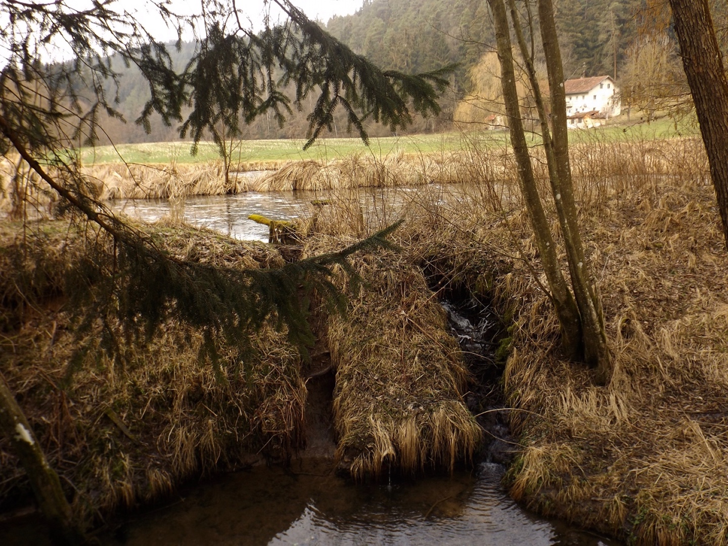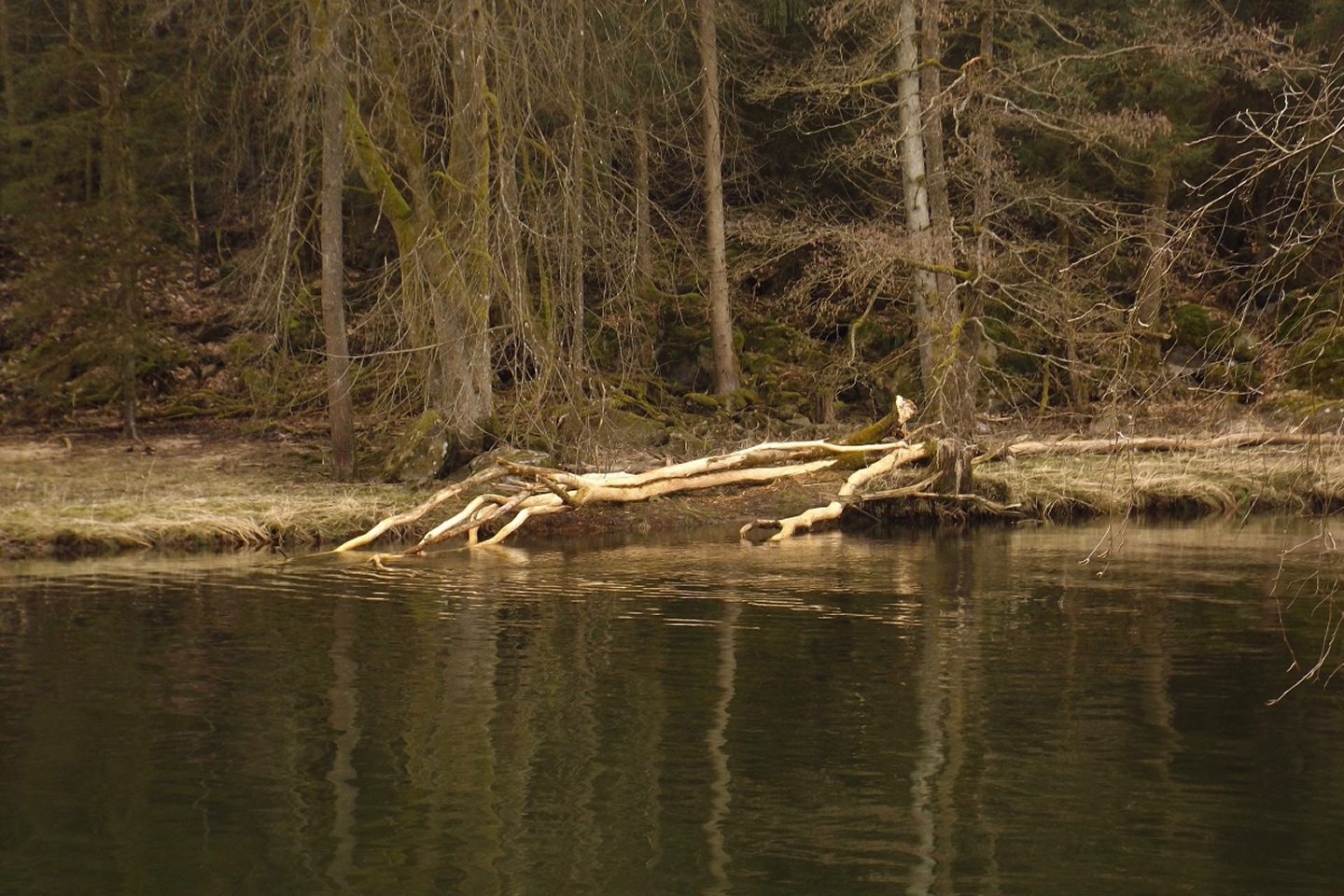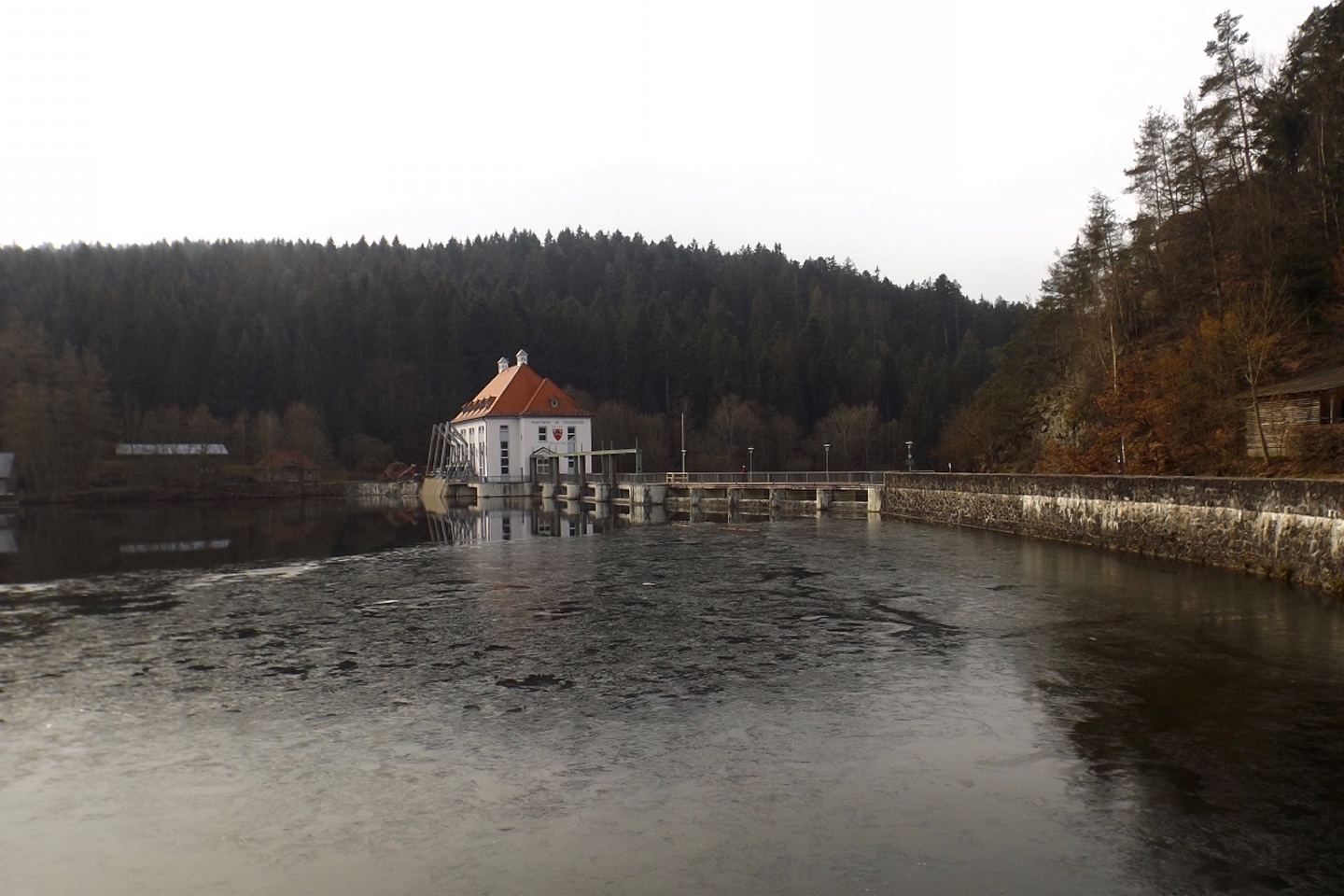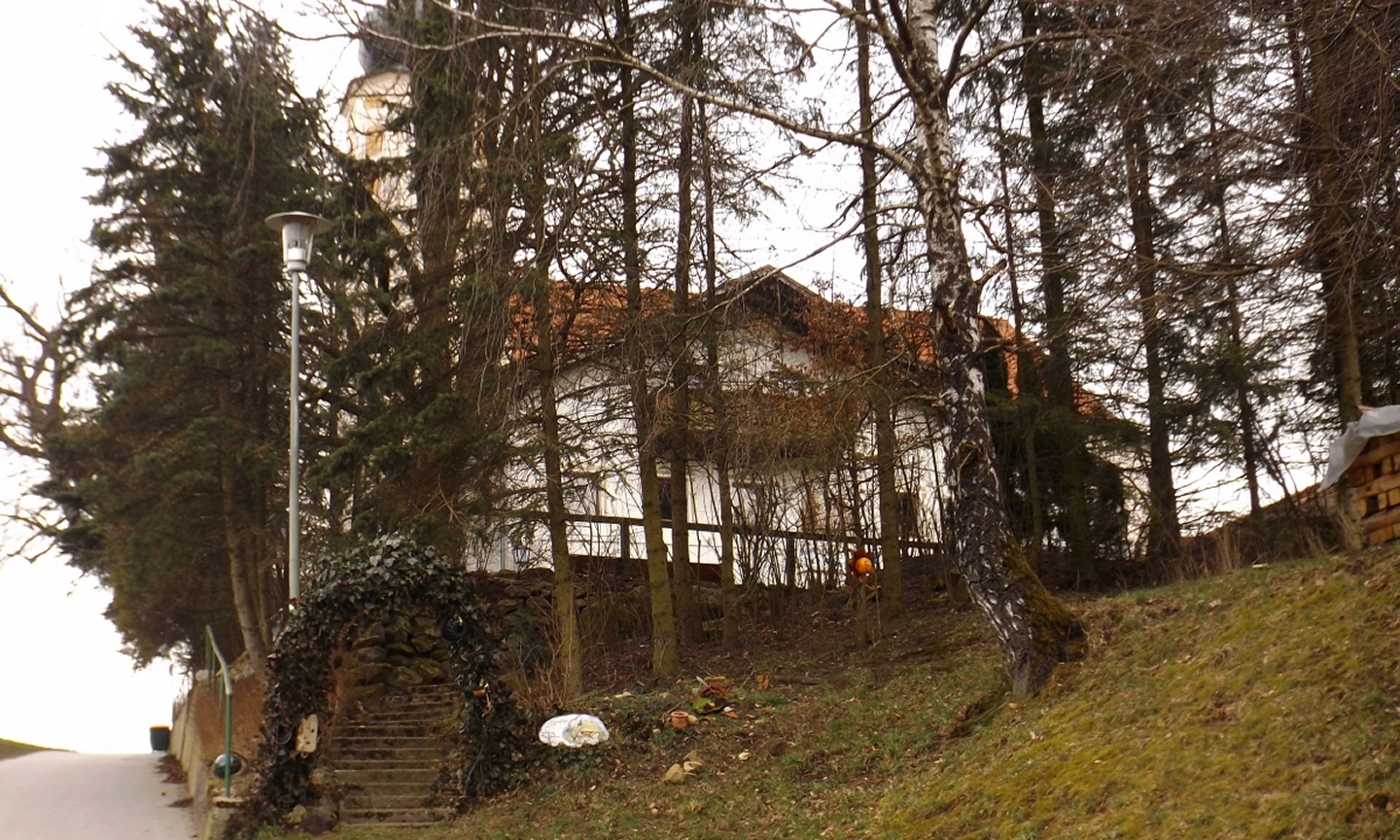 Wir starteten ohne große Verzögerung direkt am Eingang und nahmen erst einmal den Schleichweg in den Wald, wo der Wanderweg Bk2 direkt hinter der Klinik vorbeiführt. Ihm folgten wir vorbei am Schwedenstein und über zwei Hügel, deren Gipfel nur knapp umgangen wurden sowie eine nette kleine Holzbrücke über den Haberbach bis zur Landkreisgrenze, die ja hier auch die Bezirksgrenze nach Niederbayern ist. Gleich dahinter steht das Hotel Seeblick, in dem auch eine Einkehrmöglichkeit gewesen wäre, aber ich hatte anderswo reserviert. Nach einem „Willkommen daheim“ an Christa, die aus Niederbayern stammt, stiegen wir ab zur Staumauer des Höllensteinsees, der in der Realität definitiv seinem Ruf als schönster Stausee des Bayerischen Waldes gerecht wird. Ok, die Reschbachklause finde ich noch schöner, und sie ist strenggenommen ebenfalls ein Stausee, aber die beiden Seen lassen sich allein von der Größe her nicht vergleichen. Nach einer kurzen Rast stiegen wir die Treppe zum Fuß der Staumauer hinab und folgten dem ebenfalls hervorragend markierten Fischerlweg entlang des Schwarzen Regens und später des Blaibacher Sees bis zur Mündung des Haberbachs in den See. Dort führt der Fischerlweg teilweise etwas steiler hinauf nach Weißenregen, wo wir noch rechtzeitig vor der Küchenschließung in der Klause ankamen. Dort hatte ich nämlich reserviert und wir bekamen auch unsere sieben Plätze. Dass noch zwei andere Kurgäste am Tisch saßen, störte uns wenig bis überhaupt nicht, auch, weil beide mit deutlichem slawischen Akzent sprachen und sich als gebürtige Schlesier mit Wohnsitzen in der Oberpfalz vorstellten, die sich sehr an Wandertipps in der Region interessiert zeigten. Ich wage außerdem zu behaupten, dass wir im Seeblick zwar sicher auch gutes Essen bekommen hätten, aber nicht diese Hammerqualität. Das Bild vom Salatteller, den sich Christa und Marga bestellt hatten, ist leider das einzige, das etwas geworden war, aber auch Dominiks Schweizer Schnitzel und der Schweinebraten sahen exzellent aus und schmeckten laut Monika und Peter genauso. Der Superknaller war aber das Himmelsgeläut, welches sich Hans und ich bestellt hatten: Krustenbraten und Haxn mit handgemachtem Knödel und Kraut, serviert im Reindl und dazu gleich ein Extraschälchen Soße, einen treffenderen Namen kann es nicht für dieses Gerdicht geben. Dazu gab es Augustiner, immerhin ein wohlschmeckendes Dunkel, wenn auch nicht aus der Region. Eine andere Form von Himmelsgeläut erwartete uns nach der Einkehr, leider in Form eines recht stürmischen böhmischen Windes, der sich in den gut eineinhalb Stunden entwickelt hatte. Da half es auch nicht viel, dass wir gleich noch den zweiten Einkehrschwung in der Wallfahrtskirche machten. Vielleicht hätten wir doch ein Kerzerl anzünden sollen, ich habe bloß keine Gelegenheit dazu gefunden. Glücklicherweise ist es auch auf dem Kreuzweg nicht mehr weit hinunter zur Kurklinik, wo sich Monika und Peter direkt verabschiedeten, um noch einen Bekannten in Nittenau zu besuchen, und wir anderen den Nachmittag bei einer Tasse Cappuccino oder Tee im Klinikcafe ausklingen ließen. Es wurden auch noch riesige Stücke Kuchen serviert und vertilgt, ich verzichtete aber darauf, weil ich noch immer vom Himmelsgeläut und insbesondere dem nachbestellten zweiten Knödel absolut pappsatt war. Ja, das gibt es auch. Man mag es kaum glauben.