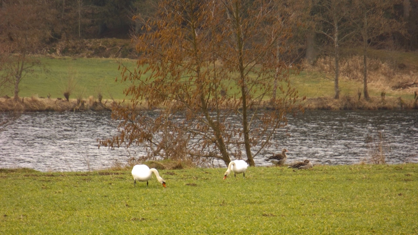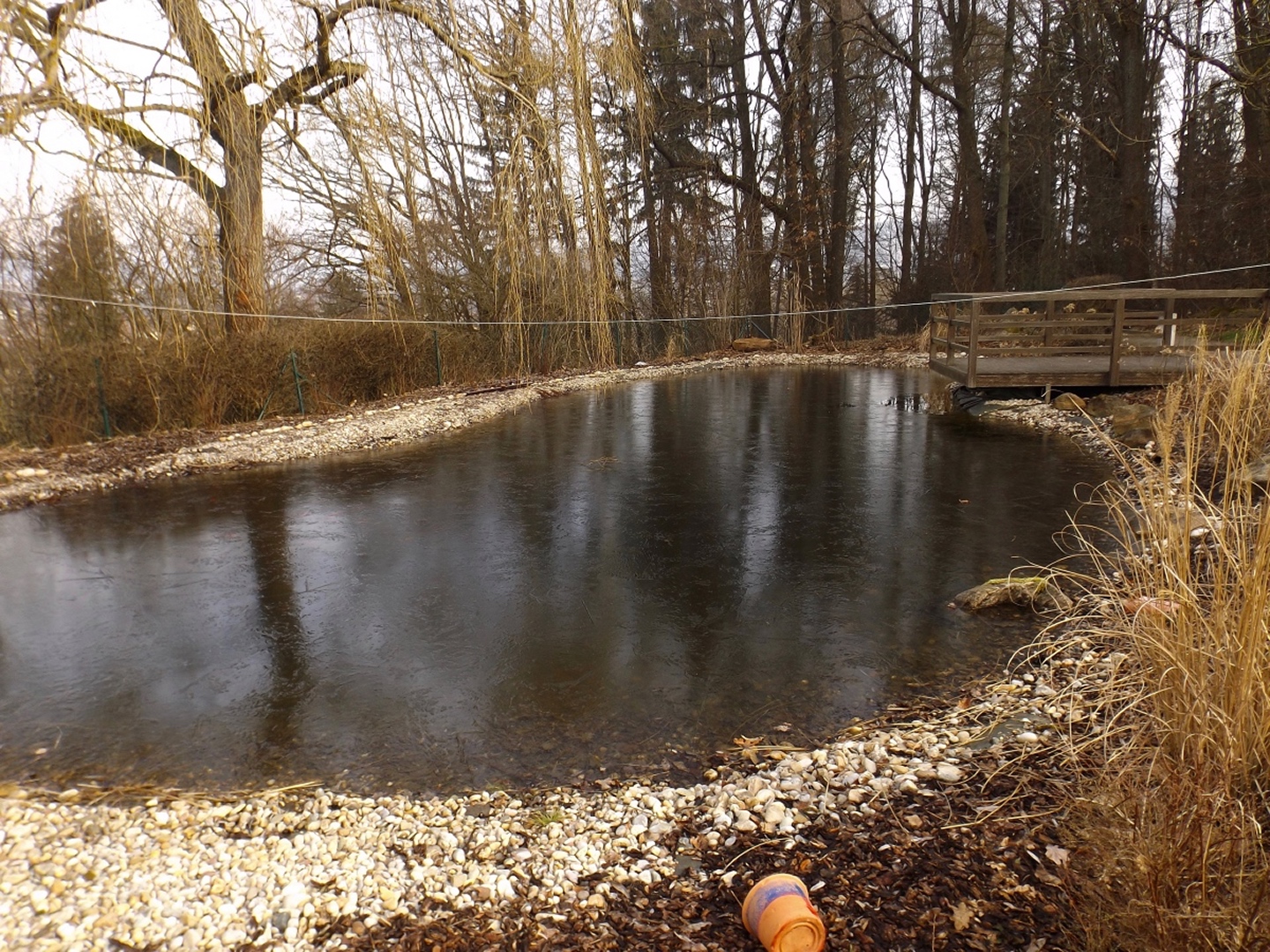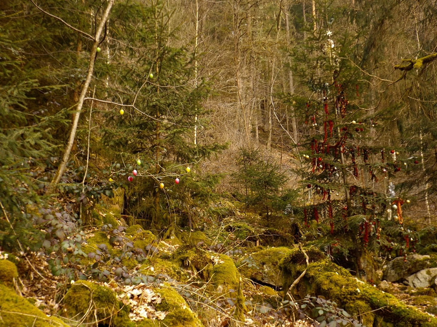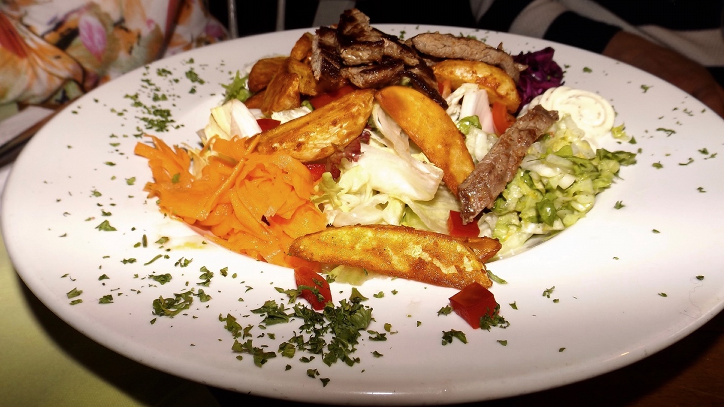 Wir starteten ohne große Verzögerung direkt am Eingang und nahmen erst einmal den Schleichweg in den Wald, wo der Wanderweg Bk2 direkt hinter der Klinik vorbeiführt. Ihm folgten wir vorbei am Schwedenstein und über zwei Hügel, deren Gipfel nur knapp umgangen wurden sowie eine nette kleine Holzbrücke über den Haberbach bis zur Landkreisgrenze, die ja hier auch die Bezirksgrenze nach Niederbayern ist. Gleich dahinter steht das Hotel Seeblick, in dem auch eine Einkehrmöglichkeit gewesen wäre, aber ich hatte anderswo reserviert. Nach einem „Willkommen daheim“ an Christa, die aus Niederbayern stammt, stiegen wir ab zur Staumauer des Höllensteinsees, der in der Realität definitiv seinem Ruf als schönster Stausee des Bayerischen Waldes gerecht wird. Ok, die Reschbachklause finde ich noch schöner, und sie ist strenggenommen ebenfalls ein Stausee, aber die beiden Seen lassen sich allein von der Größe her nicht vergleichen. Nach einer kurzen Rast stiegen wir die Treppe zum Fuß der Staumauer hinab und folgten dem ebenfalls hervorragend markierten Fischerlweg entlang des Schwarzen Regens und später des Blaibacher Sees bis zur Mündung des Haberbachs in den See. Dort führt der Fischerlweg teilweise etwas steiler hinauf nach Weißenregen, wo wir noch rechtzeitig vor der Küchenschließung in der Klause ankamen. Dort hatte ich nämlich reserviert und wir bekamen auch unsere sieben Plätze. Dass noch zwei andere Kurgäste am Tisch saßen, störte uns wenig bis überhaupt nicht, auch, weil beide mit deutlichem slawischen Akzent sprachen und sich als gebürtige Schlesier mit Wohnsitzen in der Oberpfalz vorstellten, die sich sehr an Wandertipps in der Region interessiert zeigten. Ich wage außerdem zu behaupten, dass wir im Seeblick zwar sicher auch gutes Essen bekommen hätten, aber nicht diese Hammerqualität. Das Bild vom Salatteller, den sich Christa und Marga bestellt hatten, ist leider das einzige, das etwas geworden war, aber auch Dominiks Schweizer Schnitzel und der Schweinebraten sahen exzellent aus und schmeckten laut Monika und Peter genauso. Der Superknaller war aber das Himmelsgeläut, welches sich Hans und ich bestellt hatten: Krustenbraten und Haxn mit handgemachtem Knödel und Kraut, serviert im Reindl und dazu gleich ein Extraschälchen Soße, einen treffenderen Namen kann es nicht für dieses Gerdicht geben. Dazu gab es Augustiner, immerhin ein wohlschmeckendes Dunkel, wenn auch nicht aus der Region. Eine andere Form von Himmelsgeläut erwartete uns nach der Einkehr, leider in Form eines recht stürmischen böhmischen Windes, der sich in den gut eineinhalb Stunden entwickelt hatte. Da half es auch nicht viel, dass wir gleich noch den zweiten Einkehrschwung in der Wallfahrtskirche machten. Vielleicht hätten wir doch ein Kerzerl anzünden sollen, ich habe bloß keine Gelegenheit dazu gefunden. Glücklicherweise ist es auch auf dem Kreuzweg nicht mehr weit hinunter zur Kurklinik, wo sich Monika und Peter direkt verabschiedeten, um noch einen Bekannten in Nittenau zu besuchen, und wir anderen den Nachmittag bei einer Tasse Cappuccino oder Tee im Klinikcafe ausklingen ließen. Es wurden auch noch riesige Stücke Kuchen serviert und vertilgt, ich verzichtete aber darauf, weil ich noch immer vom Himmelsgeläut und insbesondere dem nachbestellten zweiten Knödel absolut pappsatt war. Ja, das gibt es auch. Man mag es kaum glauben.