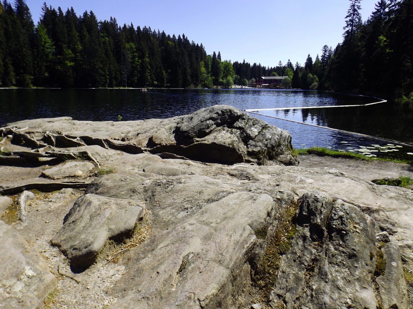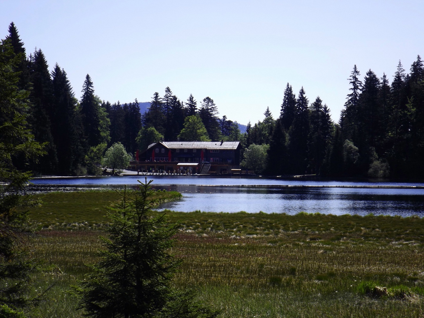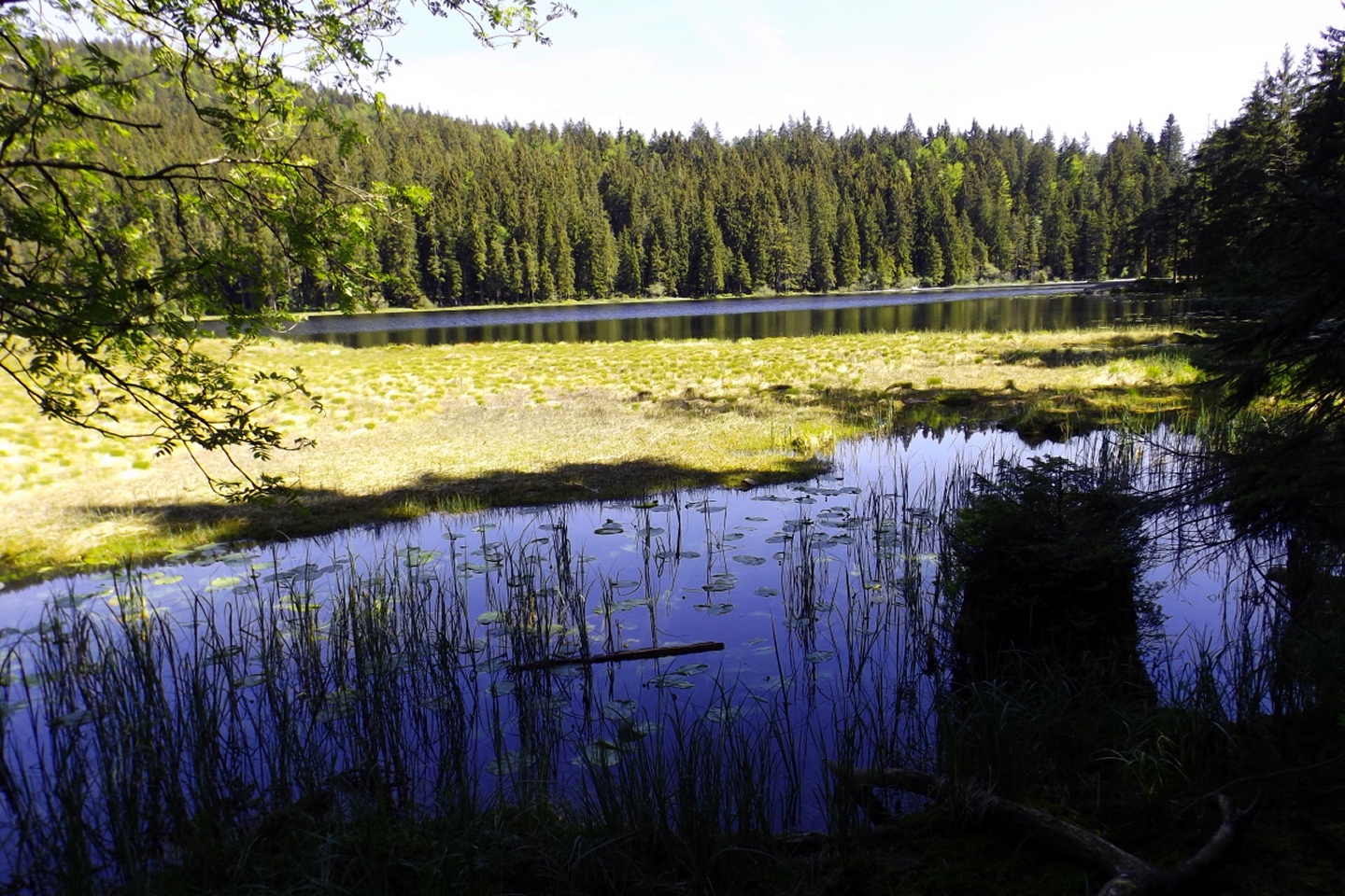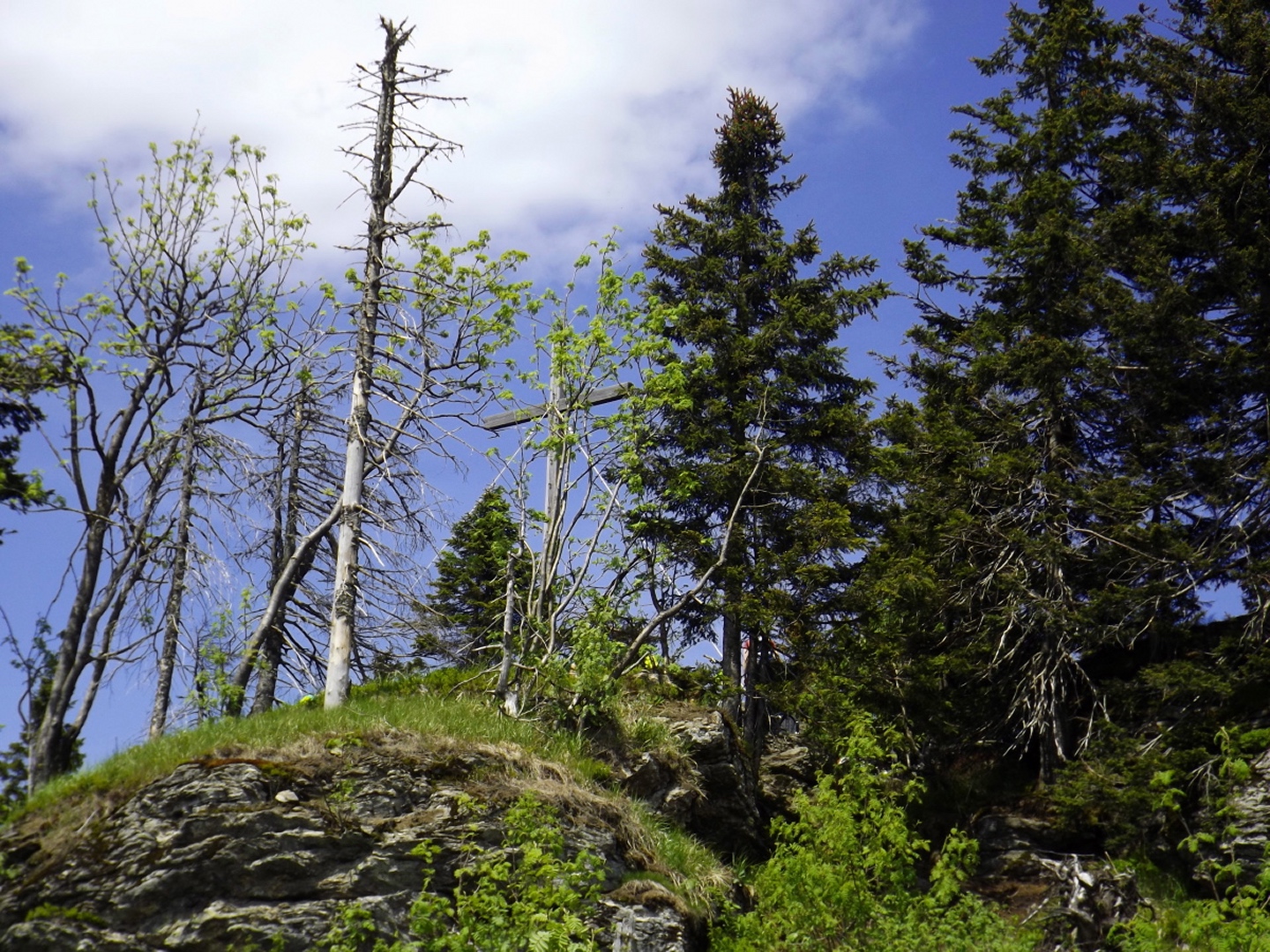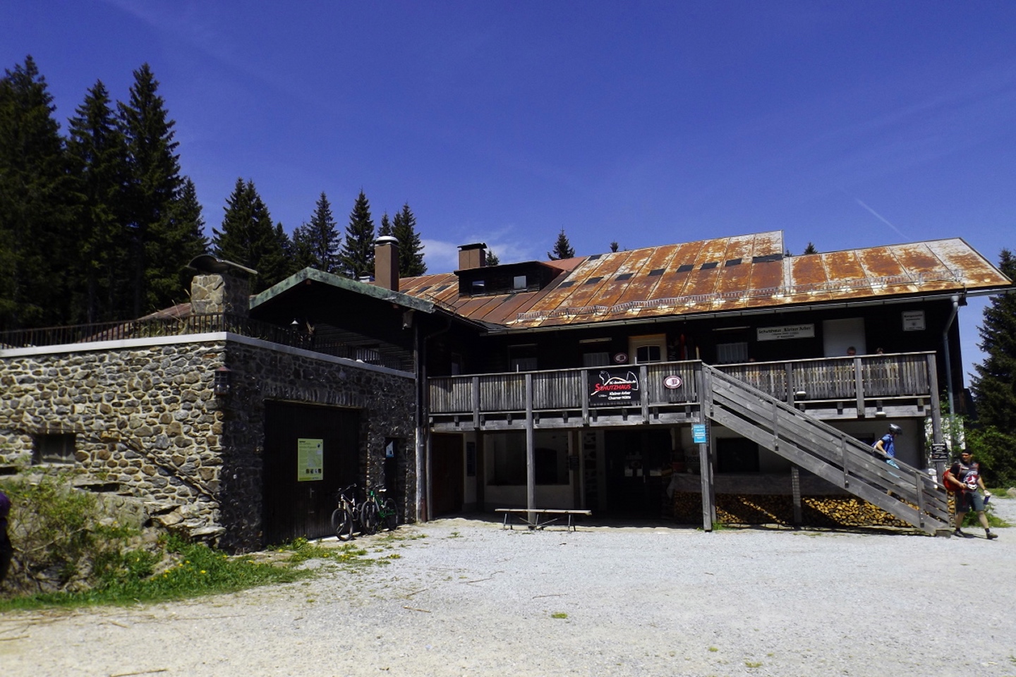 Ja, ich bin den Seewandsteig schon mal gegangen. Ich kann allerdings nicht nachvollziehen, warum ich ihn damals mit T2 bewertet habe. Vielleicht hatte es Coco mir eingeflüstert. Und ja, ich war auch schon auf dem Kleinen Arber und bin über die Chamer Hütte rüber zum Großen gegangen. Mit Karl vor ziemlich genau zwei Jahren. Da war es aber so stürmisch, dass wir die Gipfelriegel auslassen mussten, außerdem war die Seilbahn da noch in Revision und deswegen auch das Schutzhaus geschlossen. Aber das hatte alles keinen Einfluss darauf, dass ich das alles nochmal gemacht habe. Denn ich hatte bisher weder den Großen Arbersee umrundet noch war ich die Querung vom Ende des Seewandsteigs zur Chamer Hütte über den Arberschachten gegangen.