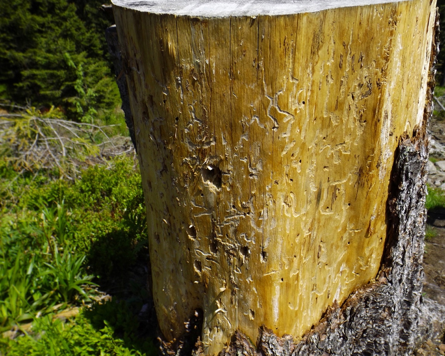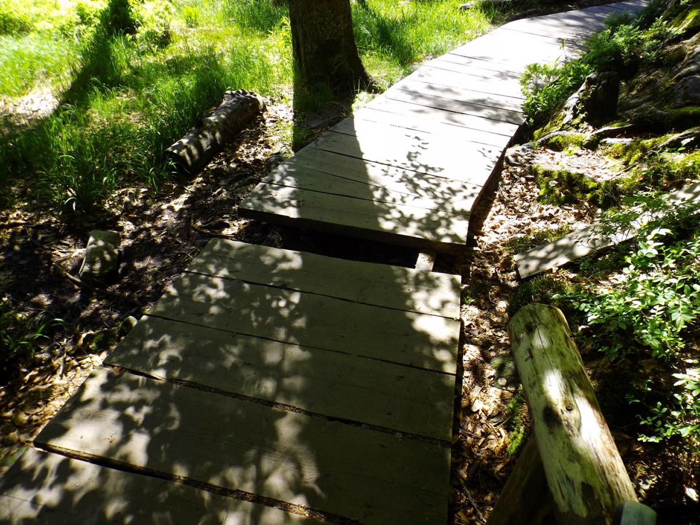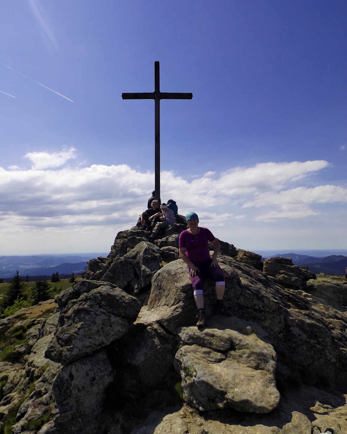 Netterweise war die Reaktion auf meine Frage in einem Frauenportal, ob denn jemand von den Berggeherinnen auch mal Lust auf den Bayerwald hätte, sehr positiv, so dass es nicht lange dauerte, bis die Tour für Samstag ausgeschrieben war. Petrus zwang uns noch zur Verschiebung um einen Tag, dafür hatte es am Ende aber AKW und sechs wanderfreudige Frauen starteten fast pünktlich kurz nach zehn Uhr am Arberseehaus zu dieser Runde. Für die meisten war der Bayerwald Neuland, also durfte ich neben dem Fotografieren auch noch dirigieren. Kein Problem, denn ich hatte ja auch zur Sicherheit meine Karte dabei. Zunächst wurde die allerdings nicht gebraucht, denn wir umrundeten zum Aufwärmen erst einmal den See. Dies geschah auf einem gut ausgebauten und sandalentauglichen Touristenpfad und erleichterte die Gewöhnung an die unterschiedlichen Gehgeschwindigkeiten und Fotofrequenzen. Denn Motive gibt es auf dieser Runde auch schon genug. Kurz vor dem Arberseehaus zweigen dann zwei Wege nach rechts ab, eine Fahrstraße und ein breiter, markierter Pfad. Dieser wird bald schmäler, bleibt aber markiert und geht länger nach oben als ich mich erinnern konnte. Die erste Forststraße wird noch überquert, bei der zweiten heißt es dann rechts abbiegen. Ab hier sind keine Markierungsschilder mehr an den Bäumen, nur noch teilweise abgewaschene Bemalungen der Wegnummer 5. Kann es sein, dass der Seewandsteig aus den offiziellen Wanderwegen rausgeflogen ist, weil er für Sandalentouristen zwei Nummern zu anspruchsvoll ist? Normalerweise würde ich ja Turnschuhtouristen sagen, aber Manu war mit eben diesem Schuhwerk unterwegs und kam ziemlich gut zurecht. Der Forststraße folgten wir nur ein paar Meter bis zu einer Linkskurve, in der ein Weg geradeaus in den Wald hineinführt. Dieser geht nach ebenfalls nicht vielen Metern in den wirklichen Seewandsteig über, und hier beginnt der Genuss. Der Seewandsteig windet sich in vielen Miniserpentinen über kleine Felsen und Wurzeln durch die Seewand. Mal wird ein Bacherl überquert, dann geht es wieder drei Meter bergab, umgestürzte Bäume rechts wechseln sich mit richtigen Felswänden links ab, aber im Prinzip geht es immer in angenehmer Steigung schräg nach oben. Nach etwa einer Stunde dreht der Pfad nach links und das Gehölz wird jünger. Dann ist es nicht mehr weit bis zur Einmündung in den Steig, der vom Mittagsplatzl herunterkommt und schnürlgerade in der Bodenmaiser Senke endet. Diesen Weg bin ich damals mit Coco gegangen, heute bogen wir in die andere Richtung ab, blieben aber nur 20 Meter auf dem Steig, weil dann von rechts mit Weg 2b einer der Hauptzustiege von Bodenmais über die Reischbachfälle heraufkommt. Diesem Weg folgten wir etwa eine Viertelstunde bergab, wobei es eigentlich zwei Möglichkeiten gibt: Während sich der markierte Wanderweg ein bisserl durch den Wald windet, führt wenige Meter links davon ein gut verwachsener Harvestertrack hinunter. An der ersten Forststraße verließen wir diesen Weg wieder und bogen rechts ab. Hier gibt es keine Wandermarkierungen oder Zielhinweise, lediglich eine Markierung für Mountainbikes ist vorhanden. Nach 20 Minuten waren wir am Arberschachten angekommen, wo es ein kleines Unterstellhütterl gibt und der Arbersteig rechts hinauf zur Bodenmaiser Senke führt. Wie ich am Mittwoch am Hüttlschachten lesen durfte, ist der Arberschachten eine von lediglich zwei Bergweiden im Bayerischen Wald, die noch für ihren ursprünglichen Zweck genutzt werden. Wir konnten auch schon die Elektrozäune im Aufbau sehen, es wird also bald losgehen. Weiter ging es auf der Forstautobahn, bis Sandra für ein Foto zu einem etwas oberhalb des Weges stehenden Baumstumpf abbog und dort ein Geocache entdeckte. Eine weitere Forststraßenabzweigung ließen wir rechts liegen, bevor wir nach etwa drei Forststraßenkilometern am Waldsteiglein ankamen, das von hier aus zur Chamer Hütte und dem Kleinen Arber führt. Als kleine Fortsetzung des Themas von Mittwoch sind die Hinweise nur von der anderen Seite erkennbar. Scheinbar gibt es nicht viele Wanderer, die über den Seewandsteig oder das Mittagsplatzl zum Kleinen Arber gehen. Wir sind auch nur von zwei Mountainbikern überholt worden. Nach fünf Minuten waren wir an der geschlossenen Hütte und beschlossen, die Bänke Bänke sein zu lassen und erst mal auf den Gipfel zu gehen. Sollte dieser zu voll oder nicht schön genug sein, könnten wir ja bei der Rückkehr immer noch an der Hütte Rast machen. War es aber nicht, wir verblieben etwa eine halbe Stunde am Gipfel. Der Weg dorthin hat sich in den letzten zwei Jahren nur marginal verändert, so dass ich mir eine detailliertere Beschreibung spare. Ein leicht angegrauter Herr mit Sepplhut und niederbayerischem Dialekt ignorierte jedoch beim Aufstieg die Wildruhezone und machte einen Ausflug auf einen der kleinen Felsen neben dem Weg. Meinen freundlichen Hinweis darauf quittierte er mit Überraschung und fotografierte seelenruhig weiter. Wenn er meint. Seine beiden Begleiterinnen sorgten am Gipfel noch für etwas Heiterkeit, waren aber nach ein paar Erinnerungsfotos am Gipfelkreuz schnell wieder verschwunden. Zurück an der Chamer Hütte gab es trotzdem noch eine kleine Unterbrechung, da die Mehrzahl der Gruppe nach einer geöffneten Toilette suchte. Leider erfolglos. Also gingen wir weiter auf dem jetzt als Goldsteig markierten Pfad durch den Wald, zunächst hinab zum tiefsten Punkt des Sattels, dann wieder ansteigend. Abzweigungen Richtung Kleiner Arbersee wurden ebenso ignoriert wie die erste Anbindung an die Forstraße, die wir vorhin rechts liegenlassen hatten. Erst als der Pfad ohne weitere Alternative in sie mündete, fügten wir uns diesem Schicksal und stiegen etwa 800 Meter auf ihr auf, bis (mal wieder in einer Linkskehre) der Verbindungspfad zur Bodenmaiser Senke geradeaus weiterging. Von der Senke aus führt der steile Treppenweg hinauf zum Gipfelplateau und mündet am Fuß des Wagnerfelsen in den Gipfelrundweg. Ursprün