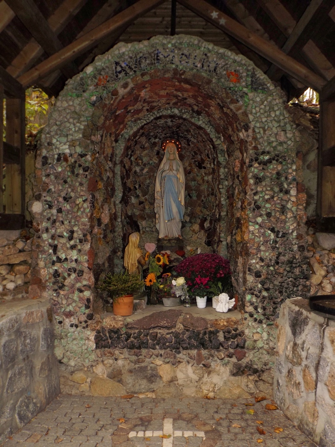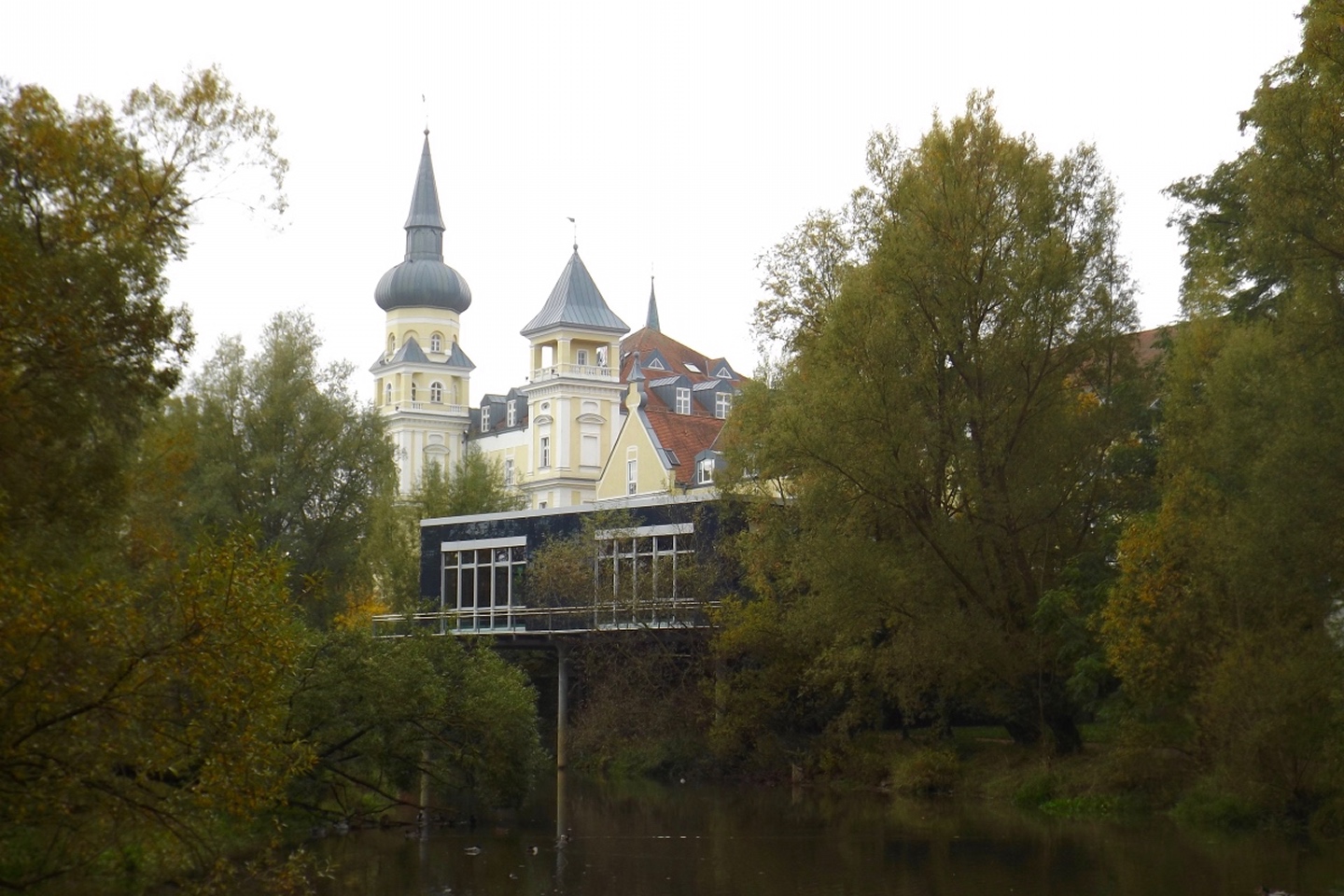 Die Strecke ist schnell beschrieben. Vom Parkplatz am Badeanger, hinter dem der Schlosspark beginnt, überquerten wir auf dem Steg die Kleine Naab, steigen auf dem Alten Kreuzweg auf den Berg und umrundeten das Klostergelände einmal. Bei jedem Evangelistenmarterl gab es einen Auszug aus dessen Evangelium, wir machten auch den kleinen Schlenker zum noch brauchbaren Aussichtspunkt Barbarakanzel und besuchten selbstverständlich auch die Kirche, in der uns das Ave Maria vorgeflötet wurde. Karlie durfte anfangs auch mitgehen, ihm war aber schnell außer langweilig nur fad, so dass mein Vater während der Erklärpausen mit ihm weiterging und am Ende das Kloster vier Mal umrundete. Zur gleichen Zeit war auch eine Joggerin auf dem Berg unterwegs, wir vermuten, dass sie zehn Runden gemacht hat. Auf dem Rückweg sperrte der Gästeführer noch schnell den Felsenkeller neben dem Kreuzweg auf und ließ die Interessierten (außer mir nur eine Teilnehmerin) hineinschauen. Nach den üblichen Verabschiedungen und einer ausgiebigen Segnung durch die Pastorin hatte ich noch jede Menge Zeit bis zu den Handballspielen, die ich mir anschließend noch anschauen wollte und nahm so dankend die Einladung des Gästeführers an, noch eine Runde um das Schloss zu gehen. Nur die Kamera konnte ich nicht mehr mitnehmen, weil ich sie meinen Herrschaften mitgegeben hatte, in der Halle kann ich sie nicht brauchen und im Auto lassen war mir zu riskant. Bei dieser Runde habe ich fast noch mehr erfahren als bei der Hauptveranstaltung.
