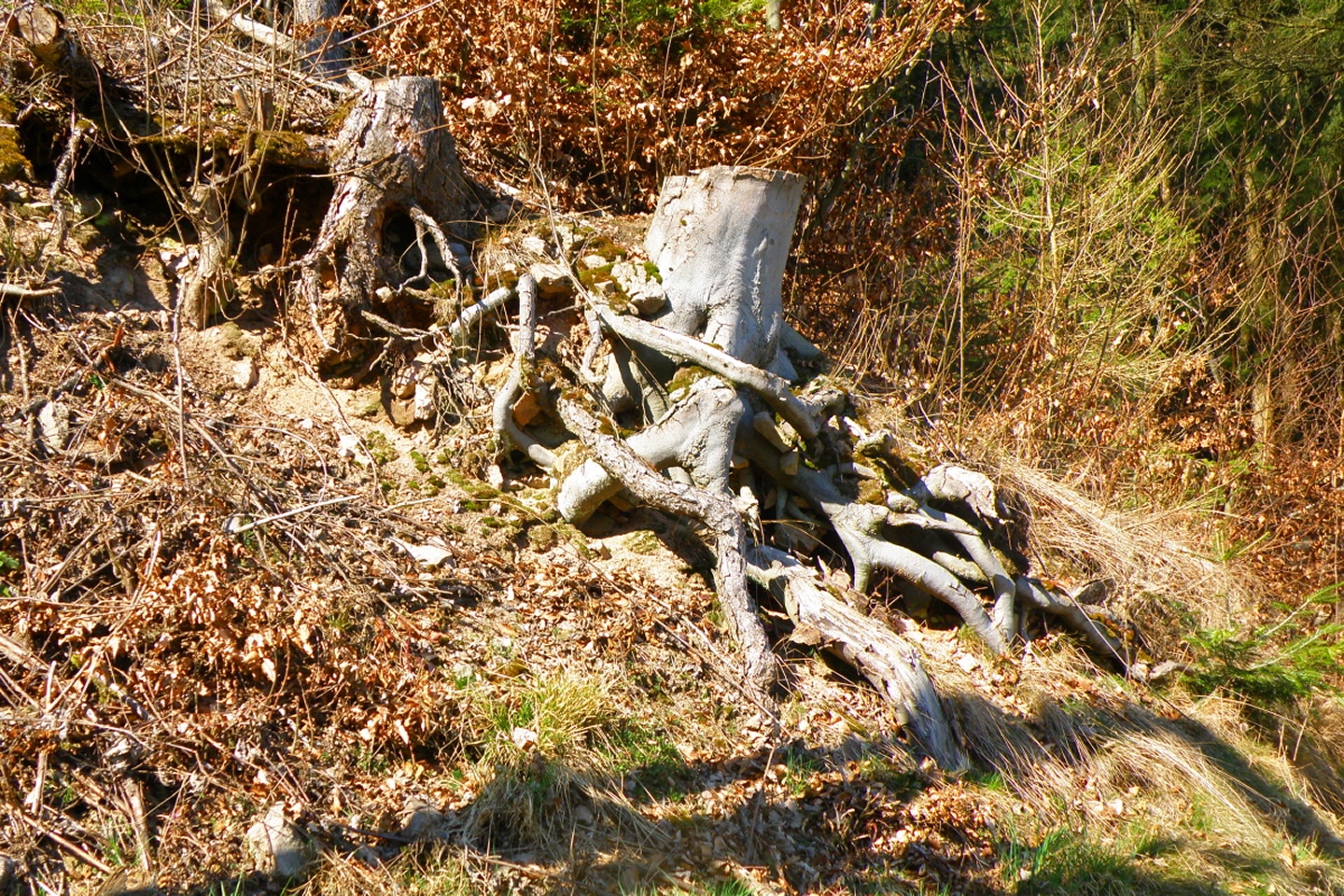 Startpunkt war wie beim letzten Mal der Skilift in Sitzambuch. Bei trockenen Verhältnissen ist der Pfad unter dem Lift recht gut begehbar und für Geübte auch nicht übermäßig steil, vielleicht 35 Grad. Man kürzt im Vergleich zur Forststraße, die die Skipiste drei mal kreuzt, etwa zwei Kilometer ab. Am Gipfel versuchte ich erst einmal ein Gipfelfoto im Selbstauslöser, das jedoch total unscharf wurde. Nach fünf Minuten war es mit der Einsamkeit des Aufstiegs vorbei, von der Südwestseite, die gerade mal ein Kilometer Strecke und 50 Höhenmeter Austieg vom Parkplatz erfordert, her kamen zwei Gruppen von Wanderern. Ich machte mich in jene Richtung auf, überquerte die Straße, die von Schnaittenbach nach Hainstetten hinauf führt, und bog nach wenigen Metern rechts zum Rotbühlgipfel ab. Diesen überquerte ich, um nach nicht einmal 150 Metern auf eine weitere Forststraße vom Parkplatz her zu stoßen, der ich nach links Richtung Rundfunksender folgte. An einer Kreuzung geht dann ein Hohlweg, wohl Teil der Alten Bernsteinstraße, rechts hinunter zur Fensterbachquelle. Dieser Weg ist auch Teil des Dreigipfelpfades und auch gut beschildert. An der Fensterbachquelle geht es zunächst geradeaus auf einer Forststraße weiter, die sich nach 100 Metern gabelt. Hier folgte ich rechts haltend einem kleinen Gegenanstieg bis zu einer Wasserversorgungsstation. Hinter dieser leitet die Markierung „Grünes Dreieck“ rechts in den Wald hinein auf einen parallel zur Forststraße verlaufenden Pfad, der allerdings nach 500 Metern wieder in die Forststraße mündet. Wichtig ist es erst später, dem Dreieck nach rechts zu folgen. Wenn diese Markierung danach den Forstweg nach links in den Wald Richtung Schnaittenbach verlässt, auf dem Forstweg nach halbrechts bleiben, bis auf der rechten Seite die in den Bildern gezeigte Hüle auftaucht und hinter ihr ein Pfad rechts nach oben führt. Diesem Weg mit der Nummer 33 folgte ich bis zur bereits bekannten Straße, welche ich überquerte und dem Zufahrtsweg zur Buchberghütte folgte. Dort genehmigte ich mir ausnahmsweise ein Helles, bevor ich noch einen kleinen Abstecher zur Keltenfliehburg mit Kapelle machte. Dazu verließ ich die Hütte nach rechts, ging an der Kreuzung nach 80 Metern nicht geradeaus Richtung Sitzambuch, sondern bog links ab und folgte der Beschilderung. Als Belohnung winkt ein Kapellenbuch und eine ordentliche Aussicht nach Osten. Auf dem gleichen Weg geht es zurück zur Kreuzung, von der aus ich dem bereits bekannten Weg zum Skihang Sitzambuch und dem Auto folgte.