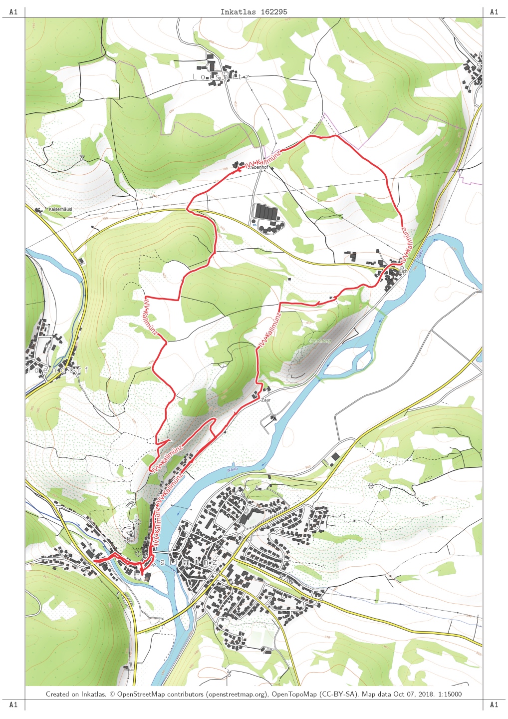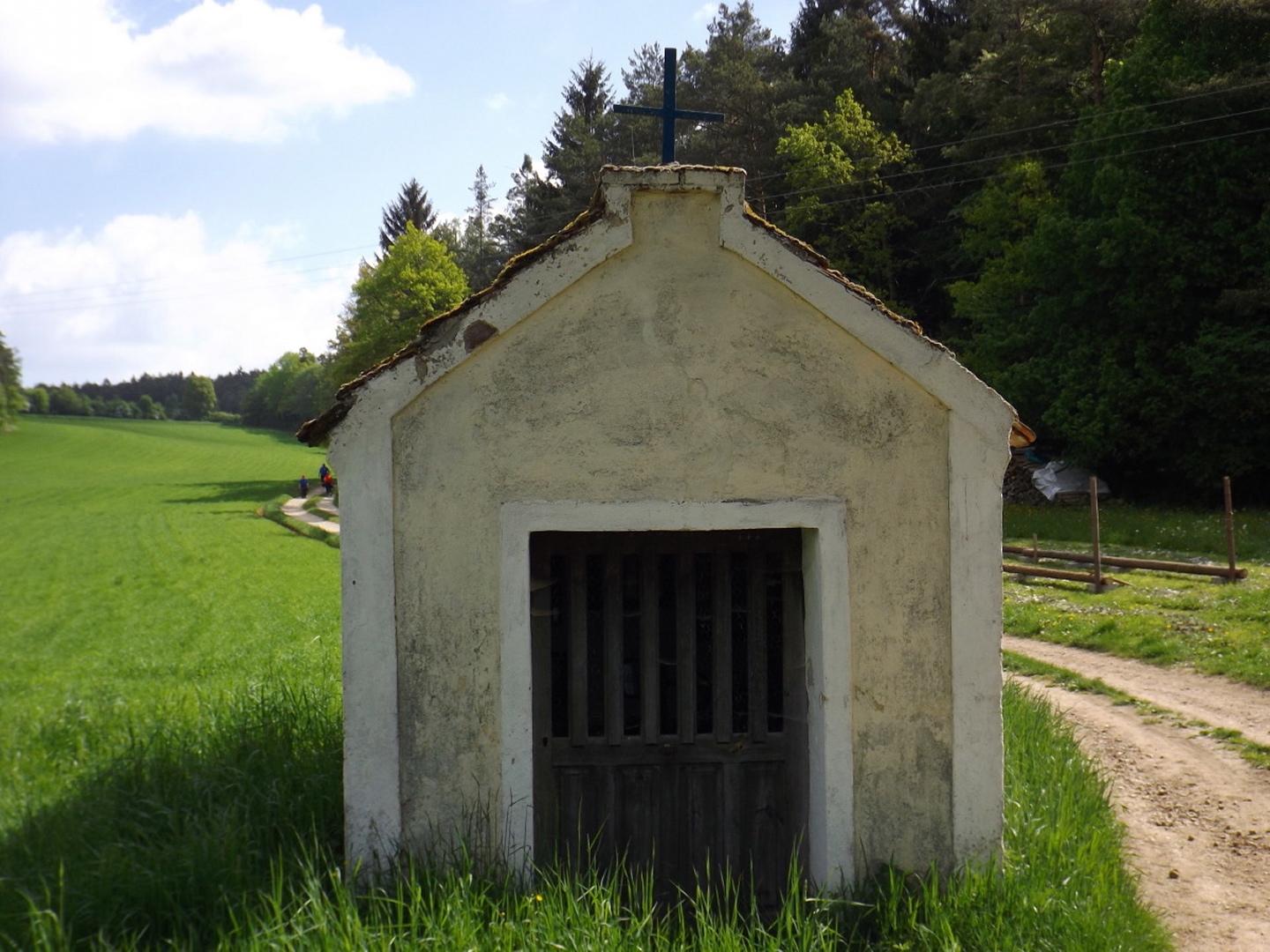 Die Beschilderung war etwas undurchsichtig, so dass ich nicht bis zum Ausgangspunkt fuhr, sondern bereits den Netto-Parkplatz am Ortseingang von der Staatsstraße Etterzhausen-Amberg ansteuerte und von dort aus mit eingeschaltetem Garmin bis zum Start im Gemeindesaal marschierte. Dies erwies sich als gut, weil bei der Startkartenausgabe ein GPS-Ausdruck der beiden Routen aushing, auf dem die Streckenlänge mit gerade mal 8,75 km verzeichnet war. Die Streckenteilung erfolgte sofort am Ausgang, während die kurze Strecke ins Vilstal hinauf Richtung Traidendorf führte, folgte ich erst einmal der Naab flussaufwärts nach Zaar. Dort bog der Weg links ab ins Tal zwischen Schlossberg und Eicherberg, nur um letzteren westlich zu umgehen und in Eich wieder im Tal anzukommen. Von dort aus ging es auf dem Wittelsbacher Burgenweg 2 zum Grabenhof, wo die Verpflegungs- und Stempelstelle aufgebaut war. Ich begnügte mich mit dem Stempel, weil ich erstens gerade mal die zwei Euro für die Startgebühr mitgenommen hatte und zweitens den Einfall hatte, dass ich noch die kurze Runde hinten dranhängen könnte, falls ich vor halb zwölf wieder am Marktplatz wäre. Weiter ging es über den Hirmesberg Richtung Burg, aber nur Richtung. Während der offizielle Weg den kleinen Gipfel mit Kreuz und Windfahne am Startplatz für Gleitschirme links liegen ließ und direkt zum Zustieg der Piloten führte, nahm ich die 150 Meter zum Kreuz mit. Dort ließ ich mich in ein Gespräch verwickeln, was das Ende der Pläne mit der Zusatzrunde bedeutete. Über den touristenmäßig und gleitschirmtauglich ausgebauten Zustieg erreichte ich wieder die Eicher Straße und den Hinweg und kehrte ohne Zwischenstopp am Gemeindehaus zum Auto zurück.