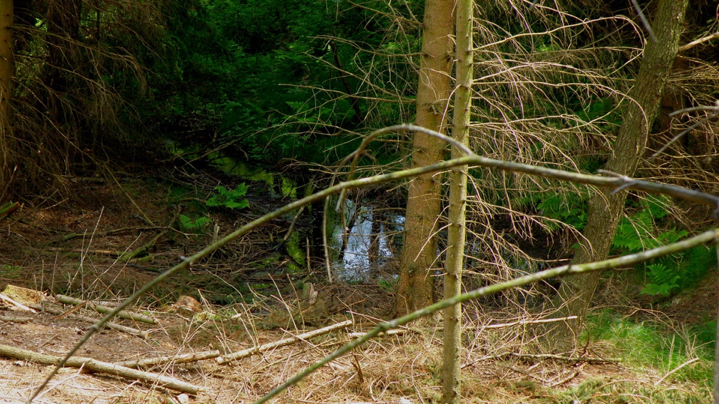 Um genau zu sein, sind wir nur das erste Drittel des Goldlehrpfades gegangen. Dieses bildet nämlich eine schöne Runde, während der Weiterweg ein sechs Kilometer langer Schlauch bis zum Stangenberg ist, den man zurücklaufen müsste, sofern man am Ziel kein weiteres Auto stehen hat. Also ein Soloprojekt. Wir gingen also nach der Einführung vom Infozentrum in den Wald, bogen an der Abzweigung rechts ab in die Runde und überquerten nach ein paar Minuten die Kreisstraße. Anschließend ging es rechts in ein frisch ausgeschlagenes Stück, von dem aus wir das Güttinger Loch, eine ehemalige Goldmine, betrachten konnten. Nach ein paar Informationen gingen wir zurück zum Weg, der an zwei Fischweihern vorbei in den Wald führt. Dort quert er die Murach, bevor er auf eine Forststraße stößt, an der wir rechts abbogen. Nach etwa 700 Metern geht es wieder nach rechts in den Wald zum Goldwaschplatz am Forellenbach. Anschließend wird dieser Bach überquert und es geht in etwas auf und ab wieder hinab zur Murach, die hier auf einer Betonbrücke überquert wird. Kurz darauf zweigt der Goldlehrpfad rechts ab zurück zur Infostelle, wir gingen aber geradeaus zur Glasschleife, an der die fünfte und letzte Infostation war. Von dort aus kürzten wir durch den Wald ab zurück nach Gütting und beendeten den Tag mit freundlichen Abschiedsworten von Herrn Kirch. Die angekündigten Gewitter haben sich anständigerweise bis dahin zurückgehalten, auf der Rückfahrt mussten wir durch eine kleine Regenfront, während es in Schwandorf bis zum Abend trocken blieb.