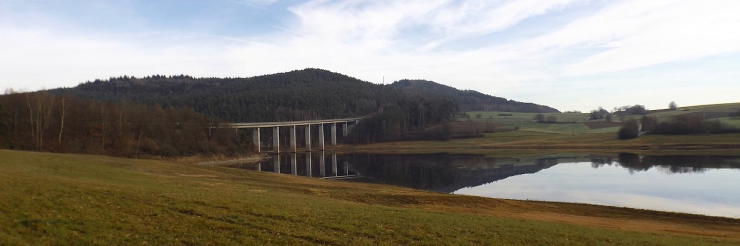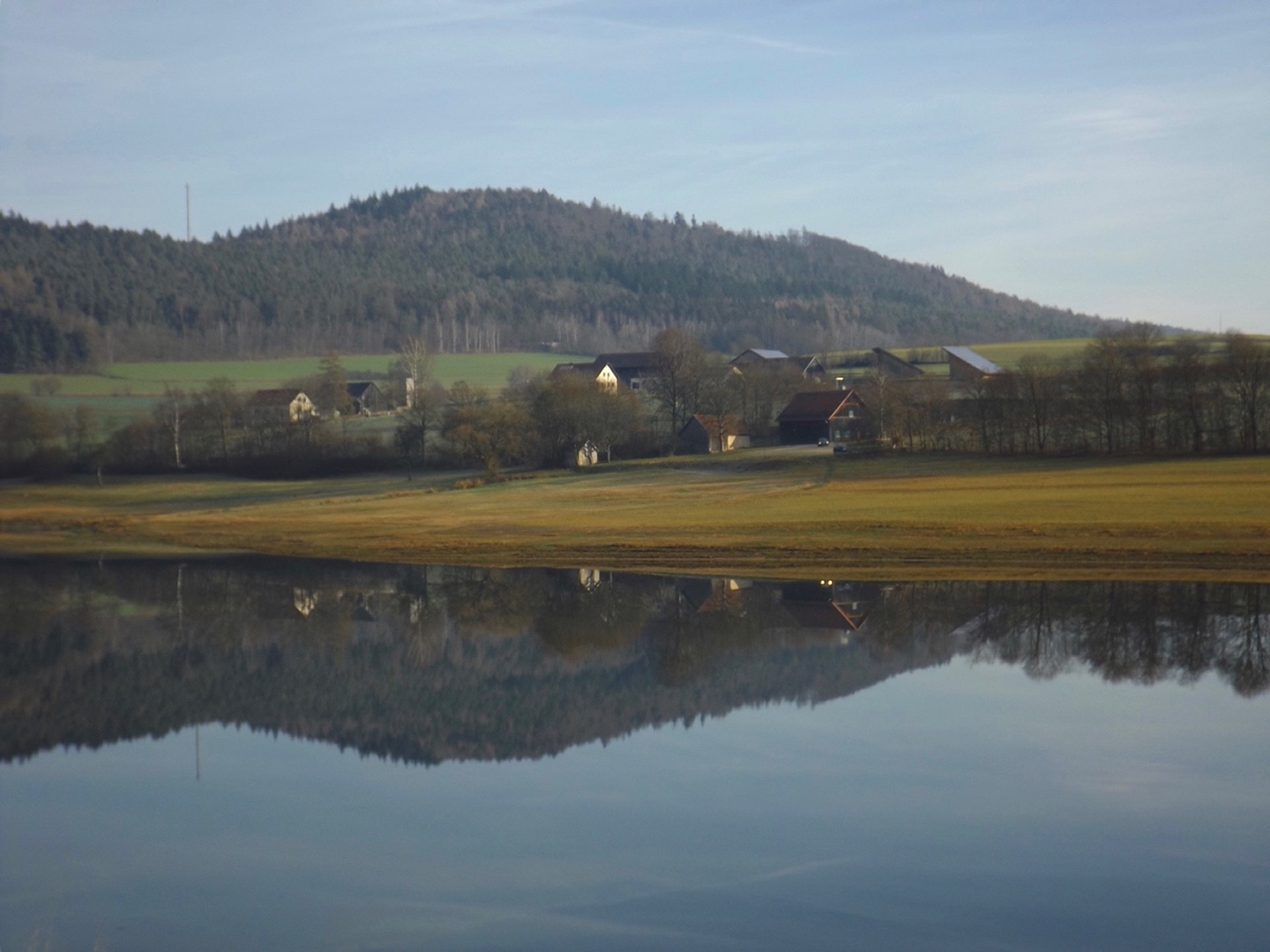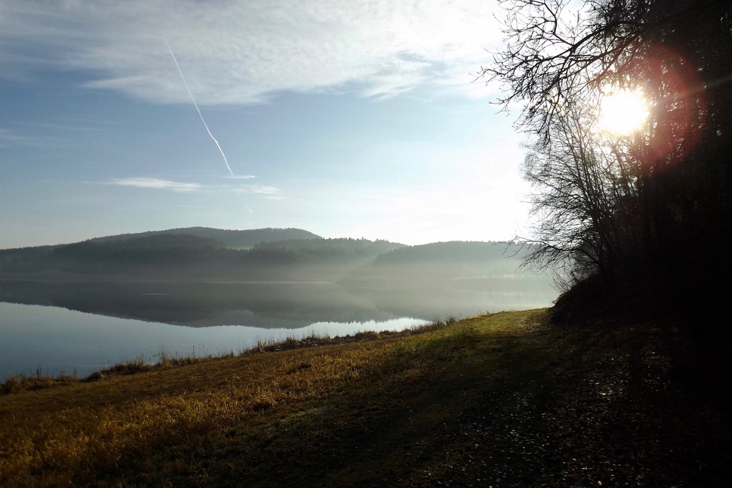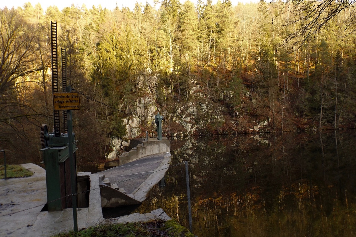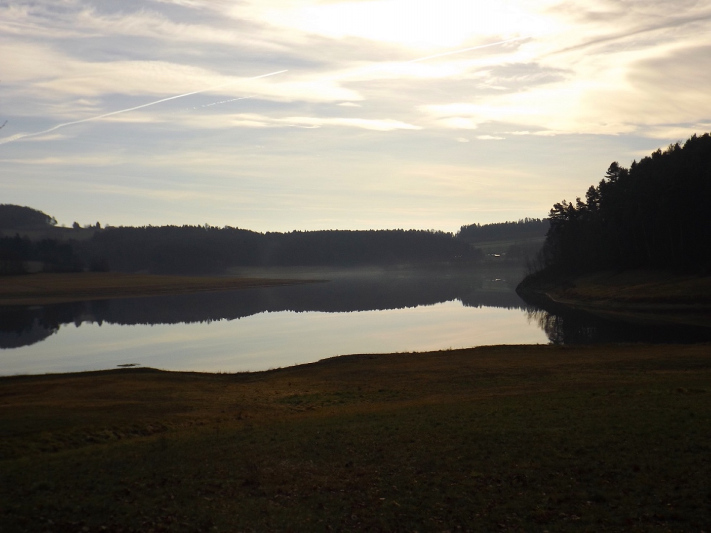Da dann auch noch die Sonne dem Nebel ziemlich den Garaus machte, waren auch jede Menge Teilnehmer unterwegs und ich musste das Auto am Krankenhaus, ziemlich weit von der Schule entfernt, abstellen, was allerdings am Ende eine kleine Abkürzung ermöglichte. Zur Strecke möchte ich gar nicht viel schreiben, es ging hinter der Schule zur ehemaligen Bahnstrecke, auf dieser zur Schwarzachtalhalle und dort rechts und hinauf nach Gütenland. Dort war die erste Stempel- und Verpflegungsstelle untergebracht, ich beschränkte mich allerdings aufgrund des Andrangs auf den Stempel und ging gleich weiter. Die Strecke führte jetzt zum Yachtclub und dort entlang des Eixendorfer Sees zum Staudamm. Hier war die Markierung etwas undeutlich, so dass ein Teil inclusive mir direkt am See entlang marschierte, während die andere Hälfte der Teilnehmer einen Pfad durch den Wald fand. An der Wiedervereinigungsstelle stand ein gemütliches Bankerl mit Seeblick, das ich zur ersten Brotzeit nutzte. Ich hatte nämlich mitgedacht und zwei Wurst-Käse-Brote im Rucksack. Einen Kilometer weiter verabschiedete ich mich von den zwei Dritteln der Teilnehmer, die sich auf die zehn Kilometer beschränkten und deshalb an einer Weggabelung den linken Ast zum Dorrerkeller und wieder hinunter nach Neunburg nahmen. Ich hatte aber die 16er-Runde geplant (die sich dann als 17,5er erwies) und nahm den rechten Weg. Ab dem Staudamm, bis zu dem noch zwei Mal der markierte Wanderweg zugunsten einer Forststraße verlassen wurde, nur um ein paar hundert Meter später wieder auf ihn zurückzukehren, aber man wollte wohl das Stolperrisiko minimieren, ging es bis zum Ende auf der früheren Bahnlinie, jetzt Radweg und Goldsteig, weiter, die sich am Hang der Bockskirn durch das Schwarzachtal erstreckt. Ich hätte gerne geschrieben windet, aber dafür ist sie zu gerade. Unterwegs passierten die Teilnehmer mehrere ehemalige Glasschleifen und kleinere Stauanlagen und natürlich die zweite Stempelstelle, die im gleichen Bauwagen untergebracht war wie immer. Er war extra dafür nach Mittermurnthal herausgezogen worden. Hier hätte ich ohne großen Andrang ein Supperl haben können, und das sogar gratis, aber ich hatte den Wagen zu spät gesehen und deshalb 100 Meter vorher auf einem weiteren schönen Bankerl das zweite Brot vertilgt und deshalb keinen Hunger mehr. Gleich danach stellte ich fest, dass ich nicht die einzige Teilnehmerin mit guter Kamera war und unterhielt mich bis zum nächsten Foto mit einem netten älteren Herrn aus Fürth. Der ging aber weiter und verschwand bald aus meinem Blick, war auch nicht wichtig. Dumm war hingegen der leichte Hexenschuss, der mich kurz hinter Kröblitz ereilte und die letzten zwei Kilometer doch sehr unangenehm machte. Aus diesem Grund verzichtete ich auch darauf, noch einmal in der Schule vorbeizuschauen und die Organisatoren für die Strecke zu loben, sondern ging am Ende des Radwegs geradeaus weiter und direkt zum Auto.