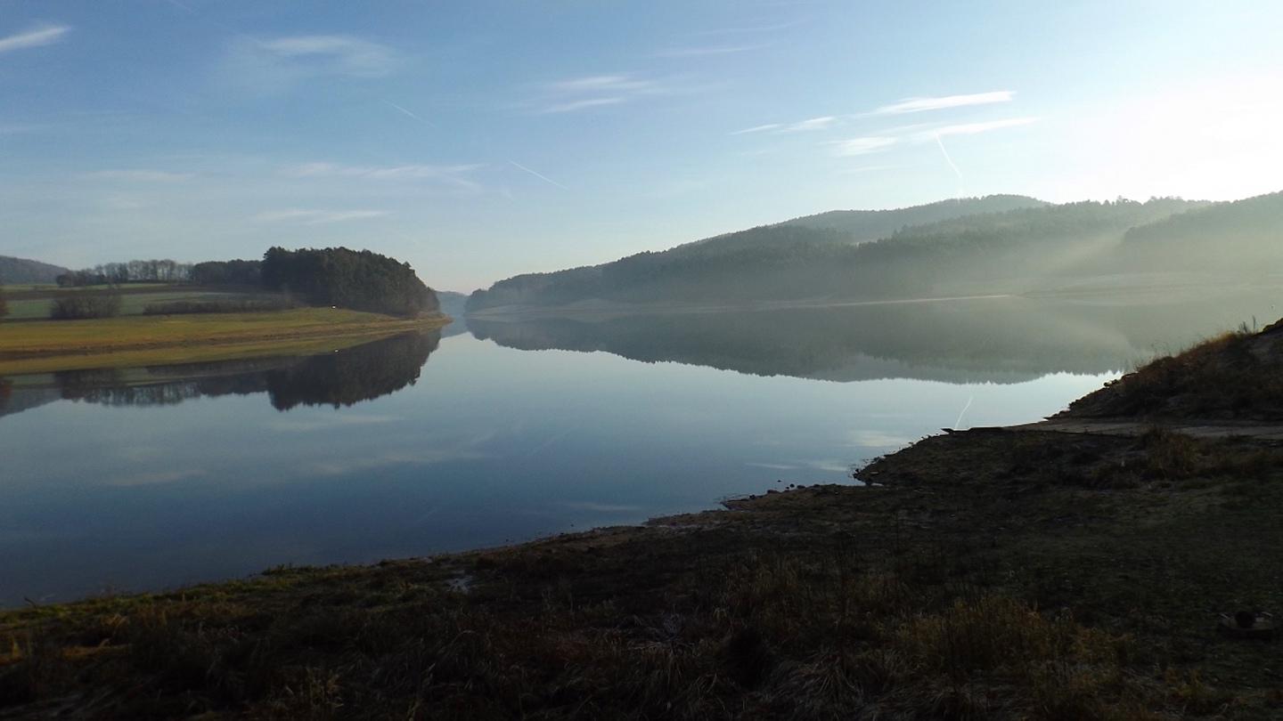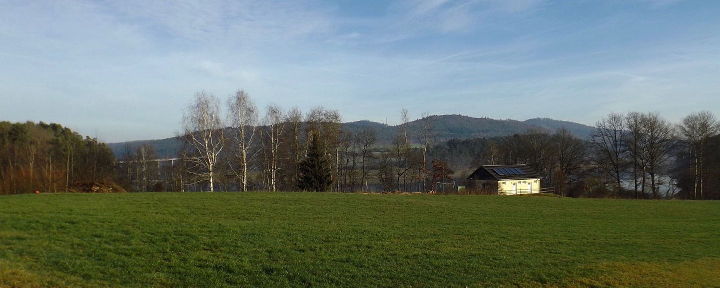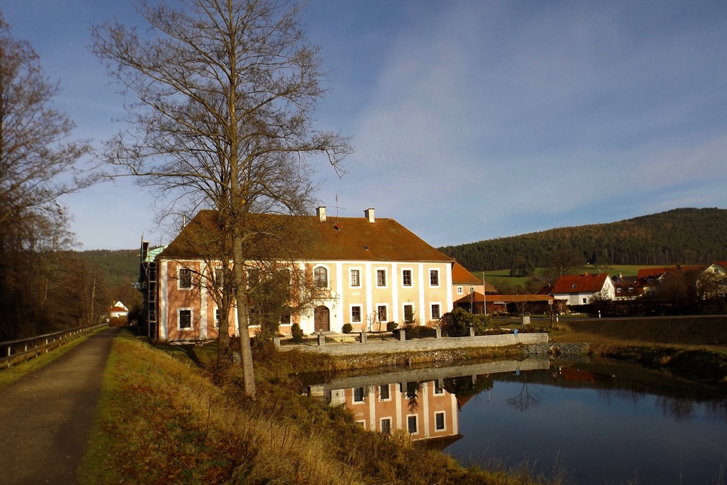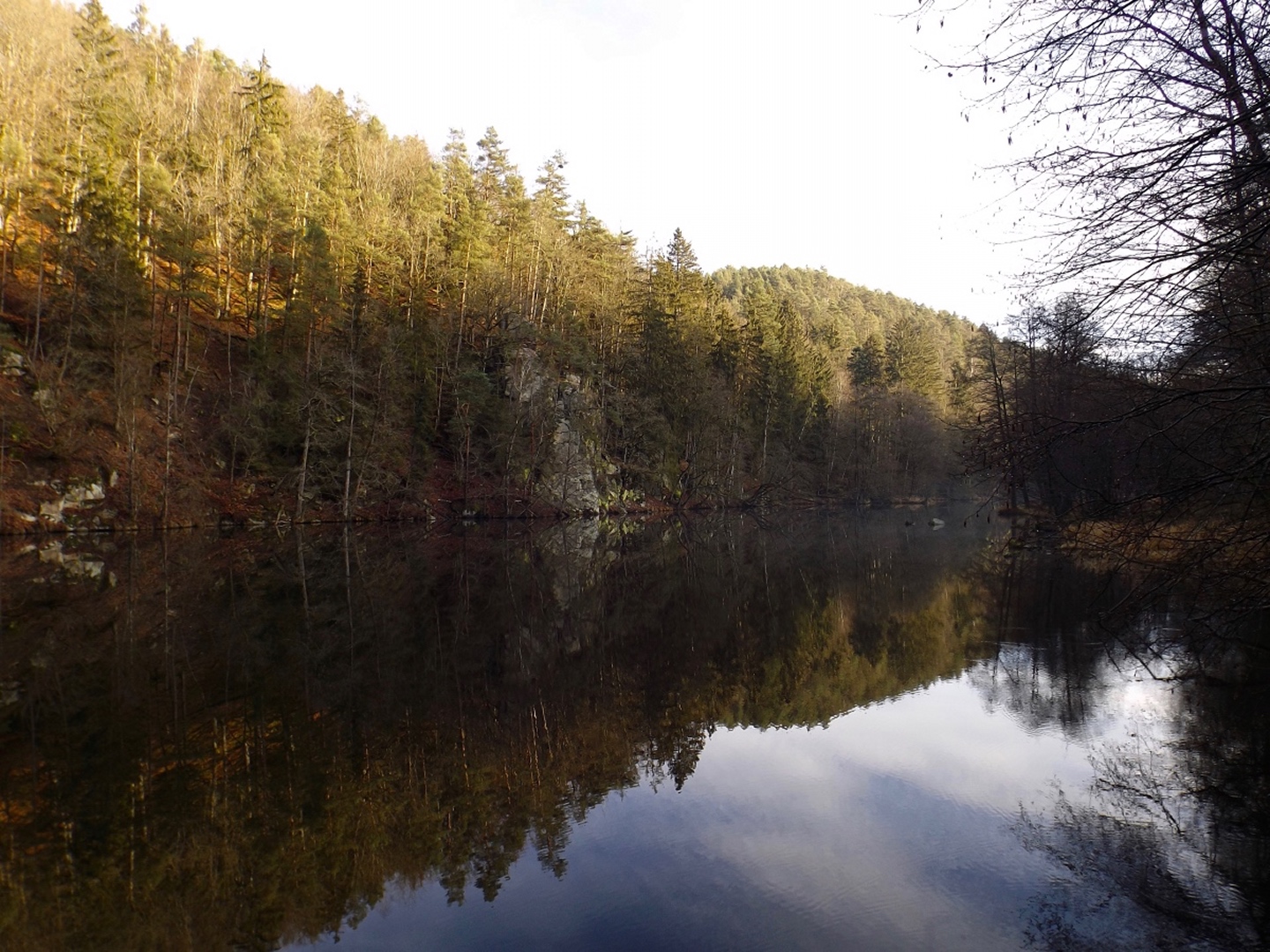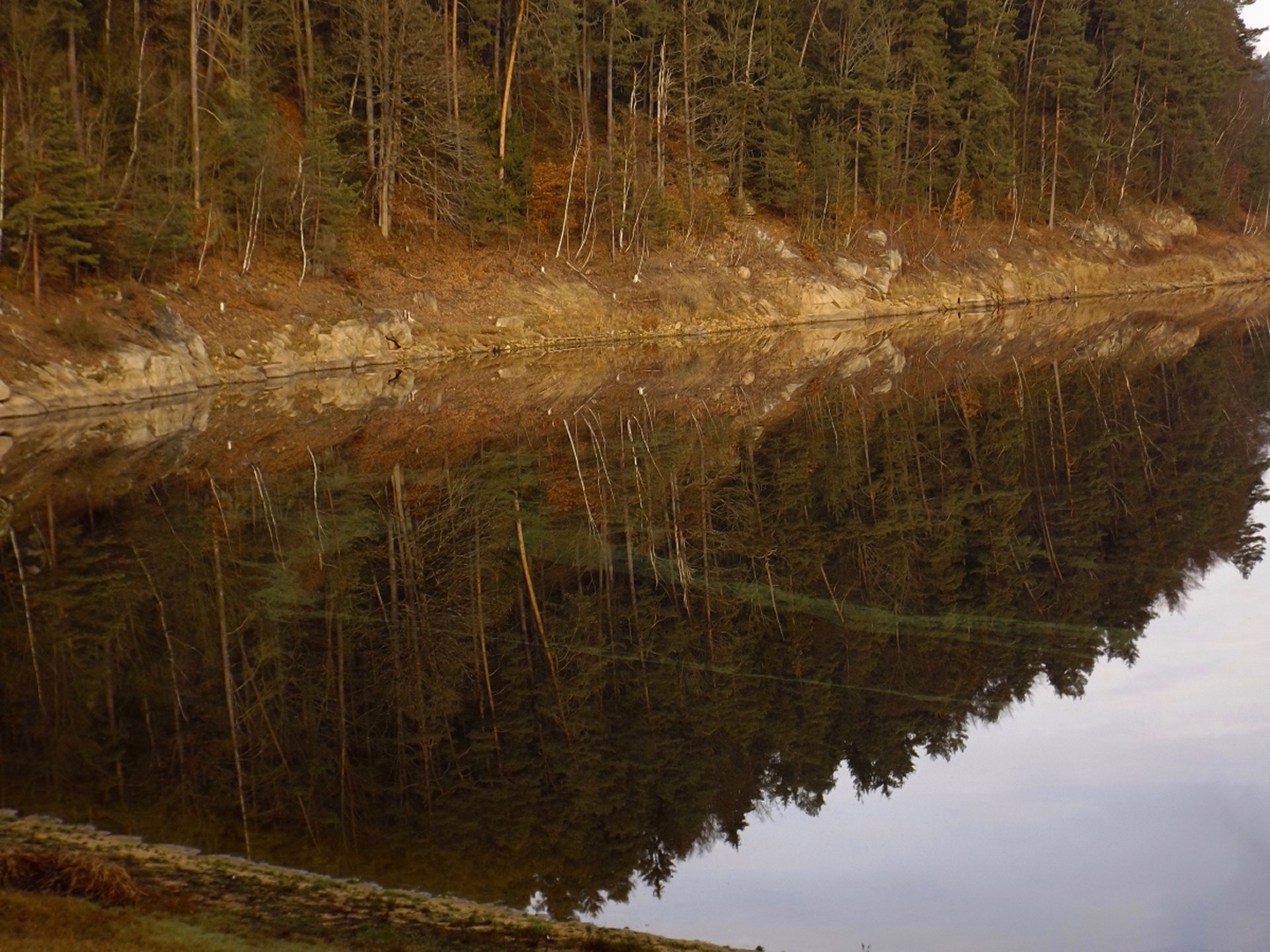 Da dann auch noch die Sonne dem Nebel ziemlich den Garaus machte, waren auch jede Menge Teilnehmer unterwegs und ich musste das Auto am Krankenhaus, ziemlich weit von der Schule entfernt, abstellen, was allerdings am Ende eine kleine Abkürzung ermöglichte. Zur Strecke möchte ich gar nicht viel schreiben, es ging hinter der Schule zur ehemaligen Bahnstrecke, auf dieser zur Schwarzachtalhalle und dort rechts und hinauf nach Gütenland. Dort war die erste Stempel- und Verpflegungsstelle untergebracht, ich beschränkte mich allerdings aufgrund des Andrangs auf den Stempel und ging gleich weiter. Die Strecke führte jetzt zum Yachtclub und dort entlang des Eixendorfer Sees zum Staudamm. Hier war die Markierung etwas undeutlich, so dass ein Teil inclusive mir direkt am See entlang marschierte, während die andere Hälfte der Teilnehmer einen Pfad durch den Wald fand. An der Wiedervereinigungsstelle stand ein gemütliches Bankerl mit Seeblick, das ich zur ersten Brotzeit nutzte. Ich hatte nämlich mitgedacht und zwei Wurst-Käse-Brote im Rucksack. Einen Kilometer weiter verabschiedete ich mich von den zwei Dritteln der Teilnehmer, die sich auf die zehn Kilometer beschränkten und deshalb an einer Weggabelung den linken Ast zum Dorrerkeller und wieder hinunter nach Neunburg nahmen. Ich hatte aber die 16er-Runde geplant (die sich dann als 17,5er erwies) und nahm den rechten Weg. Ab dem Staudamm, bis zu dem noch zwei Mal der markierte Wanderweg zugunsten einer Forststraße verlassen wurde, nur um ein paar hundert Meter später wieder auf ihn zurückzukehren, aber man wollte wohl das Stolperrisiko minimieren, ging es bis zum Ende auf der früheren Bahnlinie, jetzt Radweg und Goldsteig, weiter, die sich am Hang der Bockskirn durch das Schwarzachtal erstreckt. Ich hätte gerne geschrieben windet, aber dafür ist sie zu gerade. Unterwegs passierten die Teilnehmer mehrere ehemalige Glasschleifen und kleinere Stauanlagen und natürlich die zweite Stempelstelle, die im gleichen Bauwagen untergebracht war wie immer. Er war extra dafür nach Mittermurnthal herausgezogen worden. Hier hätte ich ohne großen Andrang ein Supperl haben können, und das sogar gratis, aber ich hatte den Wagen zu spät gesehen und deshalb 100 Meter vorher auf einem weiteren schönen Bankerl das zweite Brot vertilgt und deshalb keinen Hunger mehr. Gleich danach stellte ich fest, dass ich nicht die einzige Teilnehmerin mit guter Kamera war und unterhielt mich bis zum nächsten Foto mit einem netten älteren Herrn aus Fürth. Der ging aber weiter und verschwand bald aus meinem Blick, war auch nicht wichtig. Dumm war hingegen der leichte Hexenschuss, der mich kurz hinter Kröblitz ereilte und die letzten zwei Kilometer doch sehr unangenehm machte. Aus diesem Grund verzichtete ich auch darauf, noch einmal in der Schule vorbeizuschauen und die Organisatoren für die Strecke zu loben, sondern ging am Ende des Radwegs geradeaus weiter und direkt zum Auto.