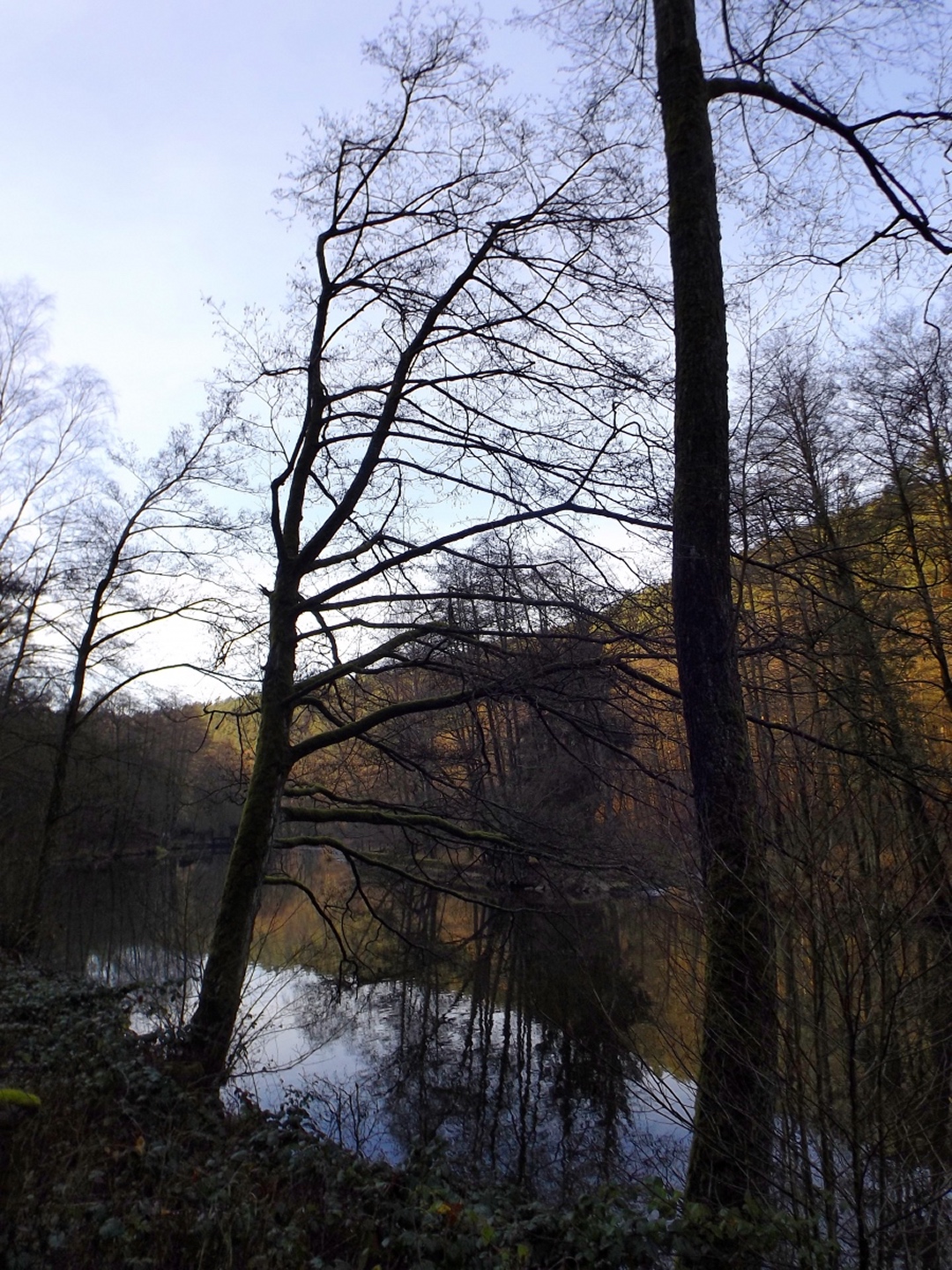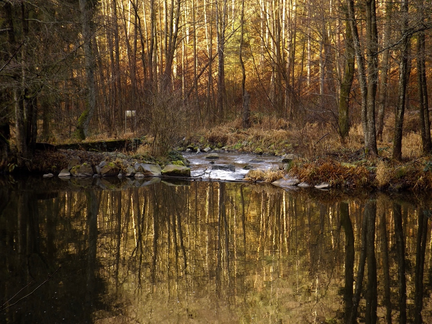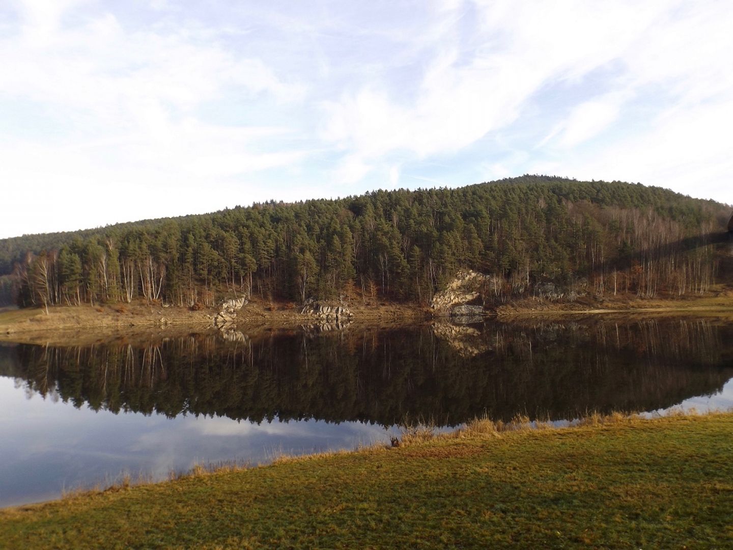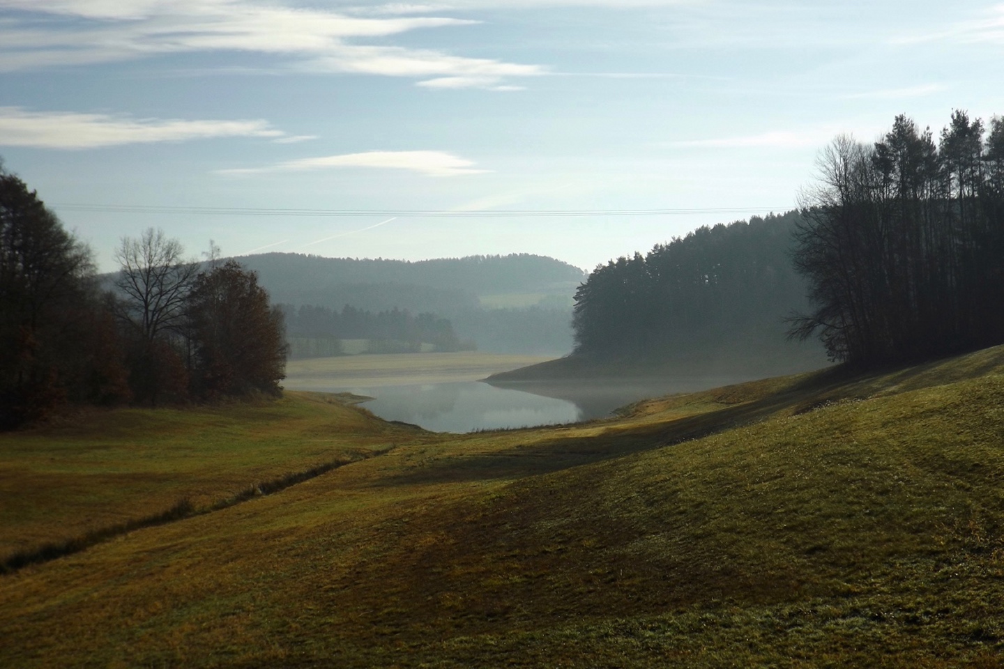 Da dann auch noch die Sonne dem Nebel ziemlich den Garaus machte, waren auch jede Menge Teilnehmer unterwegs und ich musste das Auto am Krankenhaus, ziemlich weit von der Schule entfernt, abstellen, was allerdings am Ende eine kleine Abkürzung ermöglichte. Zur Strecke möchte ich gar nicht viel schreiben, es ging hinter der Schule zur ehemaligen Bahnstrecke, auf dieser zur Schwarzachtalhalle und dort rechts und hinauf nach Gütenland. Dort war die erste Stempel- und Verpflegungsstelle untergebracht, ich beschränkte mich allerdings aufgrund des Andrangs auf den Stempel und ging gleich weiter. Die Strecke führte jetzt zum Yachtclub und dort entlang des Eixendorfer Sees zum Staudamm. Hier war die Markierung etwas undeutlich, so dass ein Teil inclusive mir direkt am See entlang marschierte, während die andere Hälfte der Teilnehmer einen Pfad durch den Wald fand. An der Wiedervereinigungsstelle stand ein gemütliches Bankerl mit Seeblick, das ich zur ersten Brotzeit nutzte. Ich hatte nämlich mitgedacht und zwei Wurst-Käse-Brote im Rucksack. Einen Kilometer weiter verabschiedete ich mich von den zwei Dritteln der Teilnehmer, die sich auf die zehn Kilometer beschränkten und deshalb an einer Weggabelung den linken Ast zum Dorrerkeller und wieder hinunter nach Neunburg nahmen. Ich hatte aber die 16er-Runde geplant (die sich dann als 17,5er erwies) und nahm den rechten Weg. Ab dem Staudamm, bis zu dem noch zwei Mal der markierte Wanderweg zugunsten einer Forststraße verlassen wurde, nur um ein paar hundert Meter später wieder auf ihn zurückzukehren, aber man wollte wohl das Stolperrisiko minimieren, ging es bis zum Ende auf der früheren Bahnlinie, jetzt Radweg und Goldsteig, weiter, die sich am Hang der Bockskirn durch das Schwarzachtal erstreckt. Ich hätte gerne geschrieben windet, aber dafür ist sie zu gerade. Unterwegs passierten die Teilnehmer mehrere ehemalige Glasschleifen und kleinere Stauanlagen und natürlich die zweite Stempelstelle, die im gleichen Bauwagen untergebracht war wie immer. Er war extra dafür nach Mittermurnthal herausgezogen worden. Hier hätte ich ohne großen Andrang ein Supperl haben können, und das sogar gratis, aber ich hatte den Wagen zu spät gesehen und deshalb 100 Meter vorher auf einem weiteren schönen Bankerl das zweite Brot vertilgt und deshalb keinen Hunger mehr. Gleich danach stellte ich fest, dass ich nicht die einzige Teilnehmerin mit guter Kamera war und unterhielt mich bis zum nächsten Foto mit einem netten älteren Herrn aus Fürth. Der ging aber weiter und verschwand bald aus meinem Blick, war auch nicht wichtig. Dumm war hingegen der leichte Hexenschuss, der mich kurz hinter Kröblitz ereilte und die letzten zwei Kilometer doch sehr unangenehm machte. Aus diesem Grund verzichtete ich auch darauf, noch einmal in der Schule vorbeizuschauen und die Organisatoren für die Strecke zu loben, sondern ging am Ende des Radwegs geradeaus weiter und direkt zum Auto.