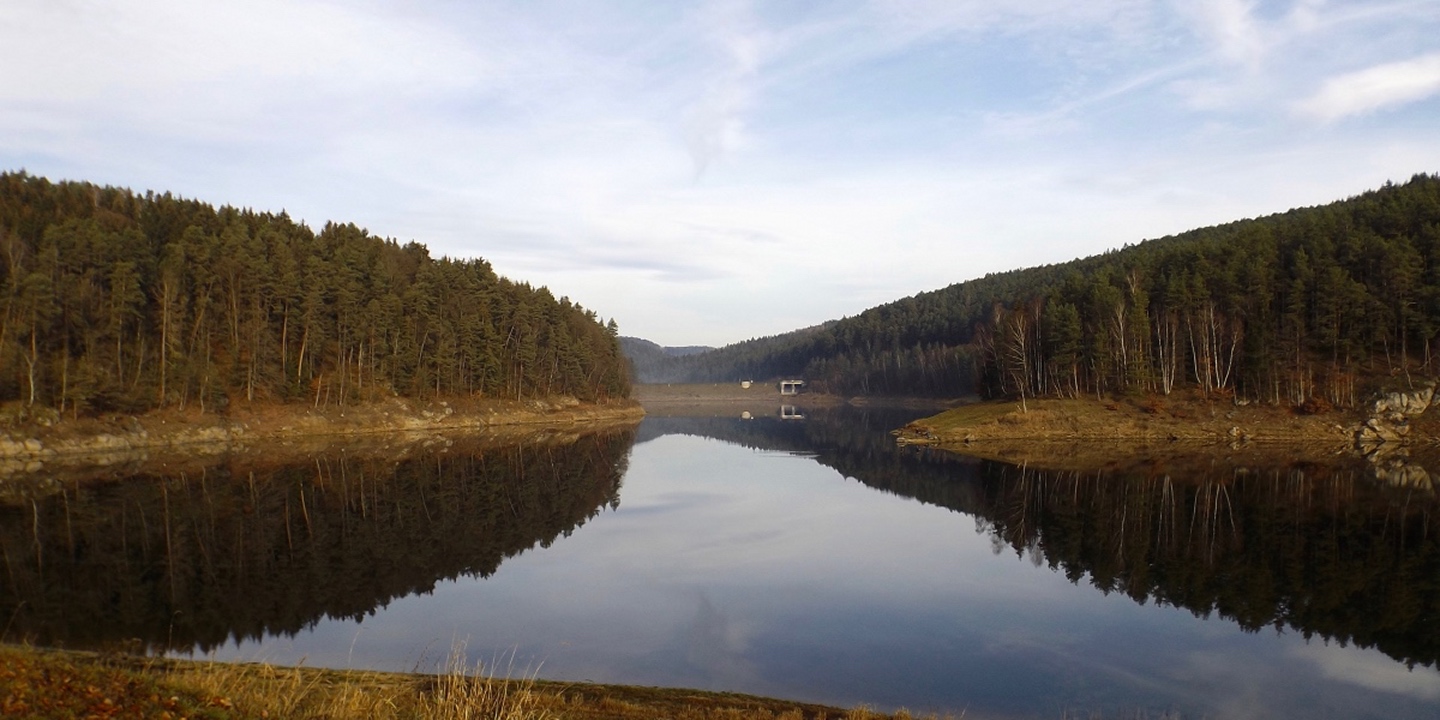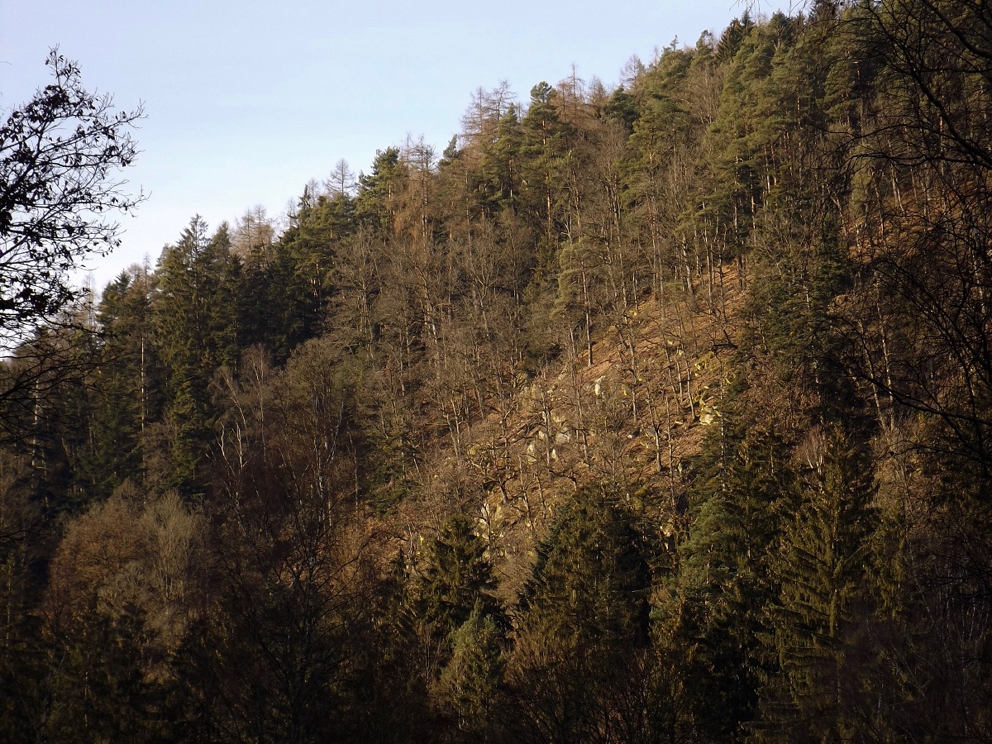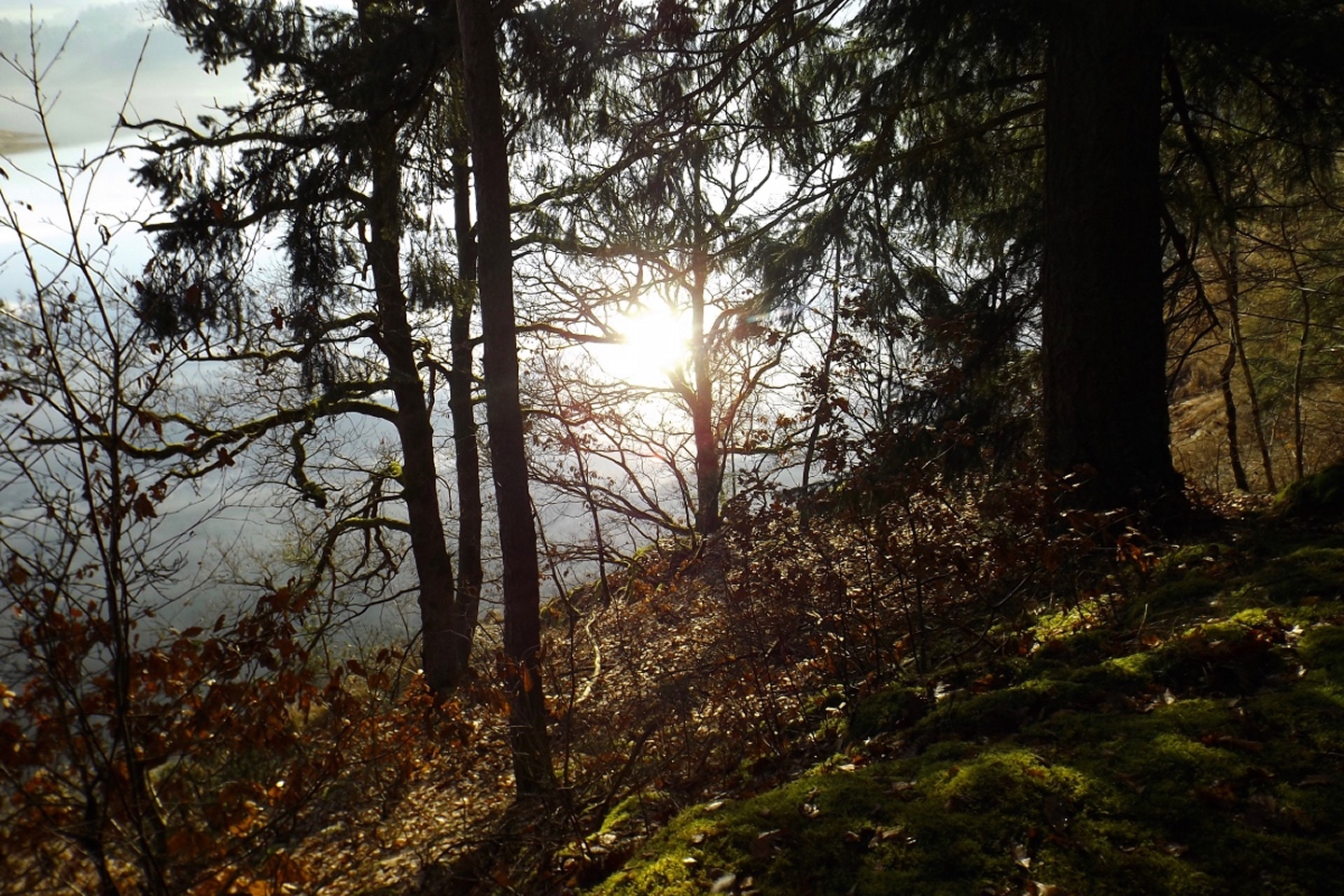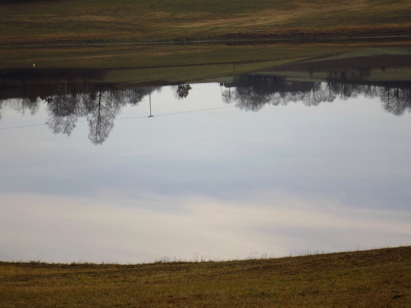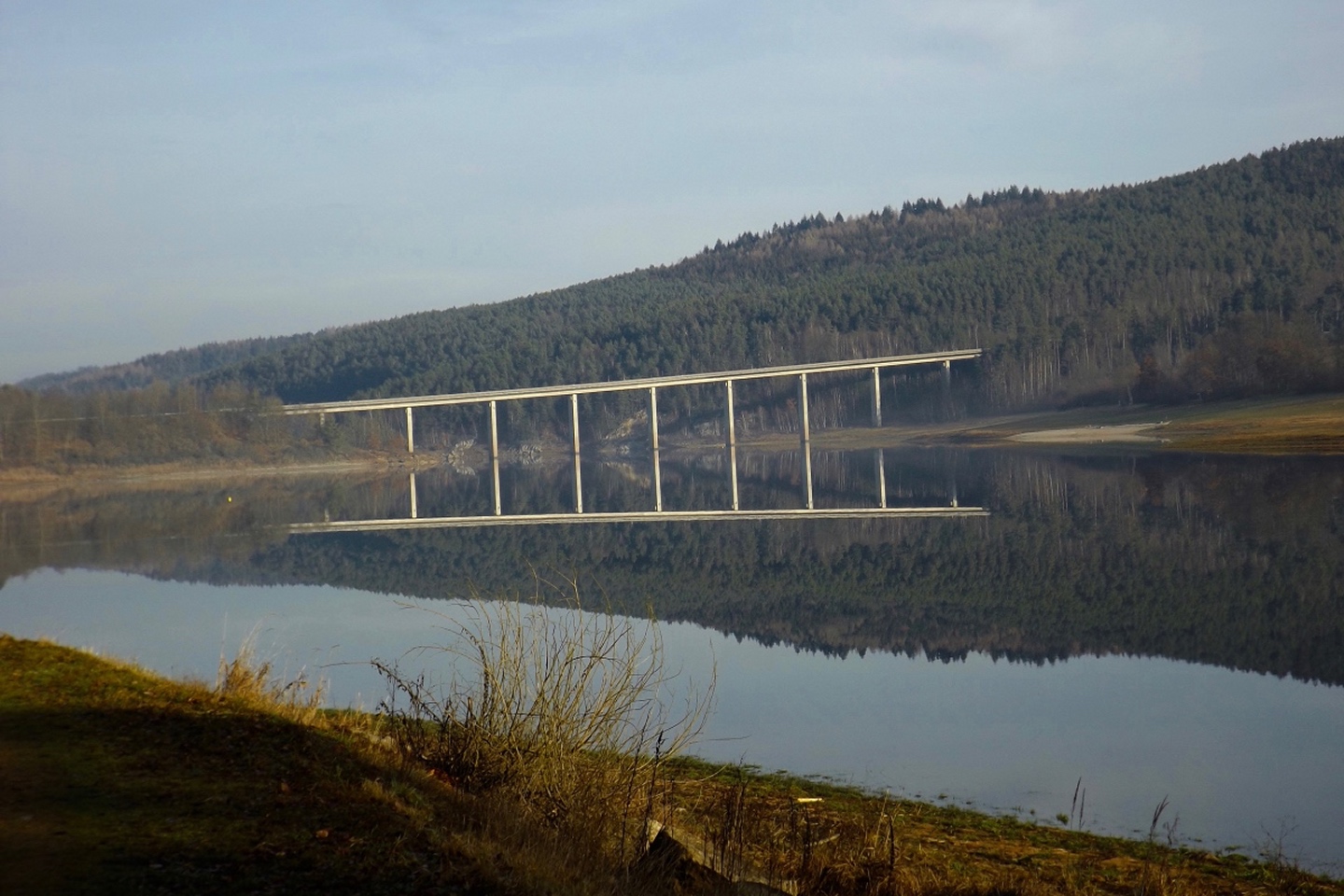 Da dann auch noch die Sonne dem Nebel ziemlich den Garaus machte, waren auch jede Menge Teilnehmer unterwegs und ich musste das Auto am Krankenhaus, ziemlich weit von der Schule entfernt, abstellen, was allerdings am Ende eine kleine Abkürzung ermöglichte. Zur Strecke möchte ich gar nicht viel schreiben, es ging hinter der Schule zur ehemaligen Bahnstrecke, auf dieser zur Schwarzachtalhalle und dort rechts und hinauf nach Gütenland. Dort war die erste Stempel- und Verpflegungsstelle untergebracht, ich beschränkte mich allerdings aufgrund des Andrangs auf den Stempel und ging gleich weiter. Die Strecke führte jetzt zum Yachtclub und dort entlang des Eixendorfer Sees zum Staudamm. Hier war die Markierung etwas undeutlich, so dass ein Teil inclusive mir direkt am See entlang marschierte, während die andere Hälfte der Teilnehmer einen Pfad durch den Wald fand. An der Wiedervereinigungsstelle stand ein gemütliches Bankerl mit Seeblick, das ich zur ersten Brotzeit nutzte. Ich hatte nämlich mitgedacht und zwei Wurst-Käse-Brote im Rucksack. Einen Kilometer weiter verabschiedete ich mich von den zwei Dritteln der Teilnehmer, die sich auf die zehn Kilometer beschränkten und deshalb an einer Weggabelung den linken Ast zum Dorrerkeller und wieder hinunter nach Neunburg nahmen. Ich hatte aber die 16er-Runde geplant (die sich dann als 17,5er erwies) und nahm den rechten Weg. Ab dem Staudamm, bis zu dem noch zwei Mal der markierte Wanderweg zugunsten einer Forststraße verlassen wurde, nur um ein paar hundert Meter später wieder auf ihn zurückzukehren, aber man wollte wohl das Stolperrisiko minimieren, ging es bis zum Ende auf der früheren Bahnlinie, jetzt Radweg und Goldsteig, weiter, die sich am Hang der Bockskirn durch das Schwarzachtal erstreckt. Ich hätte gerne geschrieben windet, aber dafür ist sie zu gerade. Unterwegs passierten die Teilnehmer mehrere ehemalige Glasschleifen und kleinere Stauanlagen und natürlich die zweite Stempelstelle, die im gleichen Bauwagen untergebracht war wie immer. Er war extra dafür nach Mittermurnthal herausgezogen worden. Hier hätte ich ohne großen Andrang ein Supperl haben können, und das sogar gratis, aber ich hatte den Wagen zu spät gesehen und deshalb 100 Meter vorher auf einem weiteren schönen Bankerl das zweite Brot vertilgt und deshalb keinen Hunger mehr. Gleich danach stellte ich fest, dass ich nicht die einzige Teilnehmerin mit guter Kamera war und unterhielt mich bis zum nächsten Foto mit einem netten älteren Herrn aus Fürth. Der ging aber weiter und verschwand bald aus meinem Blick, war auch nicht wichtig. Dumm war hingegen der leichte Hexenschuss, der mich kurz hinter Kröblitz ereilte und die letzten zwei Kilometer doch sehr unangenehm machte. Aus diesem Grund verzichtete ich auch darauf, noch einmal in der Schule vorbeizuschauen und die Organisatoren für die Strecke zu loben, sondern ging am Ende des Radwegs geradeaus weiter und direkt zum Auto.