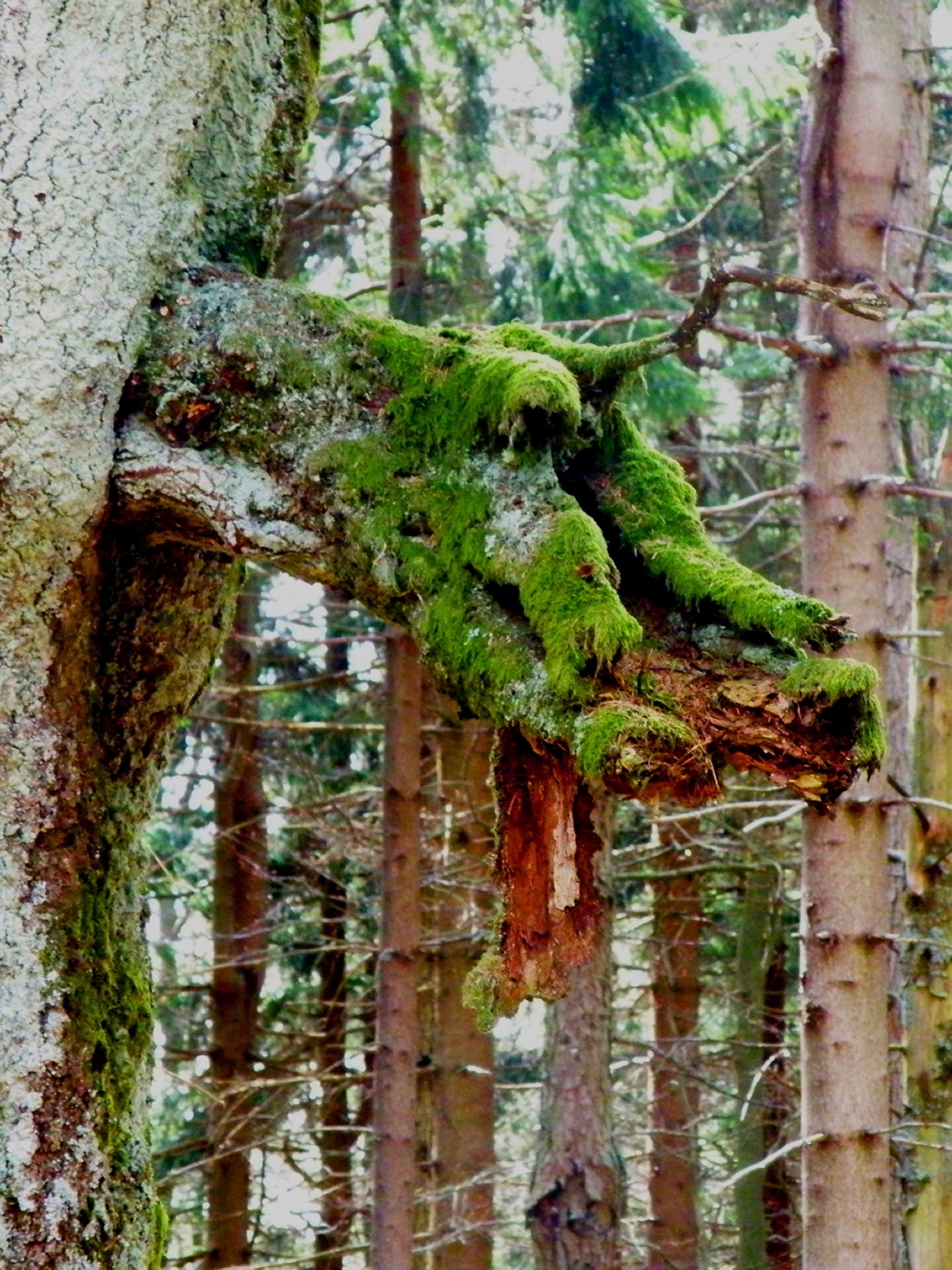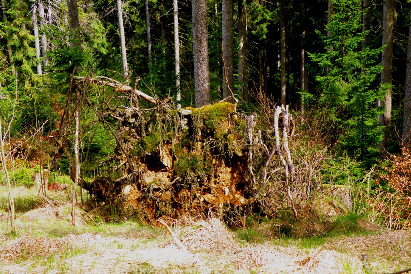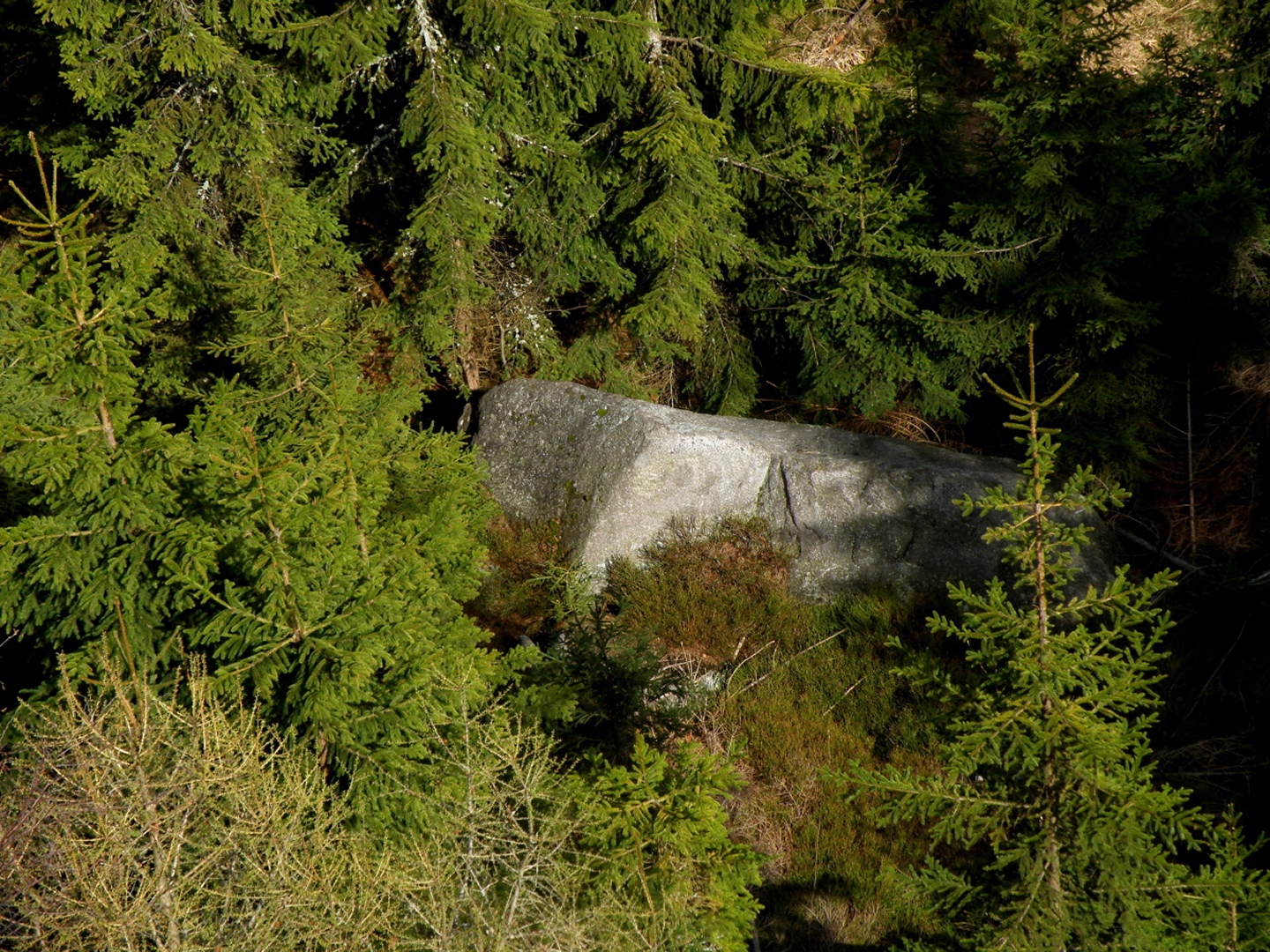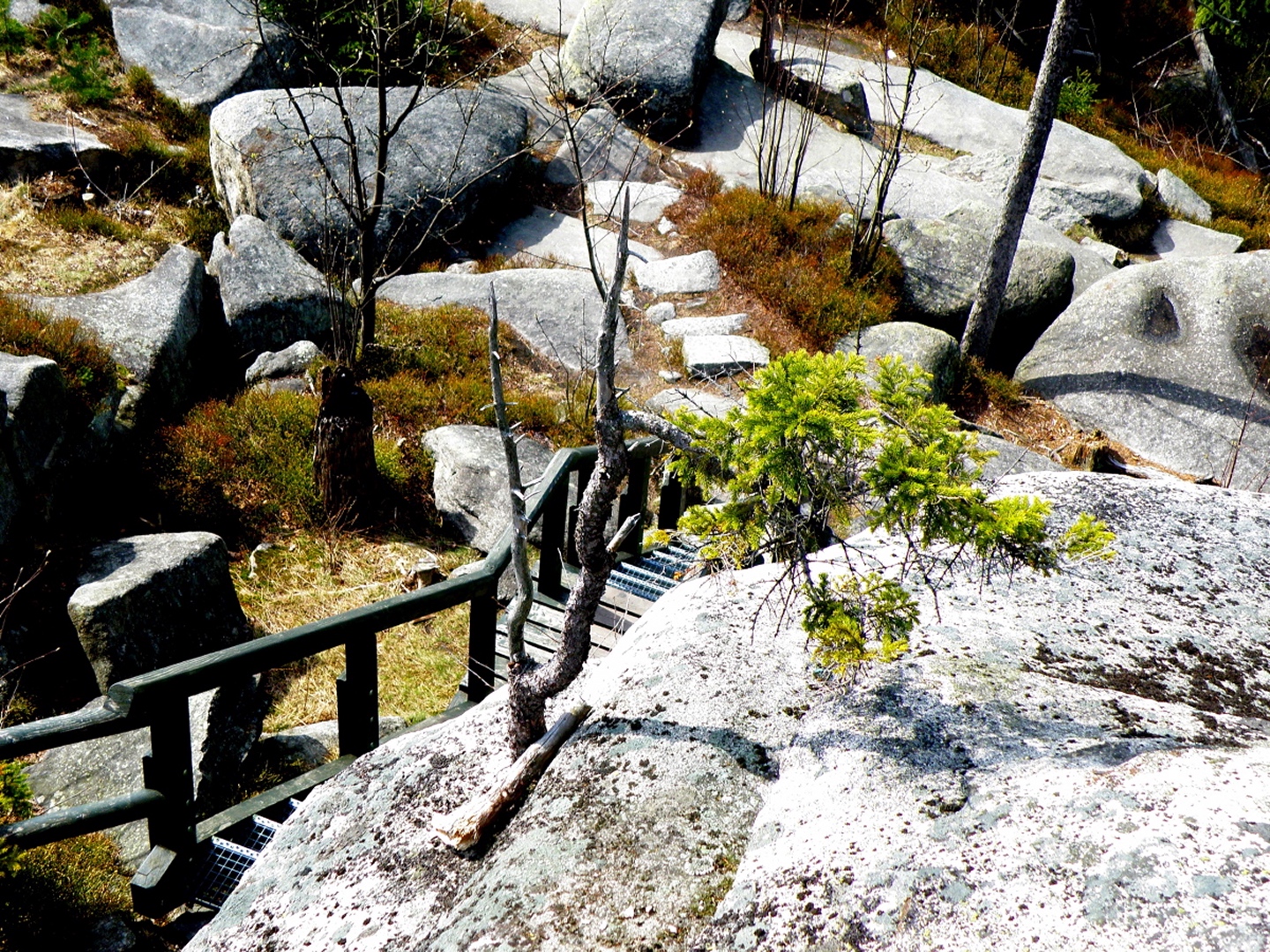 Von der Luisenburg ging es zunächst auf der Fahrstraße, dann dem roten H folgend auf dem Rodelbahnaufstieg und später im Wald hinauf zum Großen Haberstein. Auf dem Stichweg dorthin gab es das größte Kletterhindernis, einen umgestürzten Baum, der über einer leicht abschüssigen Felsplatte lag (I). Oben auf dem Gipfel war es extrem ungemütlich, der Wind fegte mit zweistelligen Metern pro Sekunde über uns hinweg. Also schnell hinab und am Kleinen Haberstein vorbei den markierten und beschilderten Weg in den Sattel zwischen Kleiner und Großer Kösseine. Beschilderung und Karte stimmen nicht immer überein, was uns vor allem im Abstieg doch gewaltig verwirrt hat, aber wir haben problemlos hingefunden. Die Kleine Kösseine haben wir uns gespart, sondern sind sofort über die Treppe zum Kösseinehaus gegangen, wo es erst mal eine zünftige Brotzeit und anschließend Streicheleinheiten für die Hüttenhündin gab. Danach folgte ein kurzer Abstecher auf den Aussichtsturm, wo es genauso windig war wie auf dem Haberstein und wir außerdem eine vom Ochsenkopf herziehende Hagelfront beobachten konnten. Diese erwischte uns kurz unterhalb der Bergwachthütte auf der Forststraße, war aber nach weniger als einer Minute wieder vorbei, so dass der Regenüberzug ziemlich überflüssig war. Am Büttnerfelsbrunnen vorbei folgten wir der Forststraße, von der wir uns nicht sicher waren, ob es die richtige sei (sie war es), verpassten eine Abzweigung und landeten schließlich bei der Kreuzung mit dem Aufstiegsweg. Diesem folgten wir bis zur Abzweigung zu den Habersteinen, gingen aber geradeaus zum Burgstein, den wir bei strahlendem Sonnenschein auch noch bestiegen. Hier waren die Stufen deutlich angenehmer als am Haberstein, und auch der Wind hatte sich inzwischen gelegt. Weiter ging es der Beschilderung nach bis zu einer weiteren Forststraße, an der wir geradeaus zum Kaiserfelsen kommt. Eny taten aber inzwischen die Füße etwas weh, so dass wir auf den vierten Gipfel verzichteten und stattdessen über die Forststraße zur Freiluftbühne und dem Parkplatz zurückkehrten.