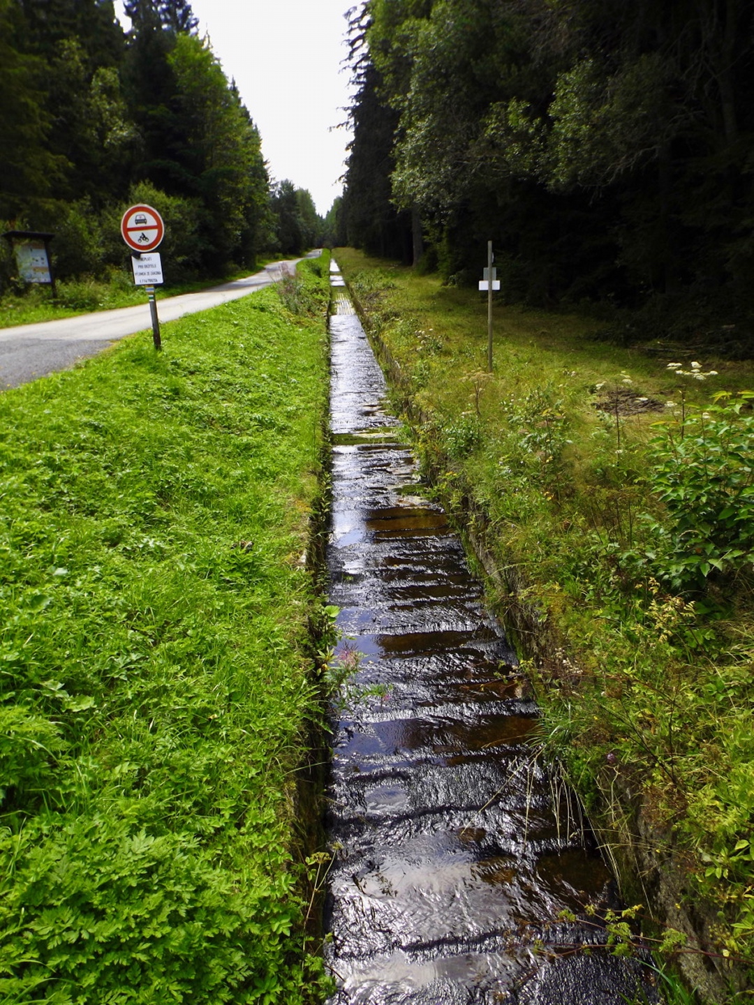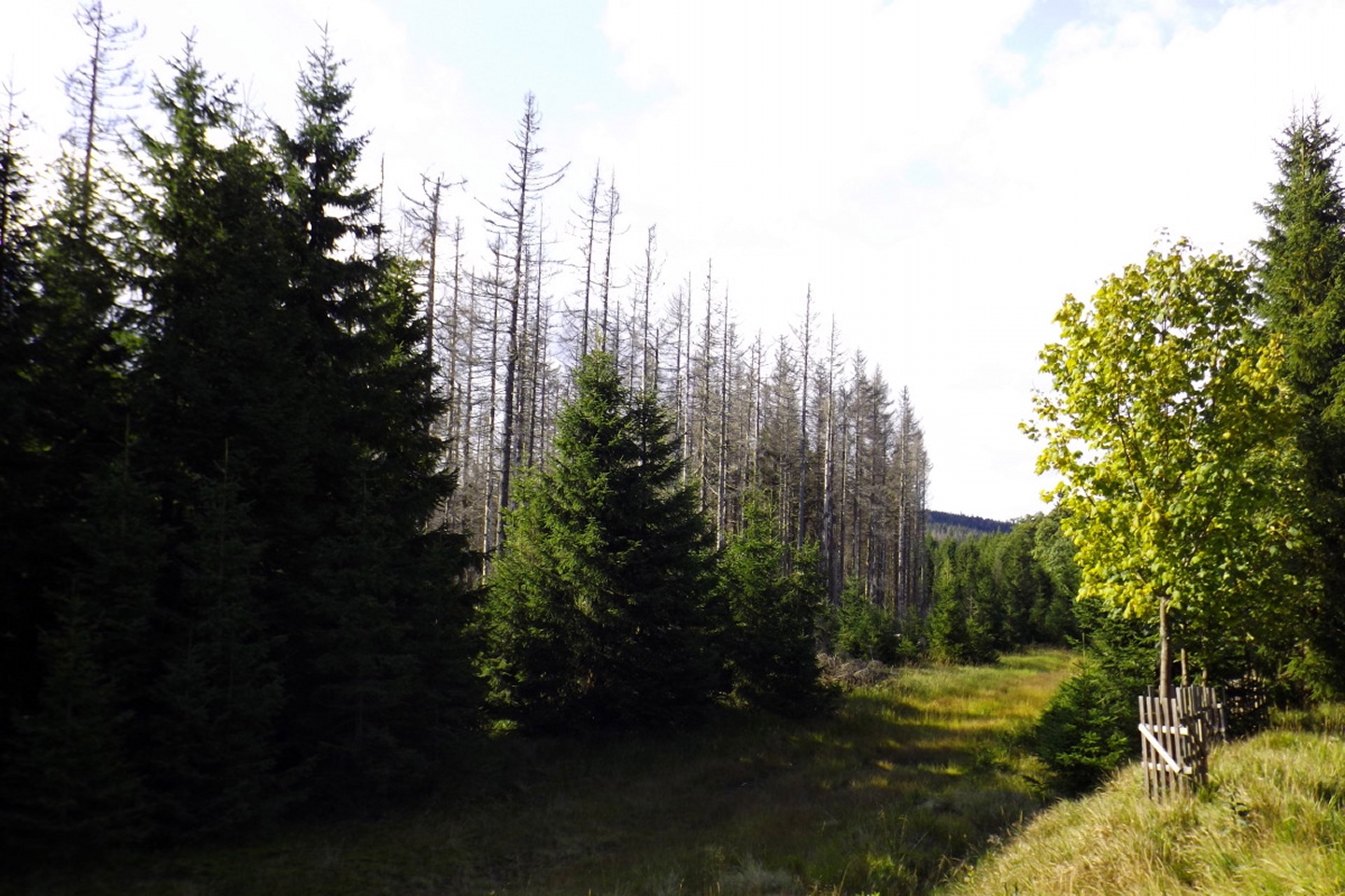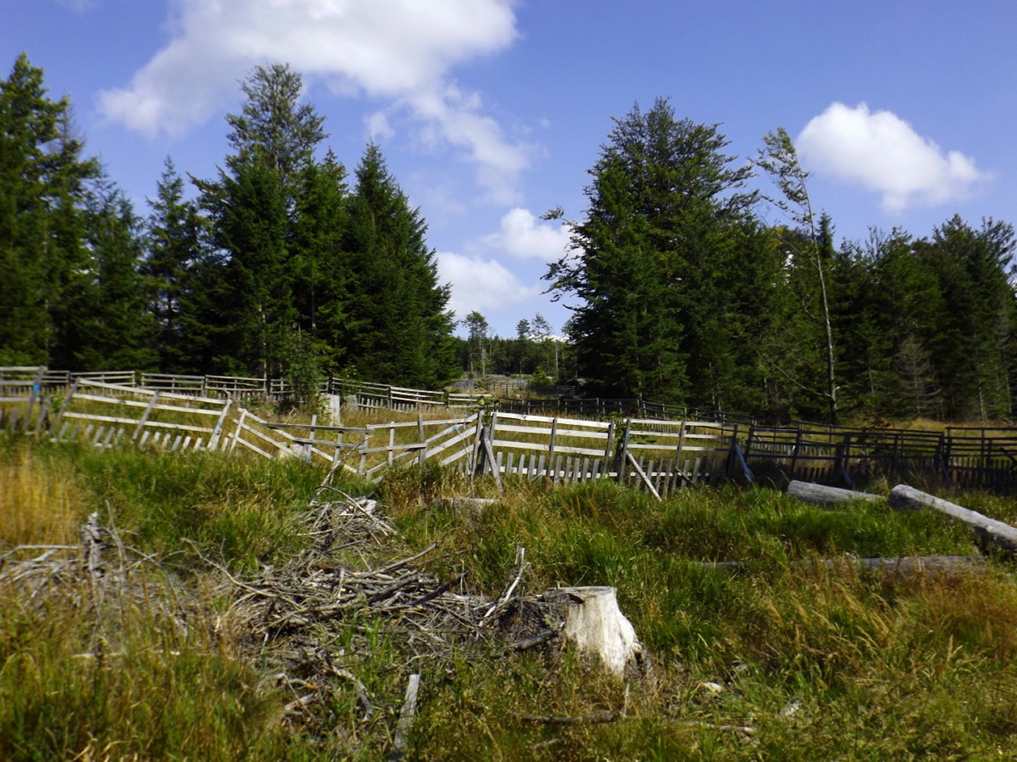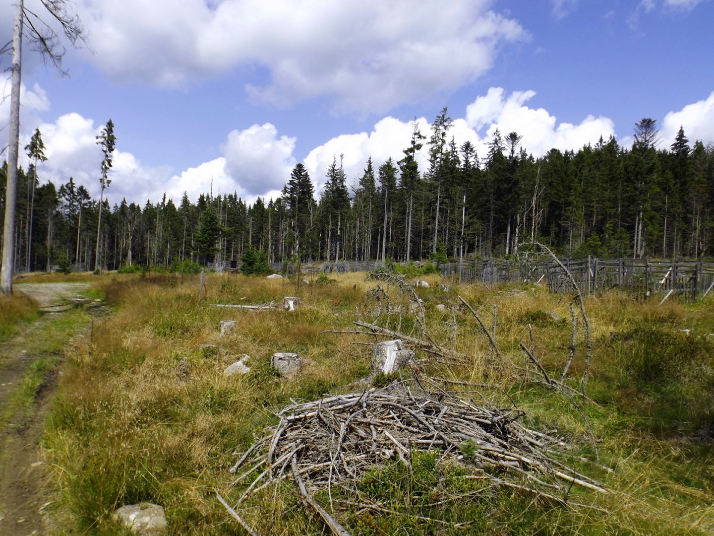 Das Schöne daran ist, dass diese Tour locker als Nachmittagstour durchführbar ist. Ich musste nämlich vor der Abfahrt noch auf einen Anruf warten und konnte deshalb erst um zehn Uhr losdüsen und war nach Herbergssuche und Einchecken in der Penzion Škarda ziemlich genau um 13 Uhr am Wanderparkplatz am westlichen Ortseingang von Srní-Mechov. Von dort aus folgte ich bei 14 Grad mit Regenjacke über dem T-Shirt dem auch für Radlfahrer geeigneten Weg entlang eines kleinen und fast ausgetrockneten Kanals, der nach 500 Metern den Wanderweg nach Srní kreuzt, auf dem ich später wieder zurückkommen sollte. Gleich nach der Kreuzung ist der Grund für die Wasserknappheit im Kanälchen ersichtlich: Ein Pumpwerk befördert das Wasser, das auf dessen anderer Seite reichlich und fröhlich dahinfließt, unterirdisch Richtung Srní. Das ganze nennt sich Vchynicko-Tetovský-Kanal und zweigt unterhalb von Modrava von der Vydra ab. Diesem Kanal mit benachbartem Weg folgte ich bis zum Abzweig Ke kapli mit seiner witzigen Kanalbrücke, an dem ich zur Ruine der Hauswaldkapelle hinaufging. Diese Ruine ist inzwischen schon wieder ein kleiner Wallfahrtsort, war aber während des Kalten Krieges den militärischen Bedürfnissen des Warschauer Paktes zum Opfer gefallen. Oberhalb der Kapelle gibt es eine Quelle, dessen Wasser über ein hölzernes Aquädukt in ein hübsches Becken direkt am ehemaligen Eingang geleitet wird. Neben dem Becken stehen Tassen, aus denen jeder von dem Wasser, das natürlich heilende Kräfte hat, trinken kann. Das Ganze ist übrigens gratis, in Deutschland und der Schweiz überhaupt nicht und in Österreich noch weniger vorstellbar. Nach einer kleinen meditativen Rast, bei der ich einfach nur das Plätschern der Quelle auf mich wirken ließ, folgte ich dem Aquädukt bis zur tatsächlichen Quelle und ging von dort aus auf dem Wanderweg weiter nach Süden. In diesem Abschnitt ist er als Themenweg für den böhmischen Dichter Karel Klostermann hergerichtet, dessen schönste Gedichte in unregelmäßigen Abständen auf Holztafeln am Wegesrand zu lesen sind. Leider beschränkt sich mein tschechisch auf fünf oder sechs Begriffe, von denen ich höchstens einmal „dobre“ in den Gedichten finden konnte, soll heißen, ich habe leider nichts davon verstanden. Nach knapp zwei abwechslungsreichen Kilometern und etwas Auf und Ab kam ich zurück zum Kanal und wenige Meter später an den Abzweig Hakešická cesta, an dem ich nach rechts Richtung Pod Oblíkem abbog. Ab jetzt ging es knapp zwei Kilometer relativ steil bergauf (und in die Gegenrichtung bergab, was die tschechischen Behörden zu einem witzigen Warnschild für Radlfahrer verleitete) und im weiteren Verlauf nach Javoří pila auch wieder ein bisserl bergab. Unfreundlicherweise begann es kurz vor Hakešická cesta leicht zu regnen, freundlicherweise aber nur leicht und nur etwa vier Minuten lang, so dass die Kapuze in der Regenjacke bleiben konnte. Zwischendurch gelang es mir, eine Meise auf einem Ast so zu fotografieren, dass das Ergebnis auch scharf und unverwackelt wurde, leider aber zu dunkel, um in diesem Bericht berücksichtigt zu werden. Javoří pila ist in der Karte als bývala (Wüstung) verzeichnet, allerdings konnte ich außer einem wunderschönen Hochmoor, das überraschenderweise nicht vollständig I. zóna NP ist, nur einen feinen Rastplatz entdecken. Die nächsten 400 Meter folgte ich nach rechts der Asphaltstraße, die von Modrava herkommt und zum Poledník weiterführt, bis zum Abzweig Tmavý potok, von dem aus der Weg wieder nach rechts hinauf zum Sattel und Gipfel des Oblík abzweigt. Der Weiterweg zum Poldeník ist ab hier die längste Zeit des Jahres gesperrt, eine besondere und begrüßenswerte Naturschutzmaßnahme. Radlfahrer müssen sogar immer rechts abbiegen, weil sie mit ihrem Tempo einige seltene Tierarten scheinbar ganz extrem stören. Dafür darf das Personal des Polednik-Aussichtsturms mit dem Geländewagen hochfahren, aber das sind ja nur zwei Fahrzeuge pro Tag und Richtung während der sowieso stark eingeschränkten Öffnungszeiten. Auf etwa 1100 Metern kam mir ein Feuerwehrauto aus Kvilda entgegengebraust, keine Ahnung, was die Jungs vorhatten, zumindest konnte ich nirgend Rauchspuren entdecken. Vielleicht gehörte das Fahrzeug zur Absicherung des Filmsets, an dem ich zwischen Prášily und Mechov vorbeigekommen war, und wollte den Heimweg ein bisserl abkürzen. Ohne weitere Ereignisse, aber mit immer wieder schöner Szenerie, erreichte ich gegen 15.30 Uhr den Sattel Za Oblíkem, von dem aus ein angenehmerweise nicht asphaltierter Weg zum Gipfel hinauf führt. Dieser macht auf halbem Weg einen scharfen Knick nach links und wird ab dort zu einem richtig hübschen kleinen Bergpfad. Mittlerweile hatte die Sonne doch deutliche Lücken in die Wolkendecke gerissen und auch für gute Sichtverhältnisse gesorgt, so dass ich trotz ein bisserl Wind eine halbe Stunde auf dem Gipfel verblieb und das Rundumpanorama genoss. Ok, nach Westen hin ist der Poledník im Weg, so dass der Arber nicht sichtbar ist, dafür präsentieren sich Rachel, Lusen samt nördlichen Trabanten und im Osten der Boubín von ihrer besten Seite. Ja, ich finde die Nordostseite des Rachel noch schöner als die anderen, die man von den Bayerwaldgrößen aus bewundern kann, was vielleicht am Seltenheitswert der Perspektive liegt. Zwischen Poledník und Rachel ist auch das Bischofsmaiser Skigebiet zu erkennen, in dem ich vor fünf Wochen unterwegs gewesen bin. Anschließend kehrte ich auf dem Aufstiegsweg zurück zum Sattel und bog dort nach Norden ab, um die Umrundung zu vollenden. Ganz nebenbei ist der Rückweg auch nur halb so lang wie der Aufstieg und mindestens genauso interessant, weil zum Beispiel ein Wiesel zuerst über den Weg rannte und dann noch einmal umkehrte, um für ein Foto zu posieren. Zunächst geht es in leichtem Gefälle auf der Asphaltstraße weiter bis zum Abzweig Vaňkova cesta, an dem ich einmal mehr rechts abbog und eine