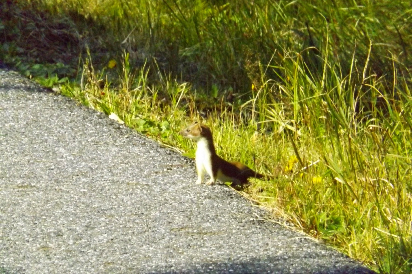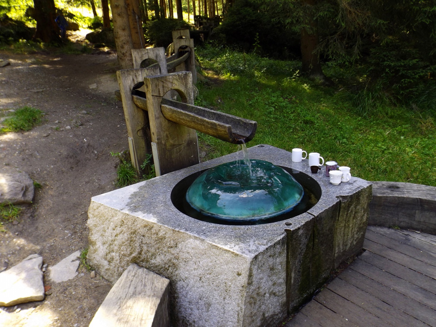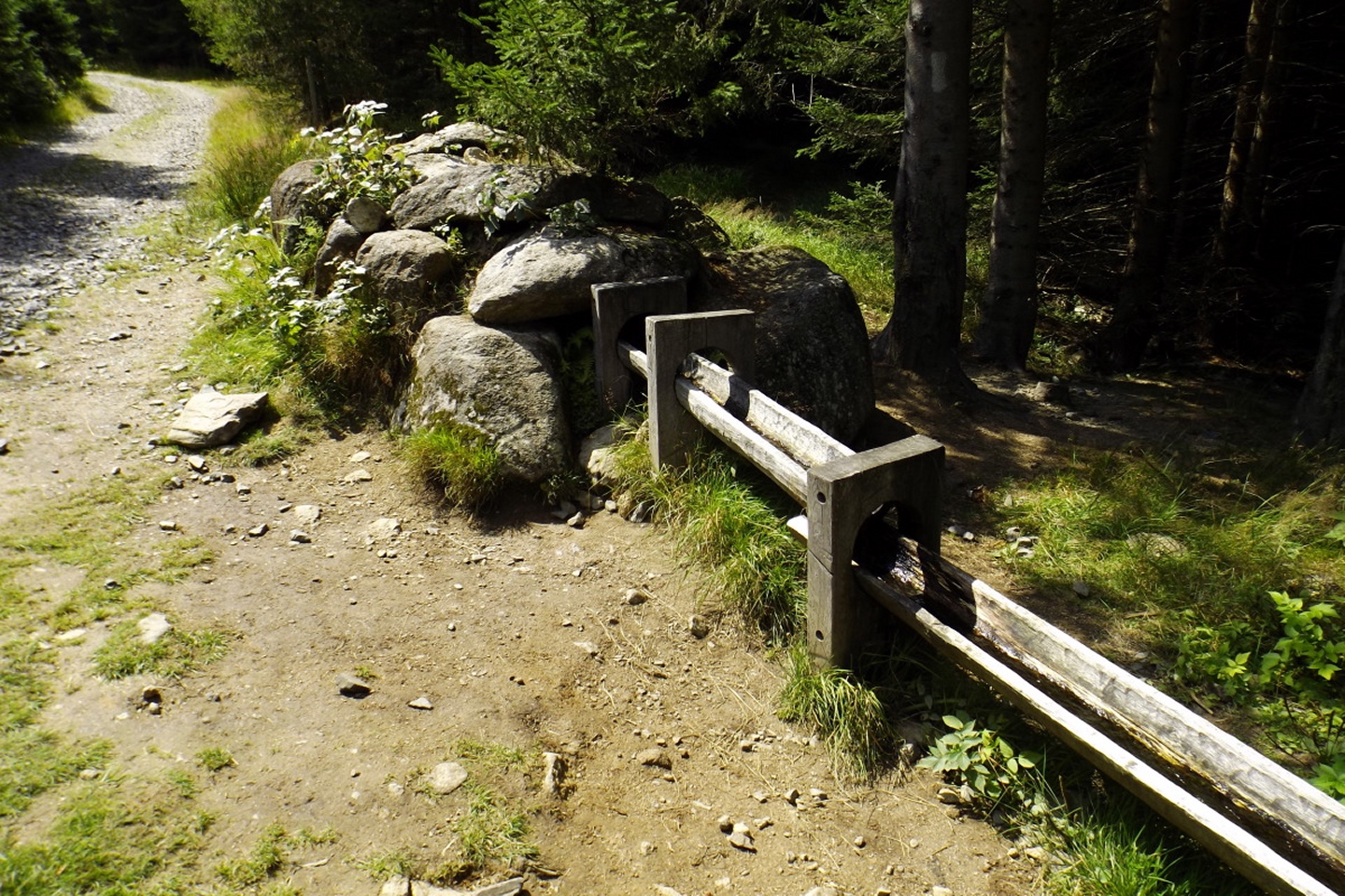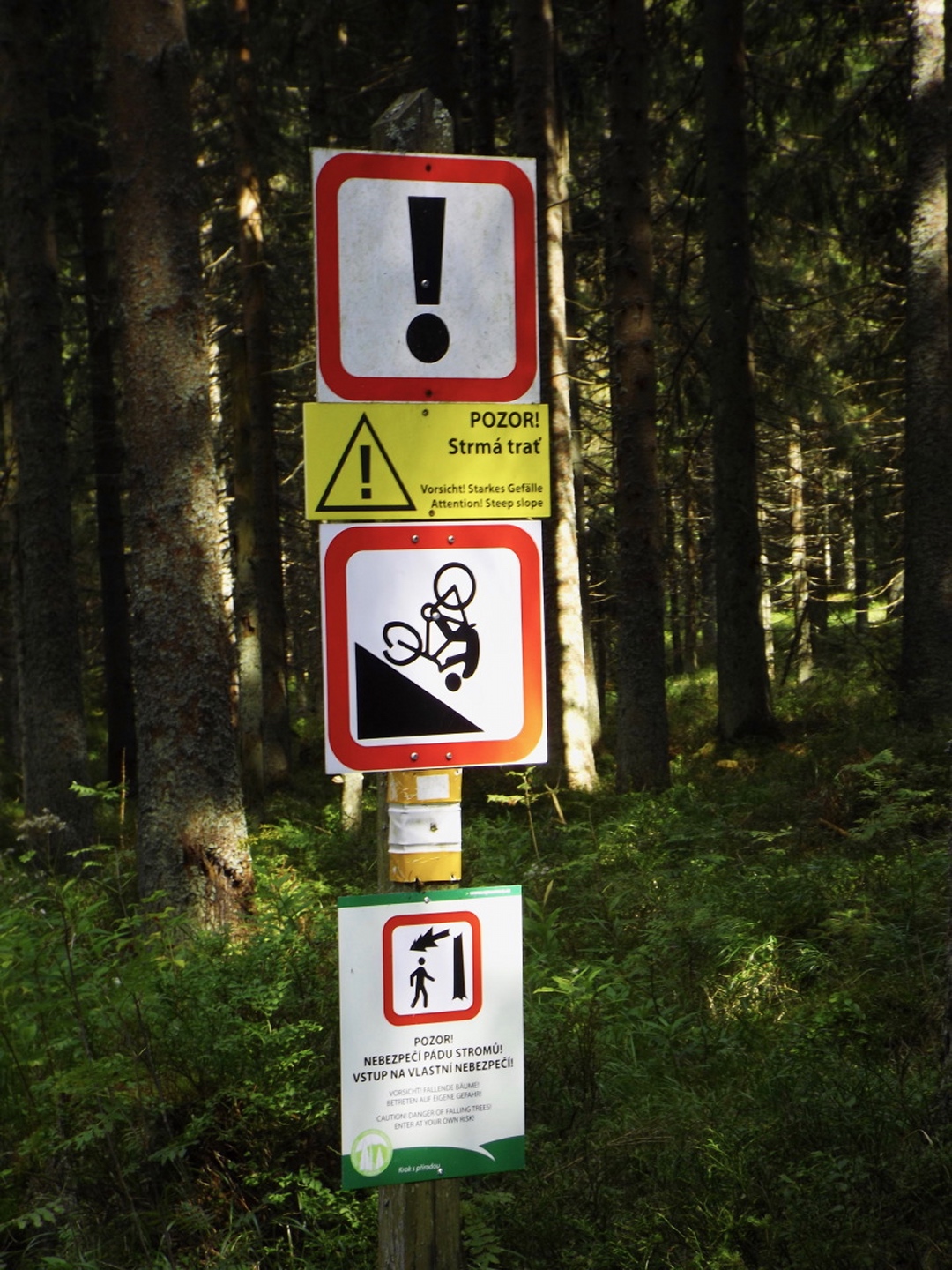 Das Schöne daran ist, dass diese Tour locker als Nachmittagstour durchführbar ist. Ich musste nämlich vor der Abfahrt noch auf einen Anruf warten und konnte deshalb erst um zehn Uhr losdüsen und war nach Herbergssuche und Einchecken in der Penzion Škarda ziemlich genau um 13 Uhr am Wanderparkplatz am westlichen Ortseingang von Srní-Mechov. Von dort aus folgte ich bei 14 Grad mit Regenjacke über dem T-Shirt dem auch für Radlfahrer geeigneten Weg entlang eines kleinen und fast ausgetrockneten Kanals, der nach 500 Metern den Wanderweg nach Srní kreuzt, auf dem ich später wieder zurückkommen sollte. Gleich nach der Kreuzung ist der Grund für die Wasserknappheit im Kanälchen ersichtlich: Ein Pumpwerk befördert das Wasser, das auf dessen anderer Seite reichlich und fröhlich dahinfließt, unterirdisch Richtung Srní. Das ganze nennt sich Vchynicko-Tetovský-Kanal und zweigt unterhalb von Modrava von der Vydra ab. Diesem Kanal mit benachbartem Weg folgte ich bis zum Abzweig Ke kapli mit seiner witzigen Kanalbrücke, an dem ich zur Ruine der Hauswaldkapelle hinaufging. Diese Ruine ist inzwischen schon wieder ein kleiner Wallfahrtsort, war aber während des Kalten Krieges den militärischen Bedürfnissen des Warschauer Paktes zum Opfer gefallen. Oberhalb der Kapelle gibt es eine Quelle, dessen Wasser über ein hölzernes Aquädukt in ein hübsches Becken direkt am ehemaligen Eingang geleitet wird. Neben dem Becken stehen Tassen, aus denen jeder von dem Wasser, das natürlich heilende Kräfte hat, trinken kann. Das Ganze ist übrigens gratis, in Deutschland und der Schweiz überhaupt nicht und in Österreich noch weniger vorstellbar. Nach einer kleinen meditativen Rast, bei der ich einfach nur das Plätschern der Quelle auf mich wirken ließ, folgte ich dem Aquädukt bis zur tatsächlichen Quelle und ging von dort aus auf dem Wanderweg weiter nach Süden. In diesem Abschnitt ist er als Themenweg für den böhmischen Dichter Karel Klostermann hergerichtet, dessen schönste Gedichte in unregelmäßigen Abständen auf Holztafeln am Wegesrand zu lesen sind. Leider beschränkt sich mein tschechisch auf fünf oder sechs Begriffe, von denen ich höchstens einmal „dobre“ in den Gedichten finden konnte, soll heißen, ich habe leider nichts davon verstanden. Nach knapp zwei abwechslungsreichen Kilometern und etwas Auf und Ab kam ich zurück zum Kanal und wenige Meter später an den Abzweig Hakešická cesta, an dem ich nach rechts Richtung Pod Oblíkem abbog. Ab jetzt ging es knapp zwei Kilometer relativ steil bergauf (und in die Gegenrichtung bergab, was die tschechischen Behörden zu einem witzigen Warnschild für Radlfahrer verleitete) und im weiteren Verlauf nach Javoří pila auch wieder ein bisserl bergab. Unfreundlicherweise begann es kurz vor Hakešická cesta leicht zu regnen, freundlicherweise aber nur leicht und nur etwa vier Minuten lang, so dass die Kapuze in der Regenjacke bleiben konnte. Zwischendurch gelang es mir, eine Meise auf einem Ast so zu fotografieren, dass das Ergebnis auch scharf und unverwackelt wurde, leider aber zu dunkel, um in diesem Bericht berücksichtigt zu werden. Javoří pila ist in der Karte als bývala (Wüstung) verzeichnet, allerdings konnte ich außer einem wunderschönen Hochmoor, das überraschenderweise nicht vollständig I. zóna NP ist, nur einen feinen Rastplatz entdecken. Die nächsten 400 Meter folgte ich nach rechts der Asphaltstraße, die von Modrava herkommt und zum Poledník weiterführt, bis zum Abzweig Tmavý potok, von dem aus der Weg wieder nach rechts hinauf zum Sattel und Gipfel des Oblík abzweigt. Der Weiterweg zum Poldeník ist ab hier die längste Zeit des Jahres gesperrt, eine besondere und begrüßenswerte Naturschutzmaßnahme. Radlfahrer müssen sogar immer rechts abbiegen, weil sie mit ihrem Tempo einige seltene Tierarten scheinbar ganz extrem stören. Dafür darf das Personal des Polednik-Aussichtsturms mit dem Geländewagen hochfahren, aber das sind ja nur zwei Fahrzeuge pro Tag und Richtung während der sowieso stark eingeschränkten Öffnungszeiten. Auf etwa 1100 Metern kam mir ein Feuerwehrauto aus Kvilda entgegengebraust, keine Ahnung, was die Jungs vorhatten, zumindest konnte ich nirgend Rauchspuren entdecken. Vielleicht gehörte das Fahrzeug zur Absicherung des Filmsets, an dem ich zwischen Prášily und Mechov vorbeigekommen war, und wollte den Heimweg ein bisserl abkürzen. Ohne weitere Ereignisse, aber mit immer wieder schöner Szenerie, erreichte ich gegen 15.30 Uhr den Sattel Za Oblíkem, von dem aus ein angenehmerweise nicht asphaltierter Weg zum Gipfel hinauf führt. Dieser macht auf halbem Weg einen scharfen Knick nach links und wird ab dort zu einem richtig hübschen kleinen Bergpfad. Mittlerweile hatte die Sonne doch deutliche Lücken in die Wolkendecke gerissen und auch für gute Sichtverhältnisse gesorgt, so dass ich trotz ein bisserl Wind eine halbe Stunde auf dem Gipfel verblieb und das Rundumpanorama genoss. Ok, nach Westen hin ist der Poledník im Weg, so dass der Arber nicht sichtbar ist, dafür präsentieren sich Rachel, Lusen samt nördlichen Trabanten und im Osten der Boubín von ihrer besten Seite. Ja, ich finde die Nordostseite des Rachel noch schöner als die anderen, die man von den Bayerwaldgrößen aus bewundern kann, was vielleicht am Seltenheitswert der Perspektive liegt. Zwischen Poledník und Rachel ist auch das Bischofsmaiser Skigebiet zu erkennen, in dem ich vor fünf Wochen unterwegs gewesen bin. Anschließend kehrte ich auf dem Aufstiegsweg zurück zum Sattel und bog dort nach Norden ab, um die Umrundung zu vollenden. Ganz nebenbei ist der Rückweg auch nur halb so lang wie der Aufstieg und mindestens genauso interessant, weil zum Beispiel ein Wiesel zuerst über den Weg rannte und dann noch einmal umkehrte, um für ein Foto zu posieren. Zunächst geht es in leichtem Gefälle auf der Asphaltstraße weiter bis zum Abzweig Vaňkova cesta, an dem ich einmal mehr rechts abbog und eine
