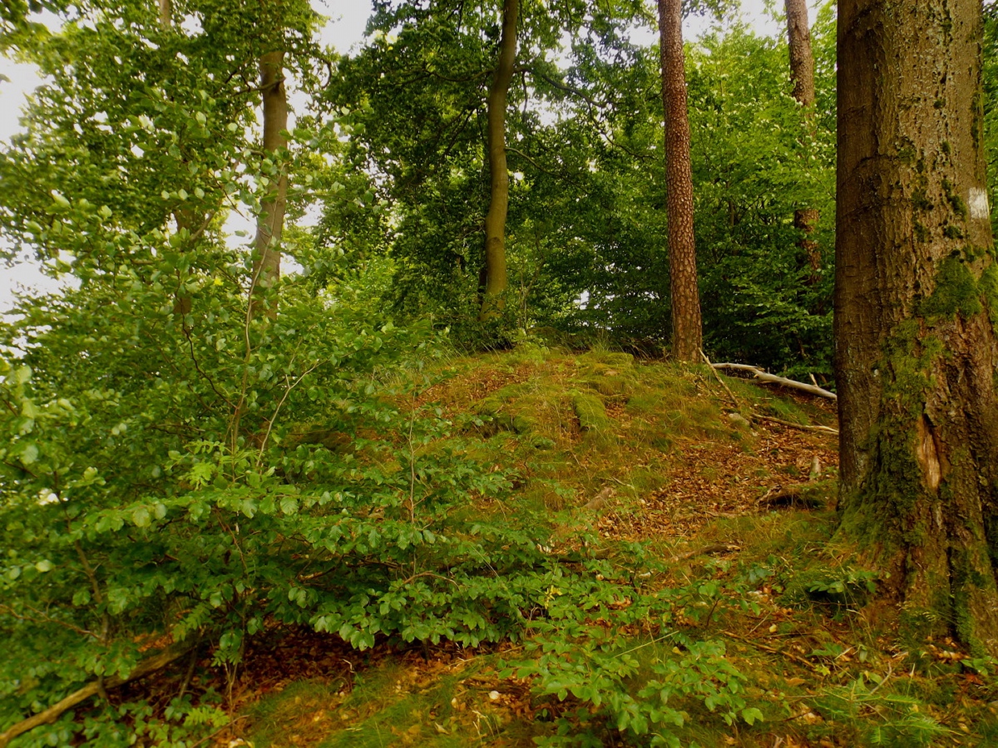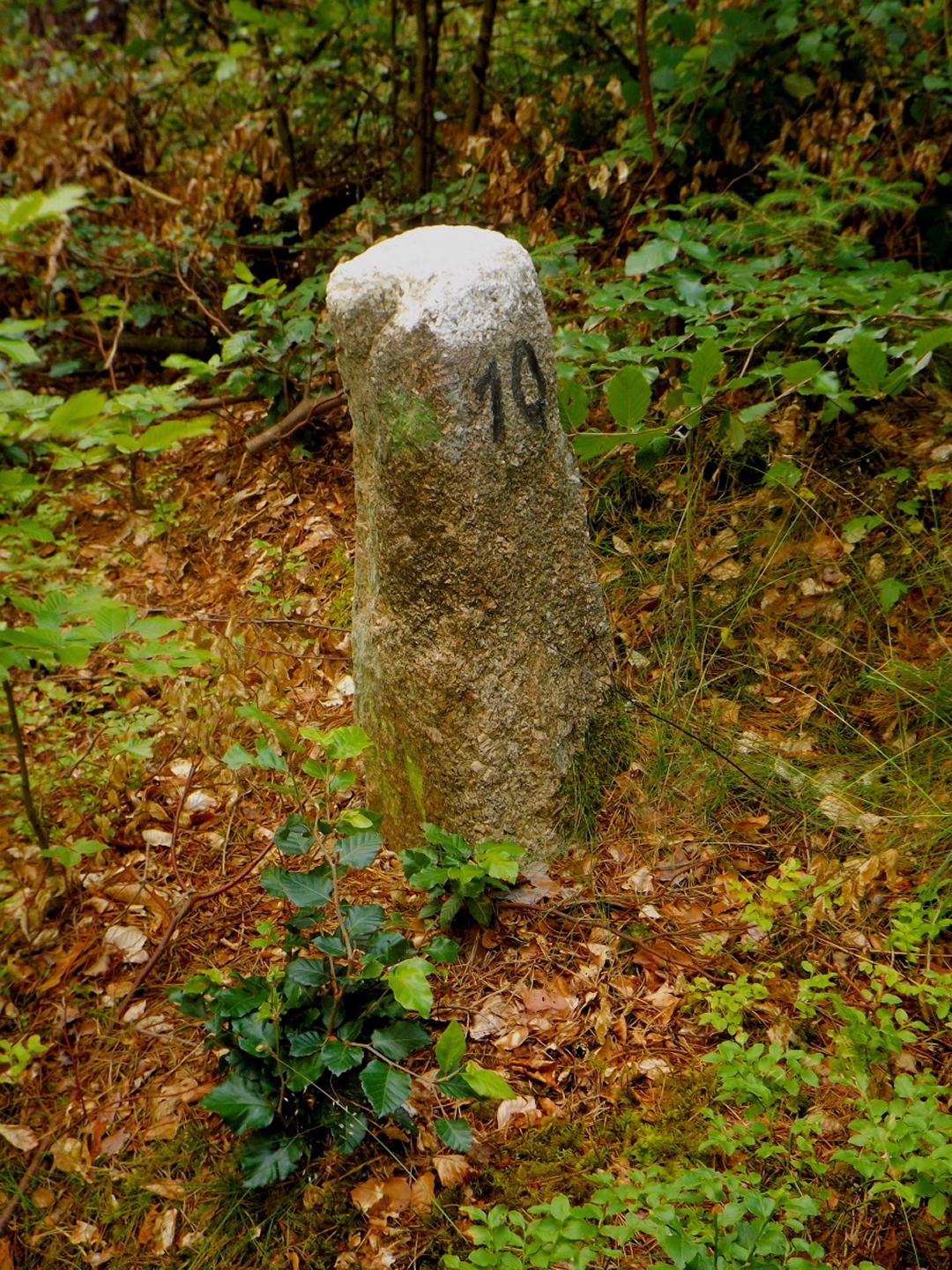 Um die Runde zu retten und vor allem herauszufinden, ob sie trotzdem noch für andere Projekte wie zum Beispiel OWV-Spaziergänge geeignet ist, ging ich auf dem gleichen Weg wie damals hinunter nach Hof, wo es ebenfalls ein Gasthaus gibt, das aber auch nur noch sehr selten und unzuverlässig geöffnet ist, und schon gar nicht tagsüber, also wieder nix mit Einkehroption. Dafür machte ich den kurzen Abstecher zur Burg Hof, sah mir den Inforaum im Torhaus an, wo auch die Öffnungszeiten des Haupthauses aushängen. Anschließend ging ich Richtung Stefling und bog am Dorfweiher links ab auf die irgendwann mal vorbereitete Route, die hinauf nach Hammerhäng und von dort weiter durch das Frankenbachtal führt. Die Strecke ist vom Naturpark Vorderer Bayerischer Wald mit Wanderweg 11 ausgeschildert und zweigt an einer Kreuzung mit nicht ganz nachvollziehbarer Beschilderung nach links ab. Man kann sich hier am von der Kreuzung aus sichtbaren Hangrutsch (oder war es doch mal ein Steinbruch?) orientieren. Hier verließ ich ganz nebenbei die Planung, was mich auf halber Höhe etwas verwirrte, aber der Blick in die Karte zeigte mir, dass ich sicher keine schlechtere Option gewählt hatte. So stieß ich an der Abzweigung nach Eckartsreuth wieder auf die von Hof herkommende Gemeindestraße und hatte die Option, abzubrechen oder weiterzugehen. Natürlich entschied ich mich trotz des zweifelhaften Wetters für letzteres und folgte der Straße etwa 200 Meter bis zu einer Forststraße nach links, die auch weiterhin vom Naturpark ausgeschildert ist. Bald kam ich an einen Steig links den Hang hinauf, der zwar nicht vom Naturpark, dafür aber vom Waldverein Regensburg mit einem grünen Dreieck markiert ist. Auf diesem gelangte ich nach mehreren Kurven zum Gipfelkreuz, vor dem es nach rechts (Süden) zu einem scheinbar höchsten Punkt geht, auf dem es früher auch mal Aussicht gegeben haben könnte. Am Kreuz gibt es ein gut verpacktes Gipfelbuch, in das sich etwa eine Gruppe pro Tag einträgt. Gegenüber ist ein Bankerl, hinter dem ein leicht ansteigender Pfad in den Wald zum wirklich höchsten Punkt führt. Von diesem könnte man wohl auf einem unmarkierten Waldpfad nach Eckartsreuth absteigen, ich hatte diesen aber nicht im Garmin und auch nicht auf der Kompasskarte, die aushelfen musste, weil ich zu faul war, noch kurz vor der Abfahrt das Tourengebiet im Bayernatlas auszudrucken. Also ging ich die knapp 100 Meter zurück zum Gipfelkreuz und von dort den im oberen Bereich doch recht steilen Wanderweg hinunter nach Eckartsreuth. Die Schalenfelsen von der letzten Tour ließ ich dieses Mal rechts liegen, einmal inspizieren reicht in manchen Fällen.