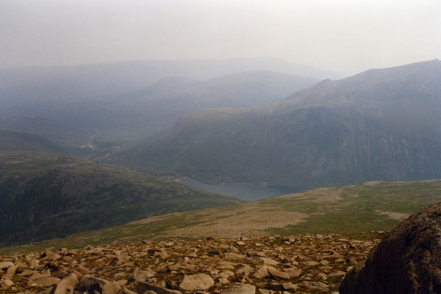 Damals gab es noch den alten Sessellift hinauf nach Ptarmigan, der inzwischen durch eine Zahnradbahn (oder ist es eine Standseilbahn?) ersetzt wurde. Ihn nahm ich bergwärts in Anspruch. So war ich in wenigen Minuten beim Bergrestaurant, von wo aus es weglos, aber bei guter Sicht ohne Orientierungsprobleme relativ gerade zum Gipfel ging. Dieser ist gut durch einen riesigen Steinhaufen zu erkennen. Ebenso problemlos war der Abstieg auf dem gleichen Weg bis zum Sessellift und von dort über die sich unter ihm schlängelnde Schotterpiste zurück zum Parkplatz.